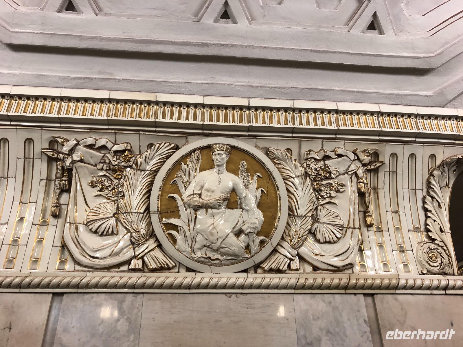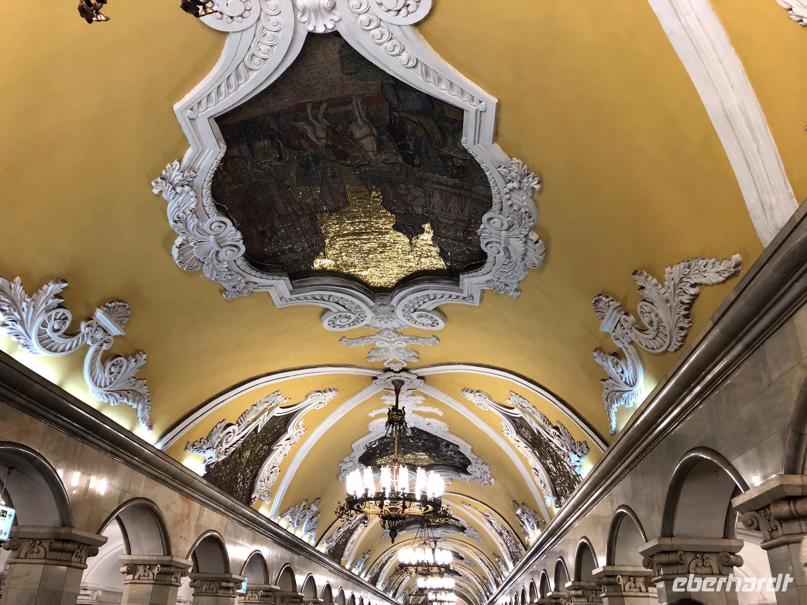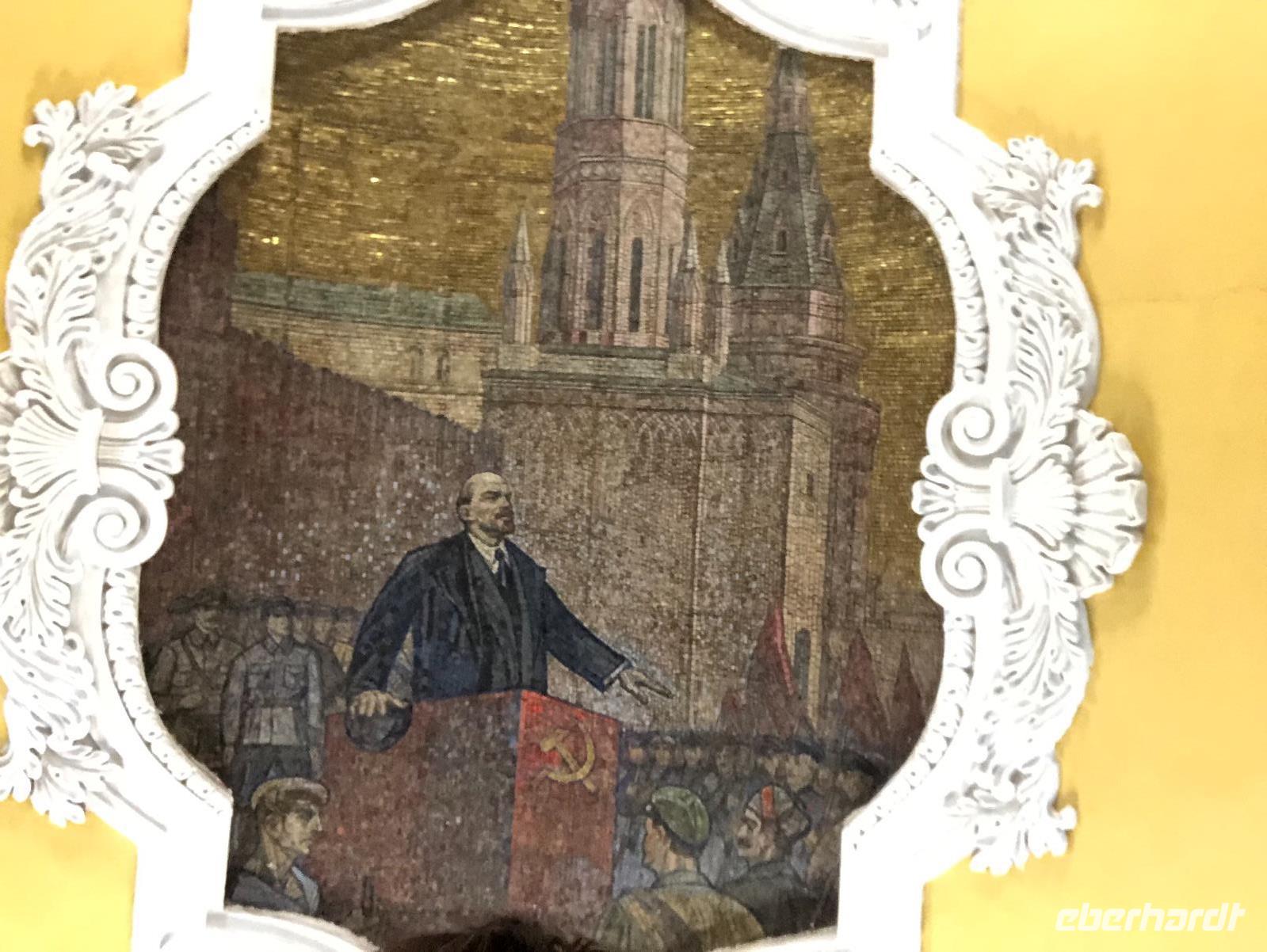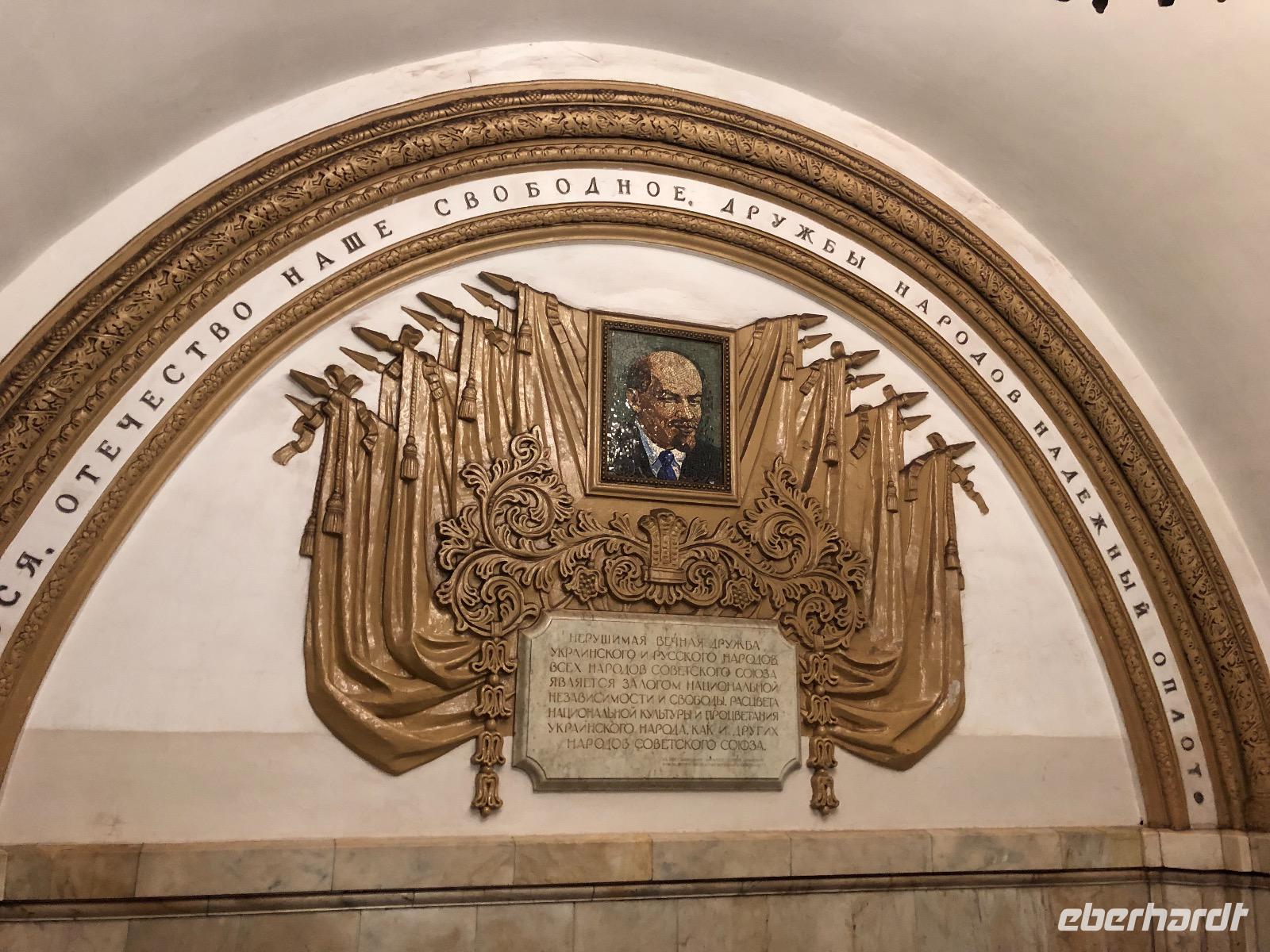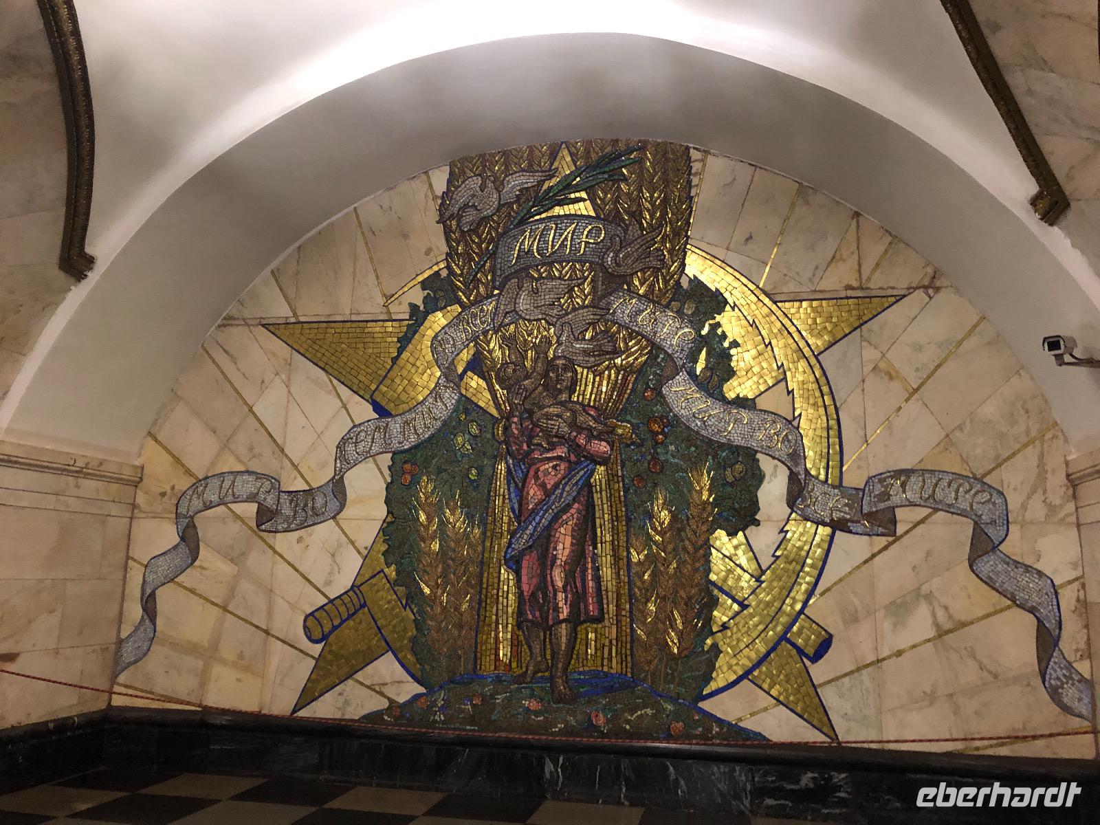 Danach machen wir uns nochmal auf in die Nacht von Moskau. Die Metrostation Smolenskaja befindet sich in der Nähe des Hotels. Jedoch müssen wir aufpassen, denn es gibt einen Eingang, der zur hellblauen Linie führt, das ist die Linie Nummer 4 und einen, der zur dunkelblauen Linie führt, zur Nummer 3 - und da wollen wir einsteigen. Eine riesige voll befahrene Straße trennt uns vom begehrten U-Bahn Eingang. Ortsunkundig, wie wir sind, laufen wir an der Unterführung vorbei, diese entdecken wir erst auf dem Rückweg. Da es scheinbar keine Möglichkeit gibt, die Straße zu überqueren, nehmen wir nun doch die Linie 4. Metrotickets, die hier Biljet heißen, gibt es am Automaten oder an der Kassa. Wir entscheiden uns für die Kassa und erwerben Fahrscheine für 55 Rubel das Stück (ca. 70 Rubel sind 1 €). Damit können wir nach Herzenslust mit der Metro fahren. Von der Smolenskaja fahren wir bis Aleksandrowski Sad - 2 Stationen. Dort wechseln wir zu Bibliotheka Lenina ohne ein neues Ticket kaufen zu müssen. Alles ist gut ausgeschildert und leicht zu finden. Noch sind die Bahnhöfe unspektakulär. Aber jetzt! Mit der roten Linie, Nummer 1, fahren wir bis zur Komsomolskaja, die sich zunächst auch enttäuschend zeigt. Das soll die schönste U-Bahnstation der Welt sein? Erst als wir auf den Ring wechseln, immer noch Komsomolskaja - braune Linie Nummer 5, kommen wir zu dem gewünschten Bahnsteig. Die Komsomolskaja gehört zu Recht zu den Prächtigen Stationen. Die Decke ist gelb gehalten und mit vielen Mosaiken geschmückt. Wunderschöne Leuchter und viele Marmorsäulen erfreuen uns mit ihrem Anblick. Nicht umsonst gilt die Komsomolskaja als am meisten fotografierte Metrostation der Welt. Wir fahren weiter auf dem Ring, braune Linie Nummer 5. Nur eine Station, dann steigen wir wieder aus. Prospekt Mira, eine Station mit großen Deckenleuchtern, Marmorsäulen und einem schachbrettartigen Fußboden. Nächste Station: Novoslobodskaja - zwölf Glasmosaike erzeugen eine andächtige Atmosphäre. Die letzte Station unserer Metrofahrt ist die Kiewskaja, auf der sich alles um die russisch-ukrainische Freundschaft dreht. Nach etwa eineinhalb Stunden erreichen wir wieder unseren Ausgangsbahnhof Smolenskaja und die Nimmermüden lassen sich noch ein Bierchen schmecken. Alle anderen liegen bereits in süßer Ruh.