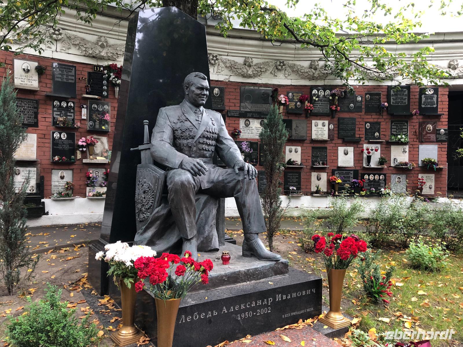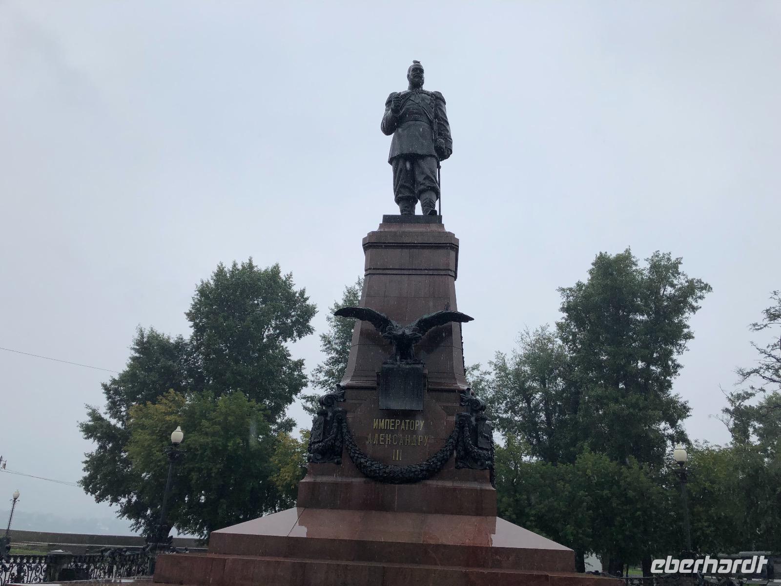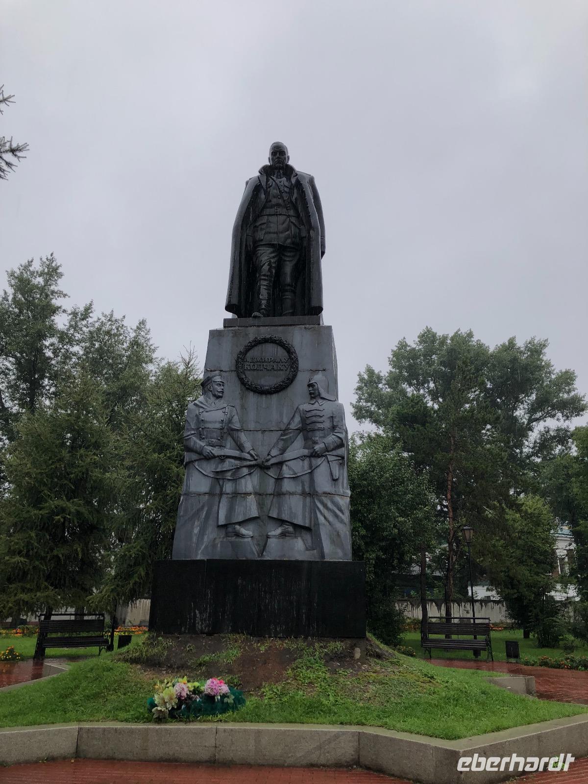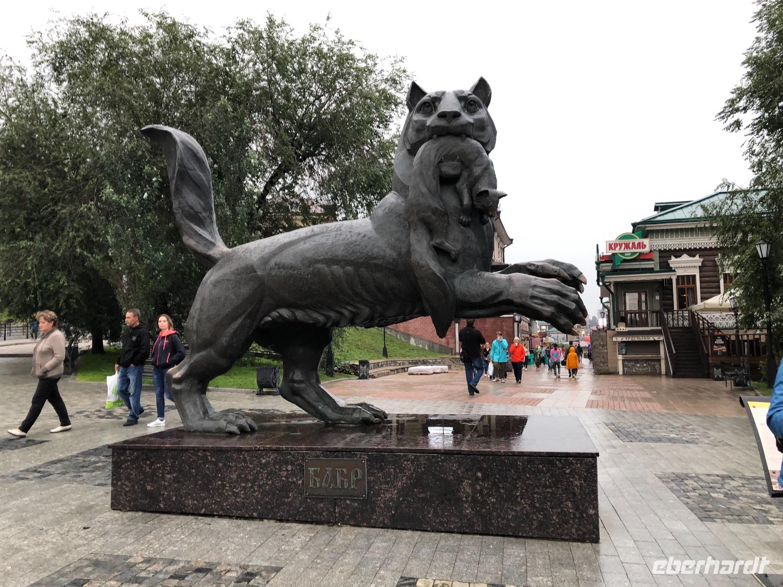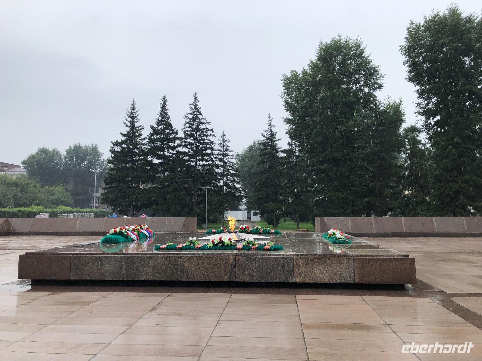 Wir besuchen das ewige Feuer, das an die gefallenen Soldaten des Zweiten Weltkriegs erinnert. Wir spazieren, dem Wetter trotzend entlang der Angara zum Denkmal für den Gründer der Stadt. Fest steht nur, dass es ein Kosake war, sein Aussehen entsprang der künstlerischen Freiheit. Im Kloster Marias Zeichen, das wir anschließend aufsuchen, ist ein prächtiger Sarkophag zu bewundern, in dem sich die unverwesbaren sterblichen Überreste von ... ? befinden.