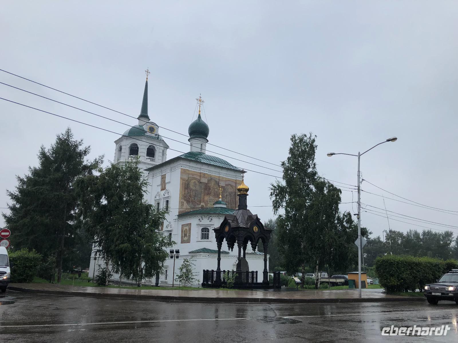 Wir beginnen mit dem Ort, an dem die Stadt gegründet wurde und wo sich heute die Erlöserkirche befindet. Erstmals wurde Irkutsk 1652 als Winterlager errichtet, fast zehn Jahre später entstand hier eine Holzfestung im Kampf gegen die Burjaten und noch einmal zwanzig Jahre später erhielt der Ort das Stadtrecht. Hier wurde mit Pelzen, chinesischem Tee und Seide gehandelt. Im 19. Jahrhundert war Irkutsk die größte Stadt Sibiriens und galt als Fenster zum Osten. 1879 gab es einen schlimmen Brand, bei dem über einhundert Steingebäude und sogar mehr als dreitausend Holzhäuser zerstört wurden. 15.000 Menschen verloren Hab und Gut.