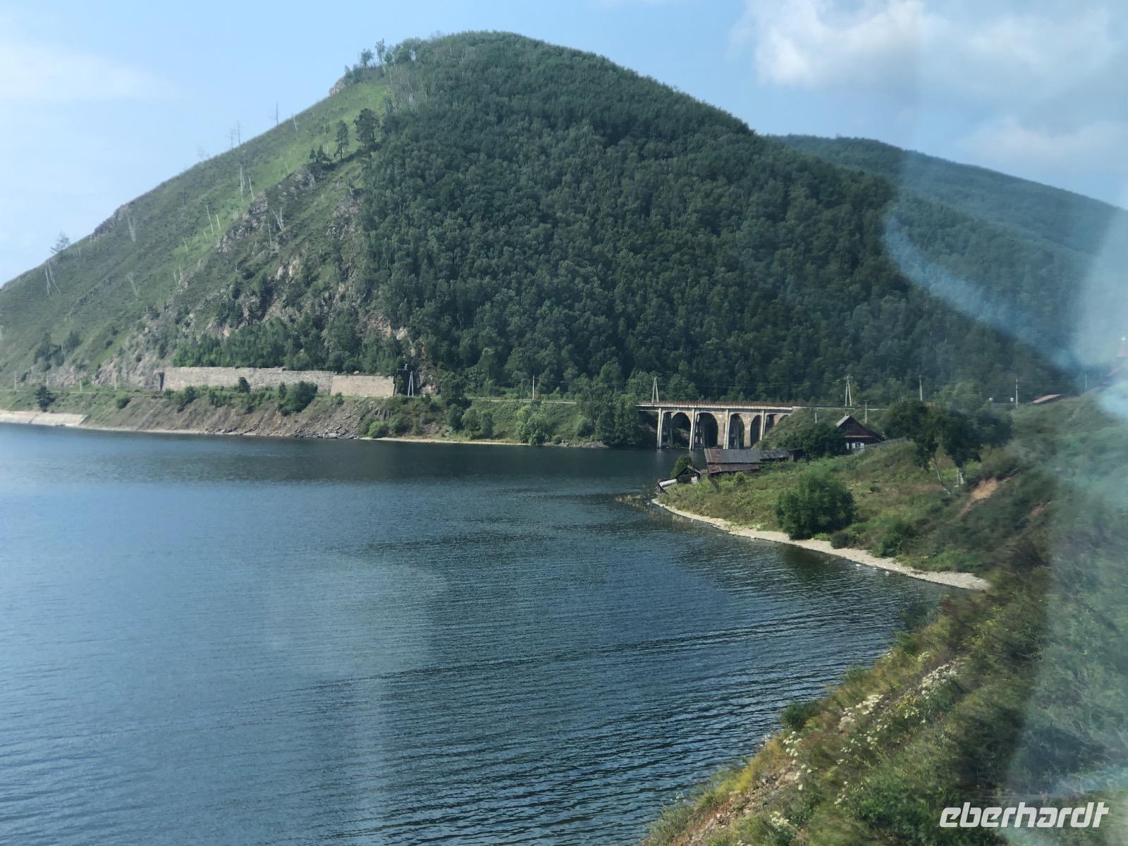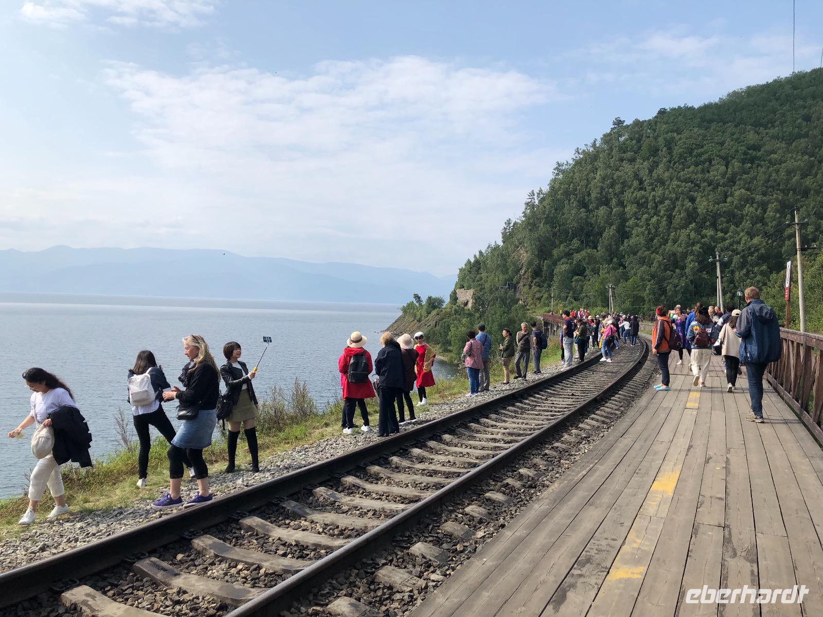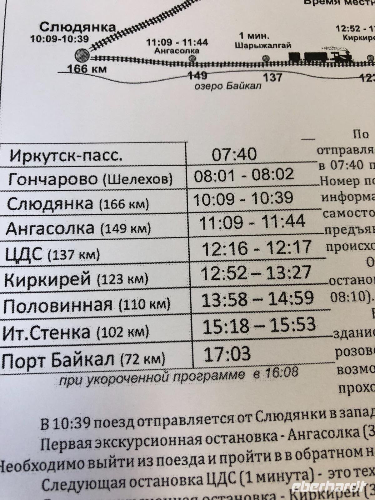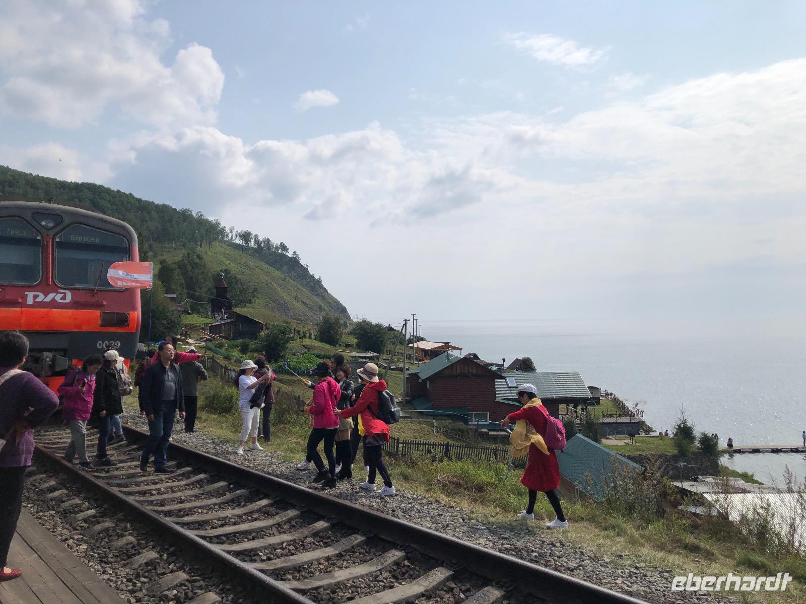 Von Irkutsk geht es zunächst fast zwei Stunden bis Sludjanka, dem eigentlichen Ausgangspunkt für die Fahrt entlang des Baikalsees. Ab hier zählen die Kilometerangaben rückwärts. Unseren ersten Halt legen wir am Kilometer 149 ein. Alle steigen aus, um Fotos von der beeindruckenden Umgebung zu machen. Zu sehen gibt es ein Steinviadukt, der über den Fluss Angasolka führt. Der Zug fährt weiter und wir starten eine Zugbesichtigung. Ziel ist die „Bar" am Ende des Zuges. Wir durchqueren vielfältig gestaltete Waggons mit einem ebenso bunten Publikum. Die „Bar" ist geschlossen. Doch geduldig harren wir aus, bis die Bardame kommt und uns Kaffee verkauft. Während dessen lauschen wir der Erzählung eines mit seinem Wohnmobil verunglückten Mitreisenden. Zurück im Abteil sind unsere chinesischen Reisenachbarn eingeschlafen. Am Kilometer 123 ist eine Gedenktafel für den Tunnel Nummer 18 aufgestellt. Dieser wurde in den Jahren 1903 und1904 gebaut, aber ein Jahr später durch einen Steinfall wieder zerstört. Ein italienischer Architekt wurde mit dem Wiederaufbau beauftragt und deshalb können wir heute hier eine italienische Wand bestaunen. Der Tunnel ist seit 1914 wegen immer wieder auftretender Steinfälle für den Bahnverkehr geschlossen. Nun werden wir im Zug kulinarisch versorgt. Jeder bekommt eine Art Lunchpaket mit Salat, Suppe und anderen warmen Köstlichkeiten. Am Kilometer 110 haben findige Händler des 21. Jahrhunderts ein paar Stände mit Souvenirverkauf eingerichtet und bedienen so den Bedarf der vorbeifahrenden Touristen. Auch in unsere Taschen wandert das eine oder andere Andenken. Außerdem gibt es hier zwei Brücken zu besichtigen, die aus unserem Verständnis heraus, schon längst aus Sicherheitsgründen gesperrt sein müssten. Eine alte Dampflok dient ebenfalls als Fotomotiv.