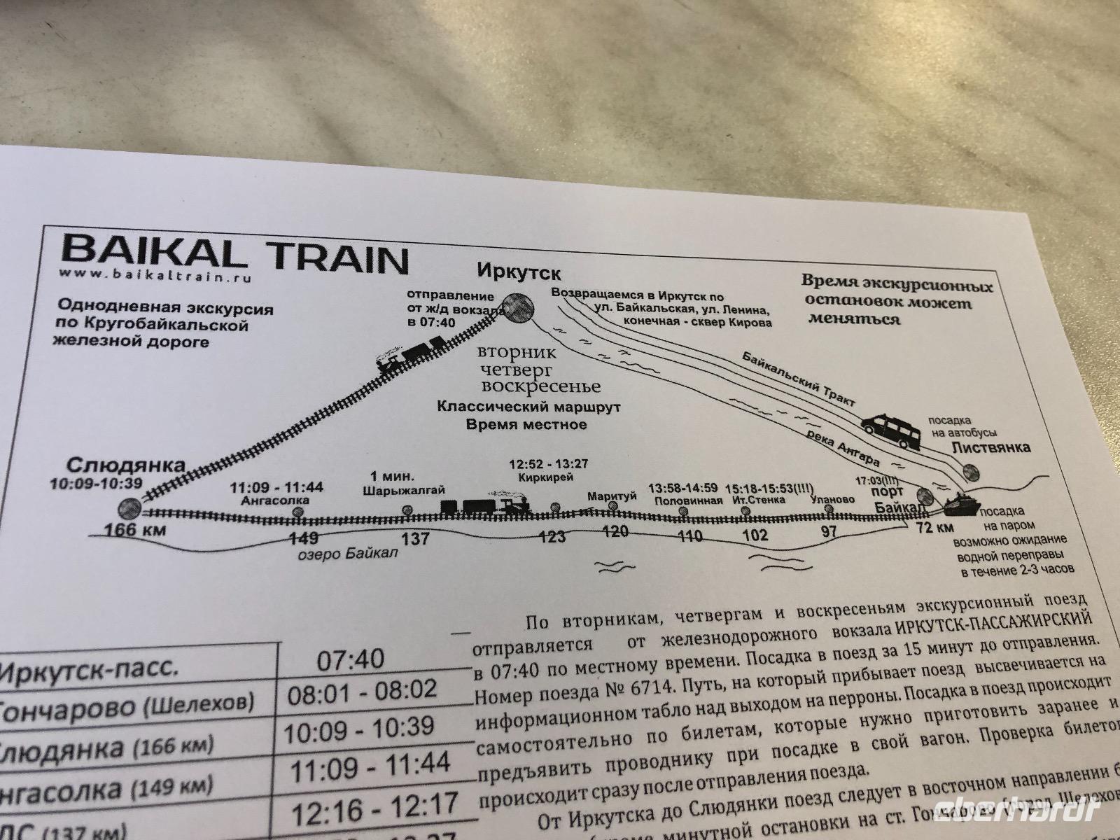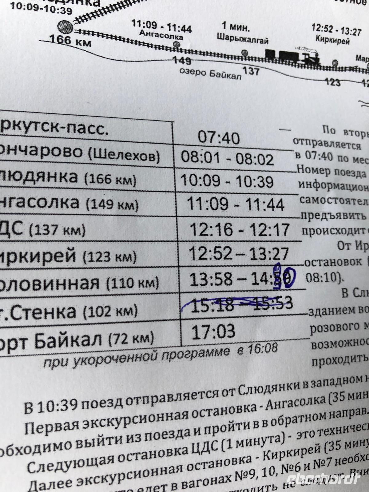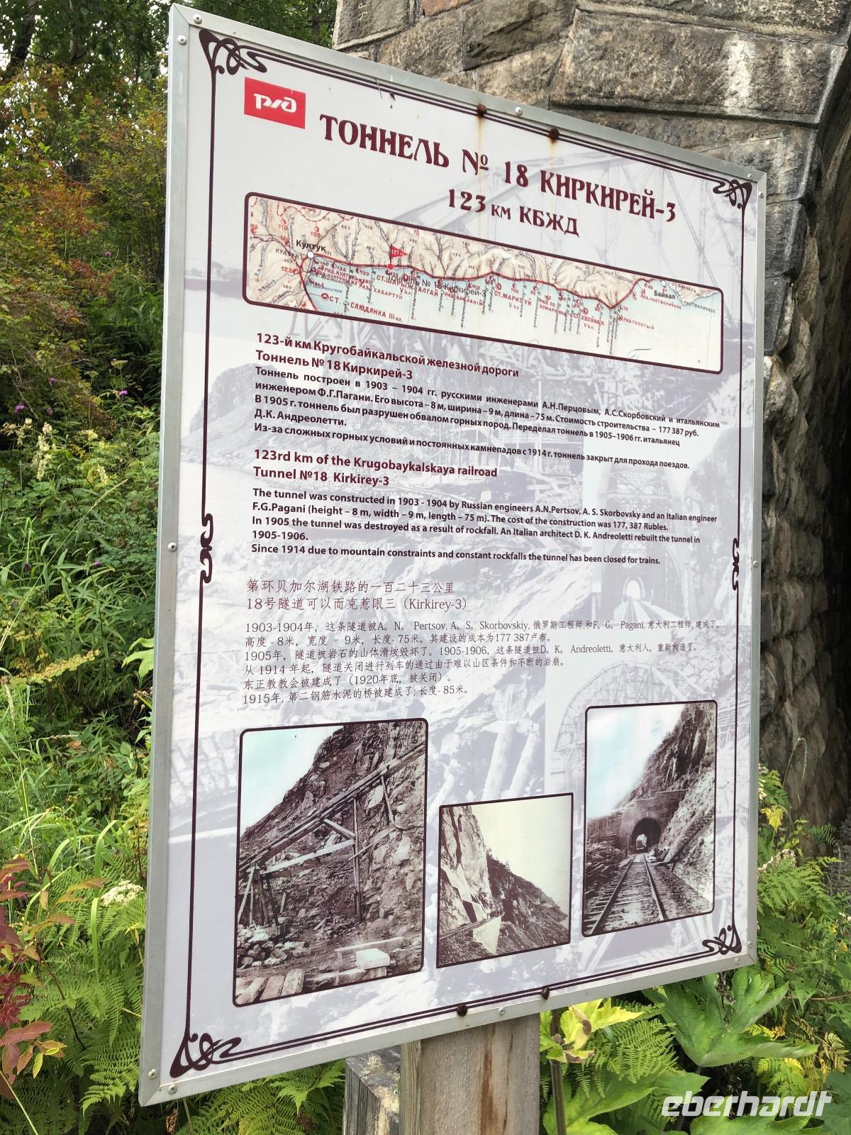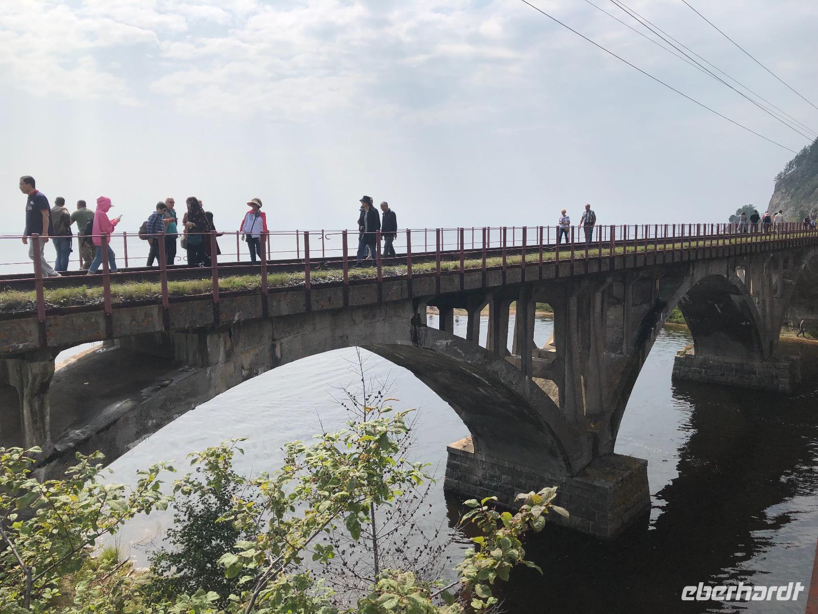 Von Irkutsk geht es zunächst fast zwei Stunden bis Sludjanka, dem eigentlichen Ausgangspunkt für die Fahrt entlang des Baikalsees. Ab hier zählen die Kilometerangaben rückwärts. Unseren ersten Halt legen wir am Kilometer 149 ein. Alle steigen aus, um Fotos von der beeindruckenden Umgebung zu machen. Zu sehen gibt es ein Steinviadukt, der über den Fluss Angasolka führt. Der Zug fährt weiter und wir starten eine Zugbesichtigung. Ziel ist die „Bar" am Ende des Zuges. Wir durchqueren vielfältig gestaltete Waggons mit einem ebenso bunten Publikum. Die „Bar" ist geschlossen. Doch geduldig harren wir aus, bis die Bardame kommt und uns Kaffee verkauft. Während dessen lauschen wir der Erzählung eines mit seinem Wohnmobil verunglückten Mitreisenden. Zurück im Abteil sind unsere chinesischen Reisenachbarn eingeschlafen. Am Kilometer 123 ist eine Gedenktafel für den Tunnel Nummer 18 aufgestellt. Dieser wurde in den Jahren 1903 und1904 gebaut, aber ein Jahr später durch einen Steinfall wieder zerstört. Ein italienischer Architekt wurde mit dem Wiederaufbau beauftragt und deshalb können wir heute hier eine italienische Wand bestaunen. Der Tunnel ist seit 1914 wegen immer wieder auftretender Steinfälle für den Bahnverkehr geschlossen. Nun werden wir im Zug kulinarisch versorgt. Jeder bekommt eine Art Lunchpaket mit Salat, Suppe und anderen warmen Köstlichkeiten. Am Kilometer 110 haben findige Händler des 21. Jahrhunderts ein paar Stände mit Souvenirverkauf eingerichtet und bedienen so den Bedarf der vorbeifahrenden Touristen. Auch in unsere Taschen wandert das eine oder andere Andenken. Außerdem gibt es hier zwei Brücken zu besichtigen, die aus unserem Verständnis heraus, schon längst aus Sicherheitsgründen gesperrt sein müssten. Eine alte Dampflok dient ebenfalls als Fotomotiv.