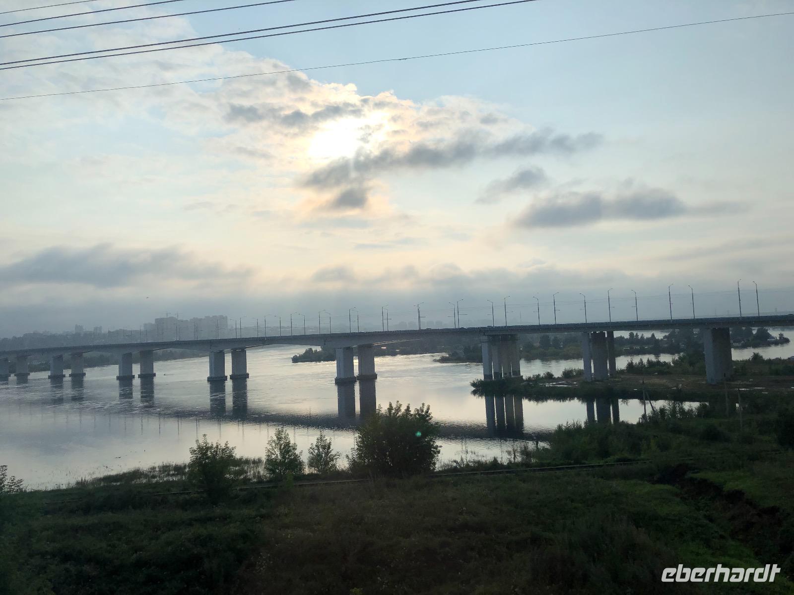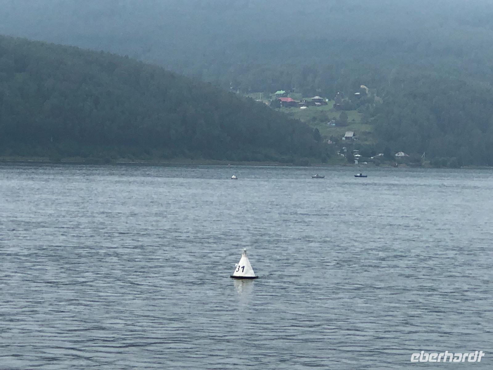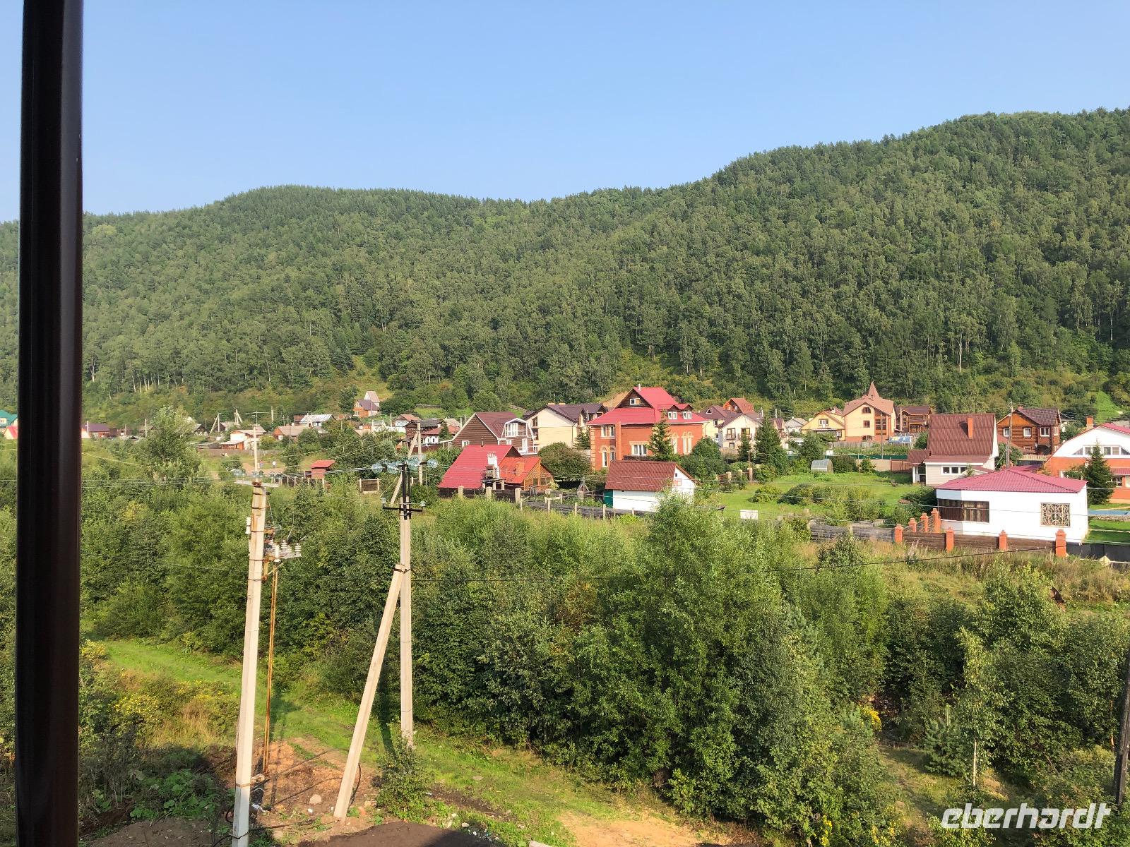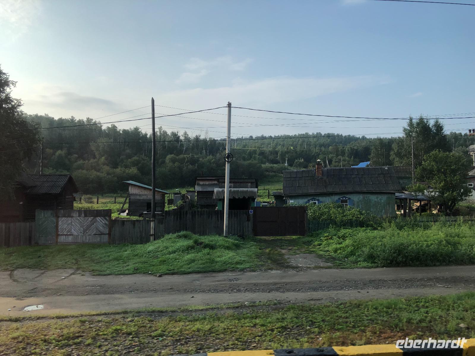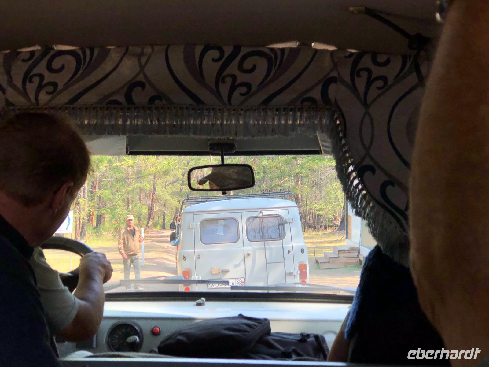 Nach dem Frühstück fahren wir Richtung Irkutsk. Die Straße geht fast schnurgeradeaus allerdings wellenförmig. Hoch, runter, hoch, runter... Bei einem unplanmässigen Stopp liefert ein Junge per Fahrrad ein gestern im Bus vergessenes Utensil. Dankeschön.