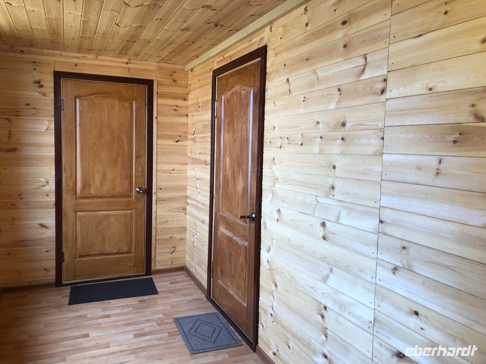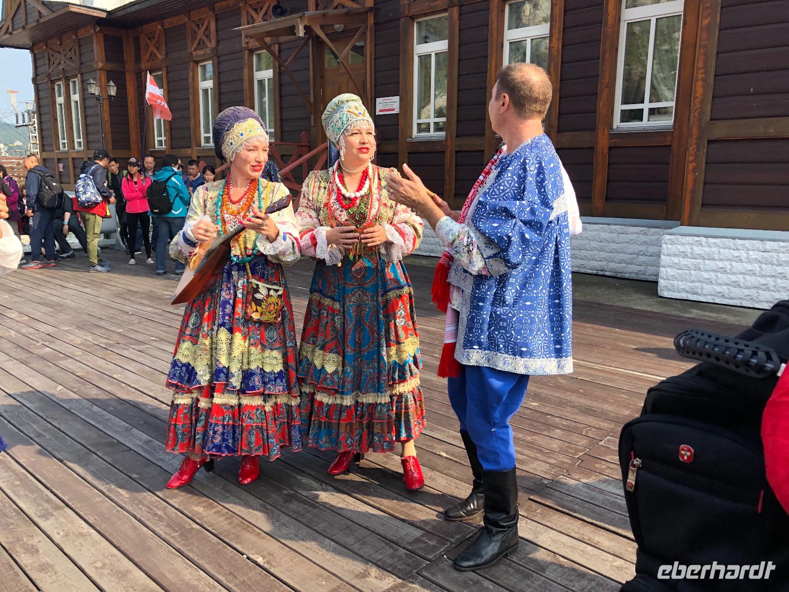 Gegen 16 Uhr erreichen wir Port Baikal. Wir werden von einer Folkloregruppe mit Musik und Gesang empfangen. Unser orangenes Armband, das uns Lidia im Zug gegeben hat, weist daraufhin, mit welchem Boot wir nach Listwjanka übergesetzt werden. Dort erwartet uns bereits ein Bus, der uns zum Hotel Krestowaja Padj bringt. Unsere Gruppe ist in einem neuen Gebäude untergebracht, das erst vor zwei Monaten eröffnet wurde. Alles riecht noch nach frischem Holz.