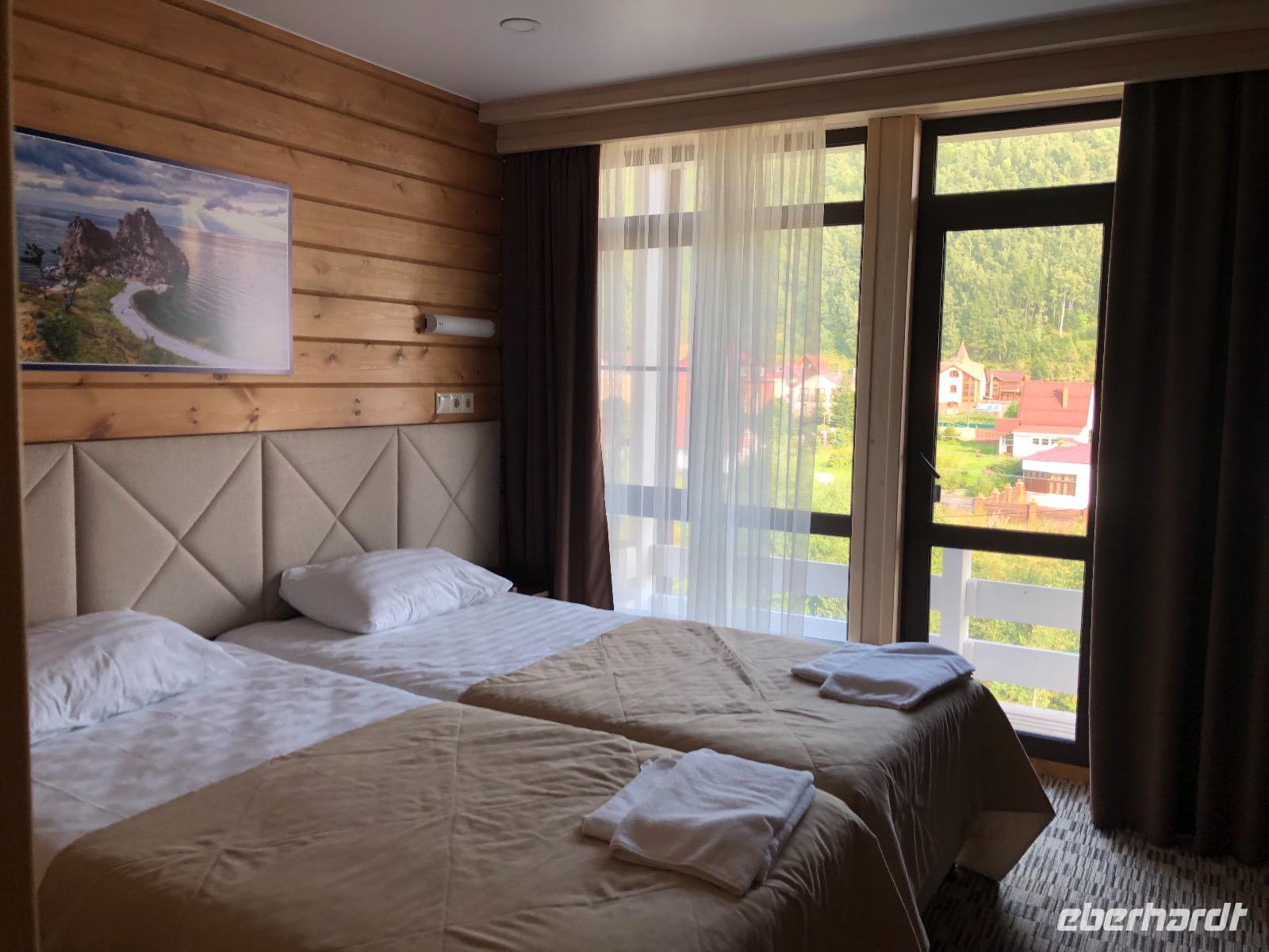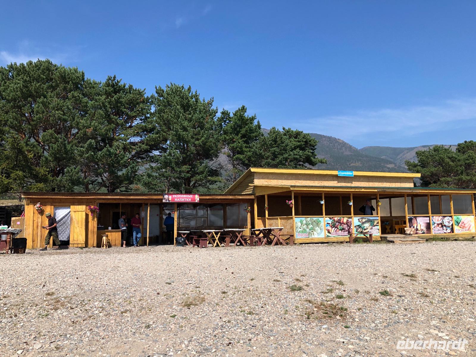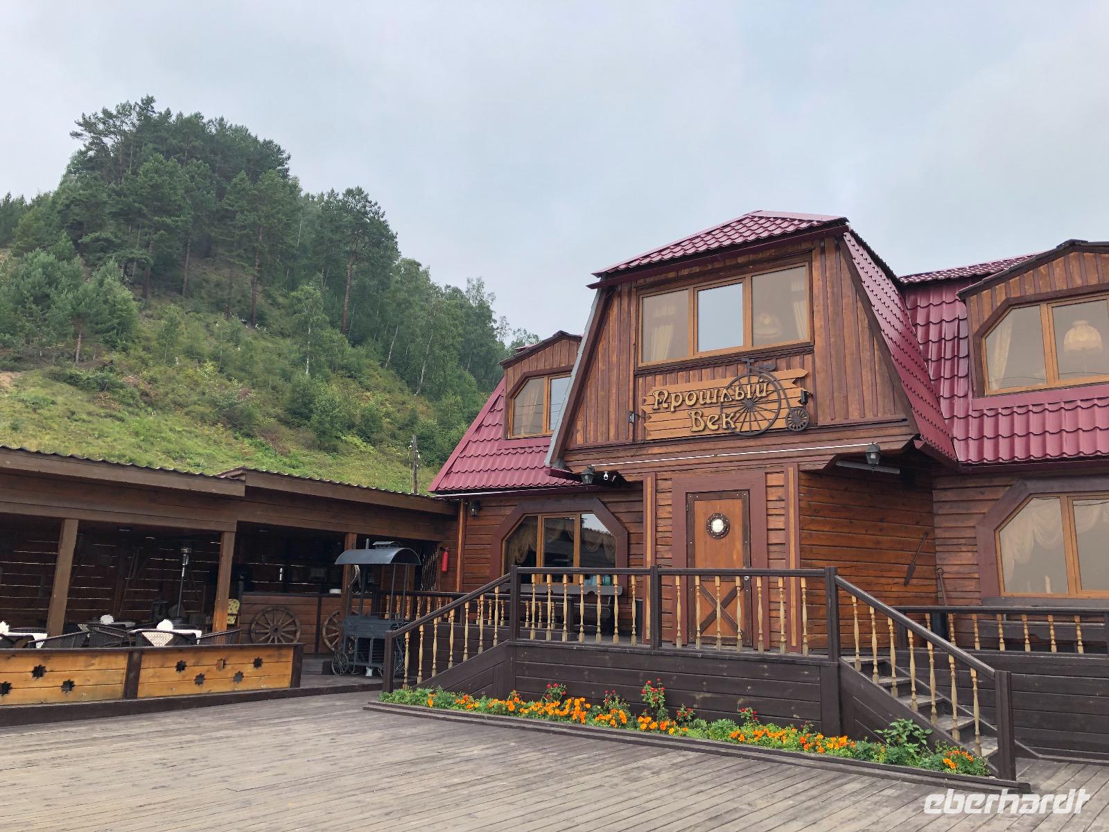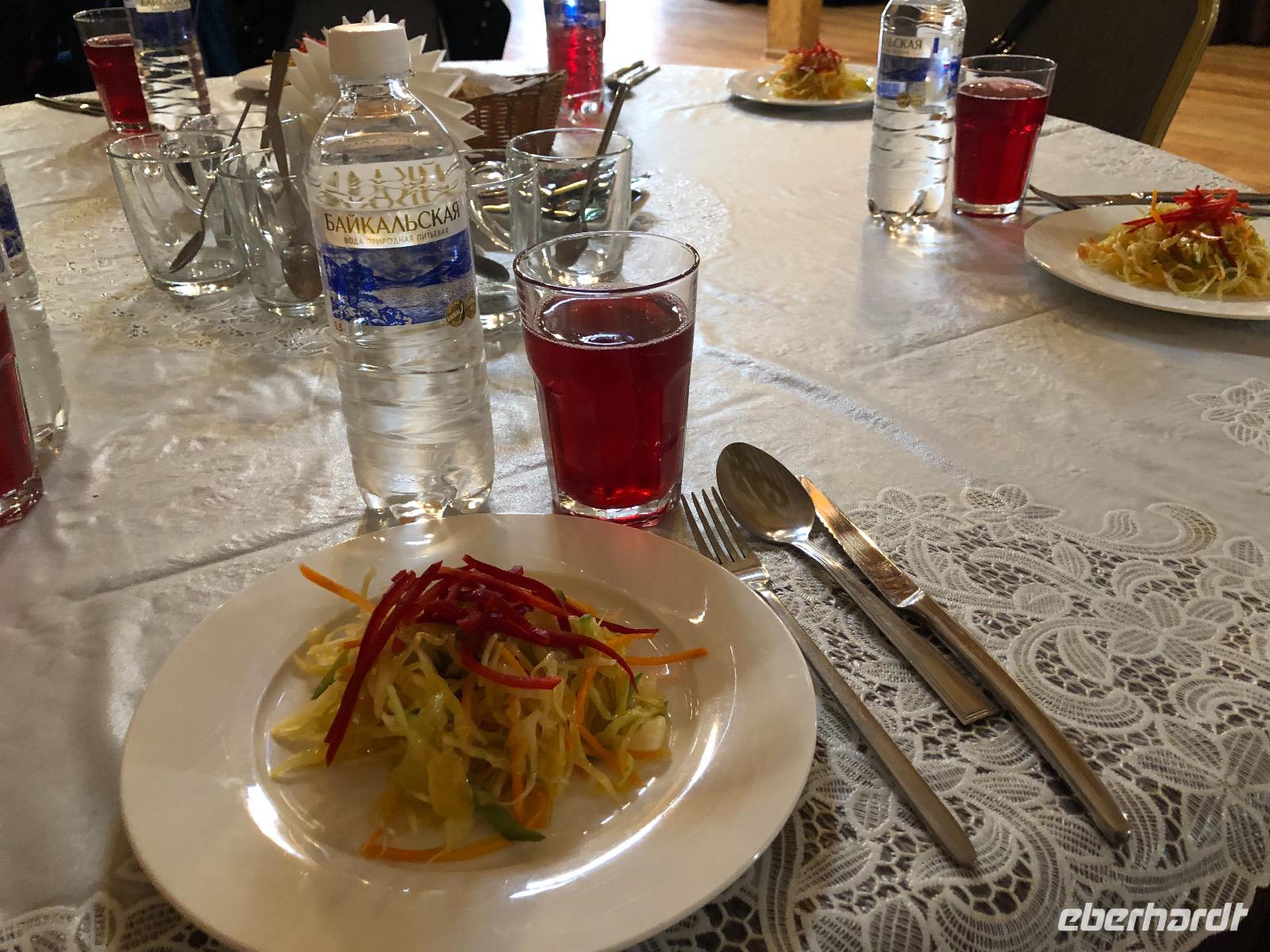 Die Zimmer befinden sich in der ersten bis dritten Etage, einen Fahrstuhl gibt es nicht, aber auf Nachfrage einen Gepäckservice. Wir gönnen uns eine halbstündige Pause und unternehmen dann einen Spaziergang am Baikalsee. Bis zum Hotel Mayak, wo sich ein paar Souvenirläden, Banken und kleine Shops befinden, sind es knapp zwei Kilometer. Pünktlich zum Abendessen sind wir zurück im Hotel. Unsere Tische sind eingedeckt und die Küche erweist sich als exzellent. Alle Speisen sind liebevoll angerichtet und werden von freundlichen Kellnern serviert. Unser Reiseveranstalter Eberhardt TRAVEL spendiert einen sibirischen Wodka, wir stoßen an auf unsere Ankunft am Baikalsee und in der Hoffnung auf spannende Tage.