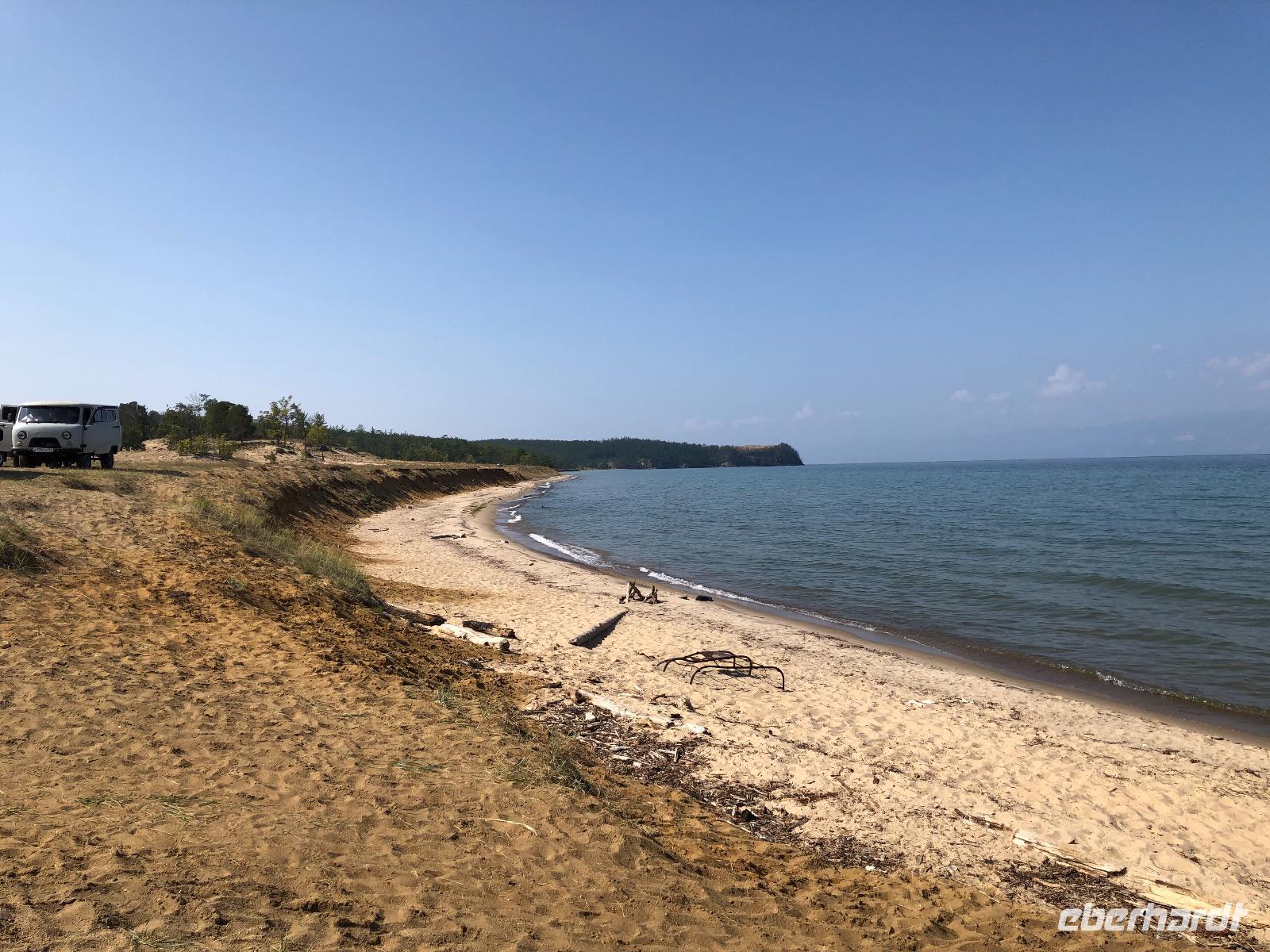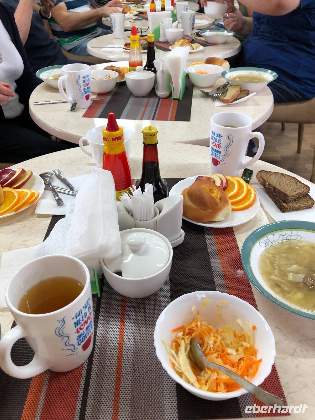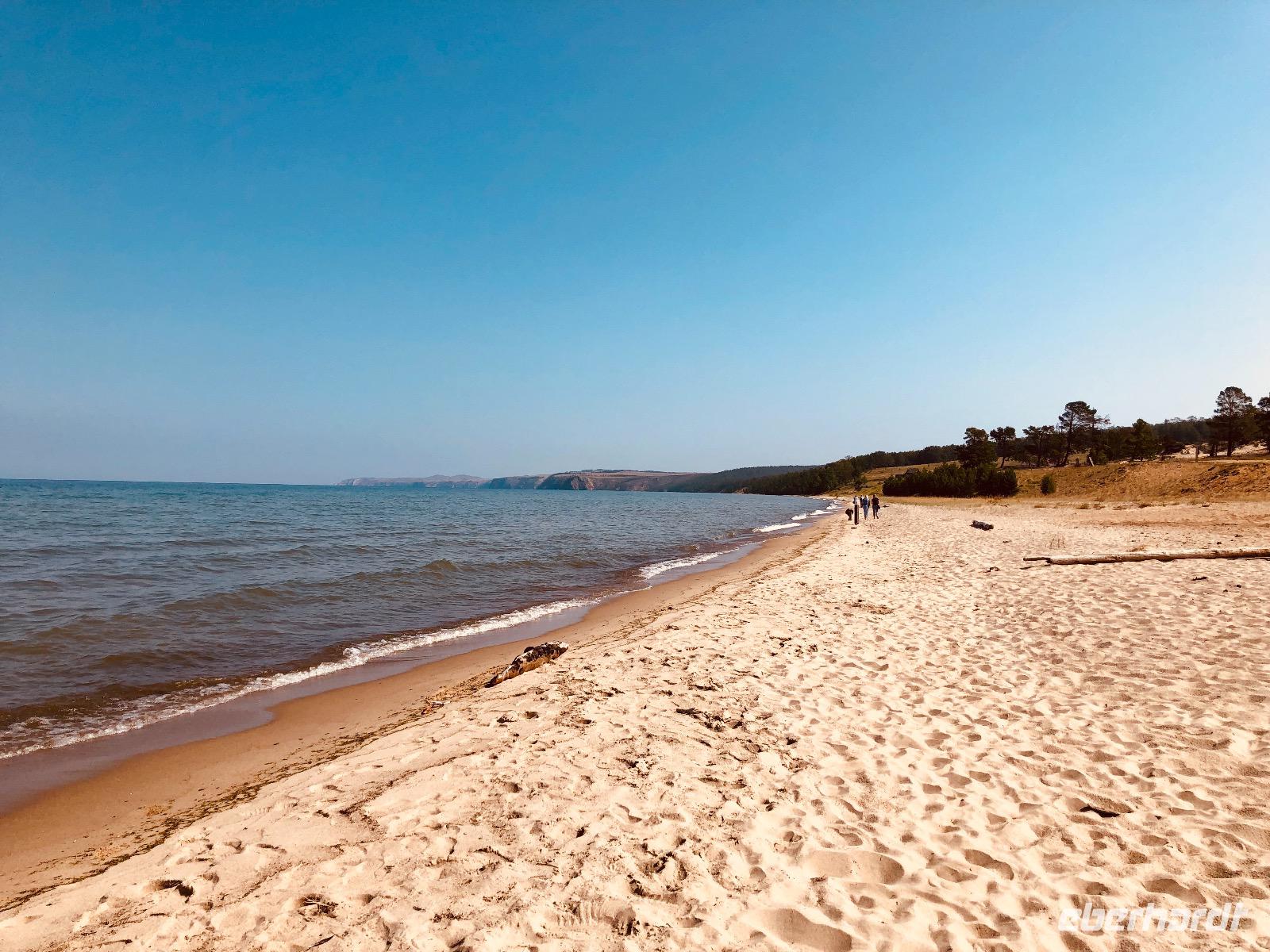 Die Zimmer befinden sich in der ersten bis dritten Etage, einen Fahrstuhl gibt es nicht, aber auf Nachfrage einen Gepäckservice. Wir gönnen uns eine halbstündige Pause und unternehmen dann einen Spaziergang am Baikalsee. Bis zum Hotel Mayak, wo sich ein paar Souvenirläden, Banken und kleine Shops befinden, sind es knapp zwei Kilometer. Pünktlich zum Abendessen sind wir zurück im Hotel. Unsere Tische sind eingedeckt und die Küche erweist sich als exzellent. Alle Speisen sind liebevoll angerichtet und werden von freundlichen Kellnern serviert. Unser Reiseveranstalter Eberhardt TRAVEL spendiert einen sibirischen Wodka, wir stoßen an auf unsere Ankunft am Baikalsee und in der Hoffnung auf spannende Tage.