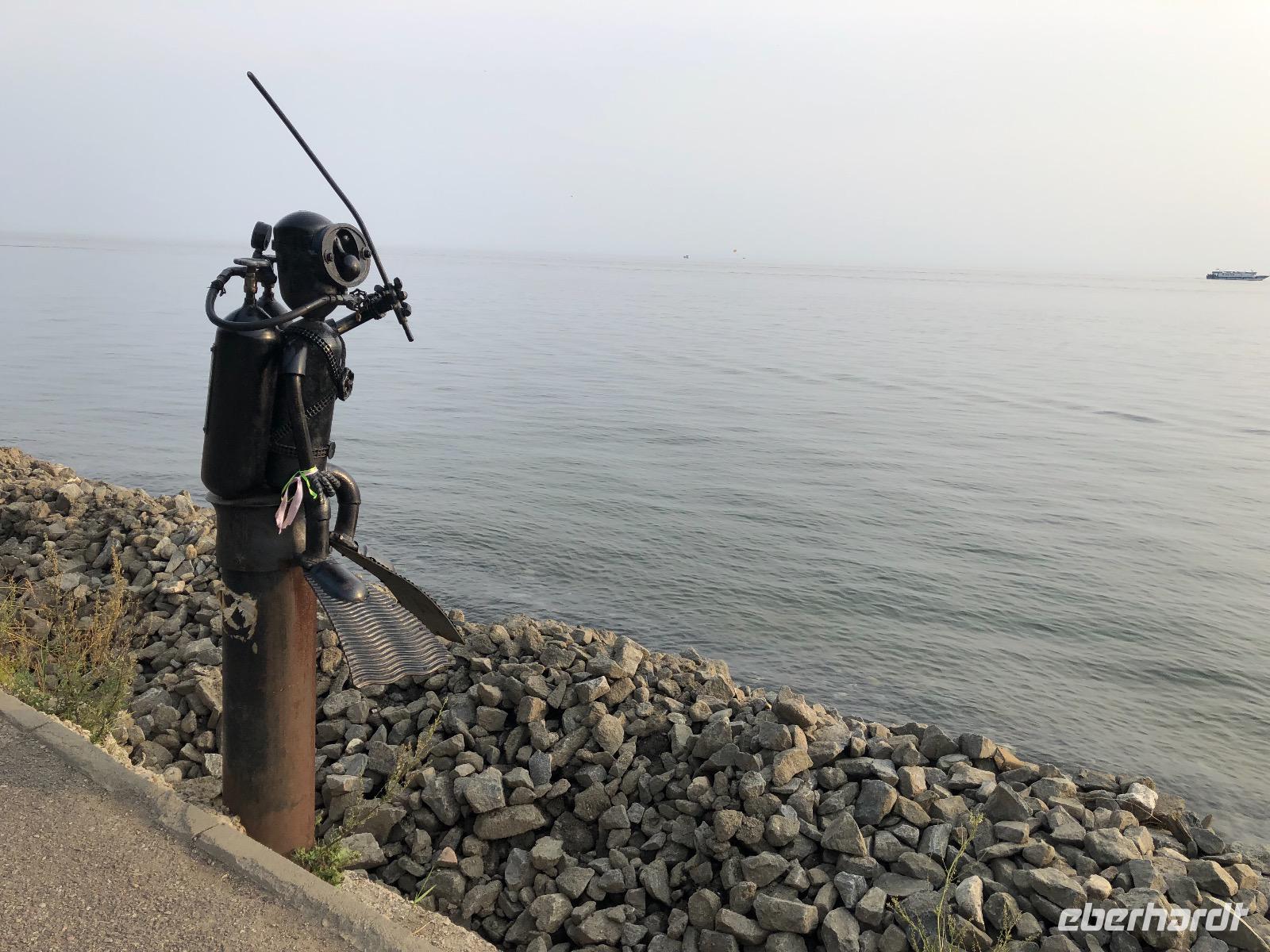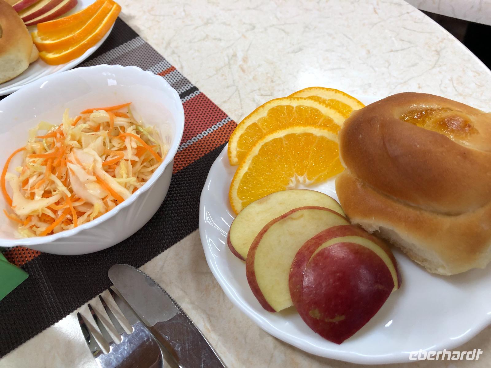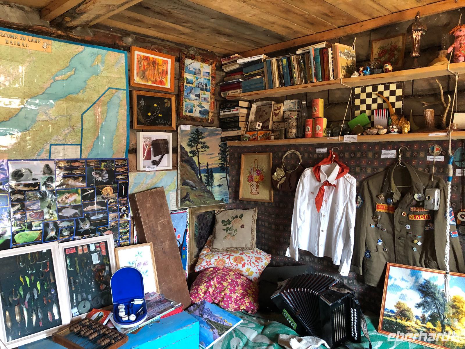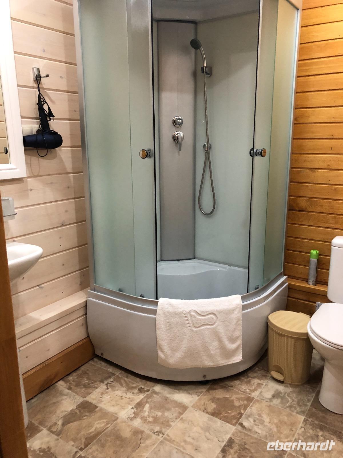 Die Zimmer befinden sich in der ersten bis dritten Etage, einen Fahrstuhl gibt es nicht, aber auf Nachfrage einen Gepäckservice. Wir gönnen uns eine halbstündige Pause und unternehmen dann einen Spaziergang am Baikalsee. Bis zum Hotel Mayak, wo sich ein paar Souvenirläden, Banken und kleine Shops befinden, sind es knapp zwei Kilometer. Pünktlich zum Abendessen sind wir zurück im Hotel. Unsere Tische sind eingedeckt und die Küche erweist sich als exzellent. Alle Speisen sind liebevoll angerichtet und werden von freundlichen Kellnern serviert. Unser Reiseveranstalter Eberhardt TRAVEL spendiert einen sibirischen Wodka, wir stoßen an auf unsere Ankunft am Baikalsee und in der Hoffnung auf spannende Tage.