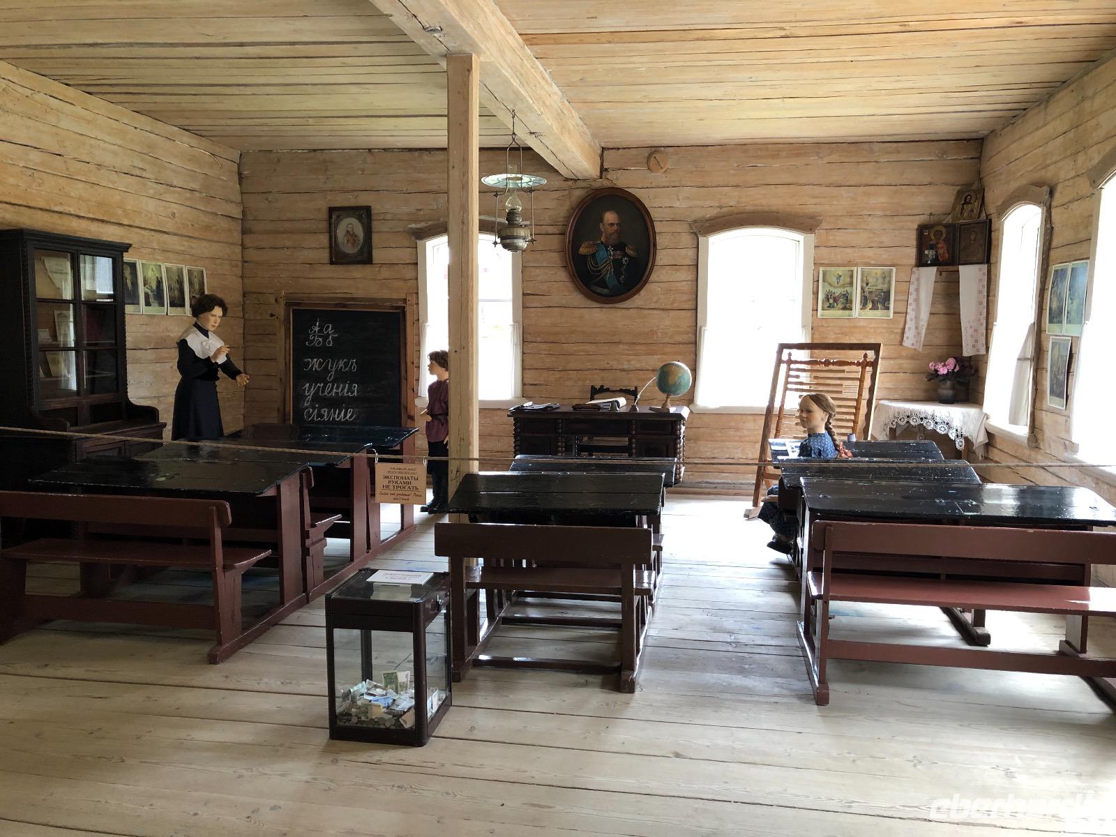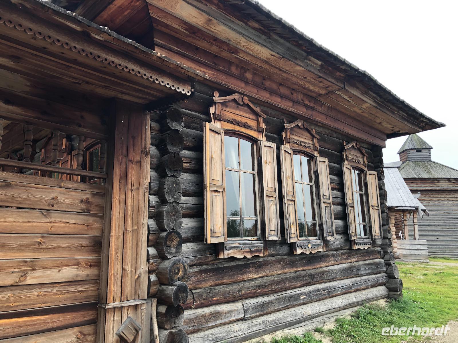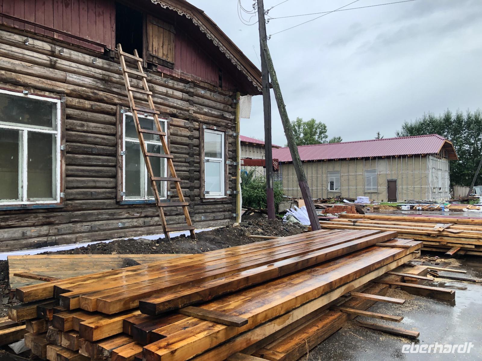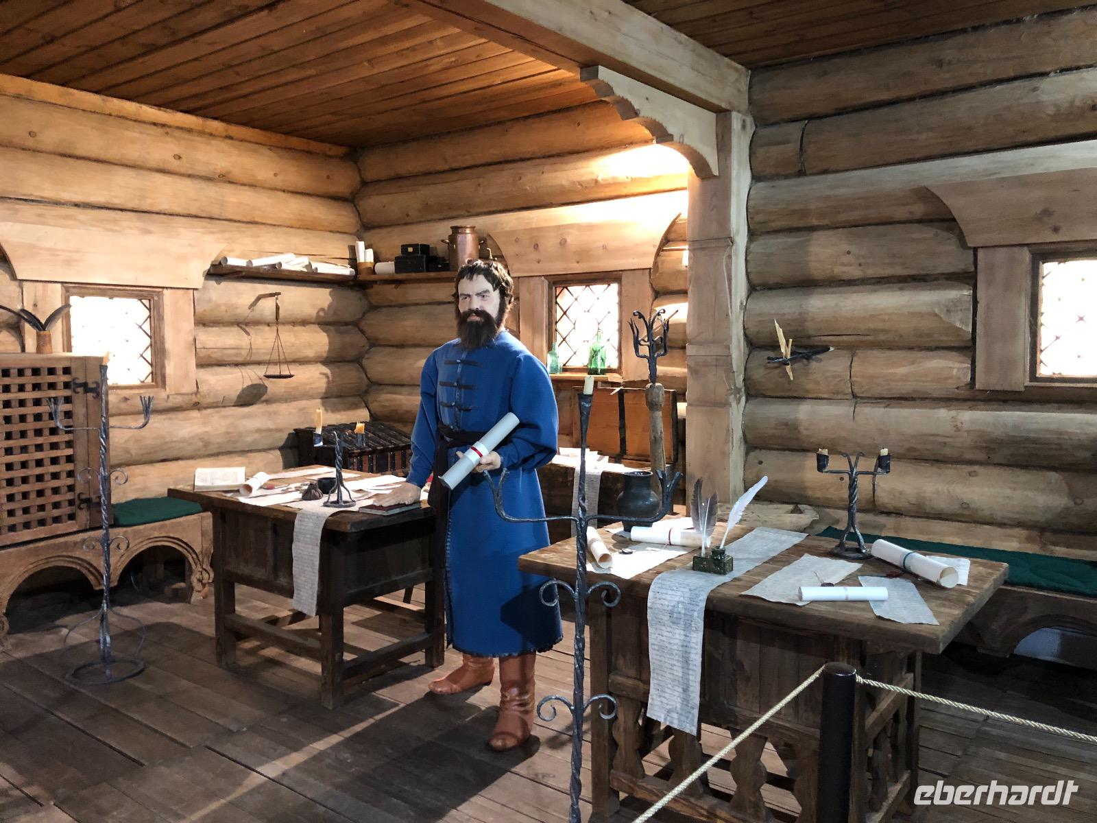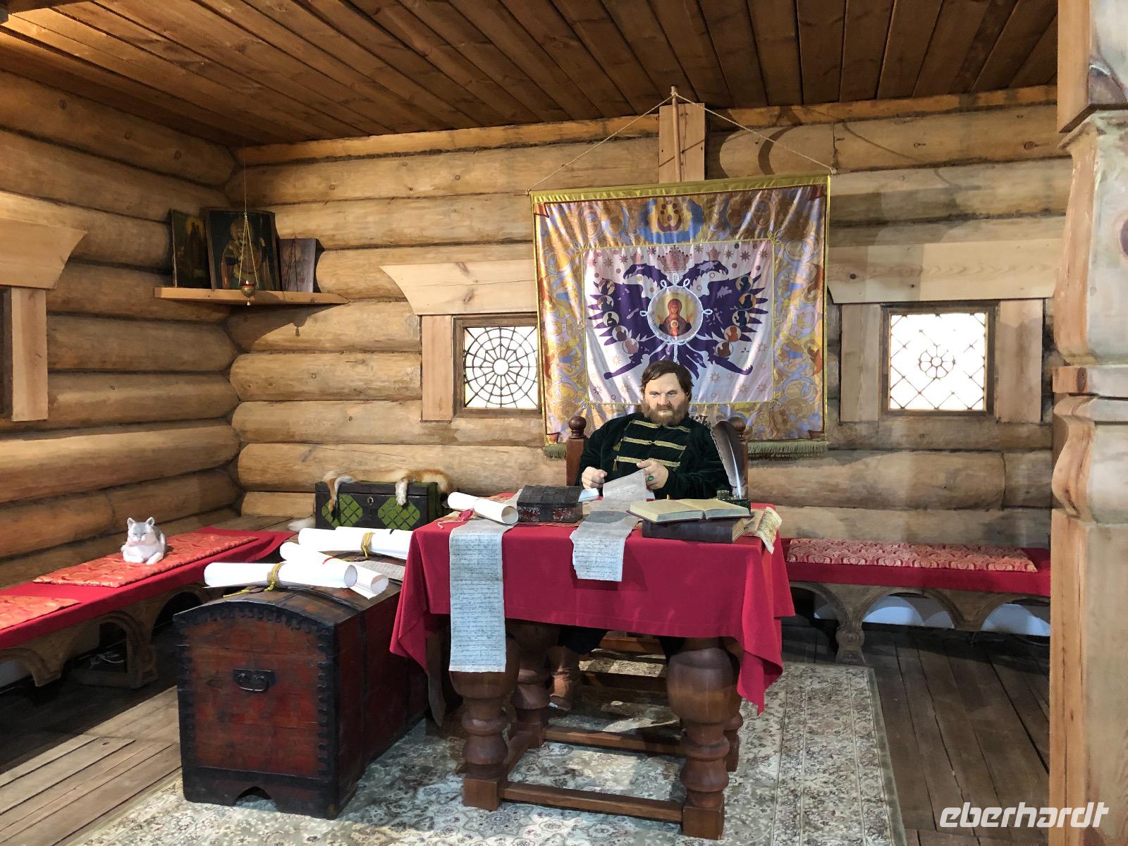 Um 9.20 Uhr erwartet uns Lidia am heutigen Tag. Da der Wetterbericht einiges an Regen voraussagt, wollen wir den Tagesablauf ändern und zuerst mit dem Sessellift fahren. Am Ticketschalter stellt sich jedoch heraus, dass dieser montags erst ab 12 Uhr fährt. Also zurück zur ursprünglichen Planung. Wir fahren zum Freilichtmuseum Talzy, in dem Holzarchitektur aus ganz Ostsibirien zu besichtigen ist. Hier gibt es unter anderem ein Fort zu sehen, wie es vor vielen Jahren von Kosaken errichtet wurde. Außerdem Bauernhäuser aus einem Dorf, dass wegen dem Bau eines Staudamms überflutet wurde. Wir besichtigen eine alte Schule und eine Ausstellung traditioneller Kleidung. Nach dem Besuch von Talzy fahren wir zum Baikalmuseum. Hier wird die geologische Entstehung der Region erklärt und wir erfahren einiges über die Tiere in und um den Baikalsee.