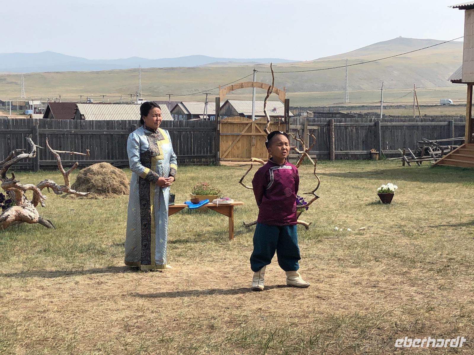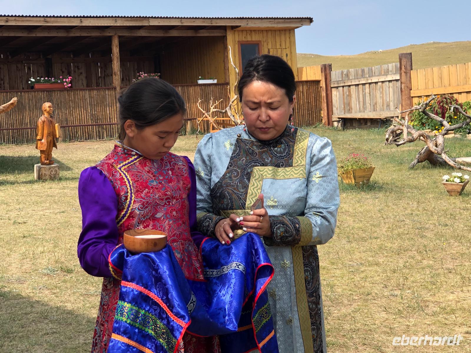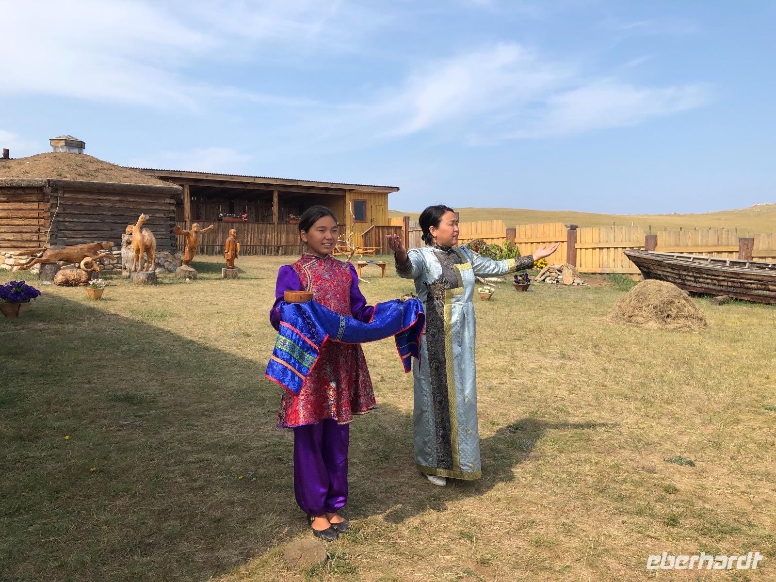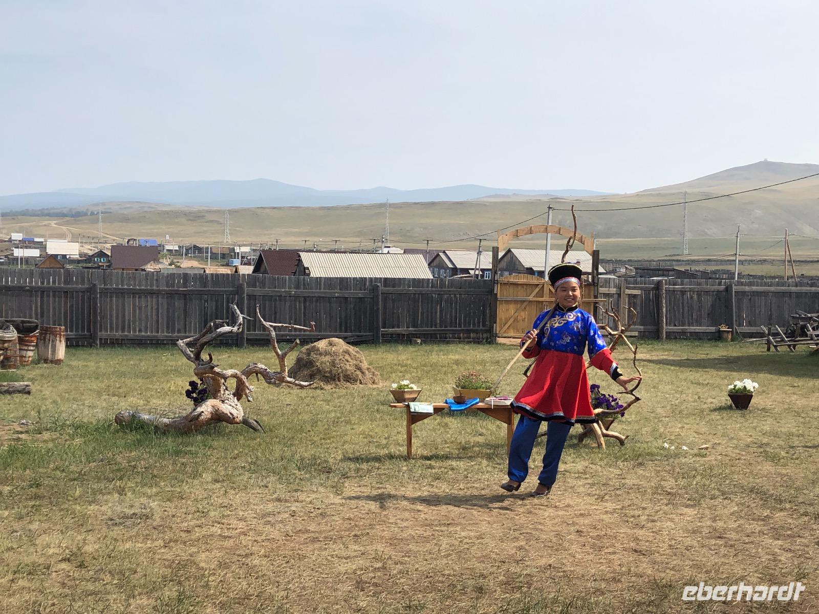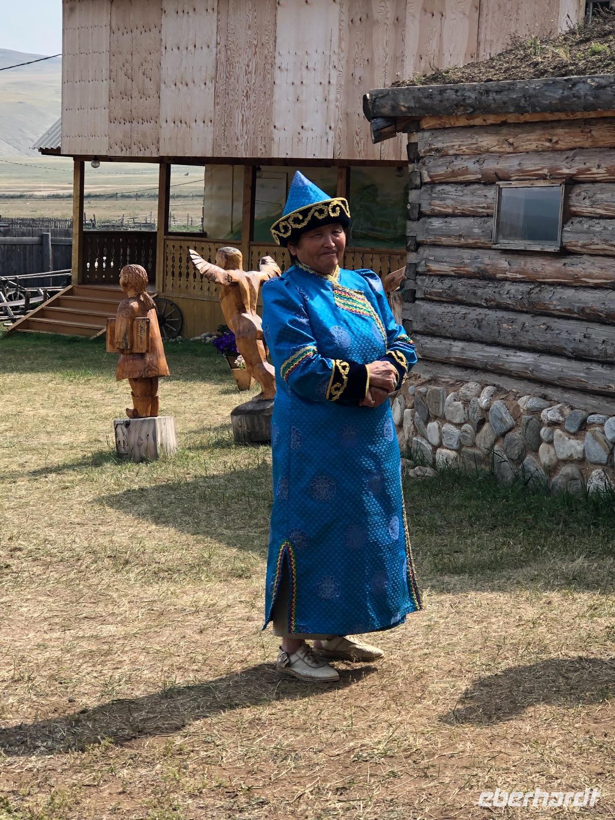 Erst am Mittag verlassen wir das Hotel.Im Mittelpunkt des heutigen Tages steht der Besuch einer burjatischen Familie. Als wir ankommen, öffnet sich ein schweres Holztor und eine schön gekleidete Frau bittet uns herein. Es stellt sich heraus, dass sie die Dame des Hauses ist. Gemeinsam mit ihrer Tochter begrüßt sie uns mit einem Ritual. Zunächst werden Kräuter in einer kleinen Schale angezündet. Mit dem Rauch werden die Gäste gereinigt. Anschließend trinkt jeder einen Schluck aus einer Schale mit heiliger Milch. Dies dient der Innenreinigung. Wichtig ist, dass die Schale zum Schluss geleert ist. Das schaffen wir. Nun führt uns Natalja, unsere Gastgeberin, durch ihr Anwesen. Wir lernen alte Werkzeuge und Fahrzeuge kennen und besichtigen eine Jurte, die vor vielen Jahren von einer Urahnin als Museum eingerichtet wurde. Es gibt weitere Jurten, in denen sich verschiedenen Ausstellungen befinden. Feine Kleider, eine Art Kunstgalerie und ein paar ausgestopfte Tiere. Jetzt werden wir von der Großmutter unterhalten. Sie singt von ganzem Herzen für uns und lässt uns Rätsel raten. Offensichtlich hat sie viel Spaß dabei.