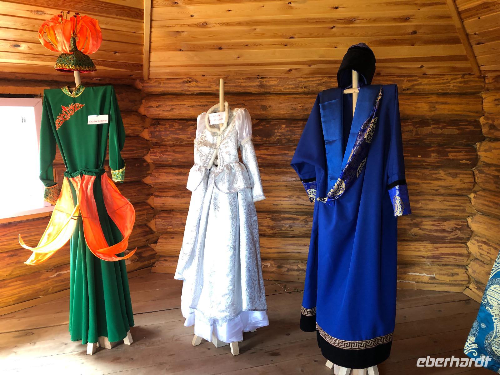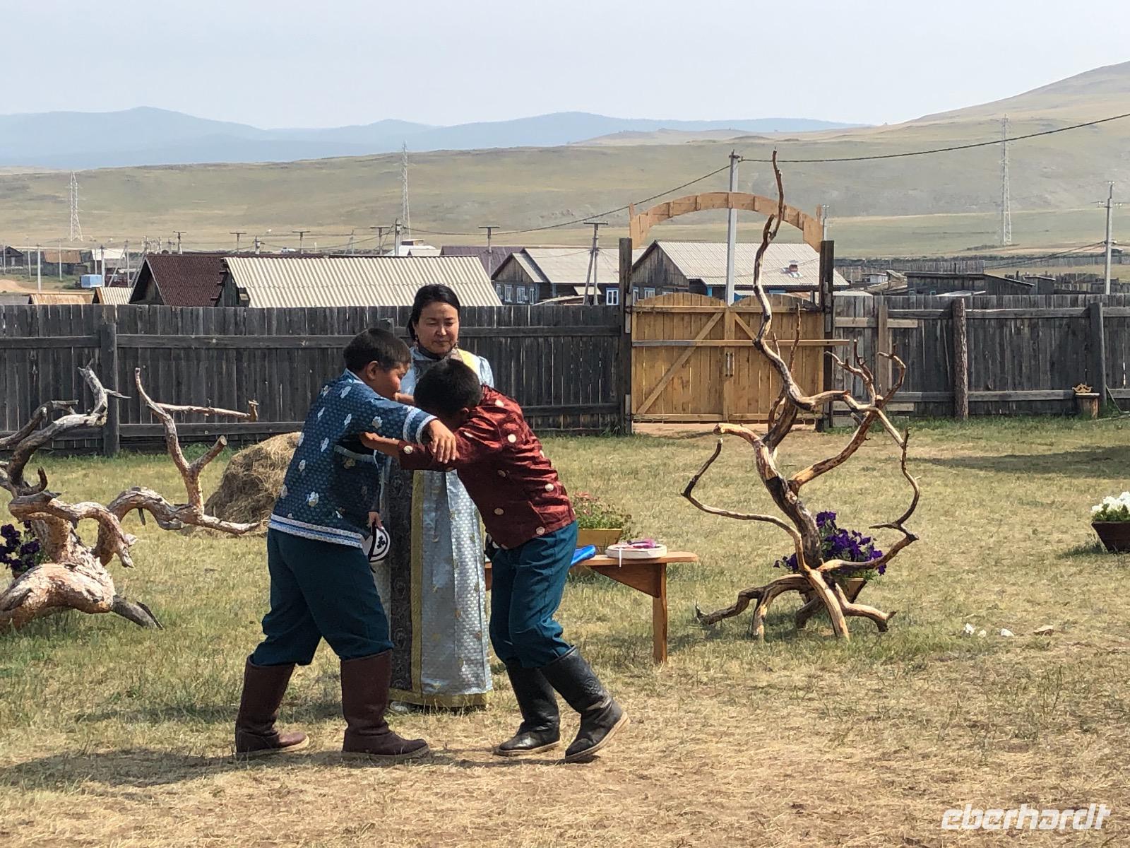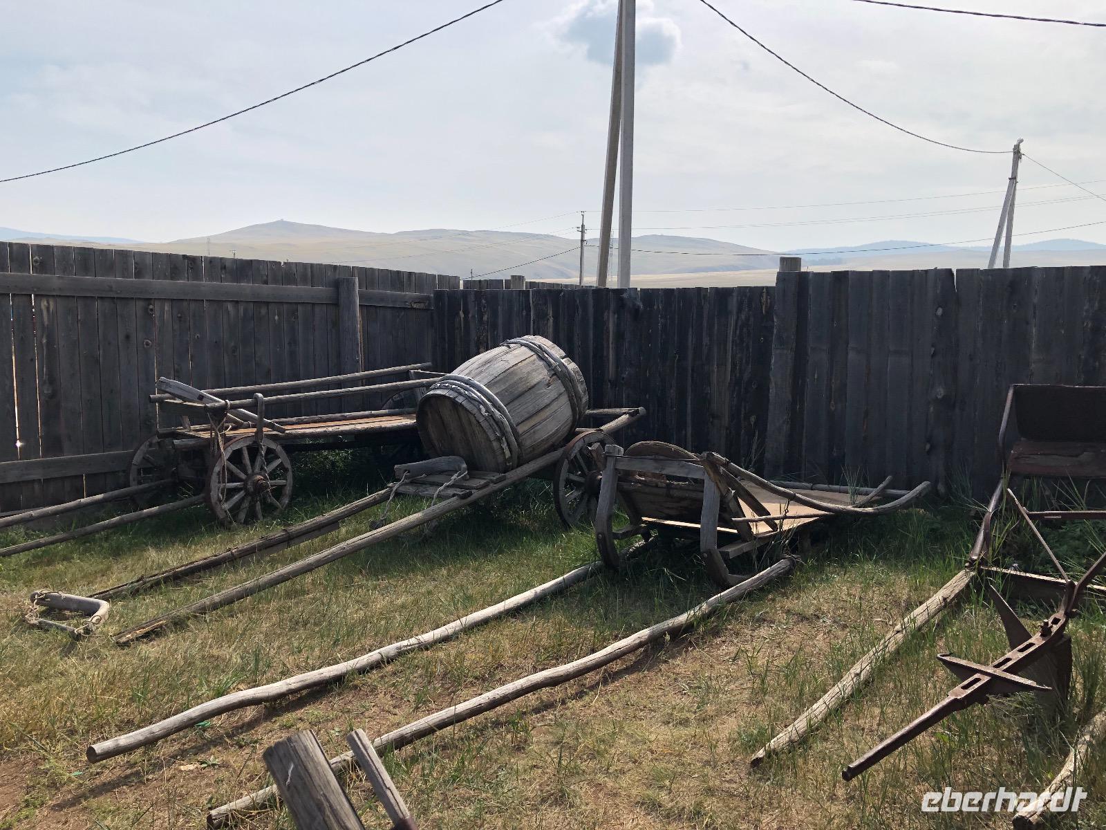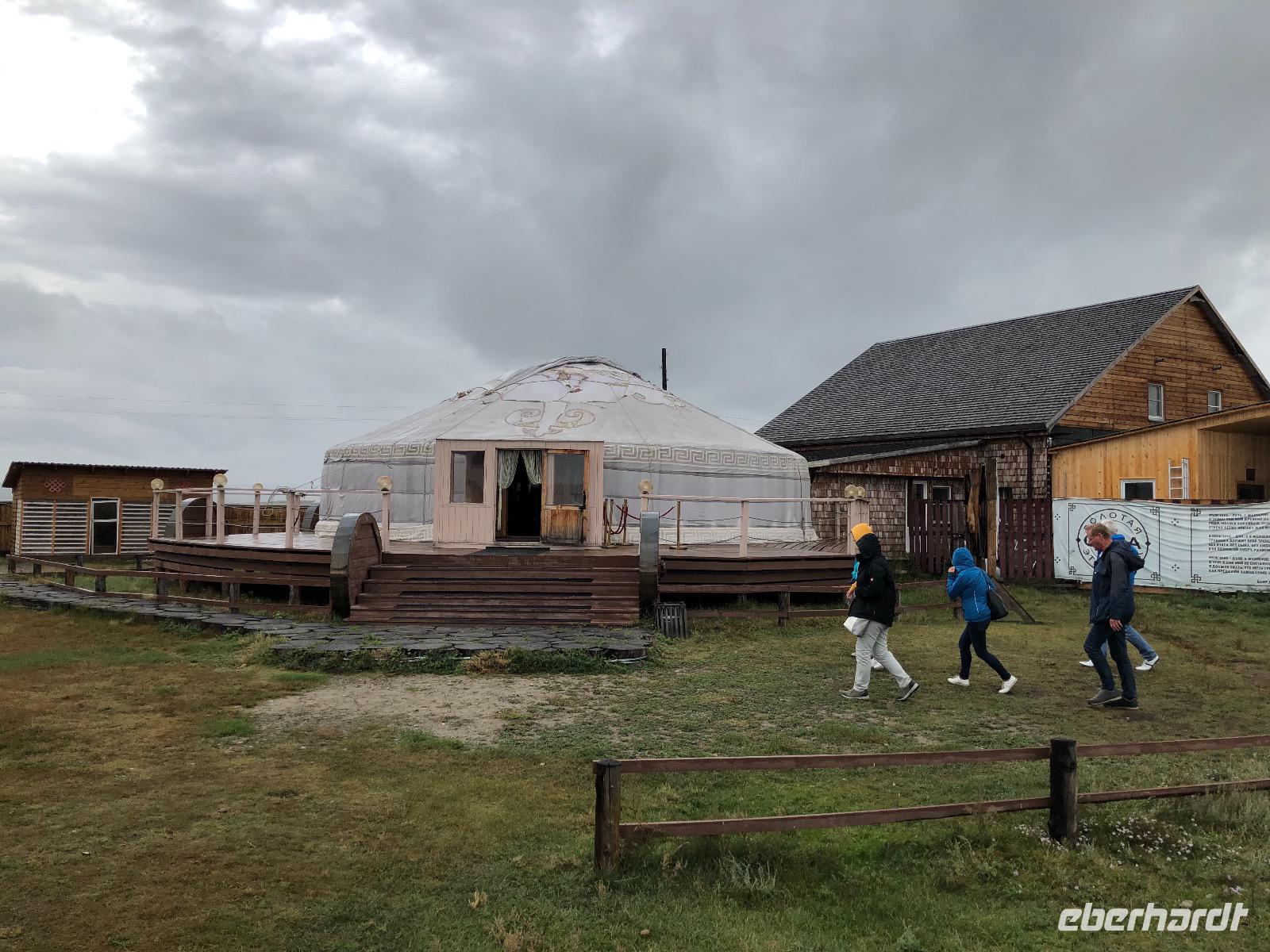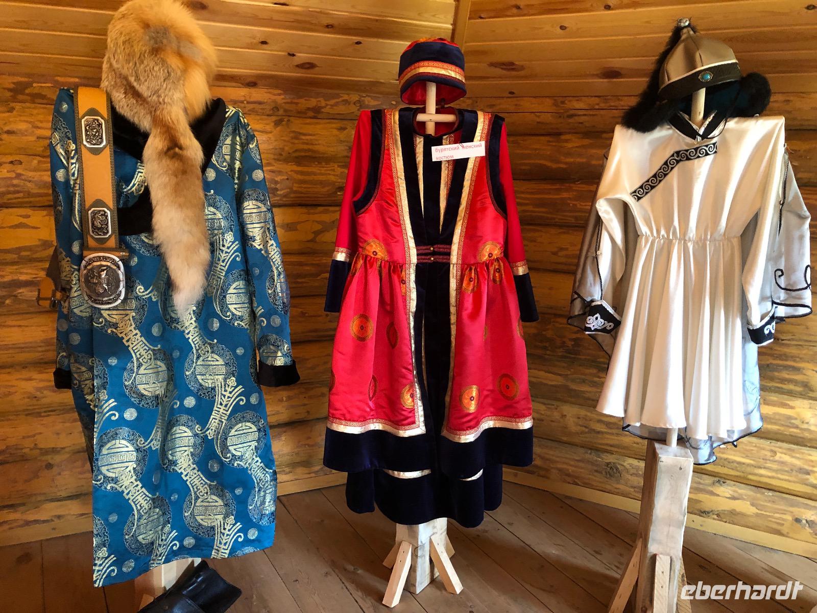 Erst am Mittag verlassen wir das Hotel.Im Mittelpunkt des heutigen Tages steht der Besuch einer burjatischen Familie. Als wir ankommen, öffnet sich ein schweres Holztor und eine schön gekleidete Frau bittet uns herein. Es stellt sich heraus, dass sie die Dame des Hauses ist. Gemeinsam mit ihrer Tochter begrüßt sie uns mit einem Ritual. Zunächst werden Kräuter in einer kleinen Schale angezündet. Mit dem Rauch werden die Gäste gereinigt. Anschließend trinkt jeder einen Schluck aus einer Schale mit heiliger Milch. Dies dient der Innenreinigung. Wichtig ist, dass die Schale zum Schluss geleert ist. Das schaffen wir. Nun führt uns Natalja, unsere Gastgeberin, durch ihr Anwesen. Wir lernen alte Werkzeuge und Fahrzeuge kennen und besichtigen eine Jurte, die vor vielen Jahren von einer Urahnin als Museum eingerichtet wurde. Es gibt weitere Jurten, in denen sich verschiedenen Ausstellungen befinden. Feine Kleider, eine Art Kunstgalerie und ein paar ausgestopfte Tiere. Jetzt werden wir von der Großmutter unterhalten. Sie singt von ganzem Herzen für uns und lässt uns Rätsel raten. Offensichtlich hat sie viel Spaß dabei.