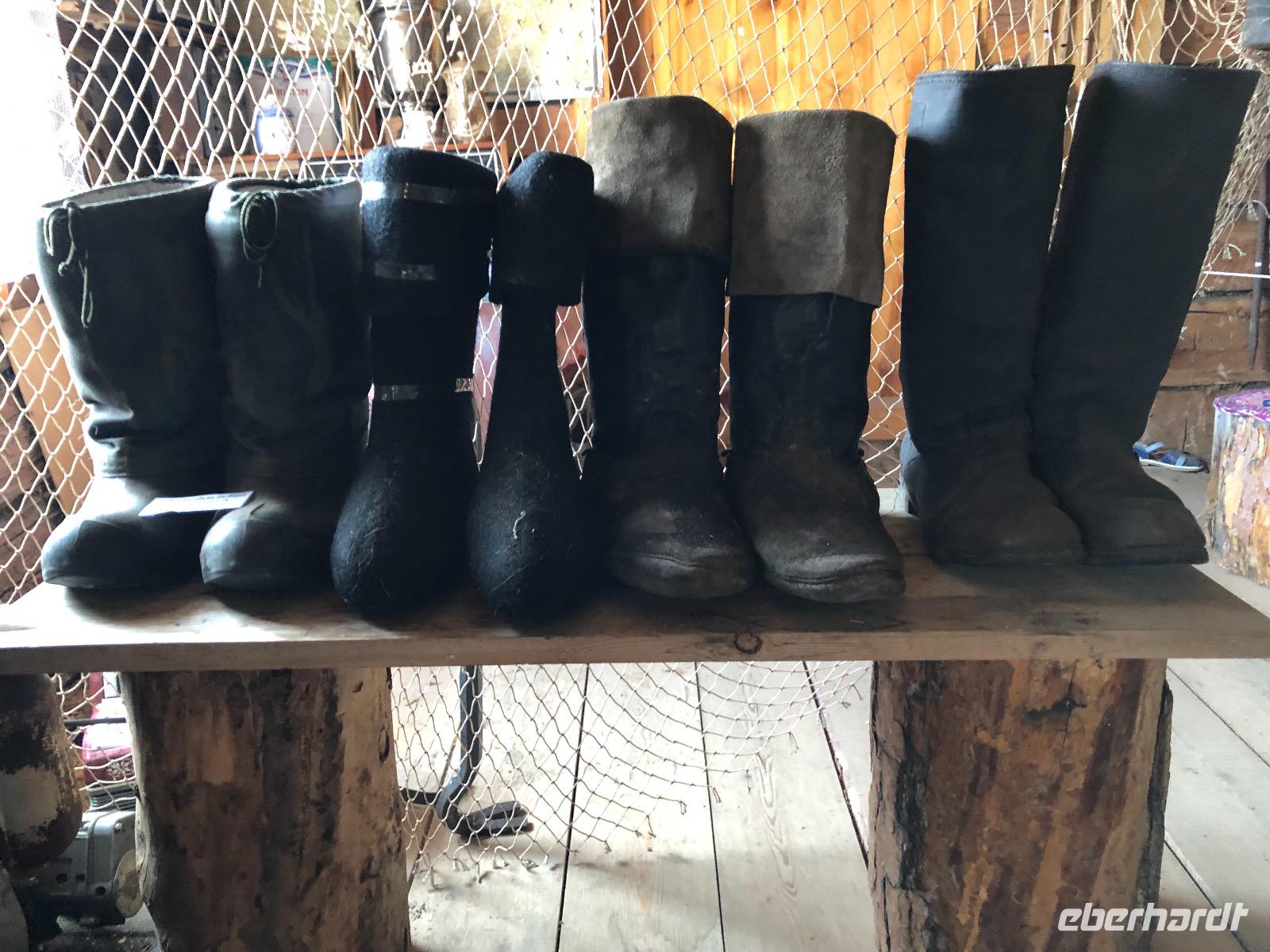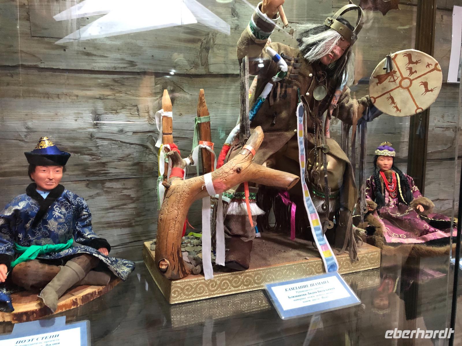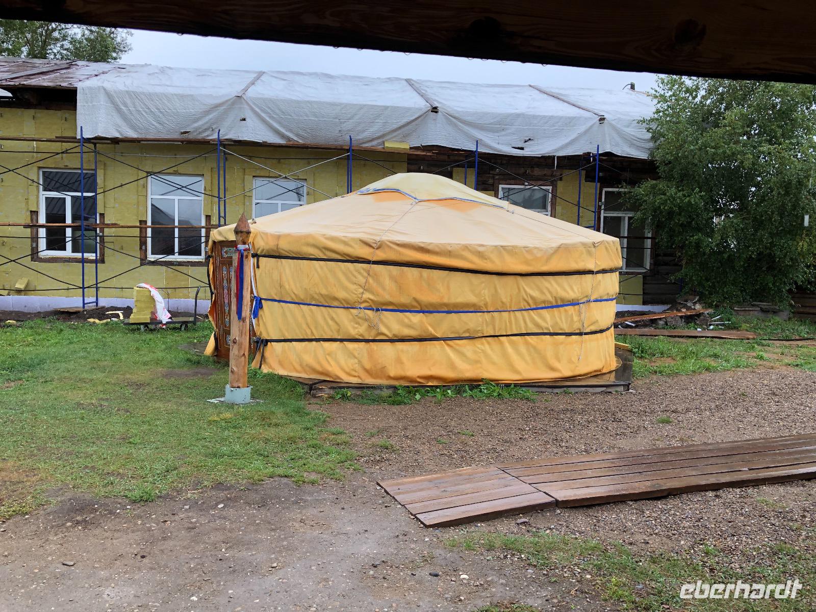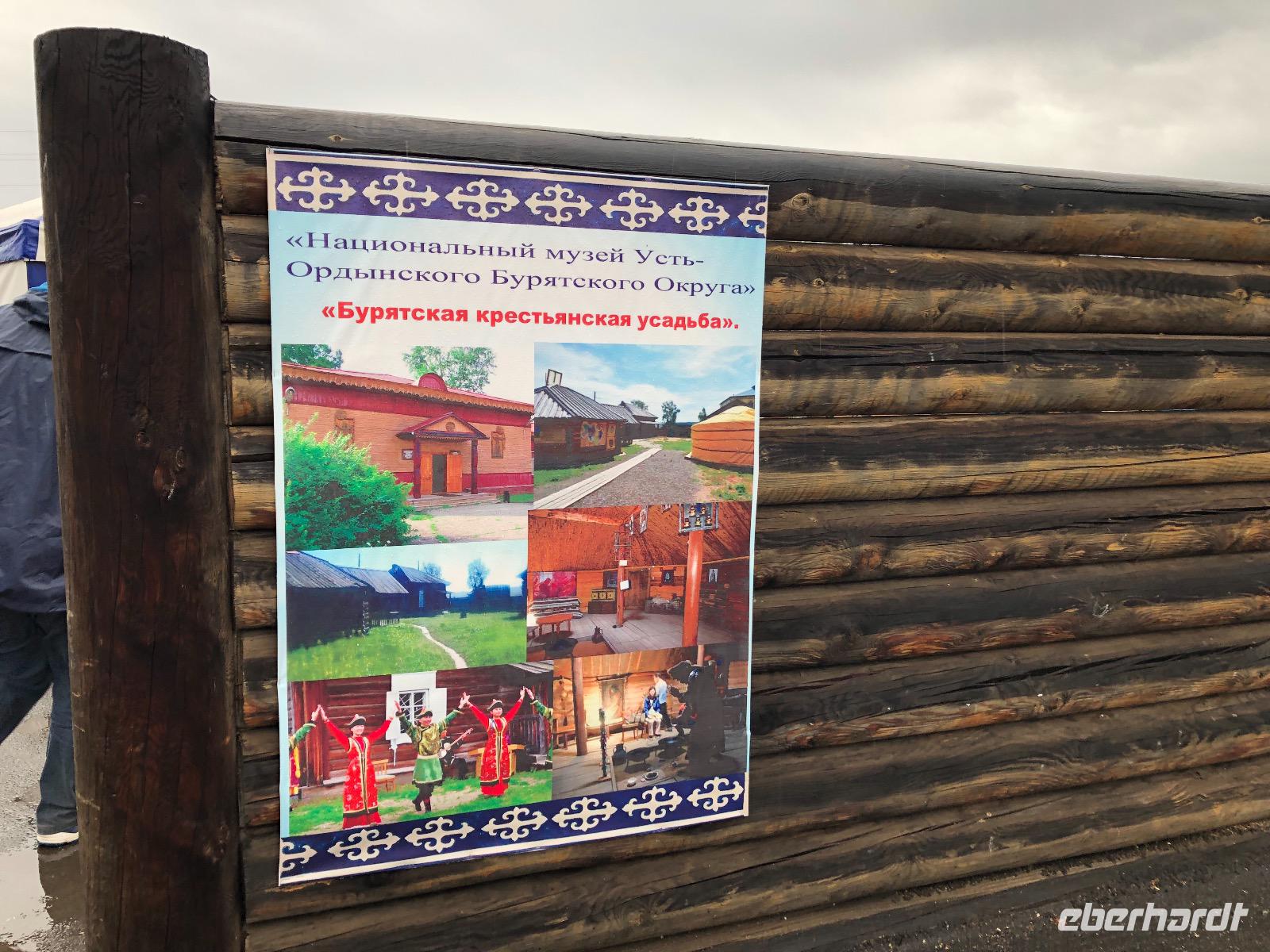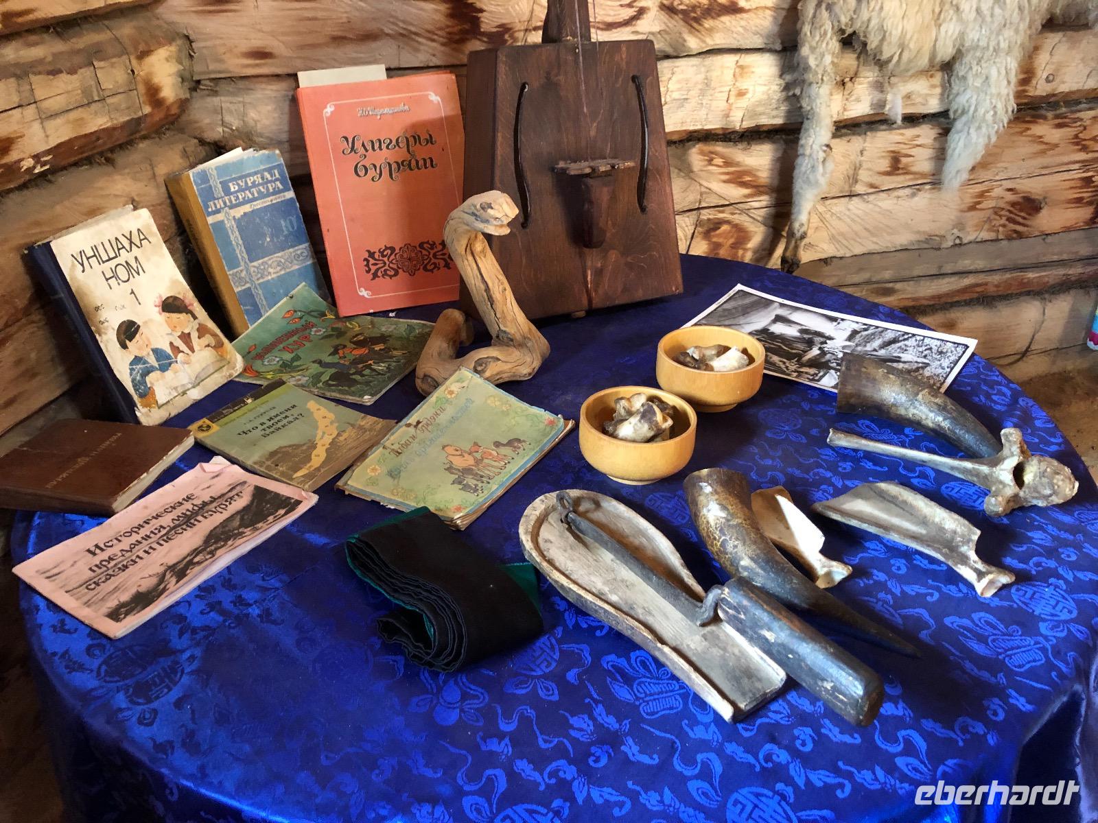 Erst am Mittag verlassen wir das Hotel.Im Mittelpunkt des heutigen Tages steht der Besuch einer burjatischen Familie. Als wir ankommen, öffnet sich ein schweres Holztor und eine schön gekleidete Frau bittet uns herein. Es stellt sich heraus, dass sie die Dame des Hauses ist. Gemeinsam mit ihrer Tochter begrüßt sie uns mit einem Ritual. Zunächst werden Kräuter in einer kleinen Schale angezündet. Mit dem Rauch werden die Gäste gereinigt. Anschließend trinkt jeder einen Schluck aus einer Schale mit heiliger Milch. Dies dient der Innenreinigung. Wichtig ist, dass die Schale zum Schluss geleert ist. Das schaffen wir. Nun führt uns Natalja, unsere Gastgeberin, durch ihr Anwesen. Wir lernen alte Werkzeuge und Fahrzeuge kennen und besichtigen eine Jurte, die vor vielen Jahren von einer Urahnin als Museum eingerichtet wurde. Es gibt weitere Jurten, in denen sich verschiedenen Ausstellungen befinden. Feine Kleider, eine Art Kunstgalerie und ein paar ausgestopfte Tiere. Jetzt werden wir von der Großmutter unterhalten. Sie singt von ganzem Herzen für uns und lässt uns Rätsel raten. Offensichtlich hat sie viel Spaß dabei.