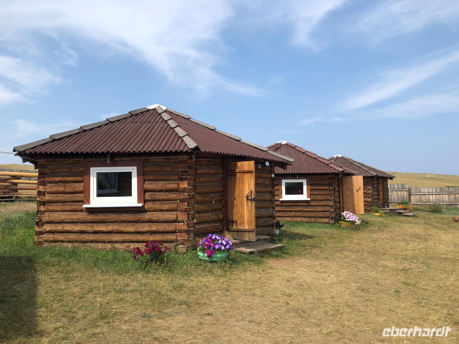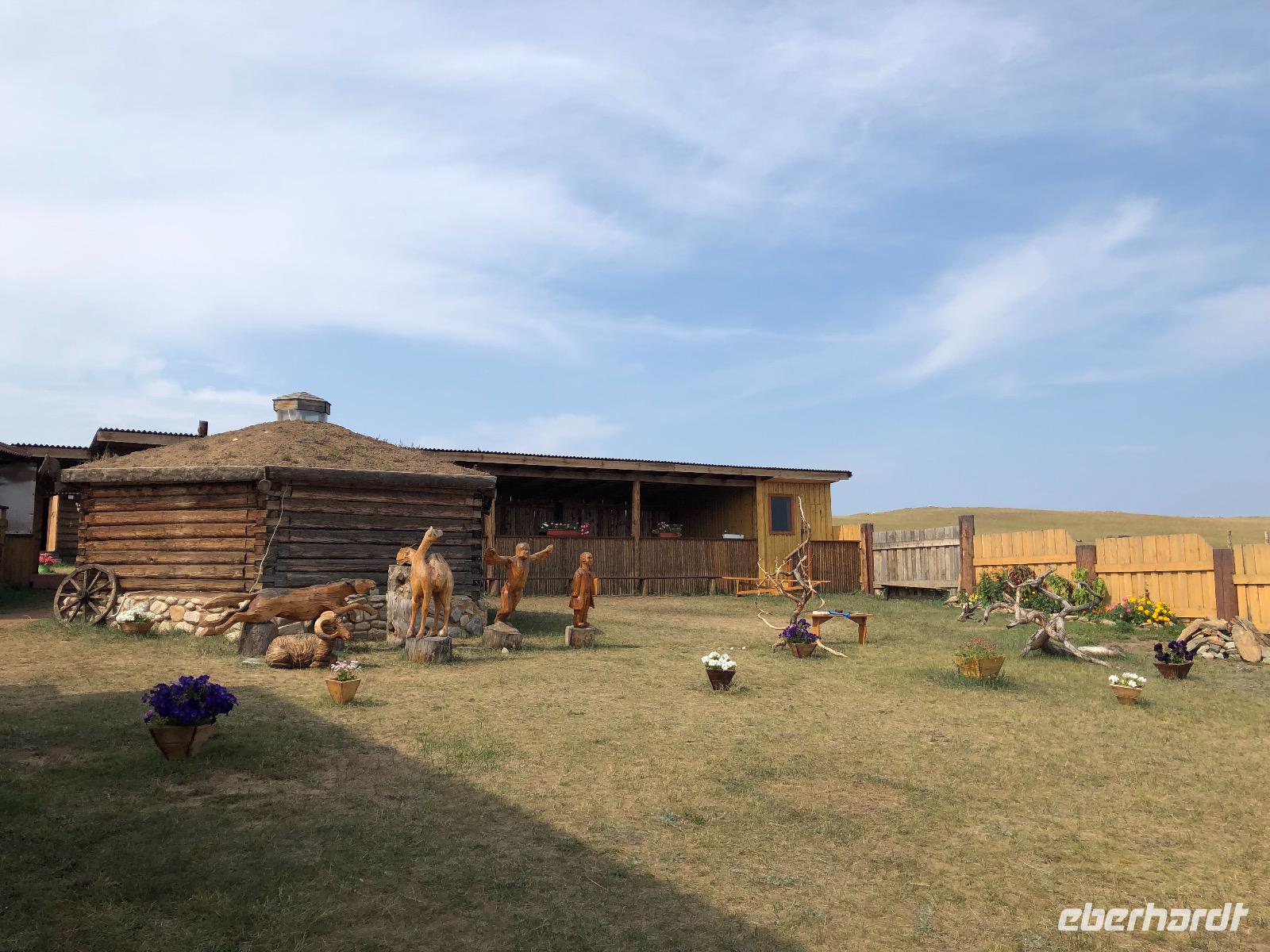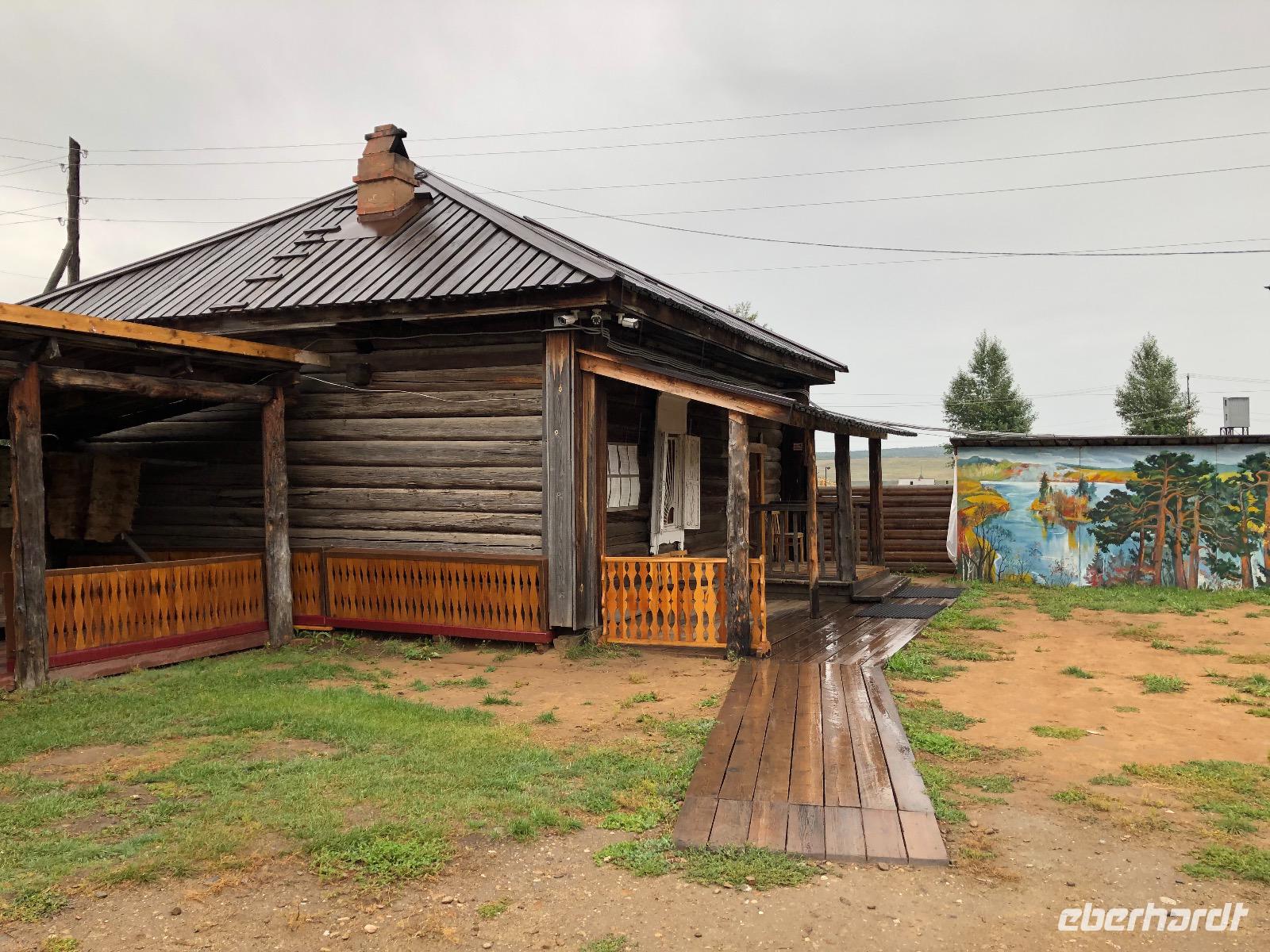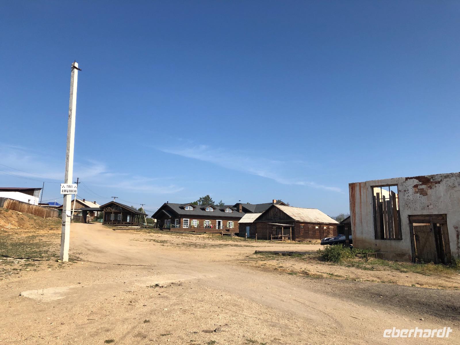 Die Insel Olchon ist mit siebenhundert Quadratkilometern die größte der 27 Inseln im Baikalsee. Wenn sie aber die Perle ist, dann eine, die noch mächtig geschliffen werden muss.Wenn man in Chuzir, dem Hauptort von Olchon einfährt, fühlt man sich wie im Wilden Westen. Die Hauptstraße ist breit und aus staubigem Sand. Links und rechts stehen zweistöckige Holzhäuser, eines schiefer als das andere. Man bekommt den Eindruck, dass jeder, dem es gerade einfiel und der Zeit und ein bisschen Material hatte, sich hier seine Hütte bauen konnte. In einigen der Häuschen verstecken sich Souvenirläden, andere sind Bars oder Hostels. Über die breite staubige Straße kommen uns Autos entgegen, die es in diesem Jahrhundert eigentlich nicht mehr gibt. Man ist versucht, nach einer Filmcrew Ausschau zu halten.Wir checken im Mini Hotel Baikal ein und bald stellt sich heraus, dass wir wieder einen Neuanbau erwischt haben. Eine freundliche burjatische Familie empfängt uns. Der muskelbepackte Familienvater schleppt unermüdlich unsere Koffer die steilen Treppen hinauf. Mama Jana hat für uns gekocht und freut sich über unsere vereinzelten russischen Verständigungsversuche.
