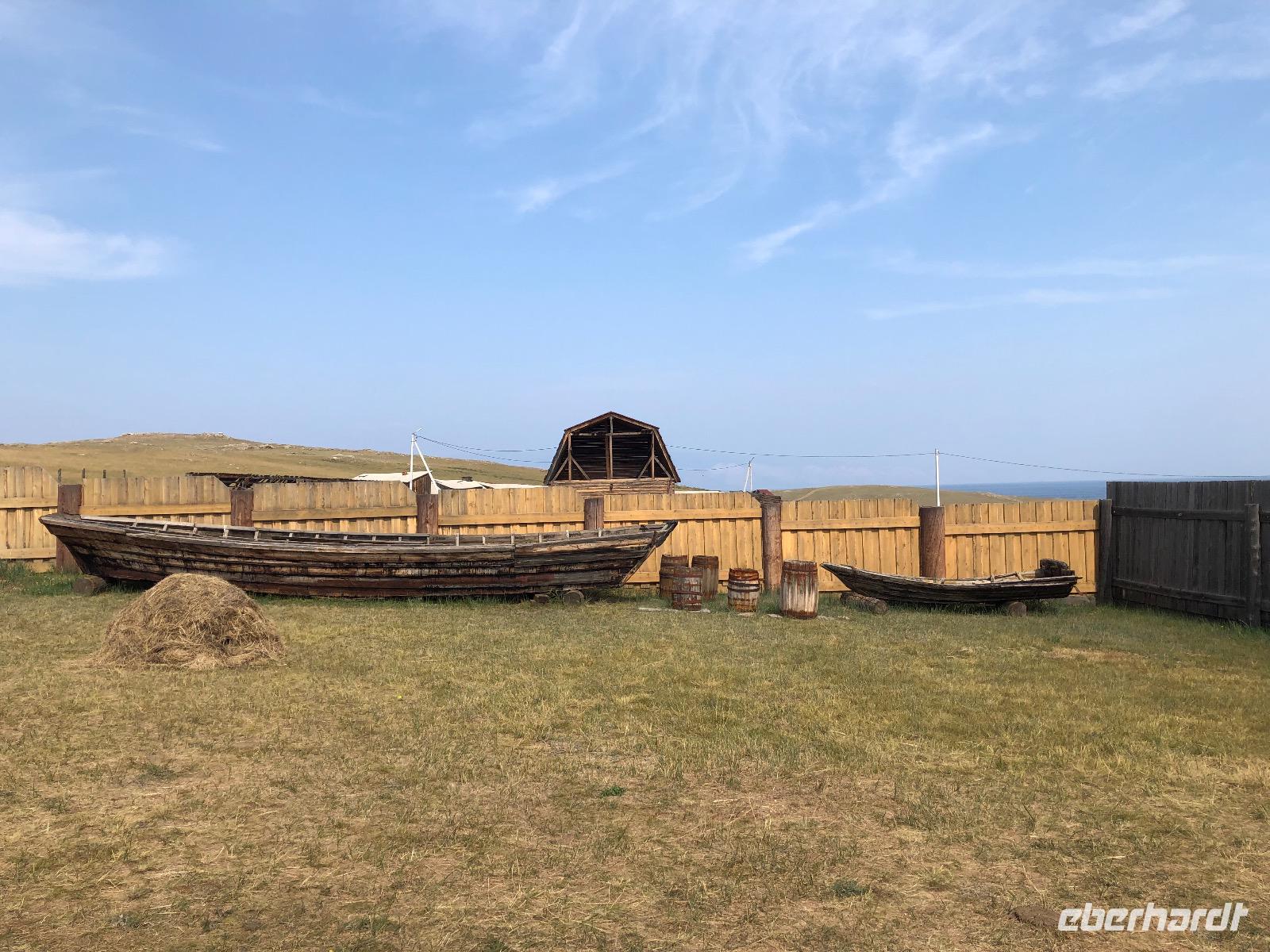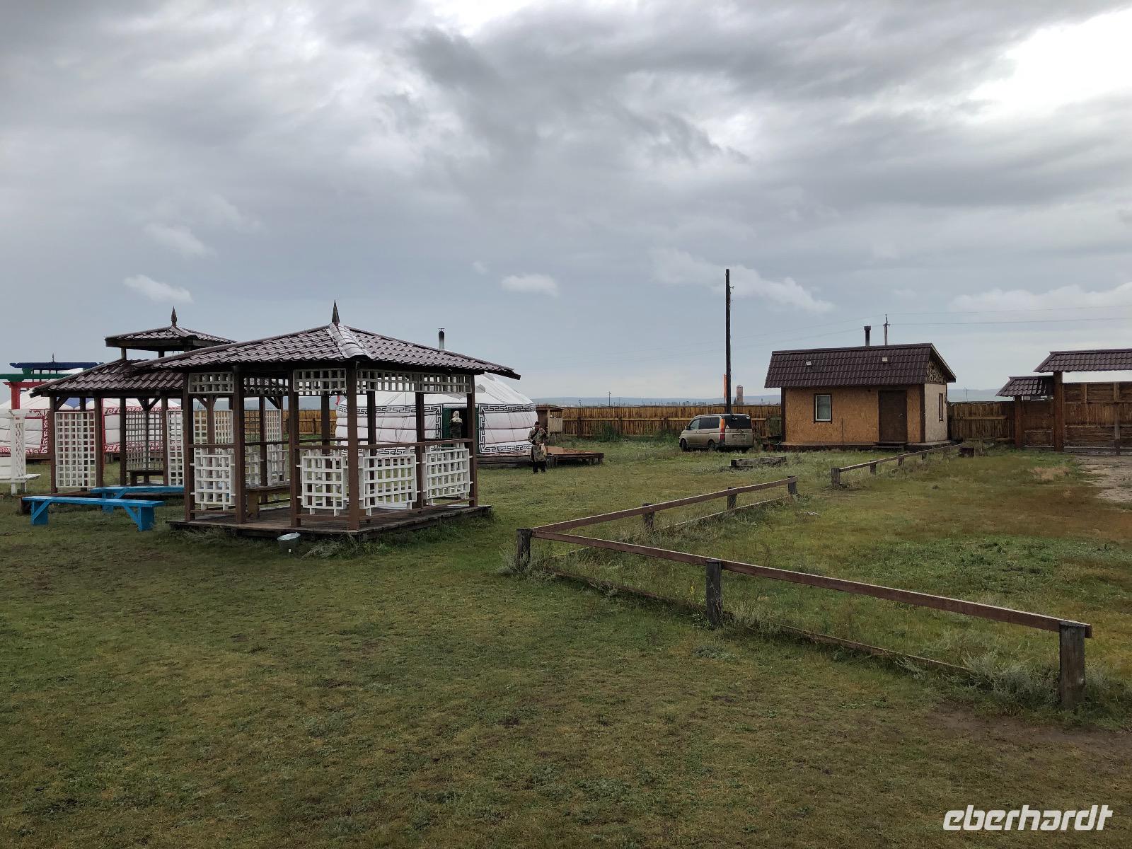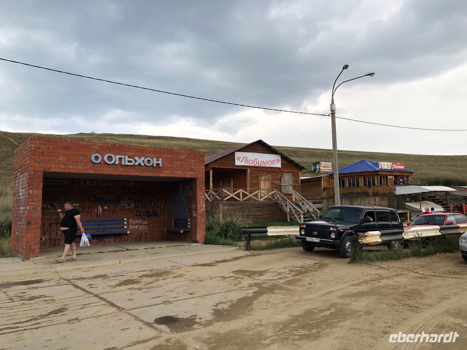 Die Insel Olchon ist mit siebenhundert Quadratkilometern die größte der 27 Inseln im Baikalsee. Wenn sie aber die Perle ist, dann eine, die noch mächtig geschliffen werden muss.Wenn man in Chuzir, dem Hauptort von Olchon einfährt, fühlt man sich wie im Wilden Westen. Die Hauptstraße ist breit und aus staubigem Sand. Links und rechts stehen zweistöckige Holzhäuser, eines schiefer als das andere. Man bekommt den Eindruck, dass jeder, dem es gerade einfiel und der Zeit und ein bisschen Material hatte, sich hier seine Hütte bauen konnte. In einigen der Häuschen verstecken sich Souvenirläden, andere sind Bars oder Hostels. Über die breite staubige Straße kommen uns Autos entgegen, die es in diesem Jahrhundert eigentlich nicht mehr gibt. Man ist versucht, nach einer Filmcrew Ausschau zu halten.Wir checken im Mini Hotel Baikal ein und bald stellt sich heraus, dass wir wieder einen Neuanbau erwischt haben. Eine freundliche burjatische Familie empfängt uns. Der muskelbepackte Familienvater schleppt unermüdlich unsere Koffer die steilen Treppen hinauf. Mama Jana hat für uns gekocht und freut sich über unsere vereinzelten russischen Verständigungsversuche.