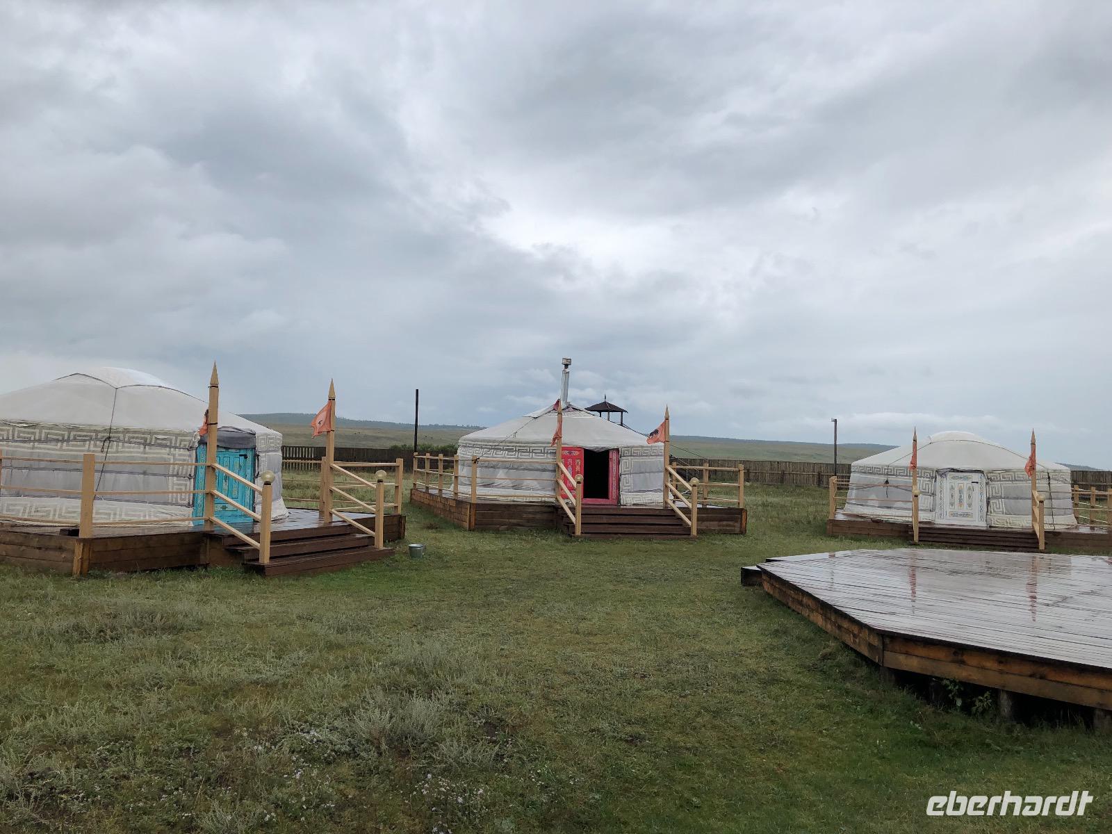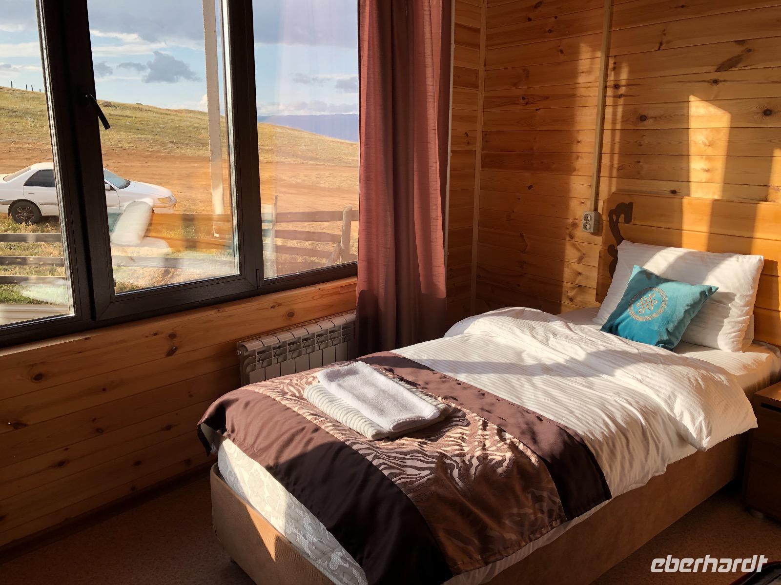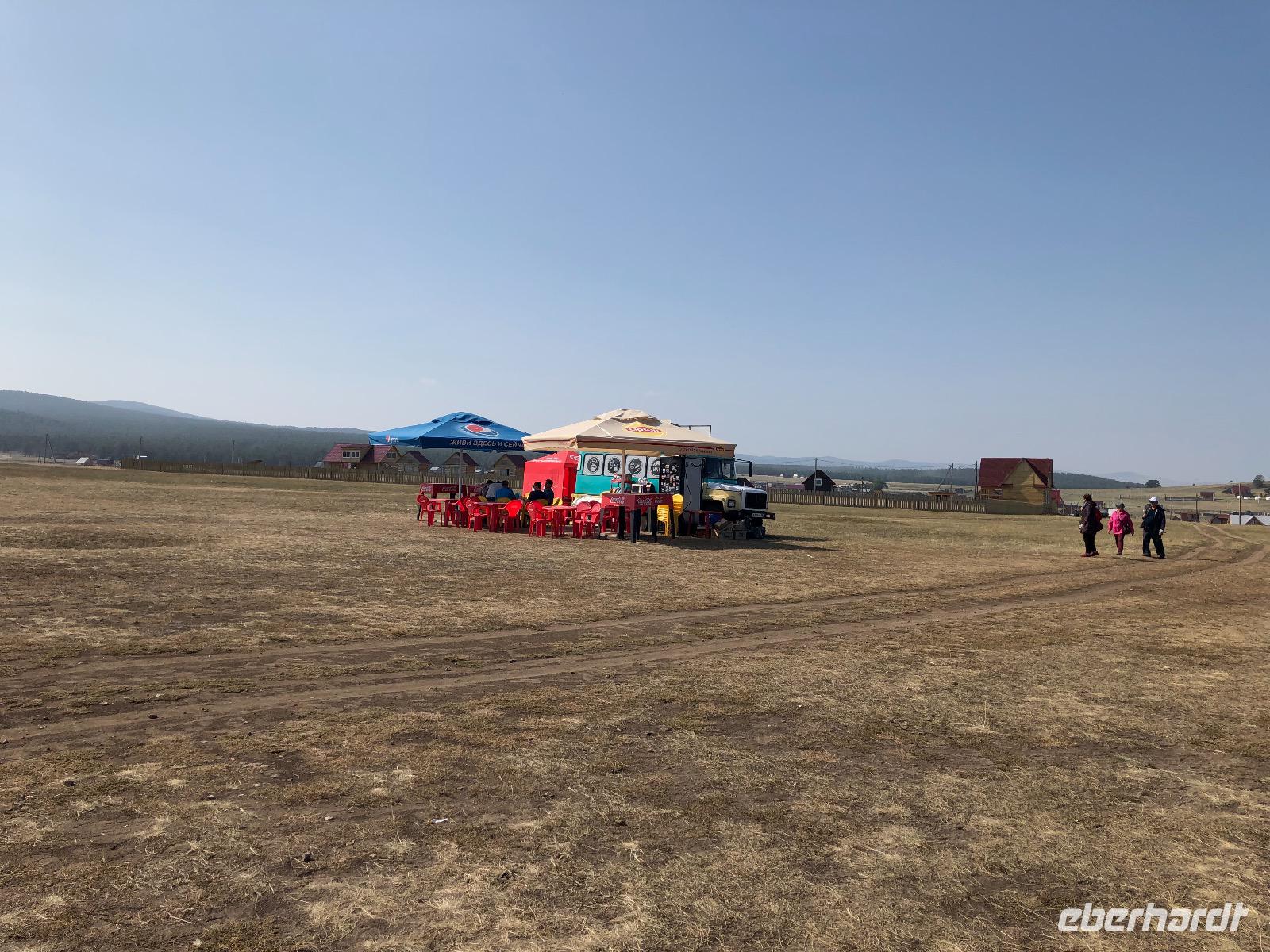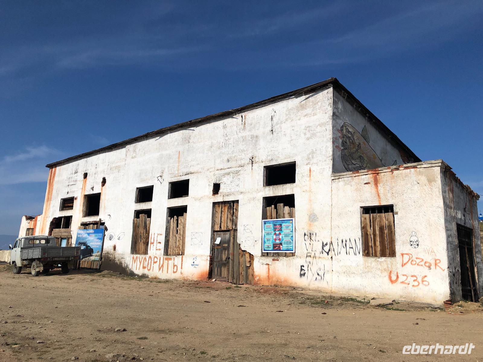 Die Insel Olchon ist mit siebenhundert Quadratkilometern die größte der 27 Inseln im Baikalsee. Wenn sie aber die Perle ist, dann eine, die noch mächtig geschliffen werden muss.Wenn man in Chuzir, dem Hauptort von Olchon einfährt, fühlt man sich wie im Wilden Westen. Die Hauptstraße ist breit und aus staubigem Sand. Links und rechts stehen zweistöckige Holzhäuser, eines schiefer als das andere. Man bekommt den Eindruck, dass jeder, dem es gerade einfiel und der Zeit und ein bisschen Material hatte, sich hier seine Hütte bauen konnte. In einigen der Häuschen verstecken sich Souvenirläden, andere sind Bars oder Hostels. Über die breite staubige Straße kommen uns Autos entgegen, die es in diesem Jahrhundert eigentlich nicht mehr gibt. Man ist versucht, nach einer Filmcrew Ausschau zu halten.Wir checken im Mini Hotel Baikal ein und bald stellt sich heraus, dass wir wieder einen Neuanbau erwischt haben. Eine freundliche burjatische Familie empfängt uns. Der muskelbepackte Familienvater schleppt unermüdlich unsere Koffer die steilen Treppen hinauf. Mama Jana hat für uns gekocht und freut sich über unsere vereinzelten russischen Verständigungsversuche.
