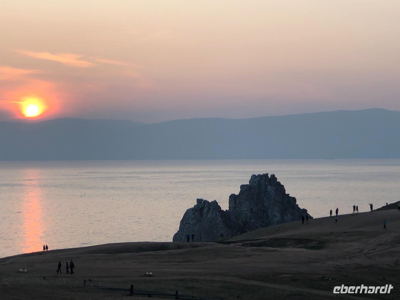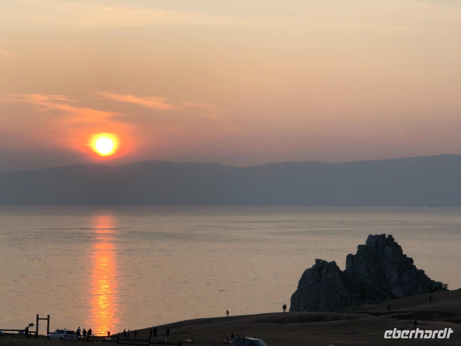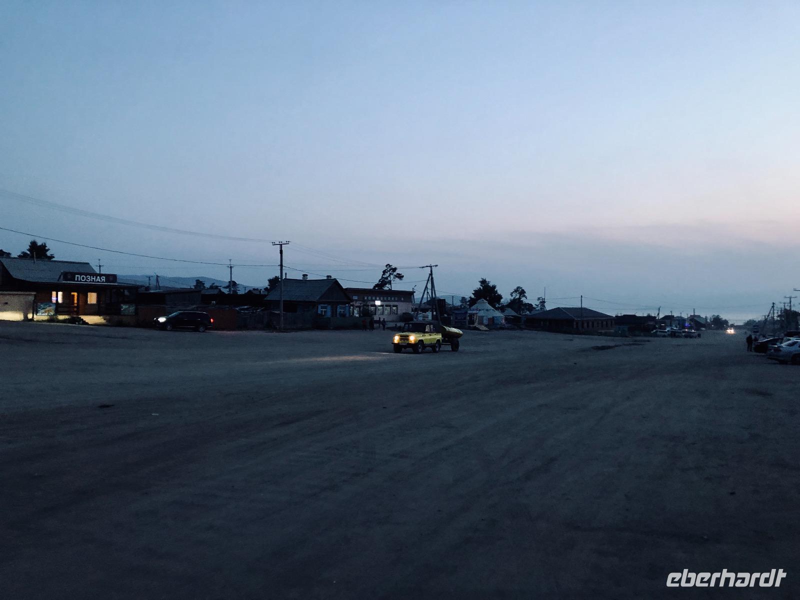 Das Abendessen haben wir auf halb sieben vorverlegt, denn wir wollen den Sonnenuntergang am Schamanenfelsen erleben. Wir spazieren zum Café Baikal View, in dem die besten Plätze natürlich besetzt sind. Nach dem die Sonne bilderbuchmäßig versunken ist, spazieren wir zurück ins Dorf. Auf dem Weg kommen wir an einer Kunstgalerie vorbei, in der wir ein paar Rubelchen lassen und dafür schöne Andenken mitnehmen. Auf der großen Hauptstraße angekommen, wird es langsam dunkel. Fast befürchten wir schon, keine Einkehr mehr zu finden, als dann doch die Aufschrift eines Cafés leuchtet. In gemütlicher Runde und mit weniger Mücken als befürchtet, lassen wir den Tag ausklingen. Der Heimweg gestaltet sich abenteuerlich.