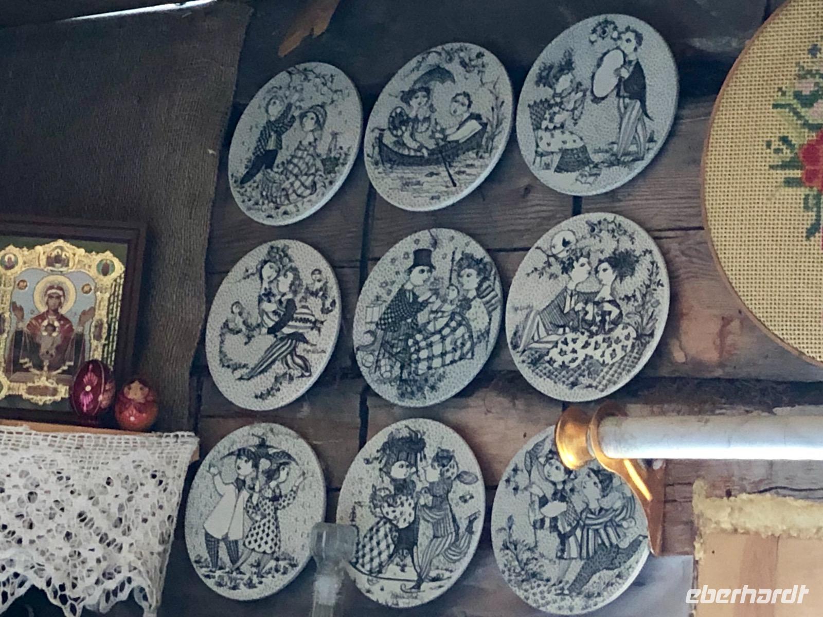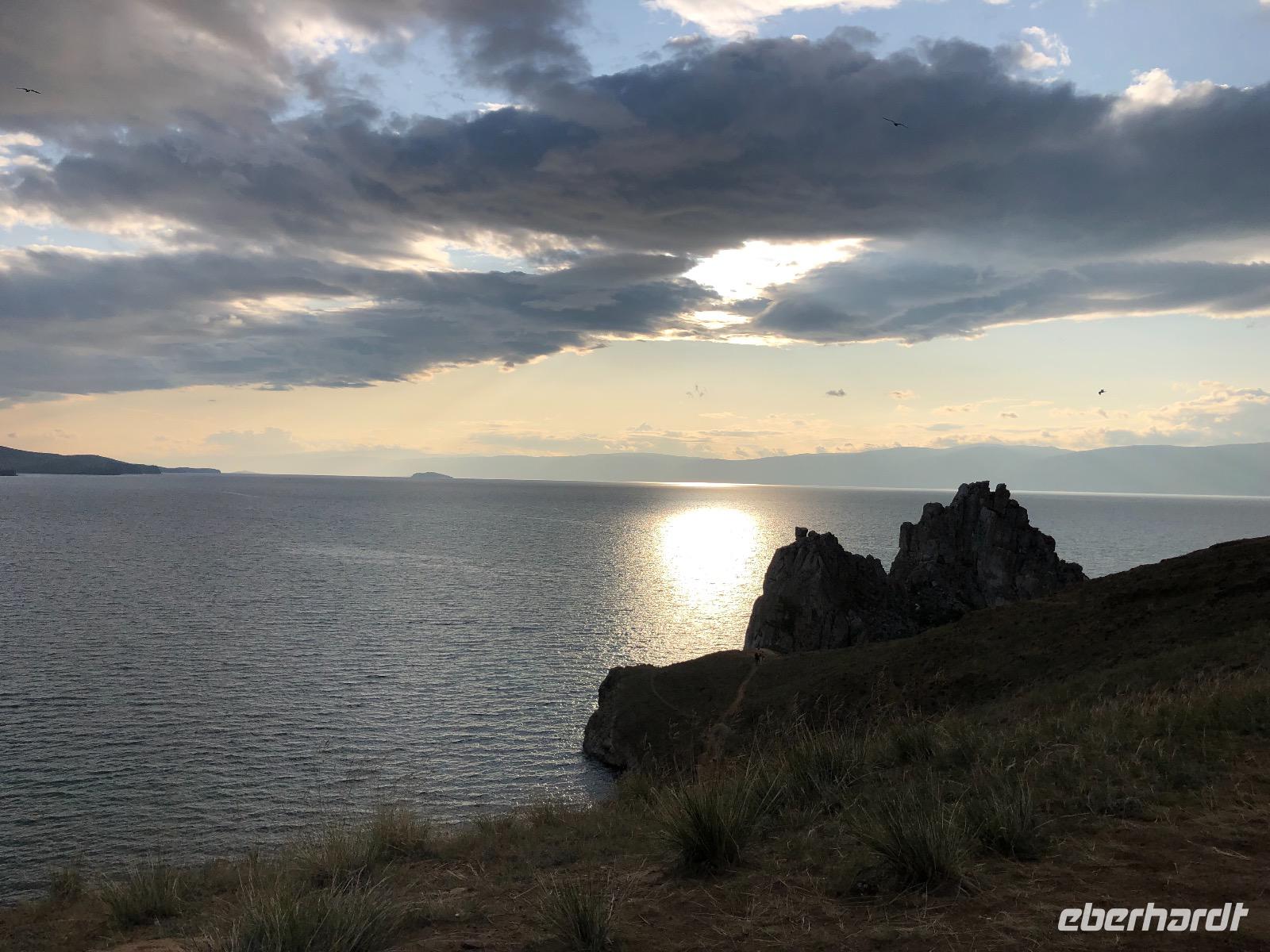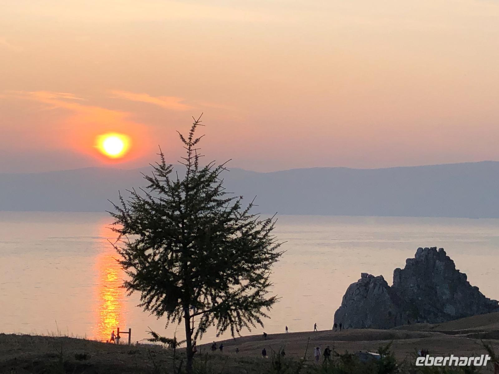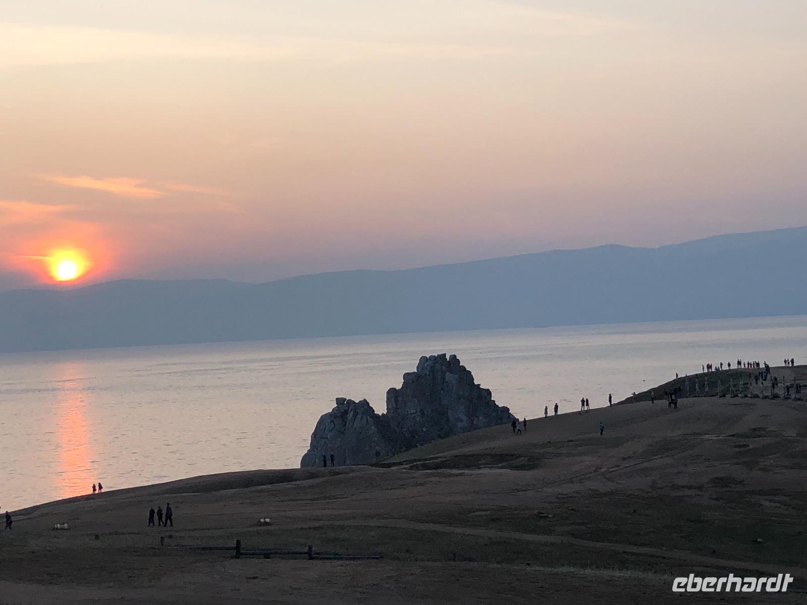 Das Abendessen haben wir auf halb sieben vorverlegt, denn wir wollen den Sonnenuntergang am Schamanenfelsen erleben. Wir spazieren zum Café Baikal View, in dem die besten Plätze natürlich besetzt sind. Nach dem die Sonne bilderbuchmäßig versunken ist, spazieren wir zurück ins Dorf. Auf dem Weg kommen wir an einer Kunstgalerie vorbei, in der wir ein paar Rubelchen lassen und dafür schöne Andenken mitnehmen. Auf der großen Hauptstraße angekommen, wird es langsam dunkel. Fast befürchten wir schon, keine Einkehr mehr zu finden, als dann doch die Aufschrift eines Cafés leuchtet. In gemütlicher Runde und mit weniger Mücken als befürchtet, lassen wir den Tag ausklingen. Der Heimweg gestaltet sich abenteuerlich.