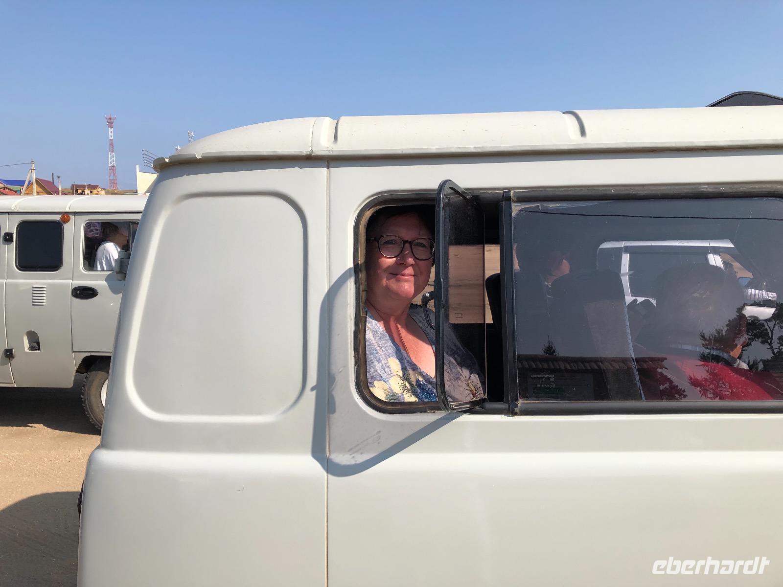 Heute verläuft der Tag anders als geplant. Ohne Lidia fahren wir zum Fährhafen von Olchon, besser gesagt, wollen wir fahren. Zwei Stunden lang werden wir wieder ordentlich durchgerüttelt und geschüttelt, bis circa einhundert Meter vor dem Hafen ein Reifen platt ist. Der Fahrer fordert uns auf, mit unserem Handgepäck schon mal vor zu laufen. Macht Sinn, denn am Hafen gibt es ein paar kleine Souvenirstände und so etwas wie ein Café, auf jeden Fall Möglichkeiten, sich die Zeit zu vertreiben. Nach eineinhalb Stunden kommt dann tatsächlich ein Ersatzfahrzeug mit unseren Koffern. Wir setzen mit der Fähre über und nehmen Abschied von der Insel Olchon. Wir fahren zum Krankenhaus. Hier heißt es erstmal, Geduld haben, denn es ist nicht klar, ob unser Mitreisender entlassen wird oder nicht. Also wieder in ein Café, wieder warten. Dann geht es endlich weiter. Leider mit einem Reisenden weniger. Nach zwei Stunden erreichen wir Ust Orda. Inzwischen ist es halb fünf. Wir nehmen ein spätes Mittagessen in einer burjatischen Jurte ein. Noch einmal gibt es Posi, eine sibirische Spezialität. Weiter geht es zum Museum. Wir müssen feststellen, dass dieses gerade renoviert wird, überall liegt Baumaterial herum. Und wieder einmal regnet es. Das Museum hat in einer Jurte eine Ersatzausstellung eingerichtet. Hier werden wir von einer freundlichen Museumsmitarbeiterin durch burjatische Geschichte und vergangenen Alltag geführt. Anschließend empfängt uns eine Musik- und Tanzgruppe. Der Chef (?) der Truppe begrüßt uns. Man wäre sehr erfreut darüber, dass wir den weiten Weg auf uns genommen haben, um zu Ihnen zu kommen und darüber, dass wir uns für ihre Geschichte interessieren. Jedes Lied, dass gesungen wird, erklärt er und auch die speziellen Musikinstrumente werden vorgestellt. Nun sind unsere Männer an der Reihe. Sie lernen, wie sich ein Mann artikuliert, wenn er in den Zweikampf zieht. Und sie tanzen wie die Adler. Wir Frauen haben unseren Spaß beim zuschauen. Zum Schluss bilden Tänzer und Musiker mit uns einen Kreis und wir singen und tanzen zusammen, also sie singen...