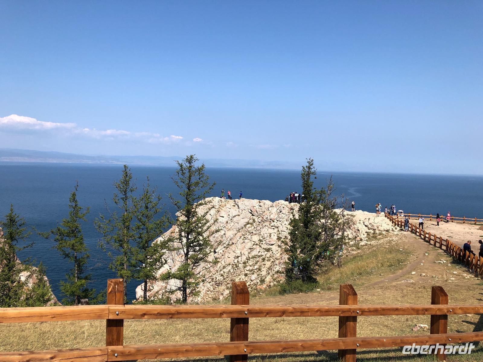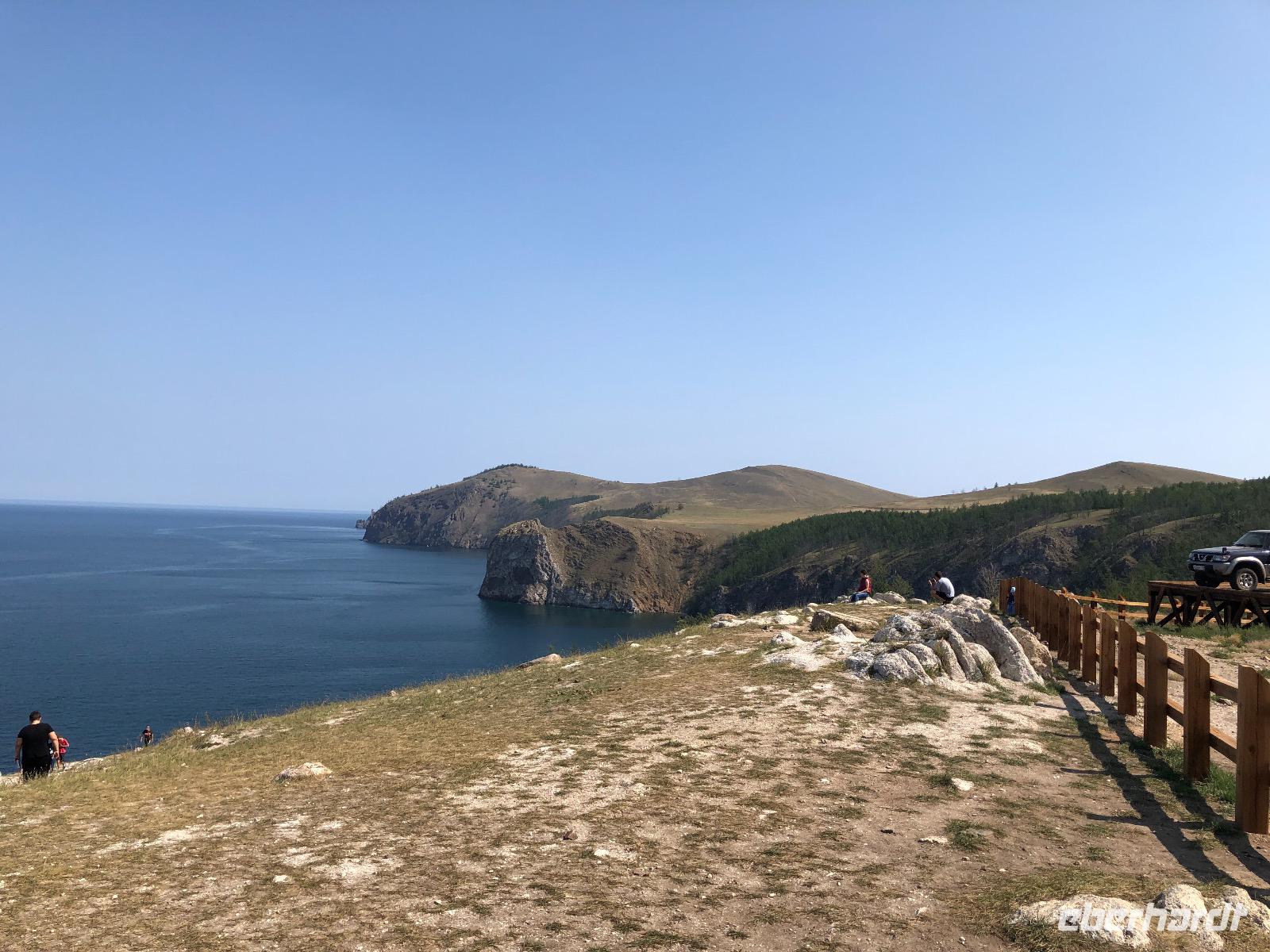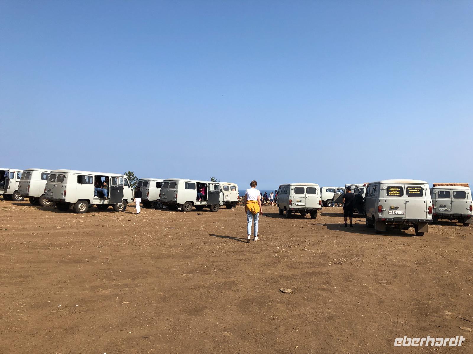 Wir ahnen noch nicht, was uns heute bevorsteht. Die Autos der Marke UAZ sehen von außen ziemlich harmlos aus, fast wie VW-Busse. Die Innenausstattung ist schon etwas rustikaler. Gurte gibt es nicht, nur in der mittleren Reihe zwei Riemen an der Decke zum Festhalten. Dies ist auch fast durchgängig notwendig, denn es geht nicht nur über Stock und Stein, sondern über jede denkbare Bodenwelle, so tief sie auch sein mag. Nach einer Viertelstunde erreichen wir den Eingang zum Nationalpark. Pro Person werden 300 Rubel fällig. Der Weg zum ersten Fotostopp wird von unserem Fahrer scherzhaft als Autobahn bezeichnet, später verstehen wir, warum. An jedem Spot, den wir anfahren, sind bereits die Chinesen da. Sie haben weitaus mehr Autos gechartert als wir. Vom Ufer des Baikalsees sind am ersten Halt zwei Felsen zu sehen. Einer hat die Form eines Löwen, der andere sieht wie ein Krokodil aus. Das reicht aus, um den Ort Natursteinzoo zu nennen. Um 11.10 Uhr erreichen wir den Eingang des Nationalparks und um 11.20 Uhr den Platz, an dem einst die Fischfabrik stand. Hier gibt es auch ein Minimuseum mit alten Gebrauchsgegenständen der Region und Fotos von einstigen Anwohnern. Der letzte Stopp gilt einer Felsformation genannt DIE DREI BRÜDER. Ein Zaun soll Touristen davon abhalten, auf die Felsen zu klettern, aber eine obere Bohle wurde entfernt und so gibt es ein lustiges Treiben dort. Gegen 13 Uhr erreichen wir unser Ziel, das Kap Choboi. Immerhin geht es 1274 Meter hoch. Wir haben eine Stunde Zeit für einen mittelanstrengenden Spaziergang bis zur Spitze und zurück zum Picknickplatz. Hier haben unsere Fahrer bereits Omulsuppe gekocht und Tomaten-Gurken-Salat zubereitet. Zum Nachtisch gibt es Tee und russische Pfefferkuchen. Auf dem Rückweg legen wir noch einen Stopp am Felsen der Liebe ein, noch eine Felsformation für abenteuerlustige Selfiemaker. Wir sind diesmal brav und fotografieren nur von Weitem.