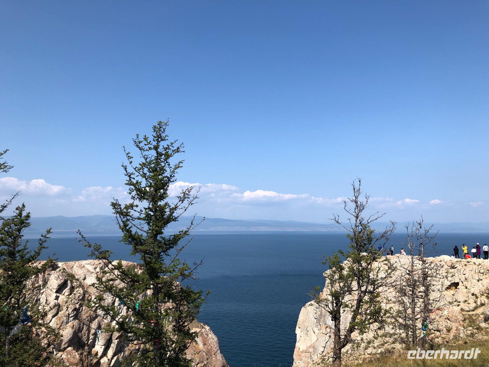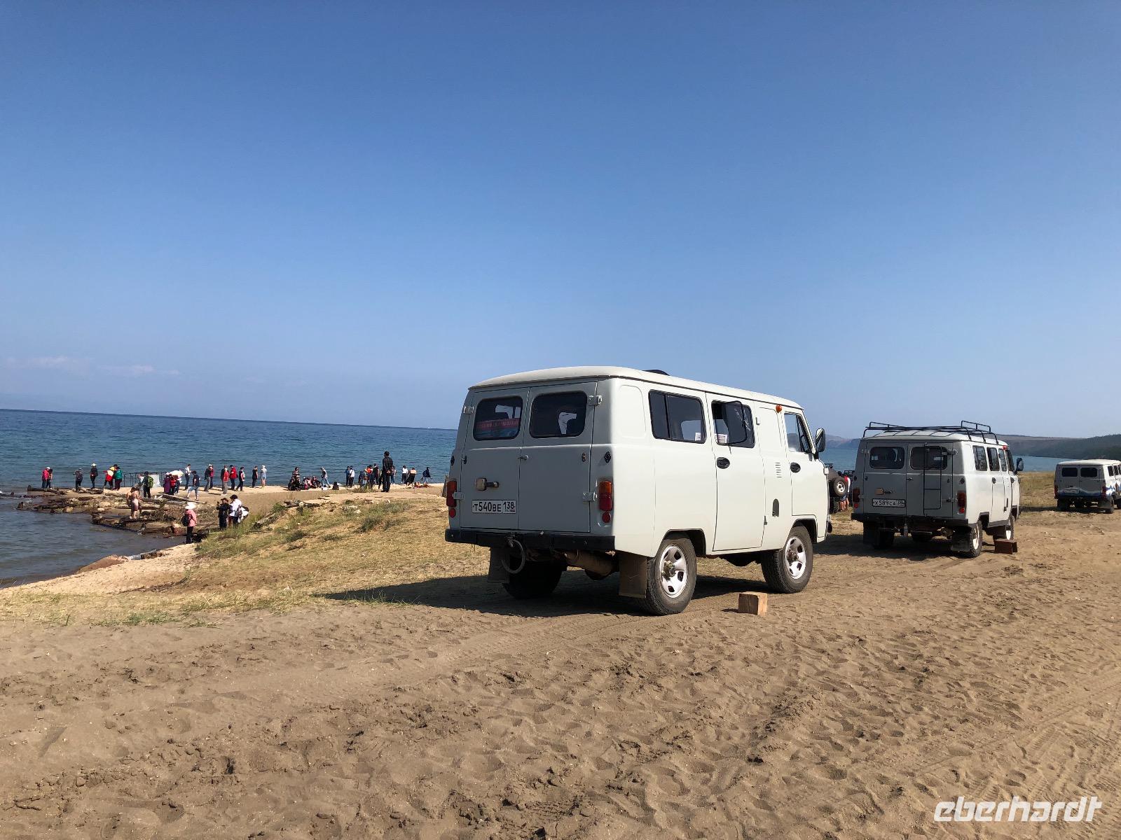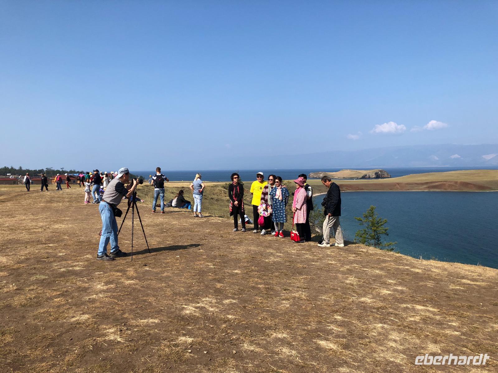 Wir ahnen noch nicht, was uns heute bevorsteht. Die Autos der Marke UAZ sehen von außen ziemlich harmlos aus, fast wie VW-Busse. Die Innenausstattung ist schon etwas rustikaler. Gurte gibt es nicht, nur in der mittleren Reihe zwei Riemen an der Decke zum Festhalten. Dies ist auch fast durchgängig notwendig, denn es geht nicht nur über Stock und Stein, sondern über jede denkbare Bodenwelle, so tief sie auch sein mag. Nach einer Viertelstunde erreichen wir den Eingang zum Nationalpark. Pro Person werden 300 Rubel fällig. Der Weg zum ersten Fotostopp wird von unserem Fahrer scherzhaft als Autobahn bezeichnet, später verstehen wir, warum. An jedem Spot, den wir anfahren, sind bereits die Chinesen da. Sie haben weitaus mehr Autos gechartert als wir. Vom Ufer des Baikalsees sind am ersten Halt zwei Felsen zu sehen. Einer hat die Form eines Löwen, der andere sieht wie ein Krokodil aus. Das reicht aus, um den Ort Natursteinzoo zu nennen. Um 11.10 Uhr erreichen wir den Eingang des Nationalparks und um 11.20 Uhr den Platz, an dem einst die Fischfabrik stand. Hier gibt es auch ein Minimuseum mit alten Gebrauchsgegenständen der Region und Fotos von einstigen Anwohnern. Der letzte Stopp gilt einer Felsformation genannt DIE DREI BRÜDER. Ein Zaun soll Touristen davon abhalten, auf die Felsen zu klettern, aber eine obere Bohle wurde entfernt und so gibt es ein lustiges Treiben dort. Gegen 13 Uhr erreichen wir unser Ziel, das Kap Choboi. Immerhin geht es 1274 Meter hoch. Wir haben eine Stunde Zeit für einen mittelanstrengenden Spaziergang bis zur Spitze und zurück zum Picknickplatz. Hier haben unsere Fahrer bereits Omulsuppe gekocht und Tomaten-Gurken-Salat zubereitet. Zum Nachtisch gibt es Tee und russische Pfefferkuchen. Auf dem Rückweg legen wir noch einen Stopp am Felsen der Liebe ein, noch eine Felsformation für abenteuerlustige Selfiemaker. Wir sind diesmal brav und fotografieren nur von Weitem.