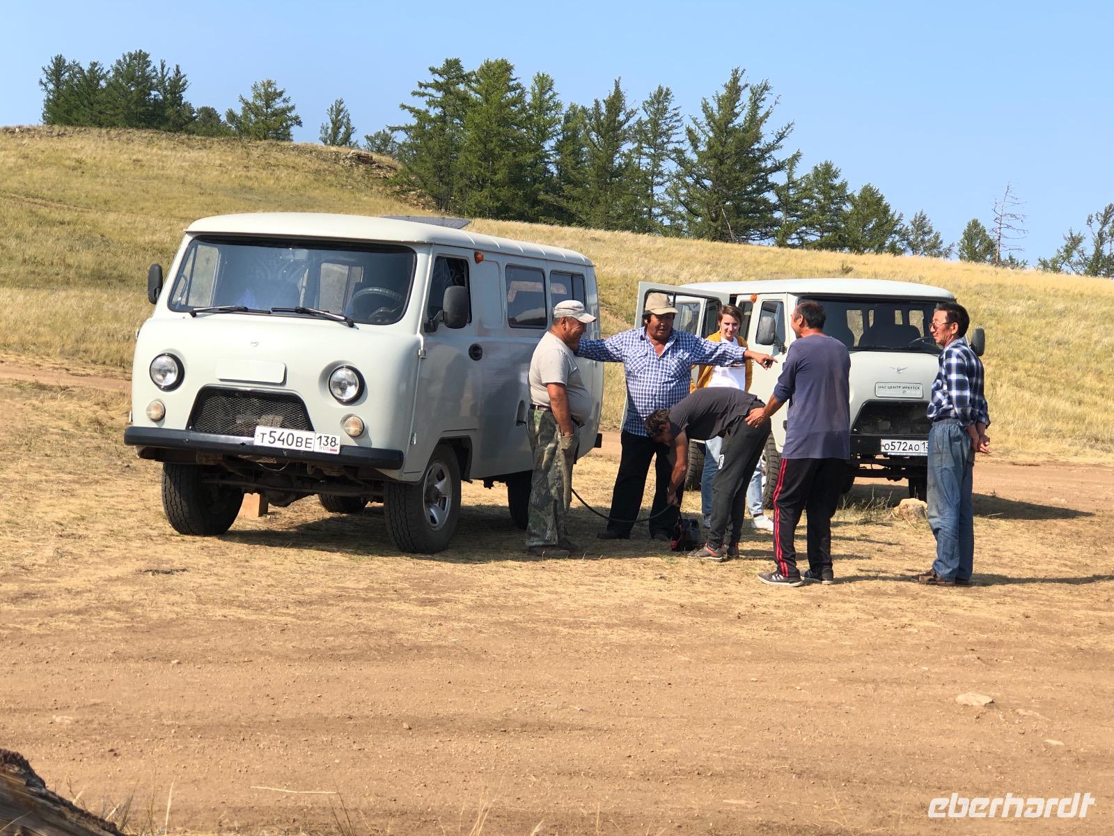 1 Stunde bis Irkutsk. (9 - 10), 1,5 Stunden bis zum ersten Stopp an einer Tankstelle (11.30), nochmal kurzer Fotostopp,