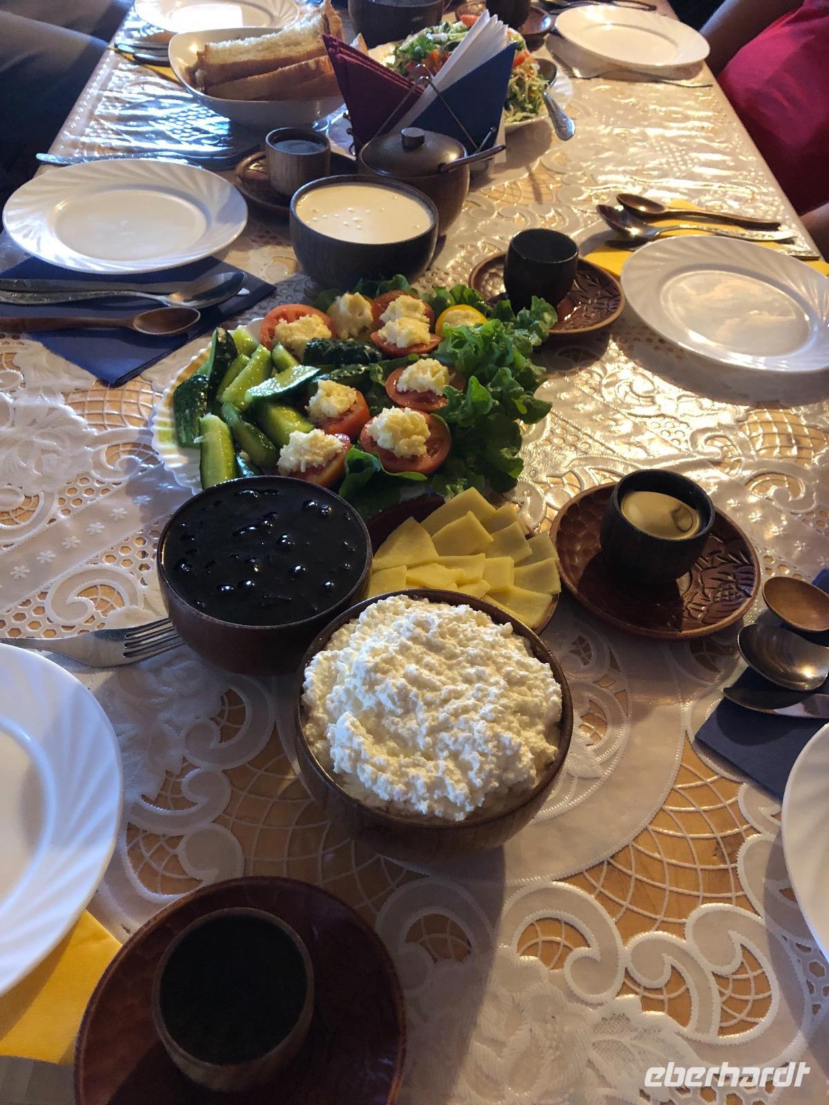 Nun ist der Tisch gedeckt. Es gibt traditionelle Speisen, wie Nudelsuppe, Gemüsesalat, Posi und ein Getränk, dass nach Kuhstall riecht und schmeckt. Nun ja, andere Länder, andere Sitten. Kuchen und Konfekt entsprechen dagegen wieder unserem europäischen Gaumen. Als wir uns verabschieden, sind wir froh, ein paar Geschenke mitgenommen zu haben, die dankend angenommen werden.Der Nachmittag steht zur freien Verfügung.