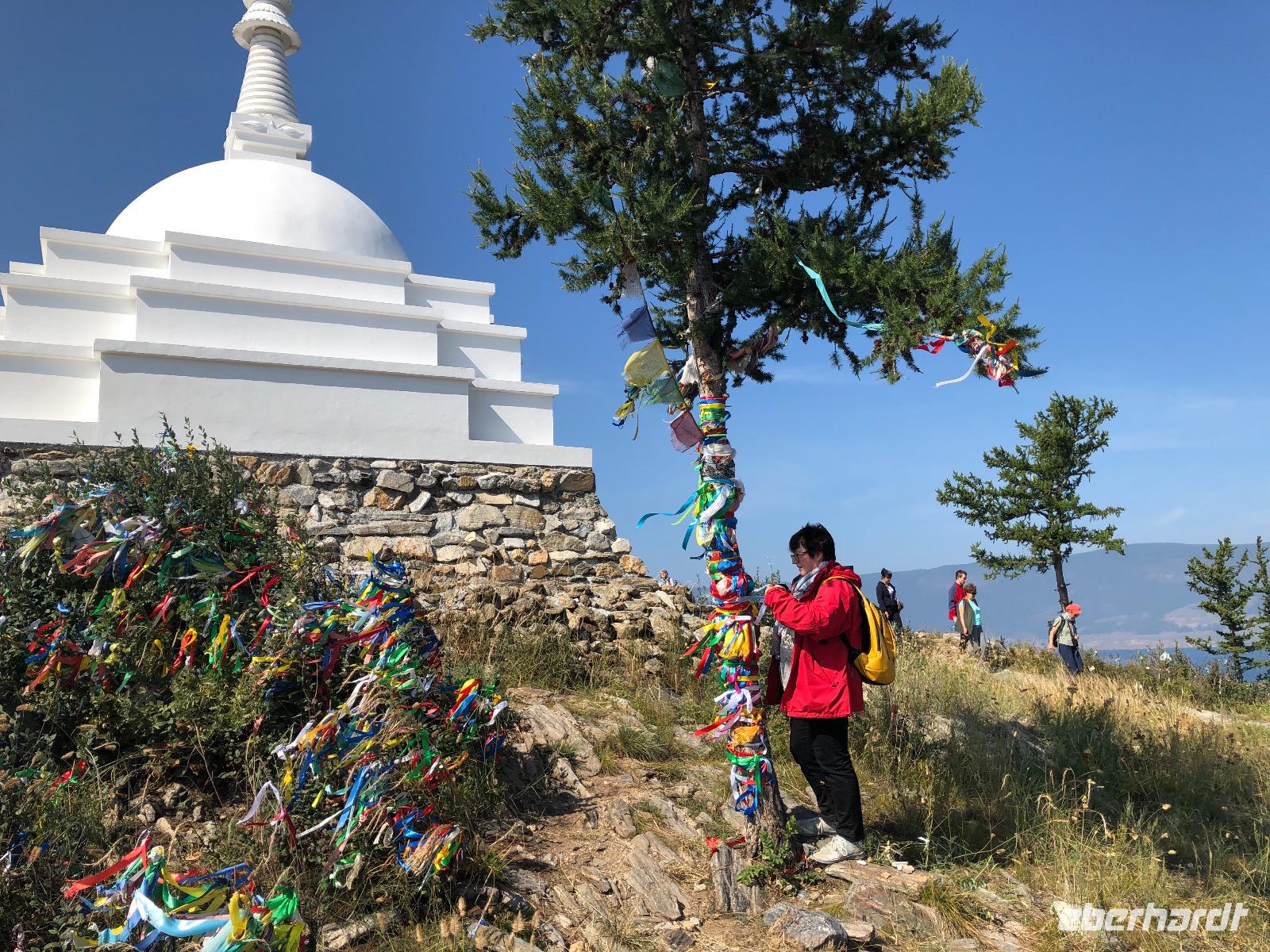 Ein kleiner Spaziergang bergauf führt uns zur Stupa, deretwegen wir hierhergekommen sind. Soll man nun dreimal, zehnmal oder hundertachtmal drumherum gehen, um seine Sünden loszuwerden? Man weiß es nicht. Wir haben jedenfalls jeder von Eberhardt TRAVEL ein farbiges Wunschband bekommen, dass wir an einem Ort unserer Wahl befestigen können und darauf hoffen, dass eben jene Wünsche in Erfüllung gehen.