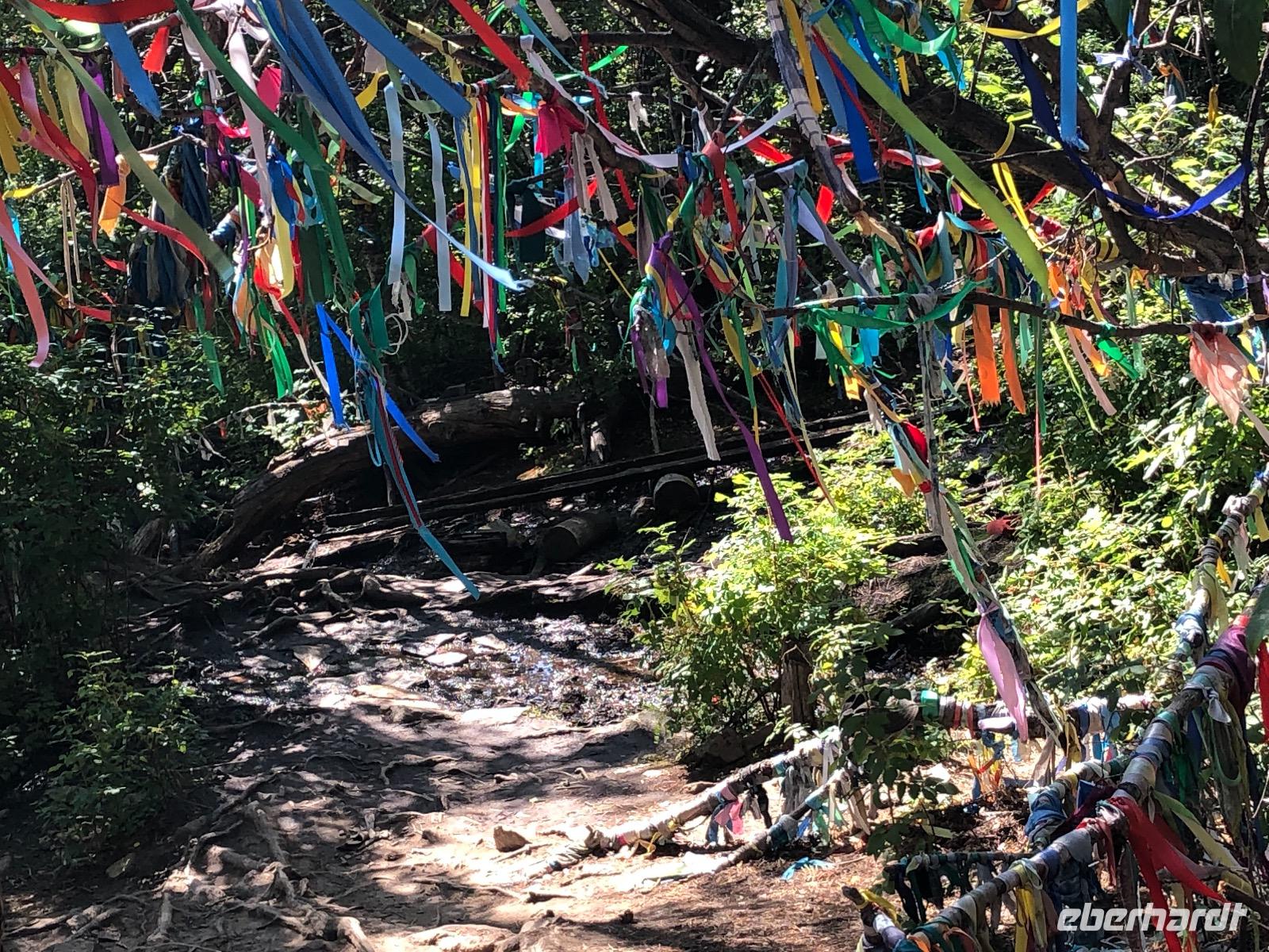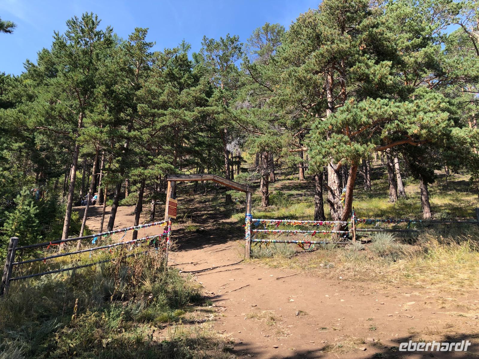 Weiter geht unsere schnelle Fahrt über den Baikalsee. Nach weiteren vierzig Minuten legen wir erneut an. Am Ufer befindet sich eine Art Unterstand, wo man Getränke kaufen und etwas essen kann. Aber wir sind damit noch nicht dran. Erst einmal steht ein Spaziergang zu einer heiligen Quelle an. Fünfundzwanzig bis dreißig Minuten soll der Weg in Anspruch nehmen, wir brauchen eine Stunde. Zurück geht es ein bisschen schneller, weil bergab. Unser Kapitän und seine Frau haben inzwischen das Mittagessen vorbereitet. Es gibt Fischsuppe, Gemüse und Kekse. Die Rückfahrt ist noch verrückter als die Fahrten davor. Unser Kapitän scheint Spaß daran zu haben, die Kraft seines Motors auszuprobieren.Am Abend müssen wir für einen unserer Mitreisenden einen Krankenwagen rufen. Da die Versorgung im Krankenhaus von Olchon zwar menschlich herzlich, aber medizinisch nicht vertretbar ist, fährt Lidia mit ihm noch am Abend aufs Festland in ein zentrales Krankenhaus.