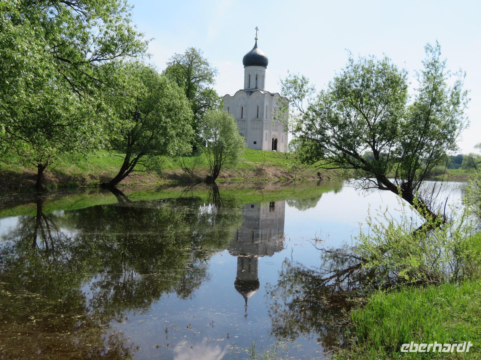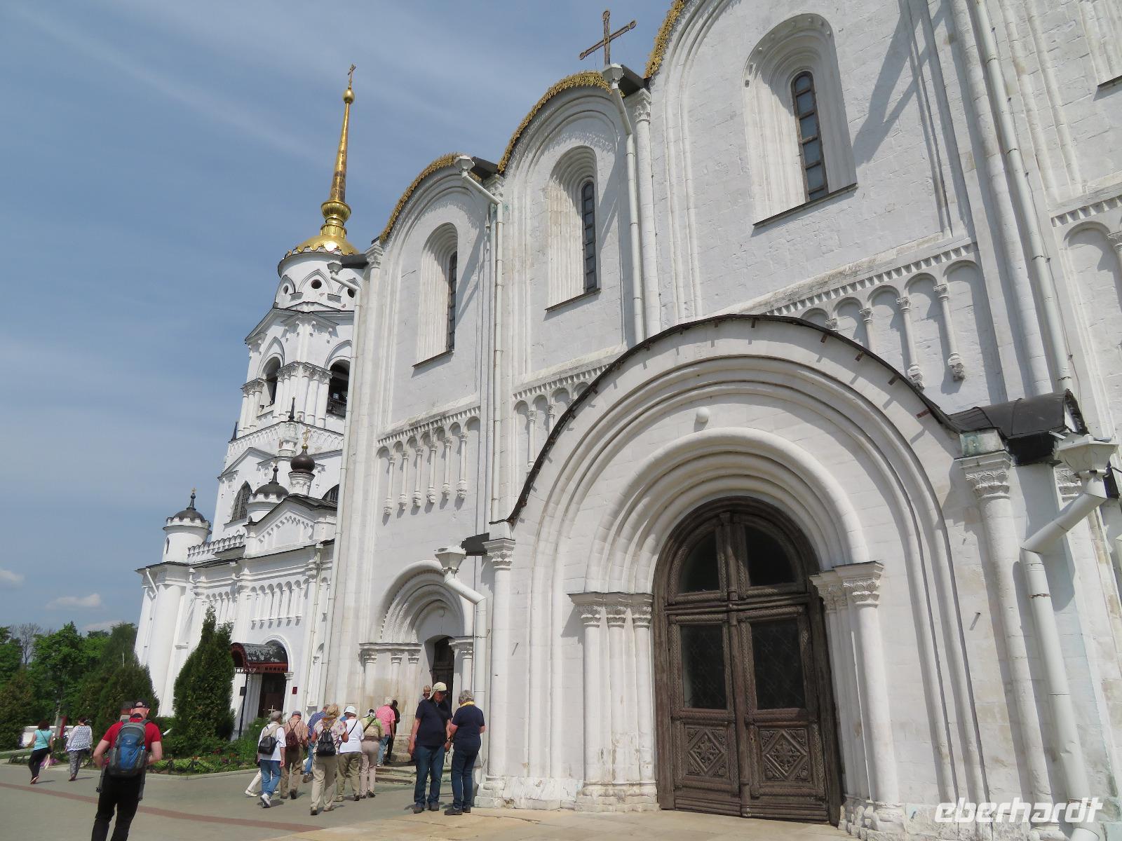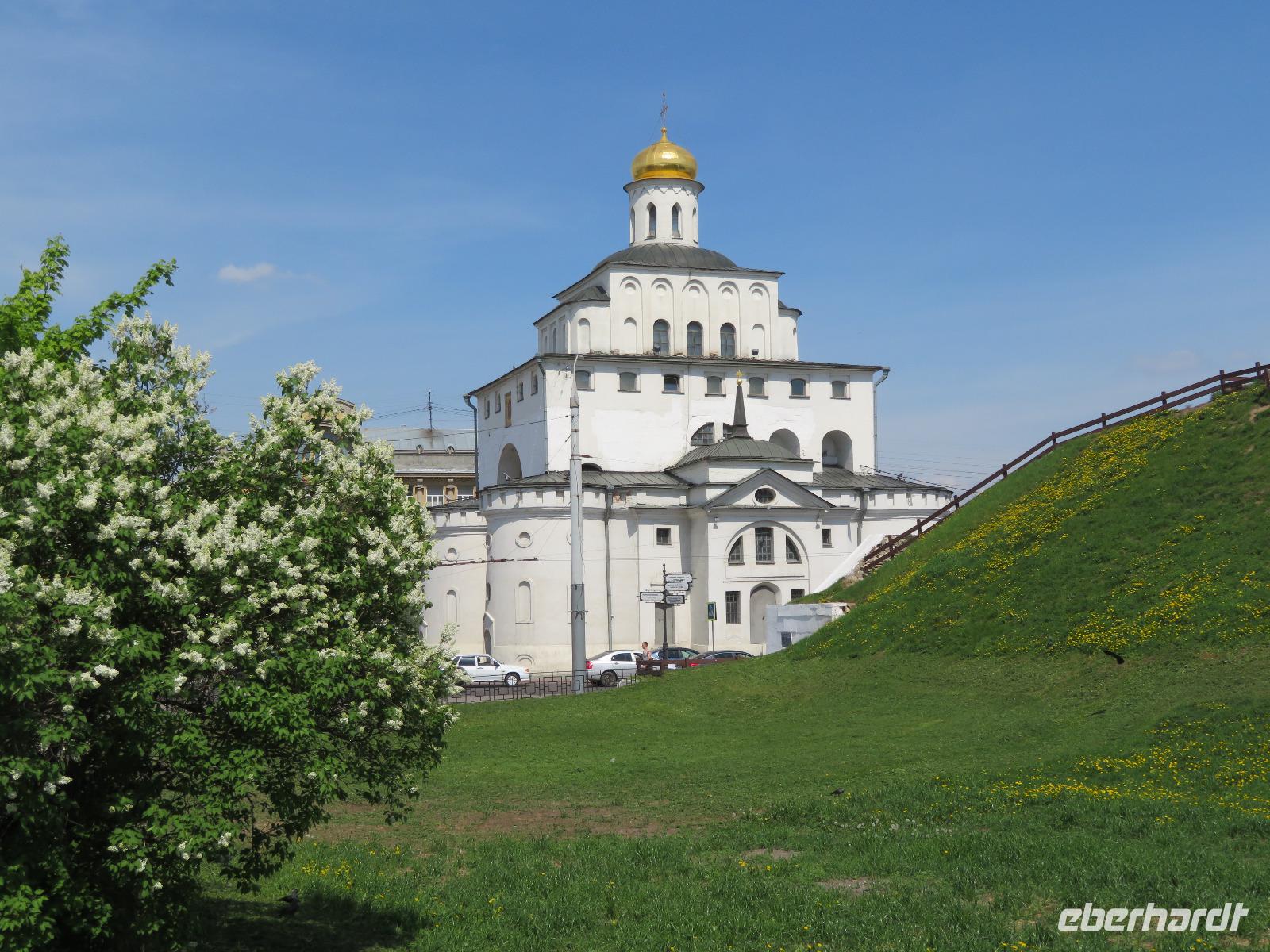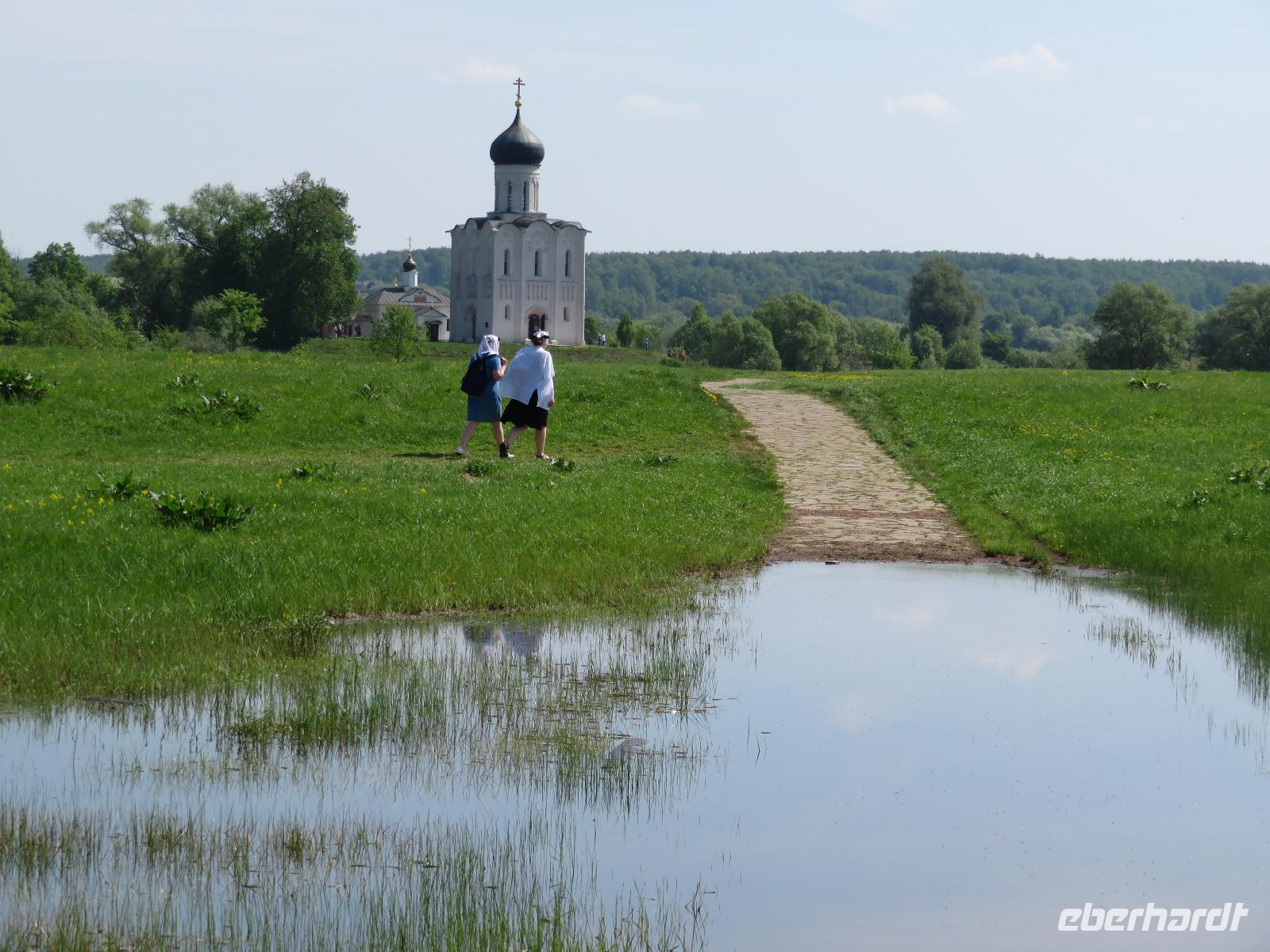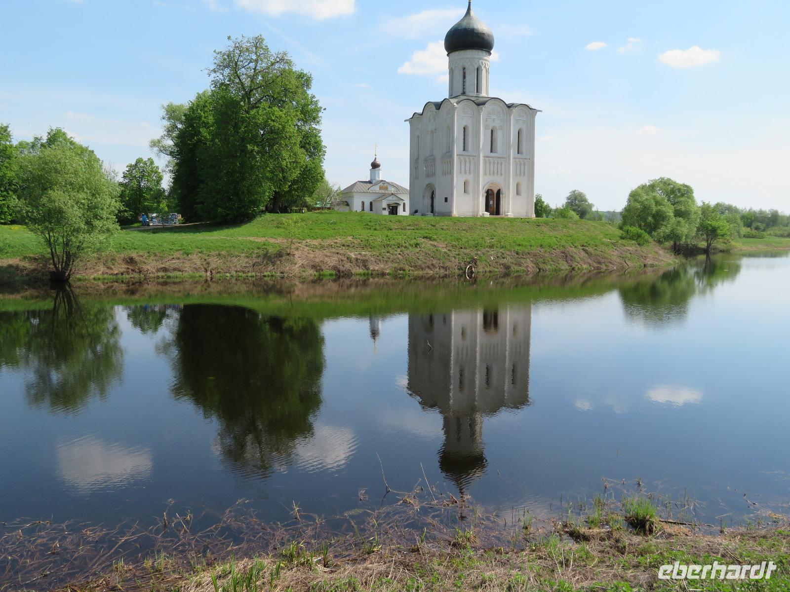 Abschiednehmen von Susdal - wir fuhren an Wladimir vorbei nach Boguljobowo. Dieser Ort ist eng mit dem Leben von Fürst Boguljubow, einem Sohn Juri Dolgorukis verbunden. Das hiesige Frauenkloster geht auf alte Klostergründungen hervor, deren Ausgrabungen man nunmehr auch sehen kann. Kräftig blau leuchten heute die Kuppeln der Kathedrale über dem weißen Gemäuer, in dem heute wieder Novizinnen wohnen. Zügig tippelten Sie schwarz verhüllt durch das Klostergelände als die Glocken der Kathedrale läuten. Wenige Schritte - oder besser Busminuten - entfernt, befindet sich der Parkplatz und Ausgangspunkt für unseren Spaziergang zur Pokrov-Kirche am Nerl. Durch die Wiesen, im Mai noch mit einigen Restwasserlachen, bummelten die meisten Gäste zum kleinen weißen Kirchlein, einer der ältesten Kirchen des Goldenen Rings. Bezaubernd wie immer, das Spiegelbild des Kirchleins im kleinen Teich. Nur eine halbe Busfahrstunde entfernt liegt Wladimir. Einen Fotostopp machten wir zunächst am Goldenen Tor. Dann besichtigten wir die Demetrios-Kathedrale mit reichem Figurenschmuck und die Uspenski-Kathedrale, beide zum UNESCO-Welterbe gehörend. So schloss sich der Bogen einer Reise durch den Goldenen Ring vom Start in Sergiew Possad zum Finale in Wladimir. Nach knapp vier Stunden Fahrt erreichten wir Moskau und steuerten unser bekanntes Holiday Inn Taganskij an.