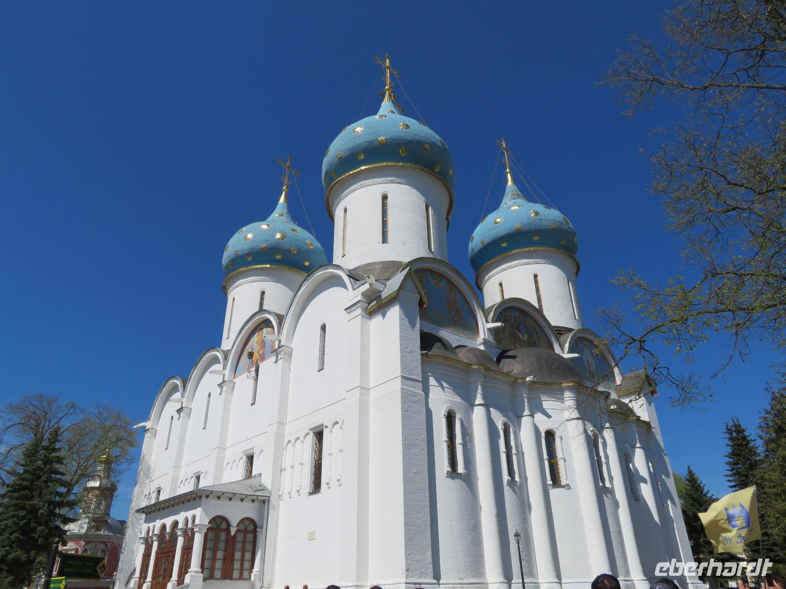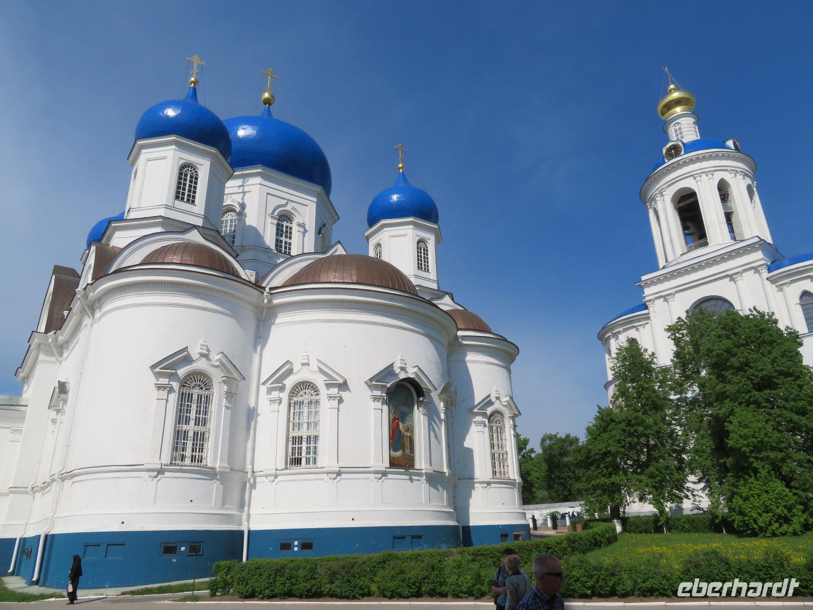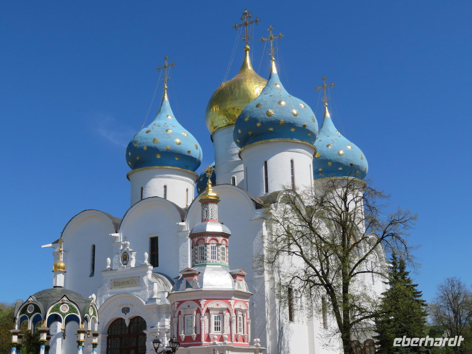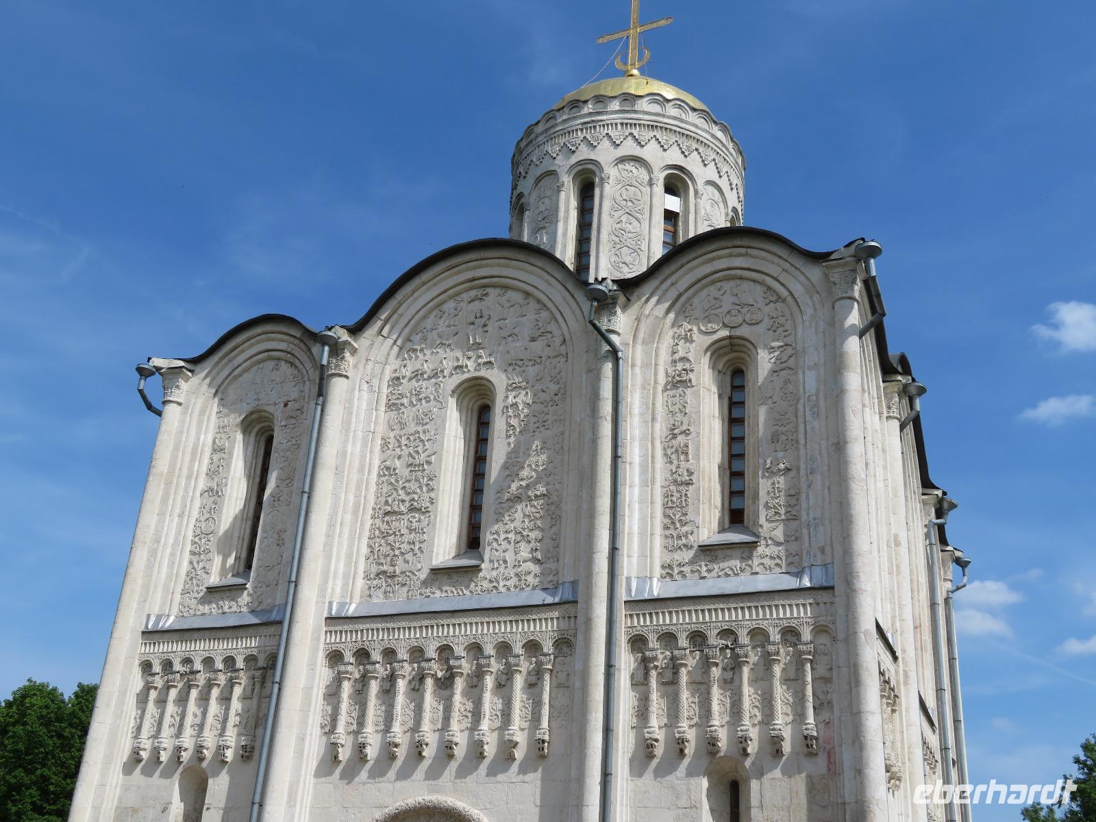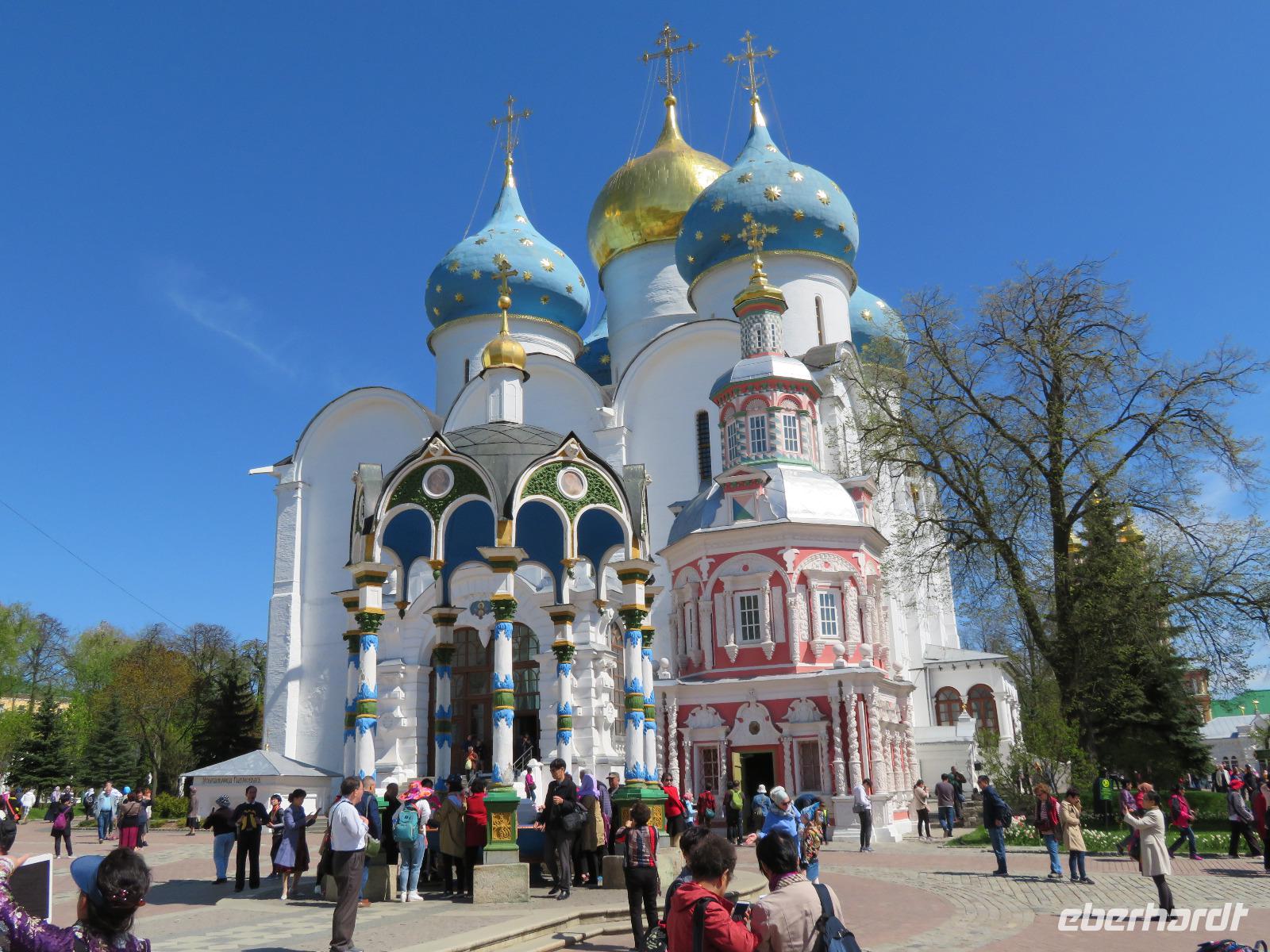 Abschiednehmen von Susdal - wir fuhren an Wladimir vorbei nach Boguljobowo. Dieser Ort ist eng mit dem Leben von Fürst Boguljubow, einem Sohn Juri Dolgorukis verbunden. Das hiesige Frauenkloster geht auf alte Klostergründungen hervor, deren Ausgrabungen man nunmehr auch sehen kann. Kräftig blau leuchten heute die Kuppeln der Kathedrale über dem weißen Gemäuer, in dem heute wieder Novizinnen wohnen. Zügig tippelten Sie schwarz verhüllt durch das Klostergelände als die Glocken der Kathedrale läuten. Wenige Schritte - oder besser Busminuten - entfernt, befindet sich der Parkplatz und Ausgangspunkt für unseren Spaziergang zur Pokrov-Kirche am Nerl. Durch die Wiesen, im Mai noch mit einigen Restwasserlachen, bummelten die meisten Gäste zum kleinen weißen Kirchlein, einer der ältesten Kirchen des Goldenen Rings. Bezaubernd wie immer, das Spiegelbild des Kirchleins im kleinen Teich. Nur eine halbe Busfahrstunde entfernt liegt Wladimir. Einen Fotostopp machten wir zunächst am Goldenen Tor. Dann besichtigten wir die Demetrios-Kathedrale mit reichem Figurenschmuck und die Uspenski-Kathedrale, beide zum UNESCO-Welterbe gehörend. So schloss sich der Bogen einer Reise durch den Goldenen Ring vom Start in Sergiew Possad zum Finale in Wladimir. Nach knapp vier Stunden Fahrt erreichten wir Moskau und steuerten unser bekanntes Holiday Inn Taganskij an.