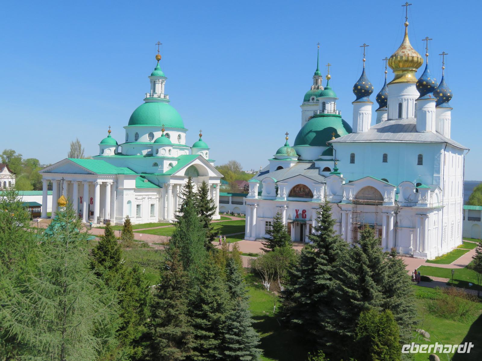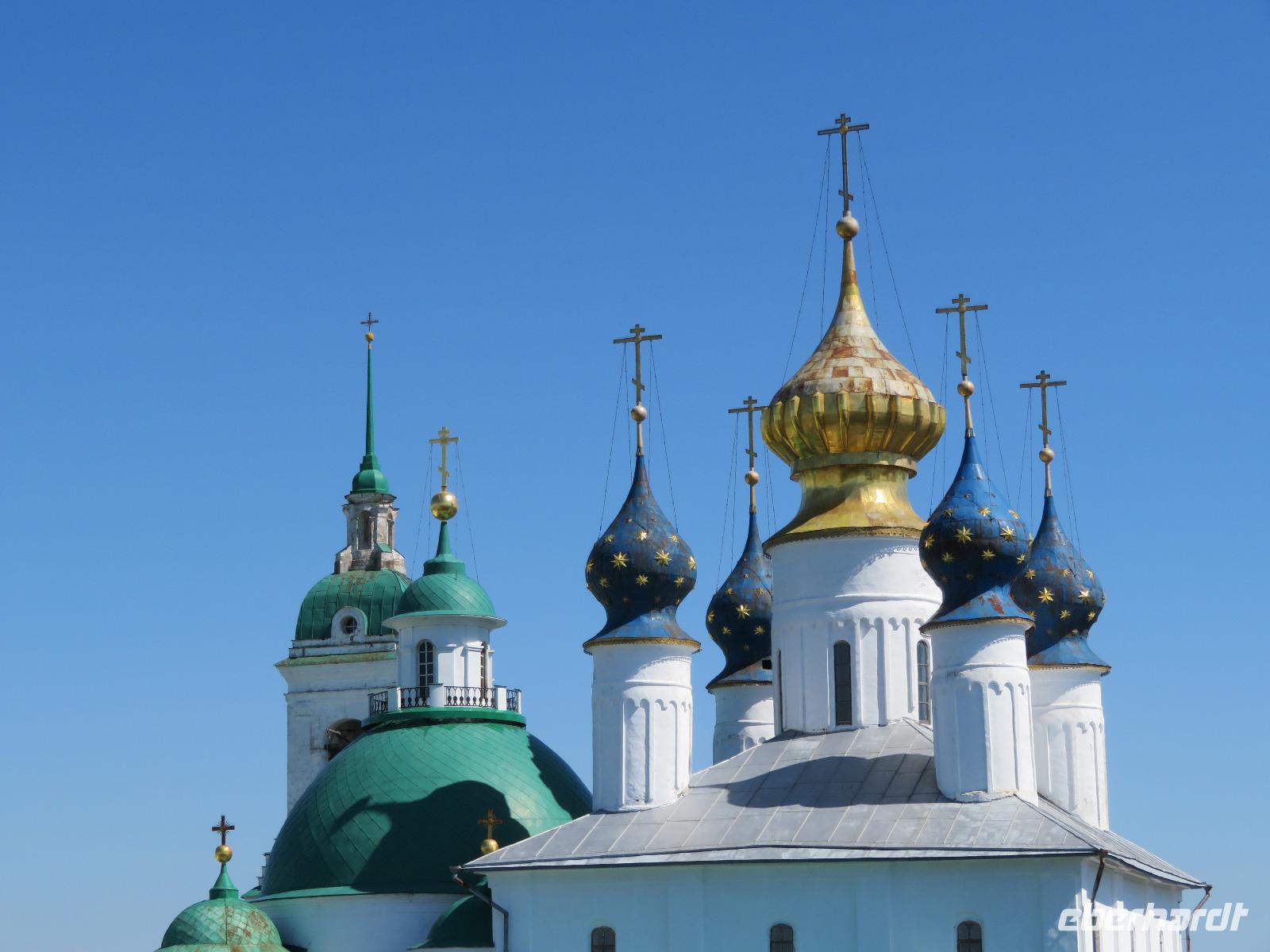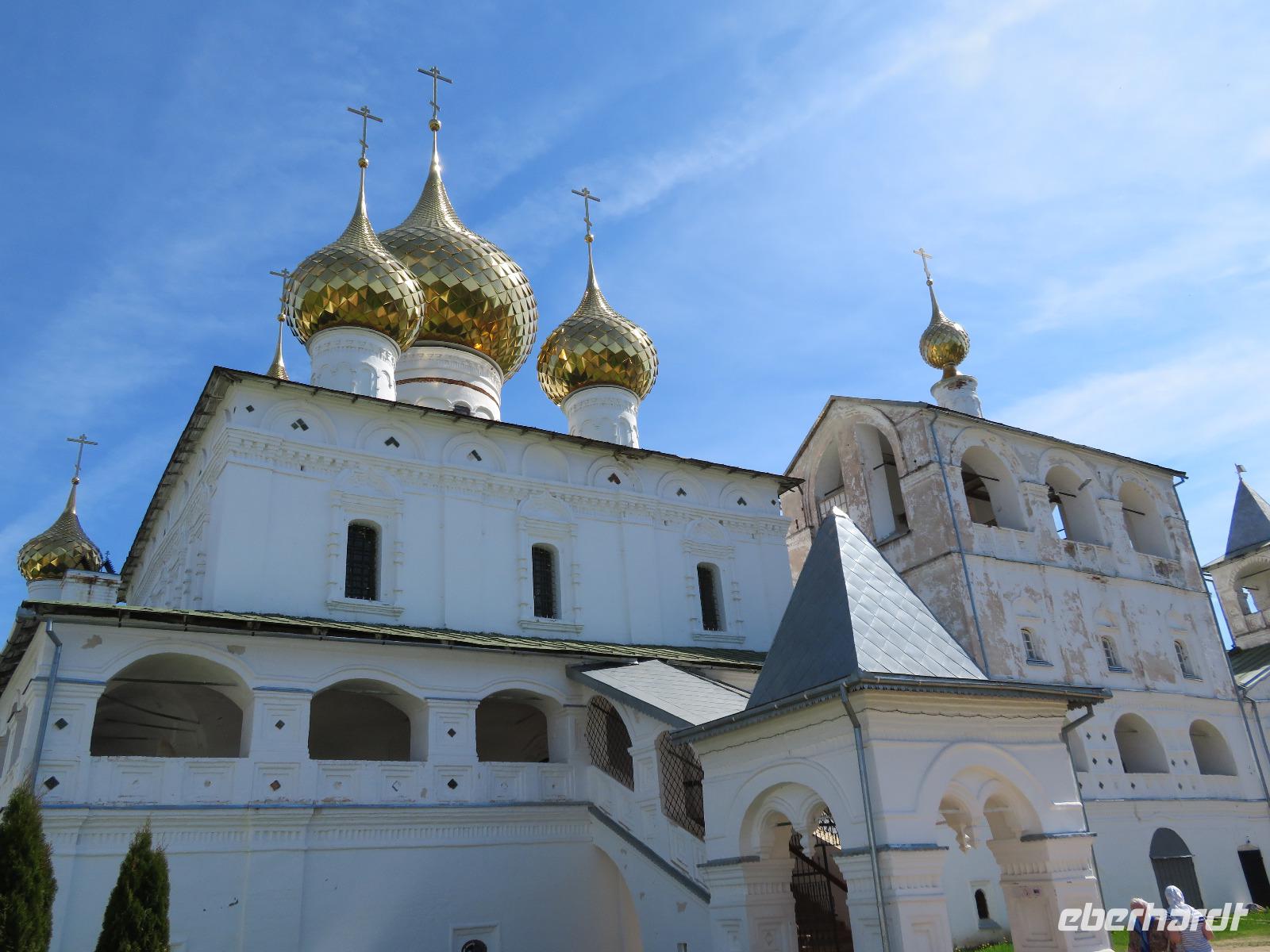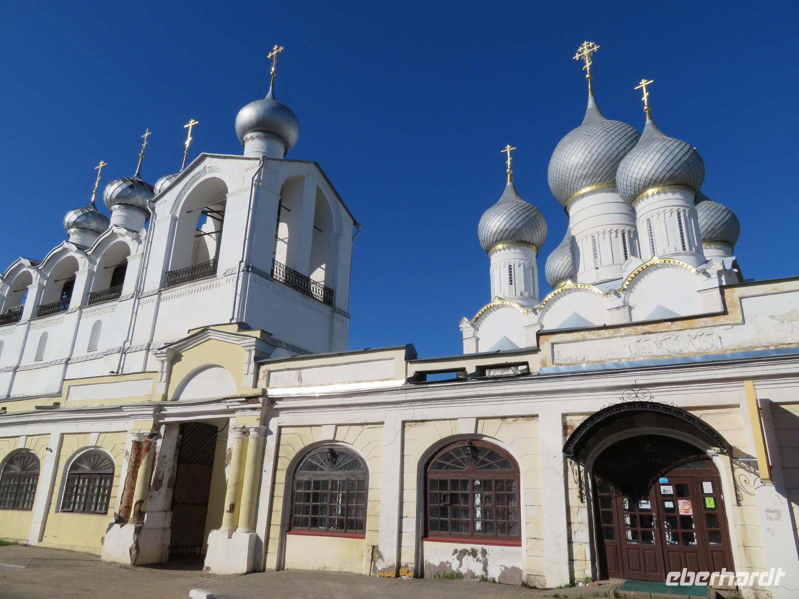 Wir starteten kurz vor zehn Uhr - in Russland beginnt der Arbeitstag eher spät - mit der Besichtigung des Rostover Kreml. Wohl nur wenige Kreml Russlands bieten auf so engem Raum eine solche Kompaktheit religöser Bauten; besonders beeindruckend die Maria-Entschlafens-Kathedrale mit der Glockenwand und die Anlage im Metropolitenhof. Im Kreml besichtigten wir auch die kleine Ausstellung von Emaille-Schmuck. Wer bereits vor um Acht auf den Beinen war, hatte die großen Glocken läuten gehört; im Kreml lauschten wir dann gemeinsam einem künstlerischen Glockenspiel auf zwei kleinen Glocken. Da wir bis zum Mittagessen noch gut Zeit hatten, fuhren wir mit dem Reisebus zum Erlöser-Jakow-Kloster am Rande der Stadt. Die klassizistische Dimitrij-Kirche zählt wohl zu den originellsten Sakralbauten auf unserer Tour und unterscheidet sich doch recht deutlich von den orthodox-romanischen, den weißen Zeltdachkirchen und den barocken Kirchen auf unserer Tour. Mancher erinnerte sich im Anblick der Innengestaltung wohl an Schinkel, an Berlin oder Potsdam.
