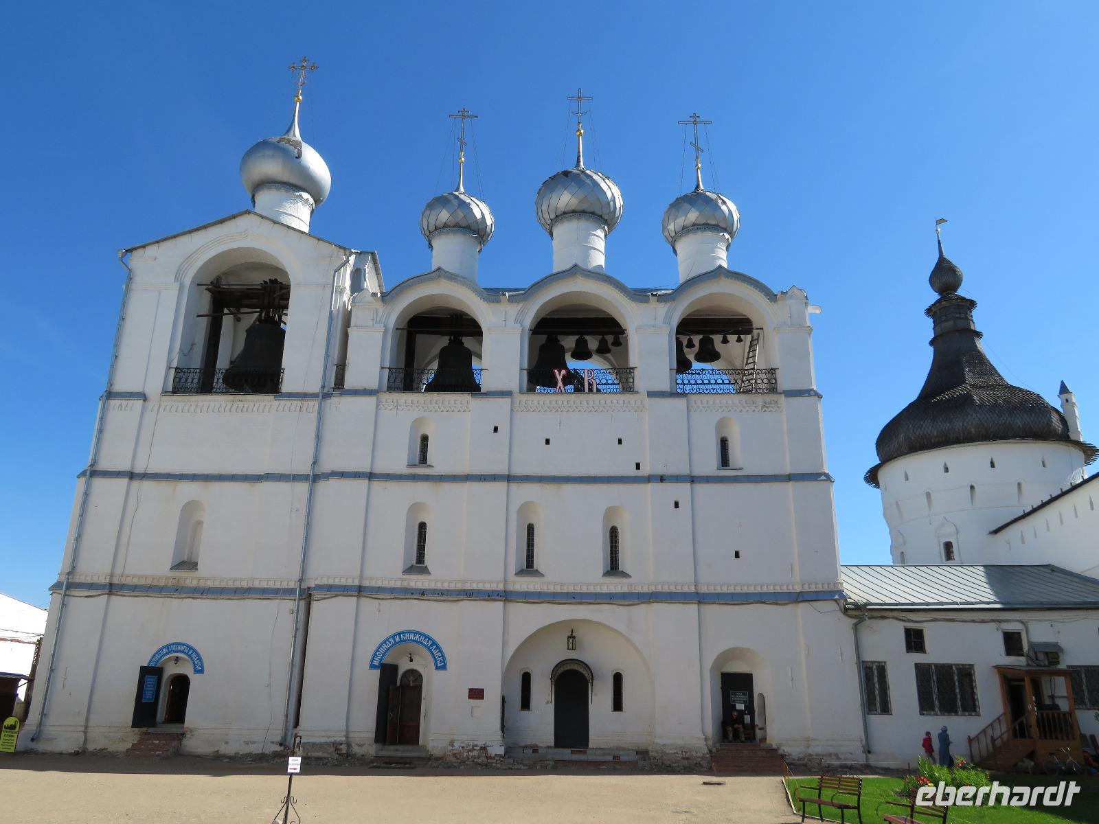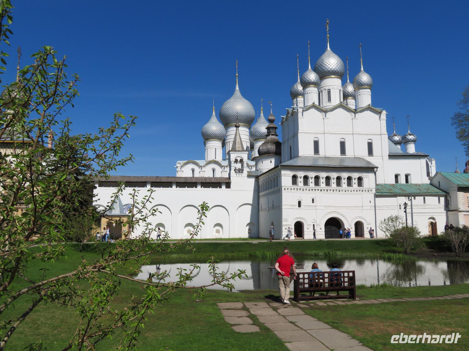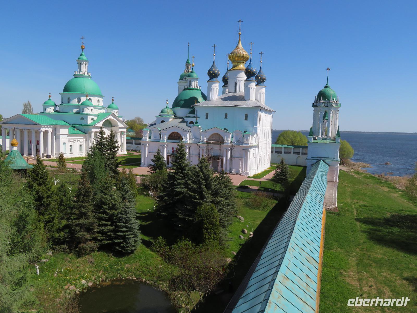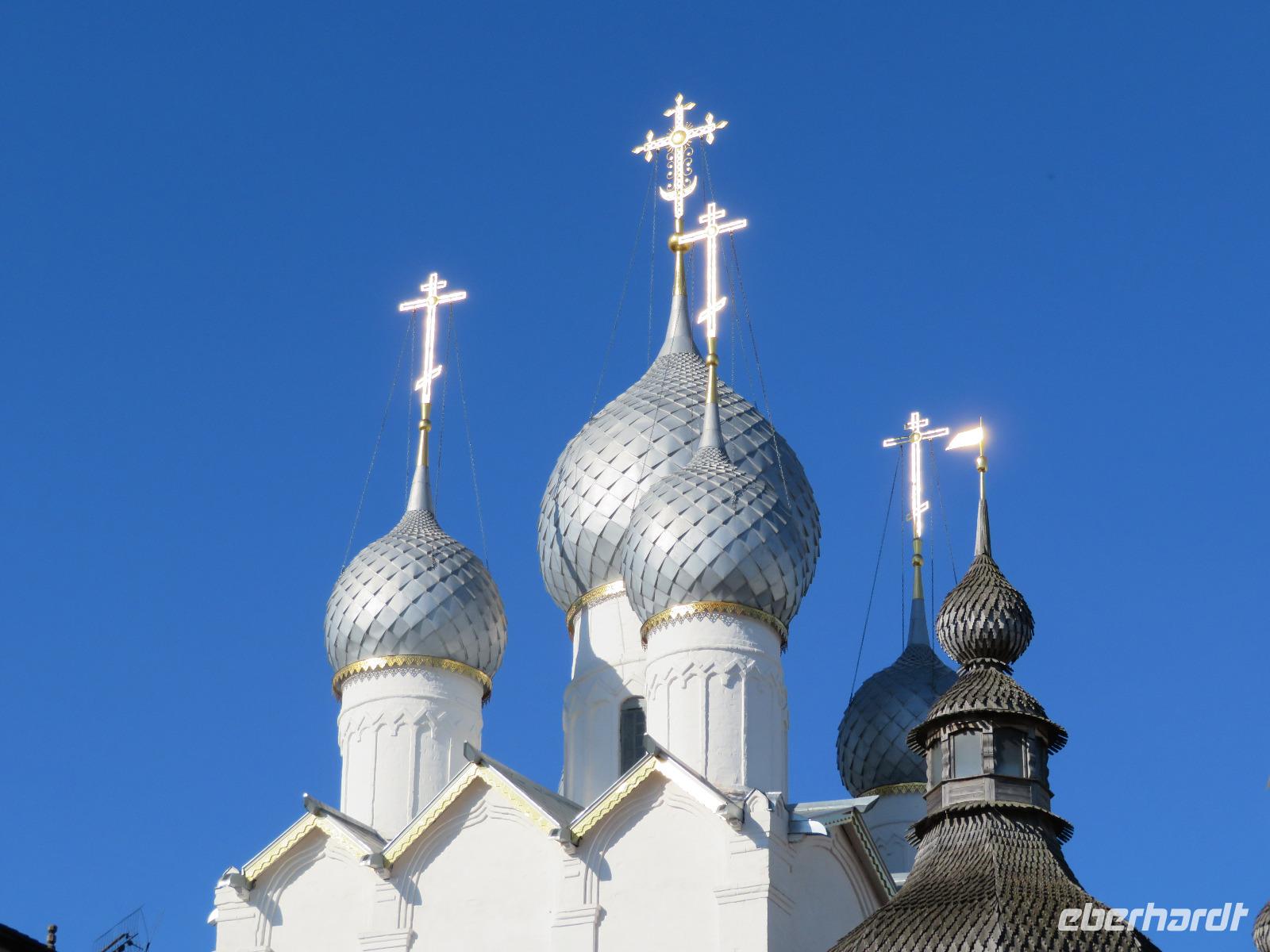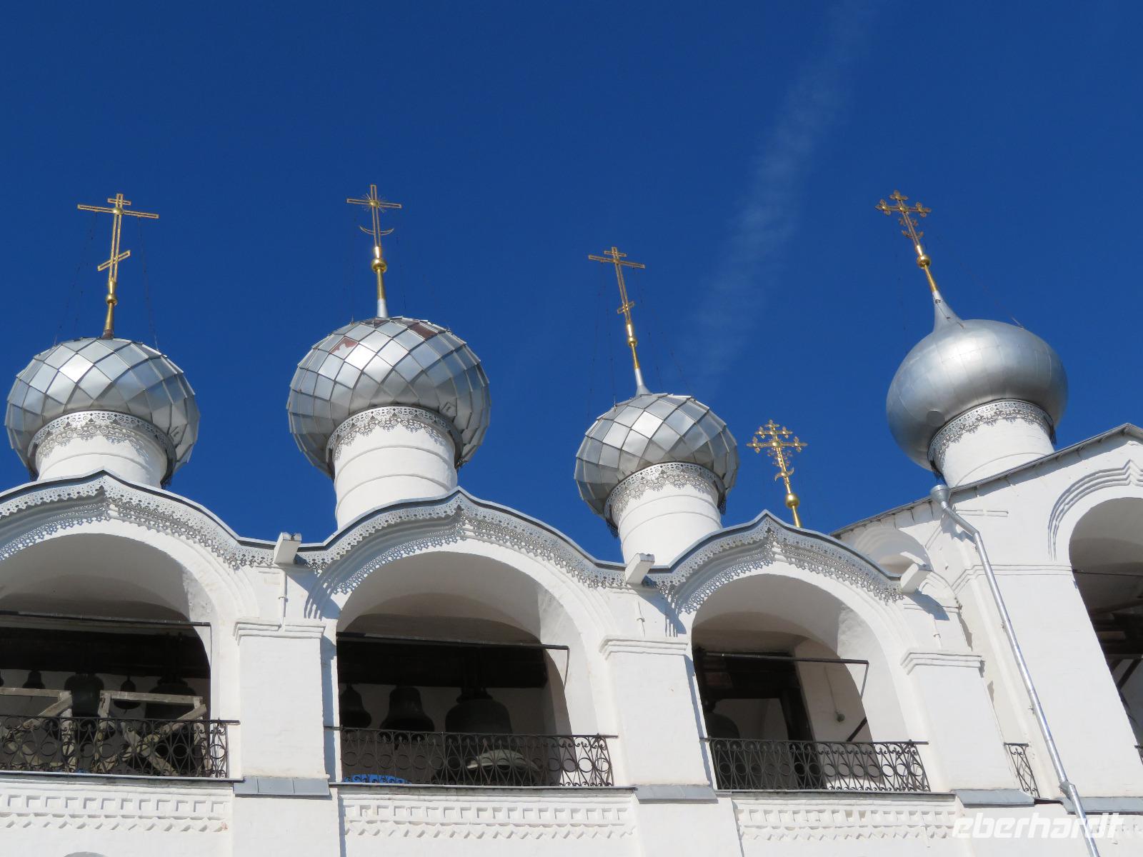 Wir starteten kurz vor zehn Uhr - in Russland beginnt der Arbeitstag eher spät - mit der Besichtigung des Rostover Kreml. Wohl nur wenige Kreml Russlands bieten auf so engem Raum eine solche Kompaktheit religöser Bauten; besonders beeindruckend die Maria-Entschlafens-Kathedrale mit der Glockenwand und die Anlage im Metropolitenhof. Im Kreml besichtigten wir auch die kleine Ausstellung von Emaille-Schmuck. Wer bereits vor um Acht auf den Beinen war, hatte die großen Glocken läuten gehört; im Kreml lauschten wir dann gemeinsam einem künstlerischen Glockenspiel auf zwei kleinen Glocken. Da wir bis zum Mittagessen noch gut Zeit hatten, fuhren wir mit dem Reisebus zum Erlöser-Jakow-Kloster am Rande der Stadt. Die klassizistische Dimitrij-Kirche zählt wohl zu den originellsten Sakralbauten auf unserer Tour und unterscheidet sich doch recht deutlich von den orthodox-romanischen, den weißen Zeltdachkirchen und den barocken Kirchen auf unserer Tour. Mancher erinnerte sich im Anblick der Innengestaltung wohl an Schinkel, an Berlin oder Potsdam.