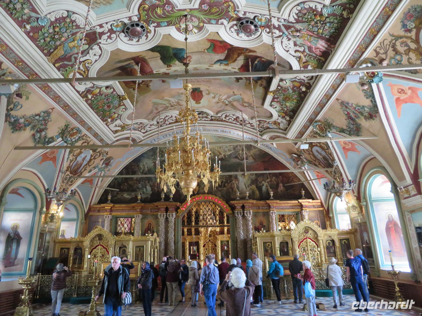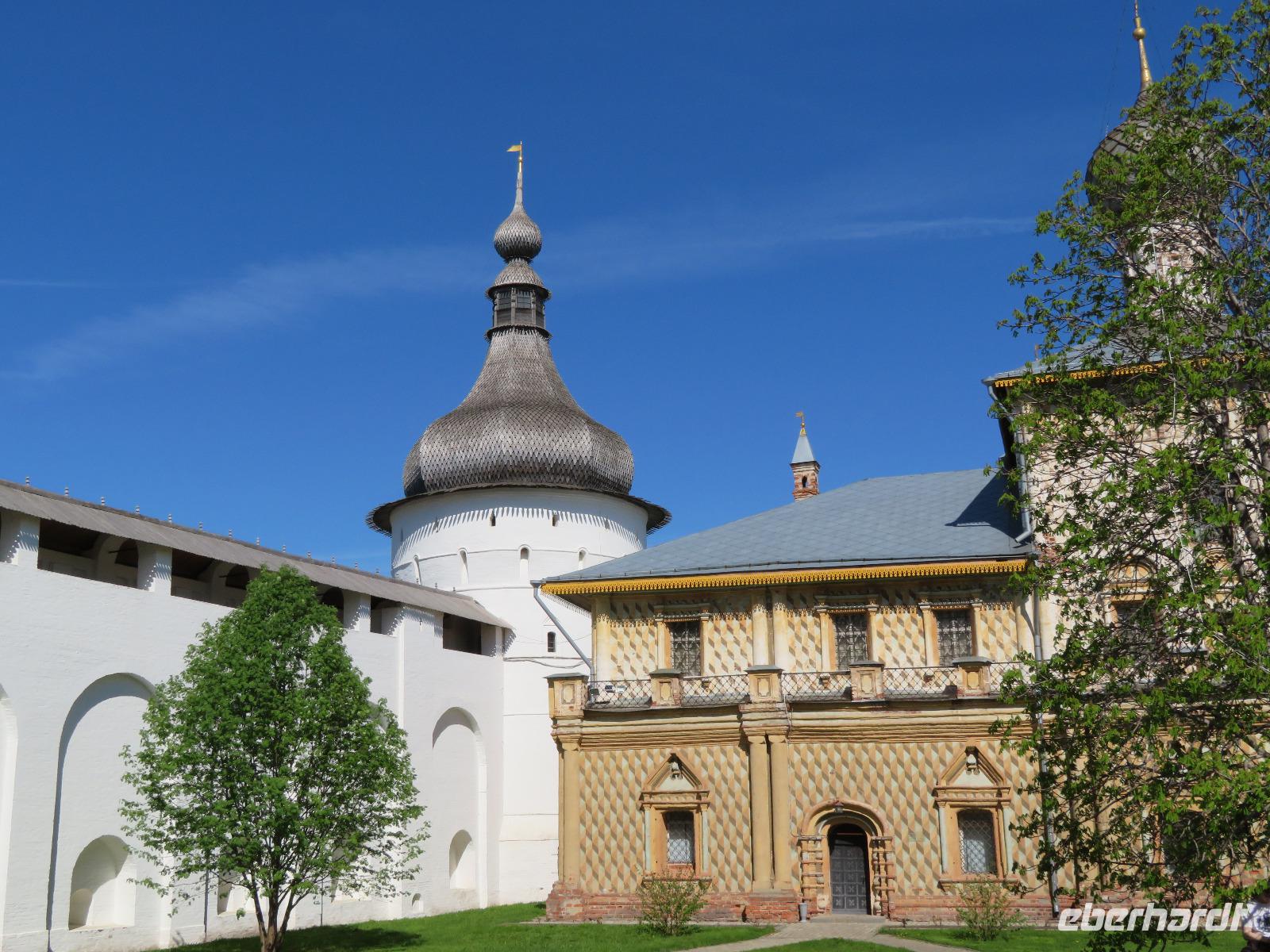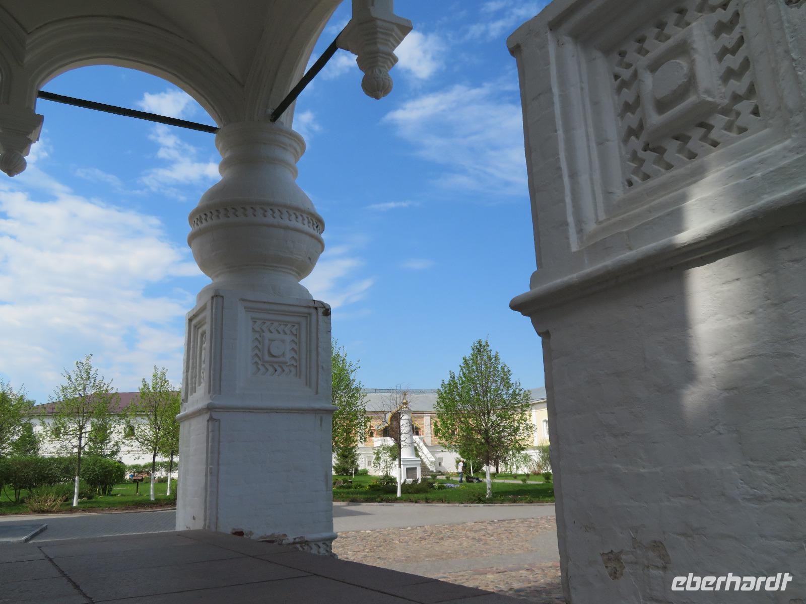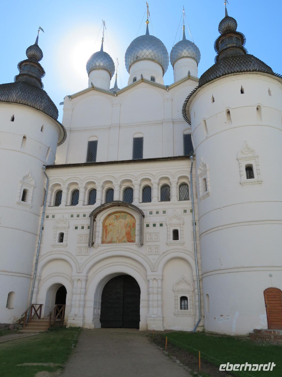 Wir starteten kurz vor zehn Uhr - in Russland beginnt der Arbeitstag eher spät - mit der Besichtigung des Rostover Kreml. Wohl nur wenige Kreml Russlands bieten auf so engem Raum eine solche Kompaktheit religöser Bauten; besonders beeindruckend die Maria-Entschlafens-Kathedrale mit der Glockenwand und die Anlage im Metropolitenhof. Im Kreml besichtigten wir auch die kleine Ausstellung von Emaille-Schmuck. Wer bereits vor um Acht auf den Beinen war, hatte die großen Glocken läuten gehört; im Kreml lauschten wir dann gemeinsam einem künstlerischen Glockenspiel auf zwei kleinen Glocken. Da wir bis zum Mittagessen noch gut Zeit hatten, fuhren wir mit dem Reisebus zum Erlöser-Jakow-Kloster am Rande der Stadt. Die klassizistische Dimitrij-Kirche zählt wohl zu den originellsten Sakralbauten auf unserer Tour und unterscheidet sich doch recht deutlich von den orthodox-romanischen, den weißen Zeltdachkirchen und den barocken Kirchen auf unserer Tour. Mancher erinnerte sich im Anblick der Innengestaltung wohl an Schinkel, an Berlin oder Potsdam.