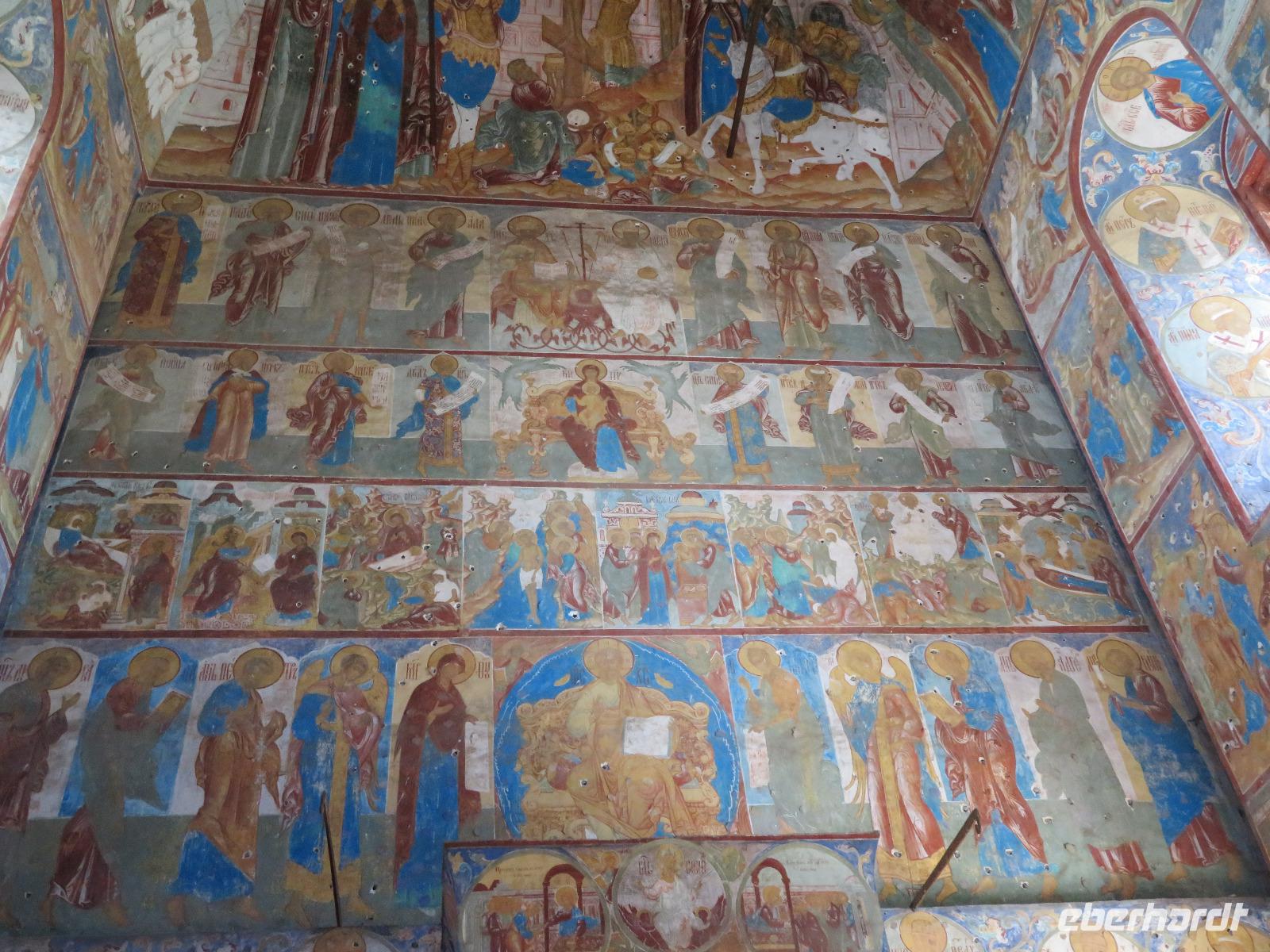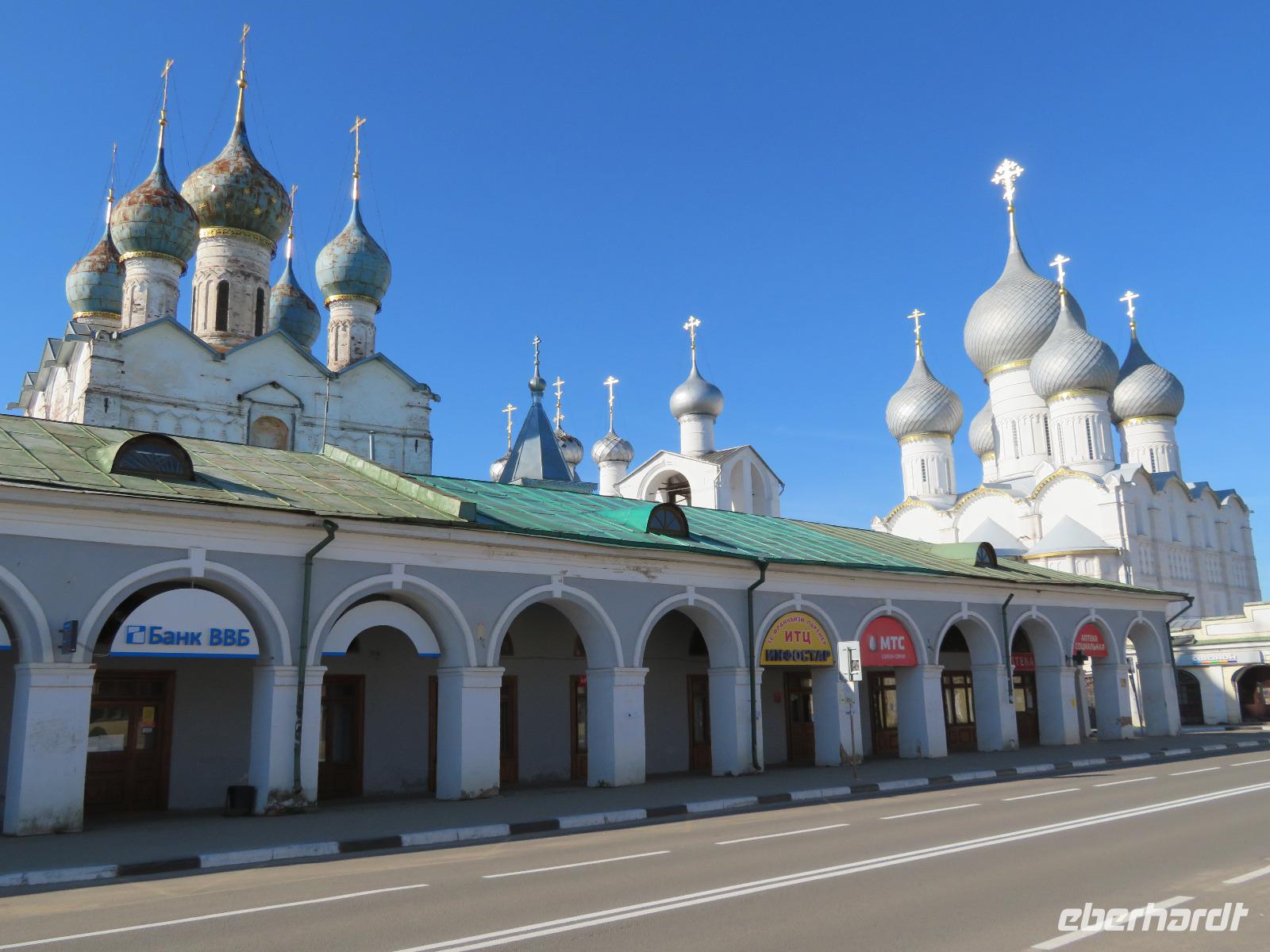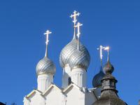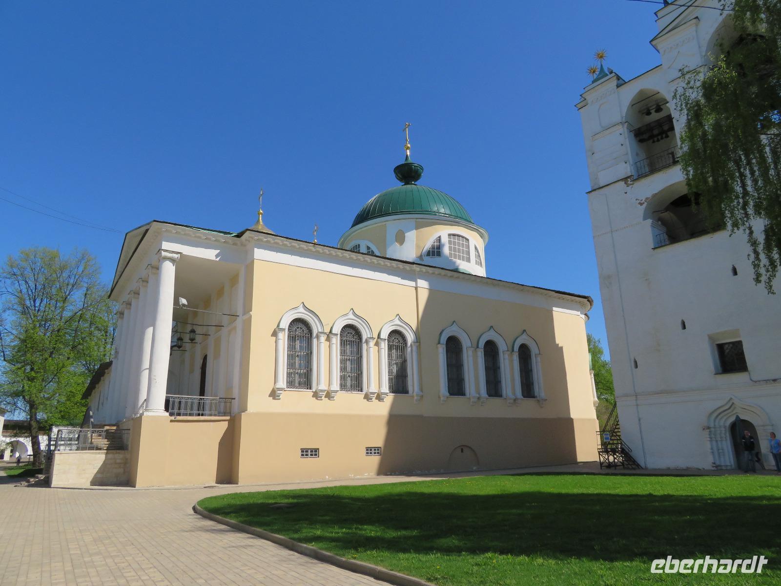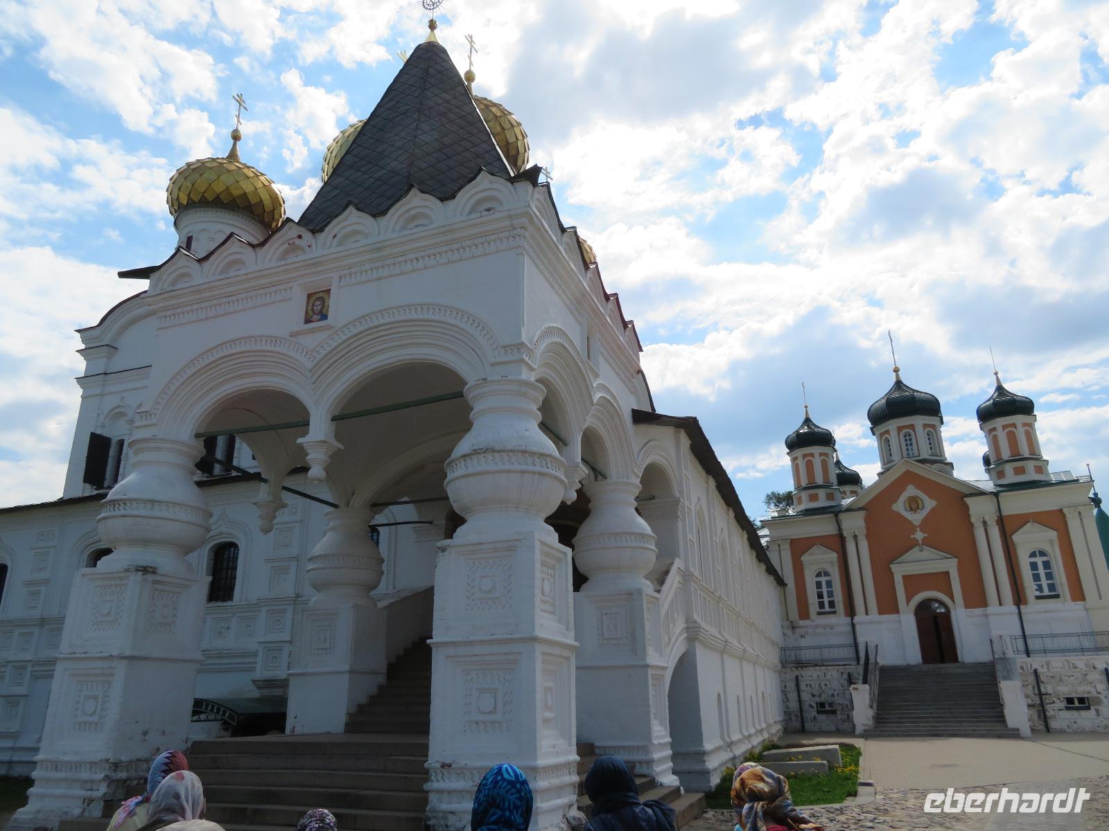 Wir starteten kurz vor zehn Uhr - in Russland beginnt der Arbeitstag eher spät - mit der Besichtigung des Rostover Kreml. Wohl nur wenige Kreml Russlands bieten auf so engem Raum eine solche Kompaktheit religöser Bauten; besonders beeindruckend die Maria-Entschlafens-Kathedrale mit der Glockenwand und die Anlage im Metropolitenhof. Im Kreml besichtigten wir auch die kleine Ausstellung von Emaille-Schmuck. Wer bereits vor um Acht auf den Beinen war, hatte die großen Glocken läuten gehört; im Kreml lauschten wir dann gemeinsam einem künstlerischen Glockenspiel auf zwei kleinen Glocken. Da wir bis zum Mittagessen noch gut Zeit hatten, fuhren wir mit dem Reisebus zum Erlöser-Jakow-Kloster am Rande der Stadt. Die klassizistische Dimitrij-Kirche zählt wohl zu den originellsten Sakralbauten auf unserer Tour und unterscheidet sich doch recht deutlich von den orthodox-romanischen, den weißen Zeltdachkirchen und den barocken Kirchen auf unserer Tour. Mancher erinnerte sich im Anblick der Innengestaltung wohl an Schinkel, an Berlin oder Potsdam.
