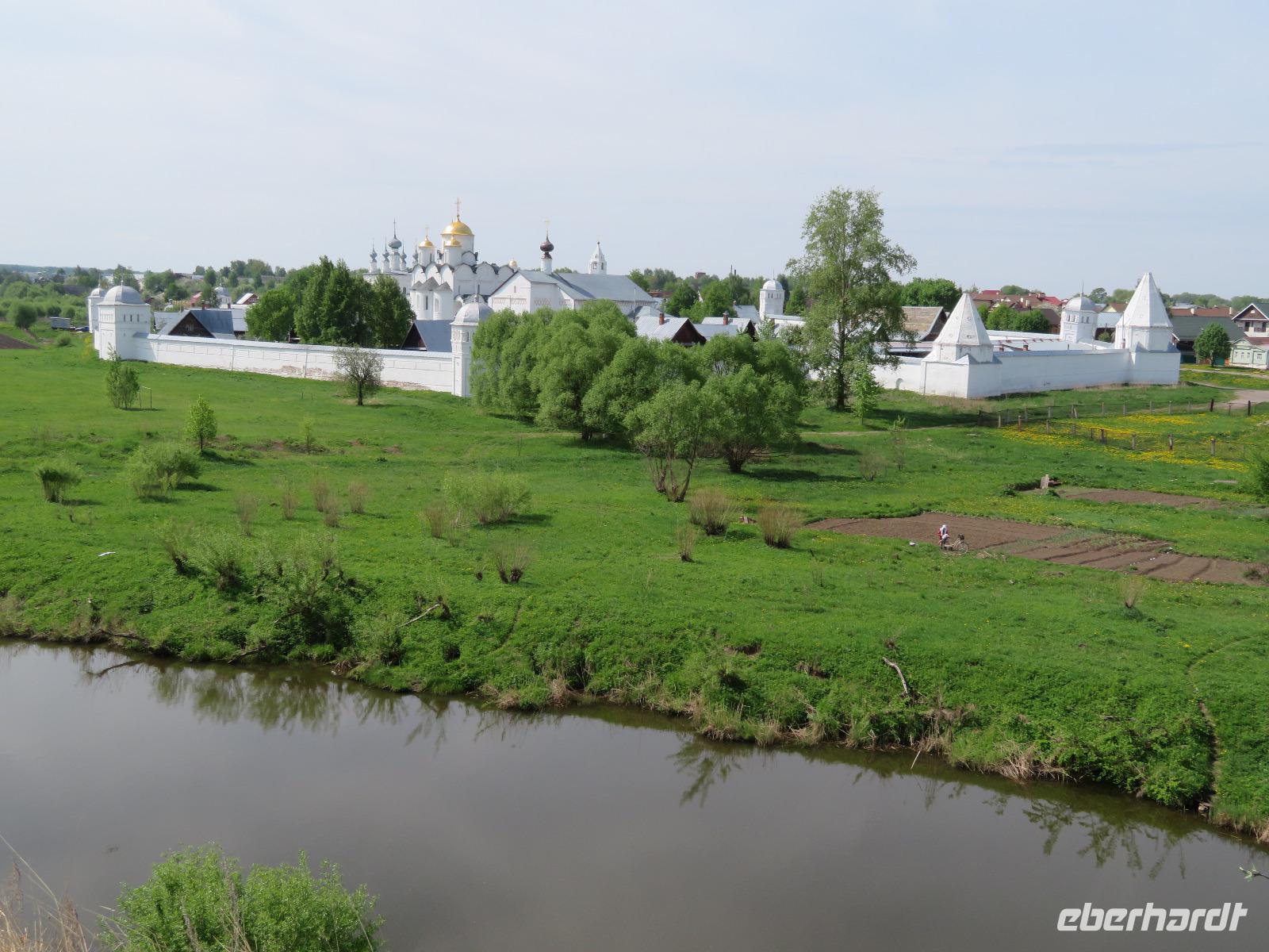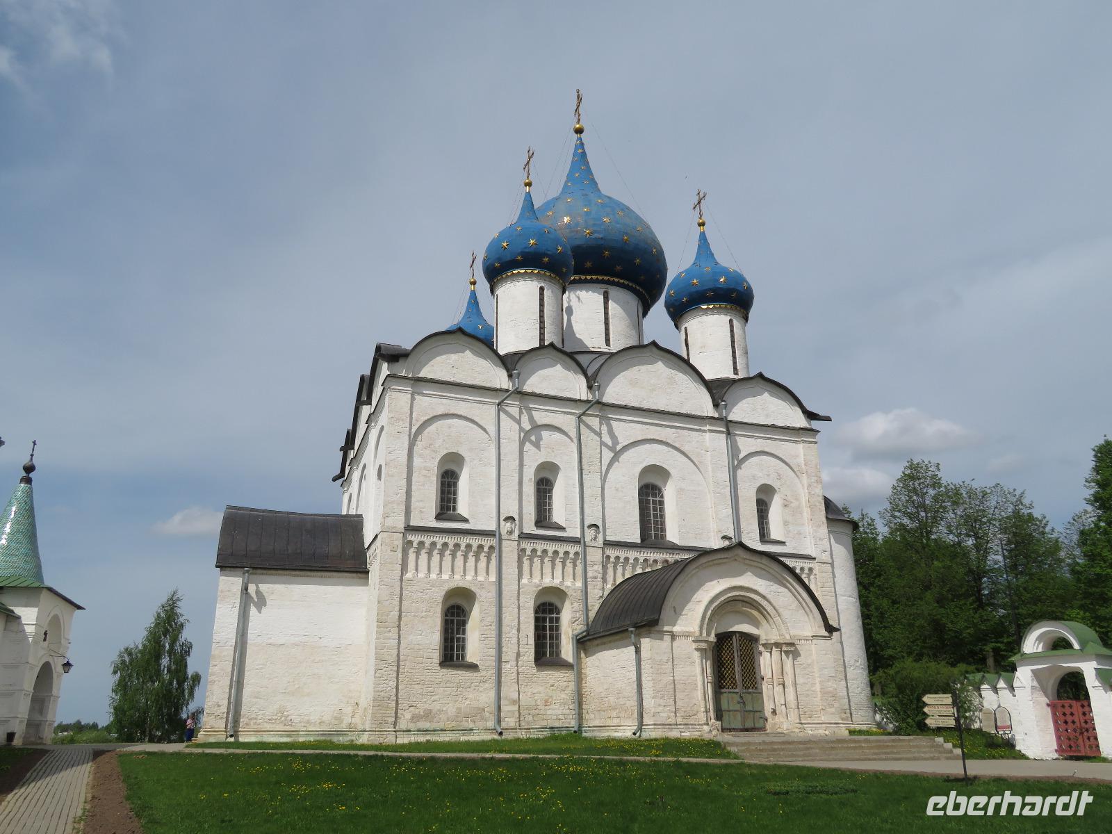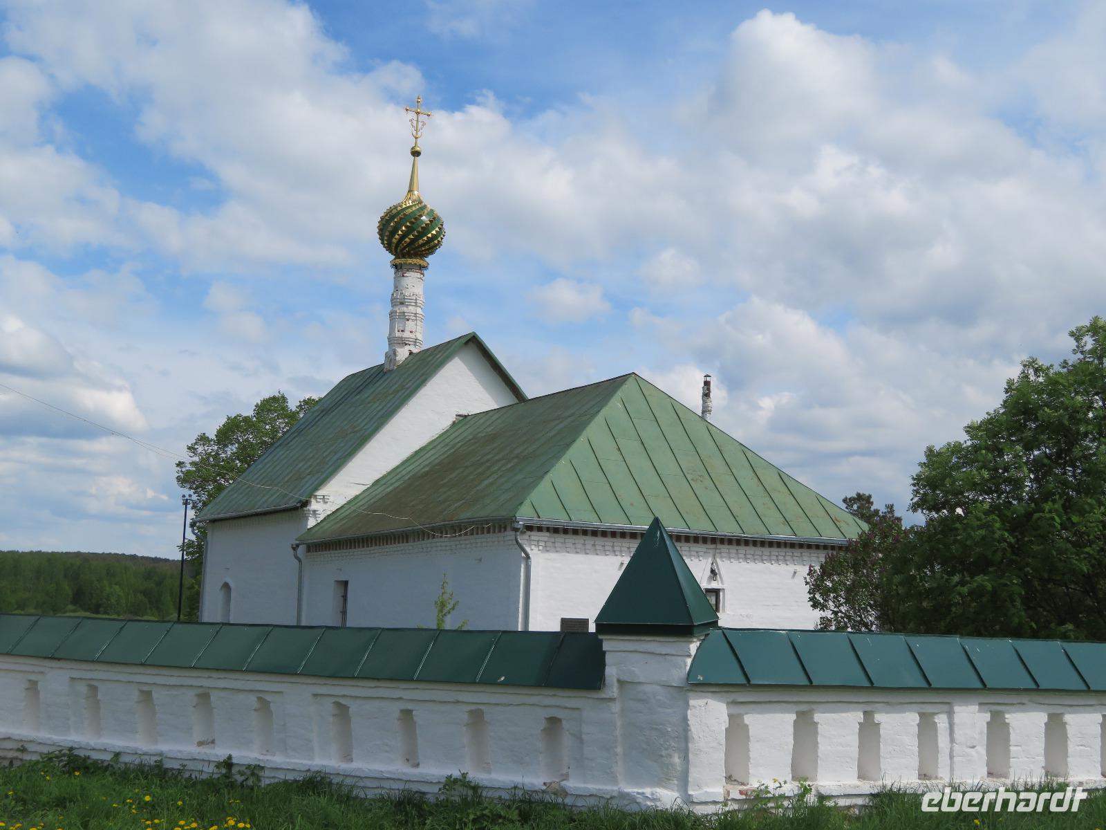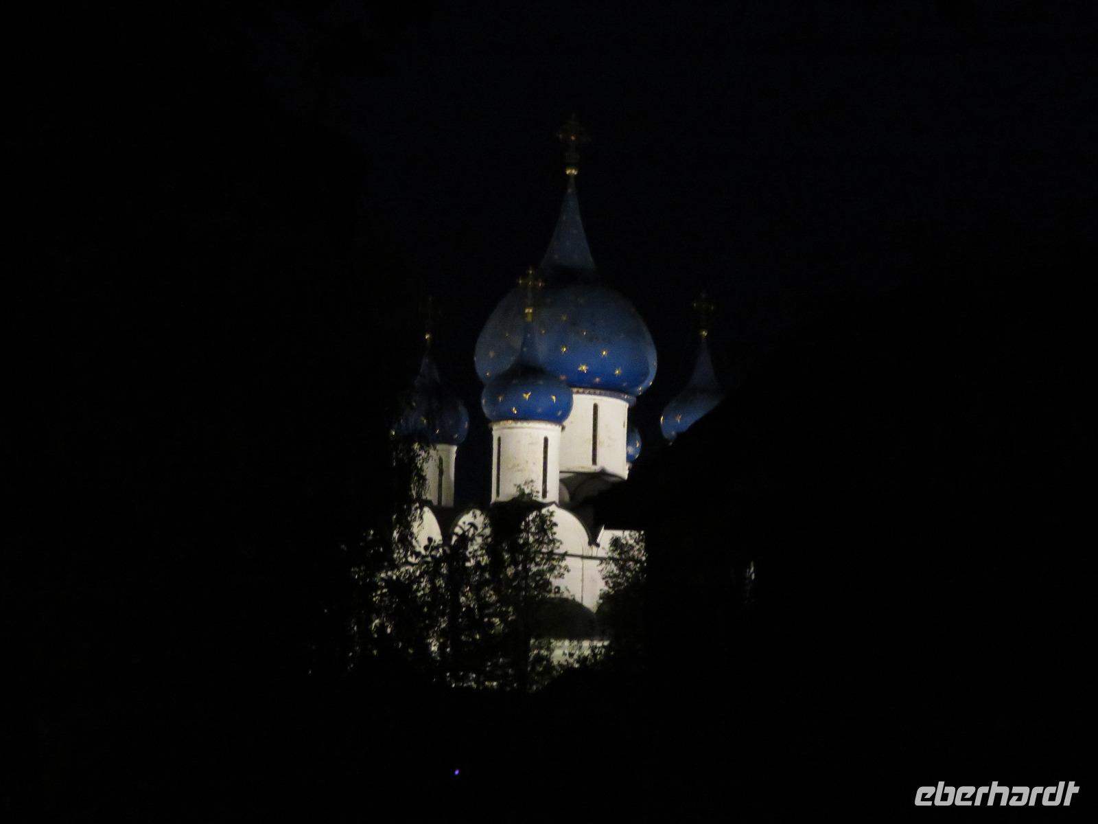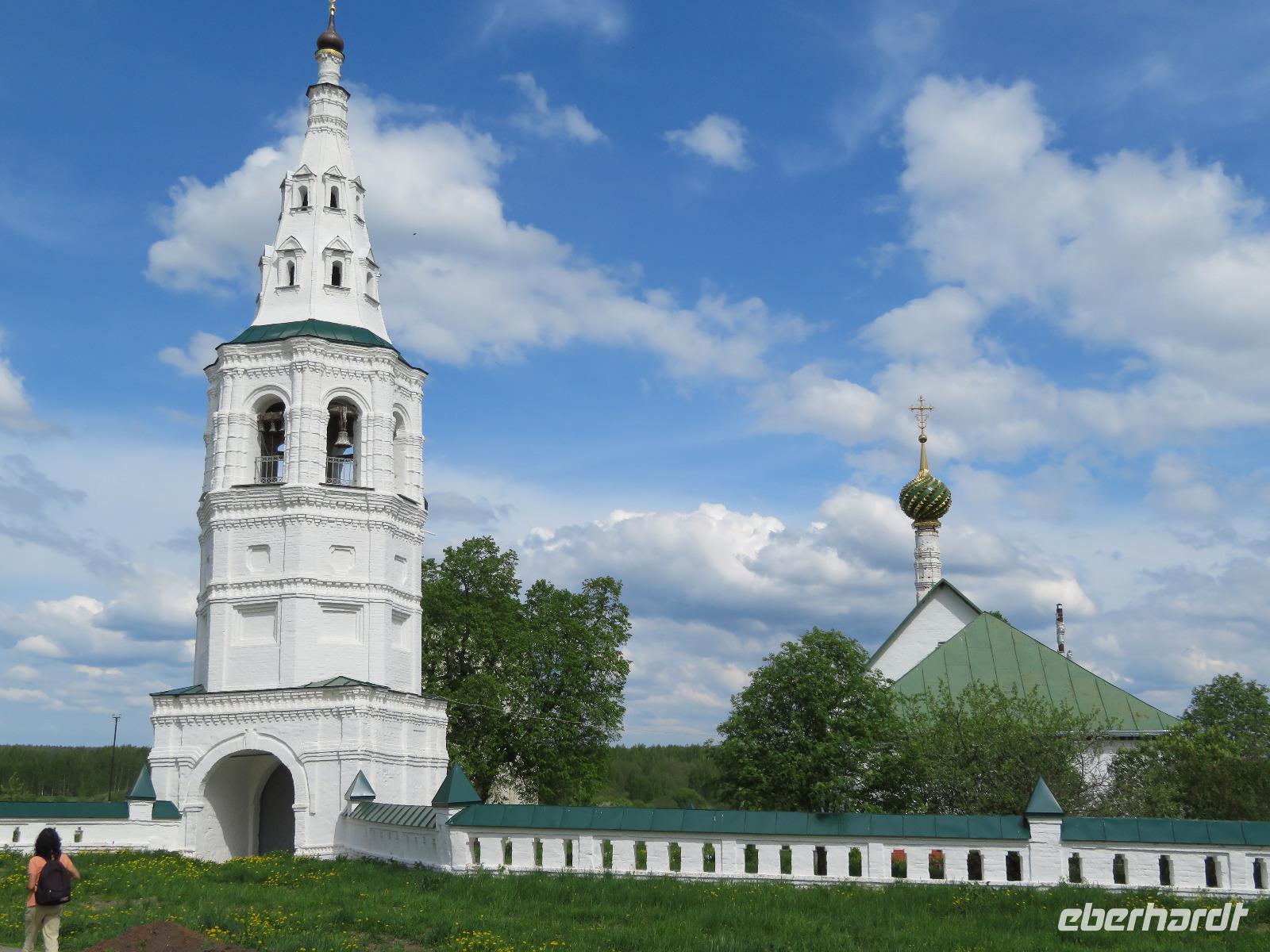 Nach einem reichlichen Frühstück starteten wir mit dem Bus zum Pokrov-Kloster, einem aktiven Frauenkloster, an den Windungen des Flüsschens Kamenka. Einst war dies auch Nonnensitz für abgewählte Frauen russischer Fürsten. Einige hundert Meter entfernt auf dem Hügel befindet sich das einstige Euthymos-Kloster. Das Museum birgt die Grabstätte des Fürsten Posharski, Anführer des russischen Volksheeres gegen polnische Okkupanten im zweiten Jahrzehnt des 17. Jahrhunderts. Vom Glockenturm hörten wir ein vortreffliches Glockenspiel. Über die jüngere Geschichte des Klosters erfuhren wir mehr in jenem Teil, der als Gefängnishof seit zaristischen Zeiten dienste. Ob allerdings die Legende vom Mönch aus der ersten Hälfte des 19. Jahrhunderts stimmt, der russische Geschichte bis zur Zarenermordung 1918 voraussagte, ist wohl eher russisches Reiseleiterlatein. Richtig ist jedoch, dass dies Kloster 1943 auch als Kriegsgefangenenlager für Stabsoffiziere der Wehrmacht diente und auch Generalfeldmarschall Paulus hier einige Wochen in Mönchszellen verbrachte. Vom Plateau an der Klostermauer ist immer ein schöner Blick auf das Pokrov-Kloster und die grüne Landschaft möglich. Dritter Besichtigungshöhepunkt war der hiesige Kreml mit den großen blauen Zwiebeltürmen der Mutter-Gottes-Geburts-Kathedrale.