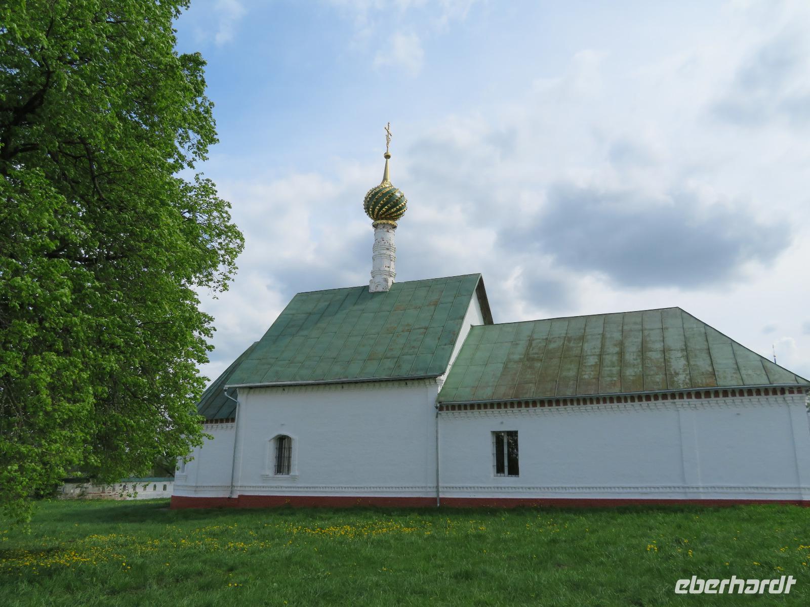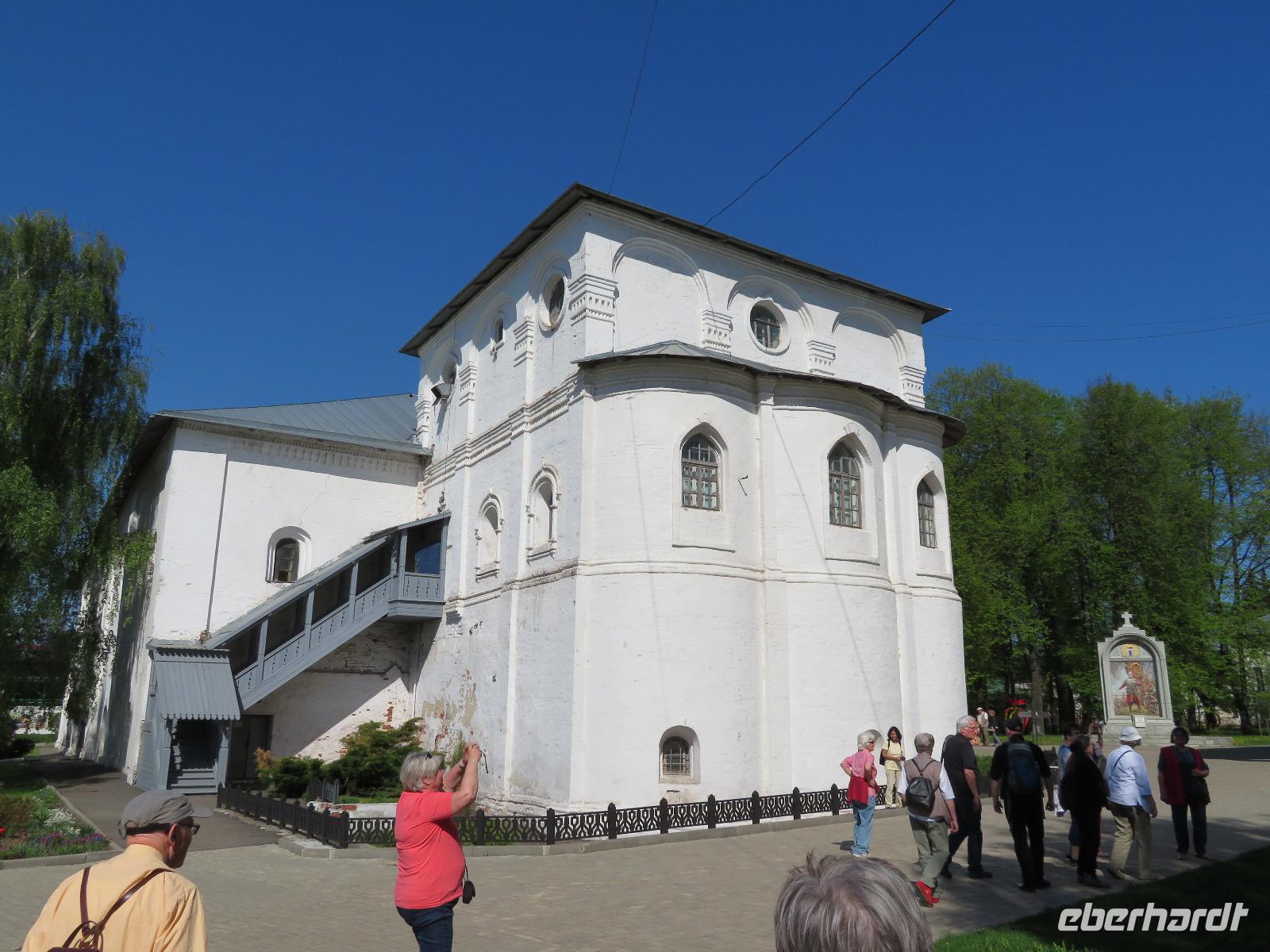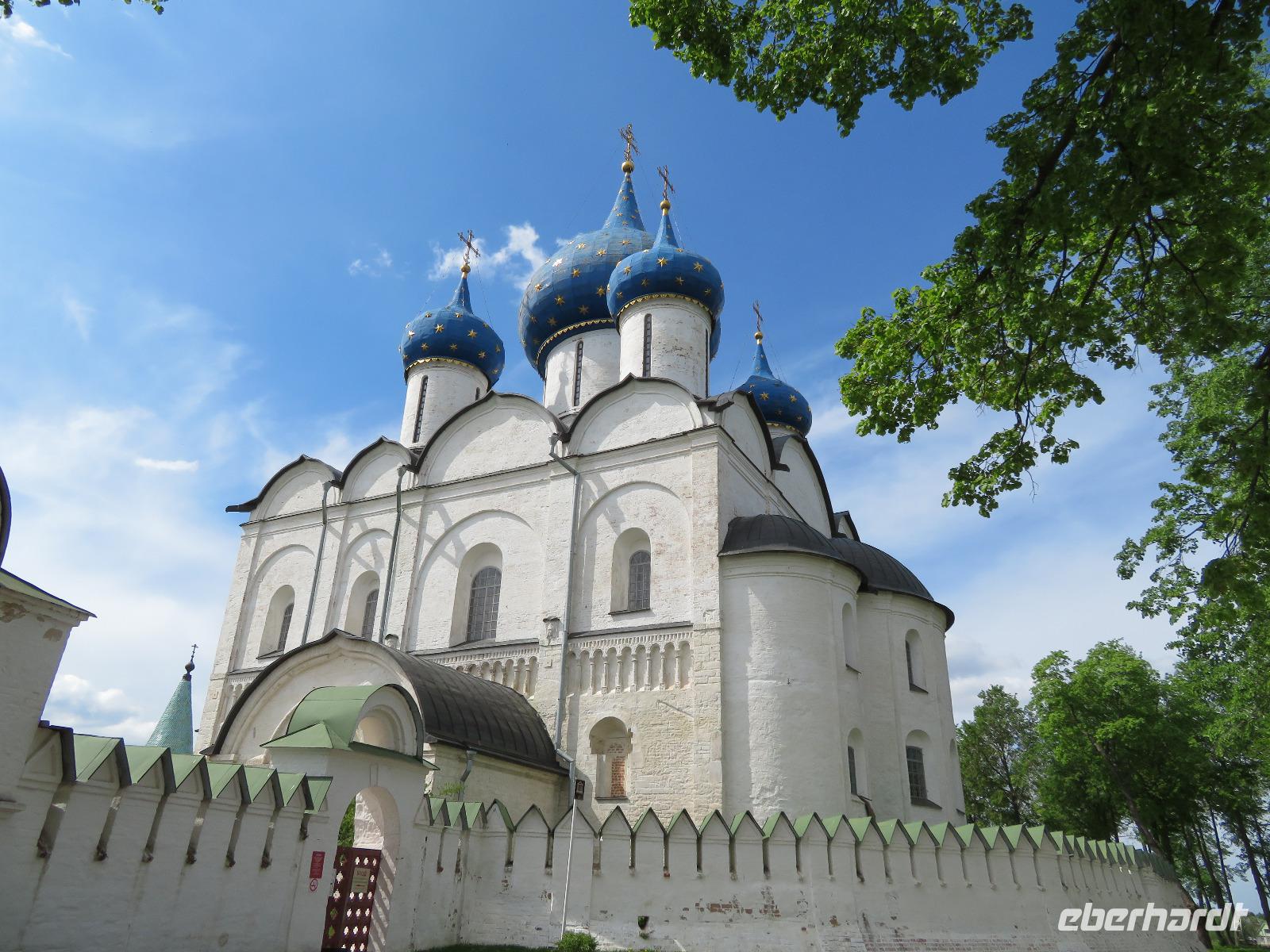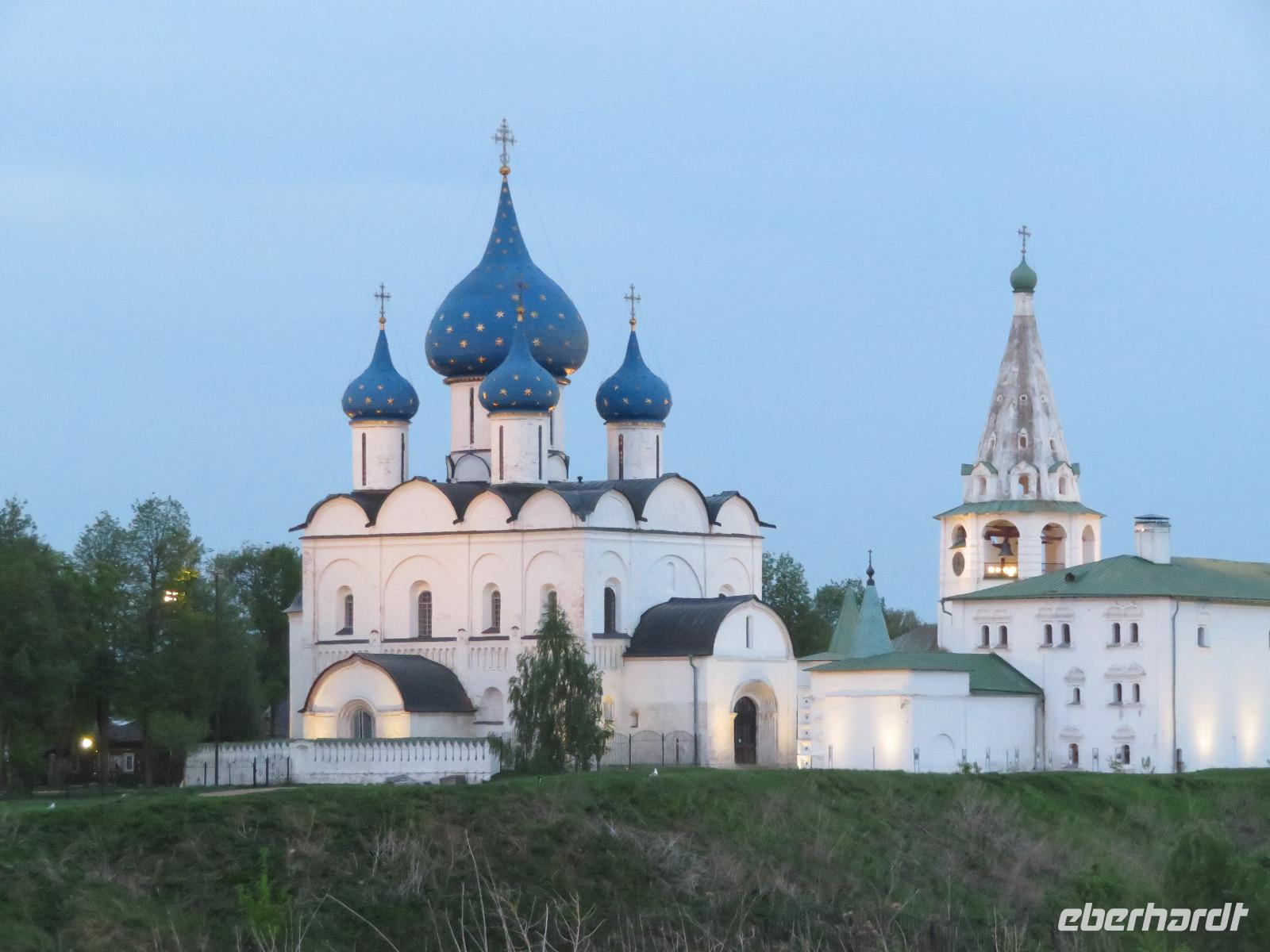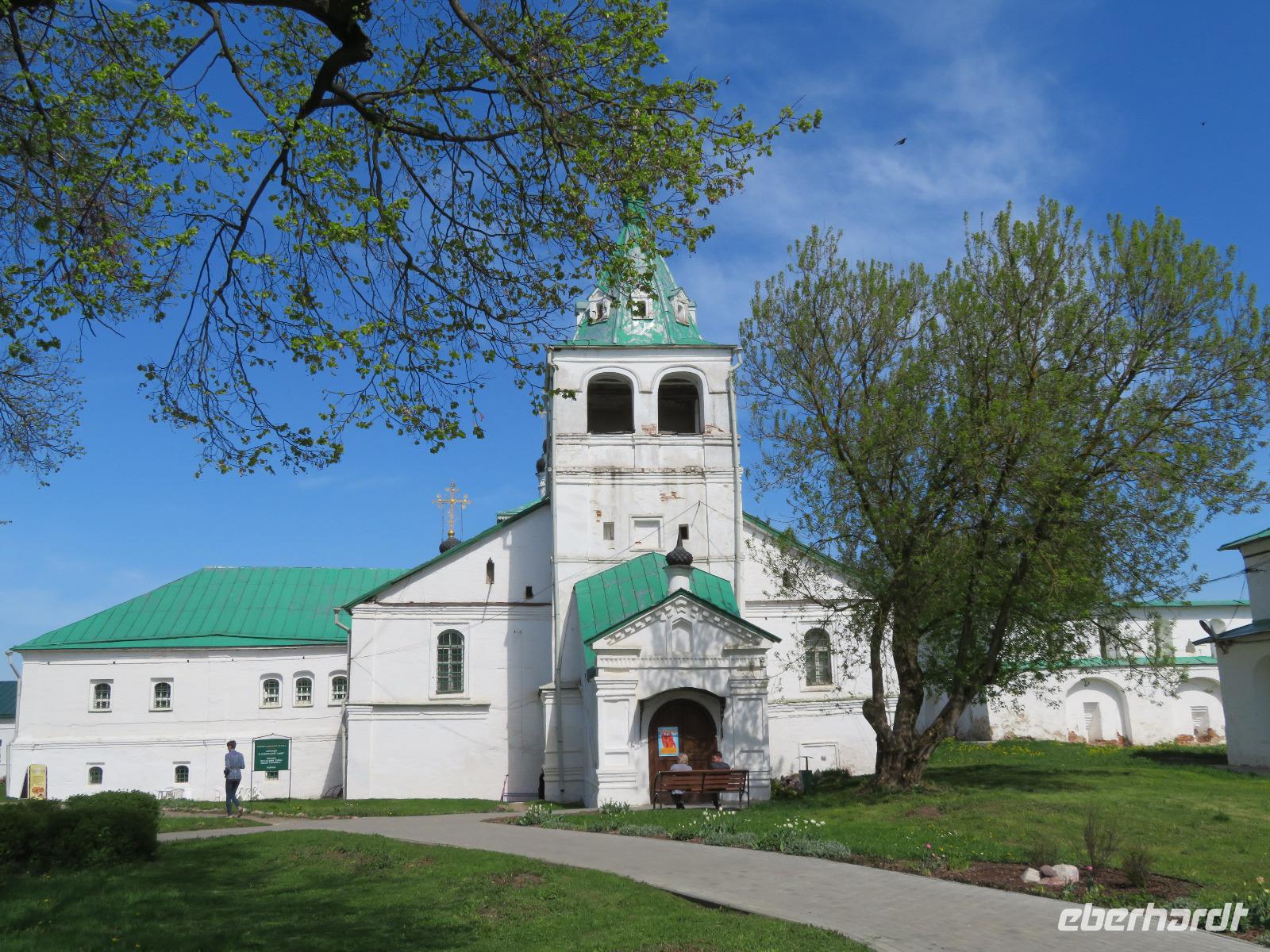 Nach einem reichlichen Frühstück starteten wir mit dem Bus zum Pokrov-Kloster, einem aktiven Frauenkloster, an den Windungen des Flüsschens Kamenka. Einst war dies auch Nonnensitz für abgewählte Frauen russischer Fürsten. Einige hundert Meter entfernt auf dem Hügel befindet sich das einstige Euthymos-Kloster. Das Museum birgt die Grabstätte des Fürsten Posharski, Anführer des russischen Volksheeres gegen polnische Okkupanten im zweiten Jahrzehnt des 17. Jahrhunderts. Vom Glockenturm hörten wir ein vortreffliches Glockenspiel. Über die jüngere Geschichte des Klosters erfuhren wir mehr in jenem Teil, der als Gefängnishof seit zaristischen Zeiten dienste. Ob allerdings die Legende vom Mönch aus der ersten Hälfte des 19. Jahrhunderts stimmt, der russische Geschichte bis zur Zarenermordung 1918 voraussagte, ist wohl eher russisches Reiseleiterlatein. Richtig ist jedoch, dass dies Kloster 1943 auch als Kriegsgefangenenlager für Stabsoffiziere der Wehrmacht diente und auch Generalfeldmarschall Paulus hier einige Wochen in Mönchszellen verbrachte. Vom Plateau an der Klostermauer ist immer ein schöner Blick auf das Pokrov-Kloster und die grüne Landschaft möglich. Dritter Besichtigungshöhepunkt war der hiesige Kreml mit den großen blauen Zwiebeltürmen der Mutter-Gottes-Geburts-Kathedrale.