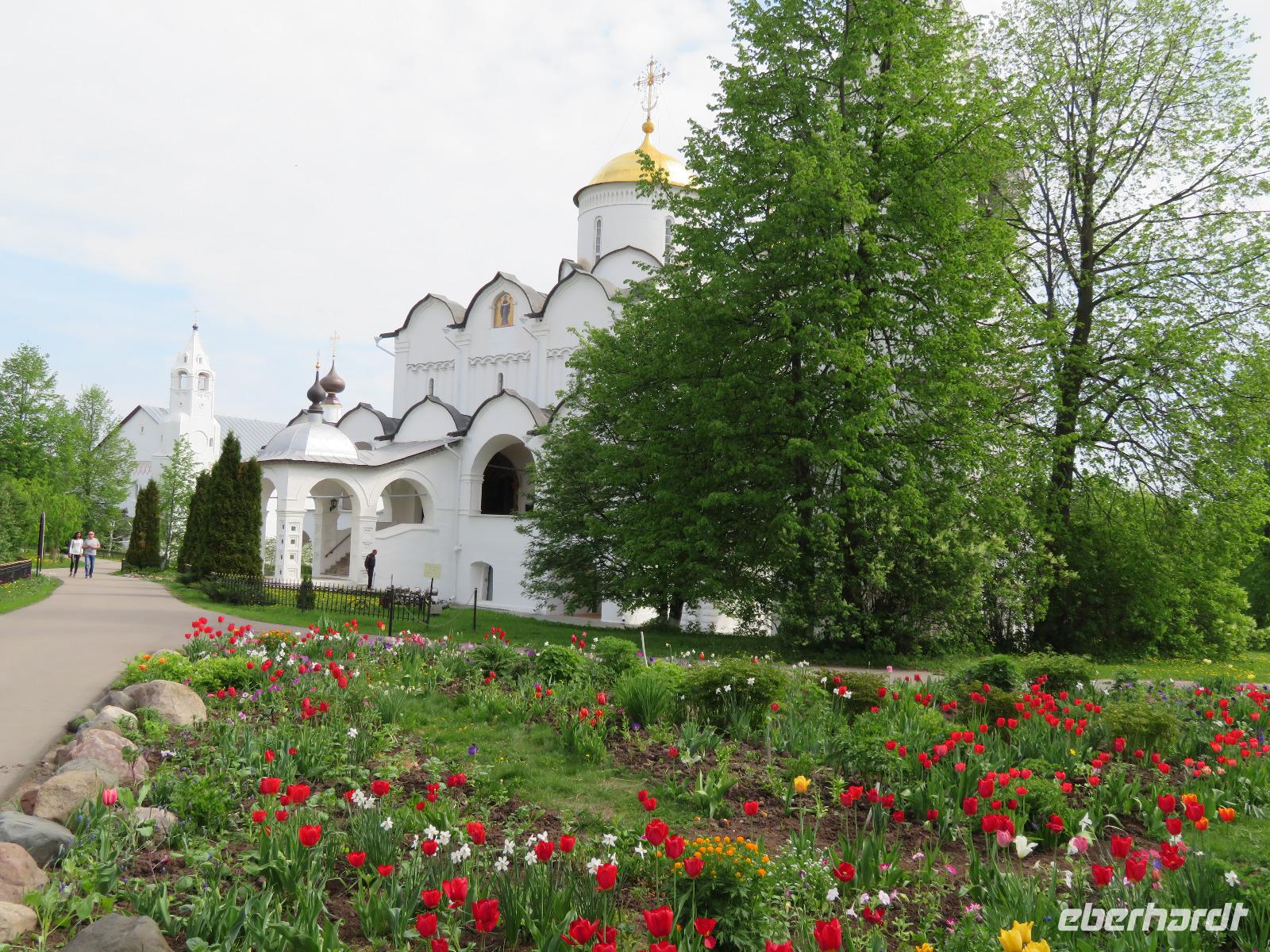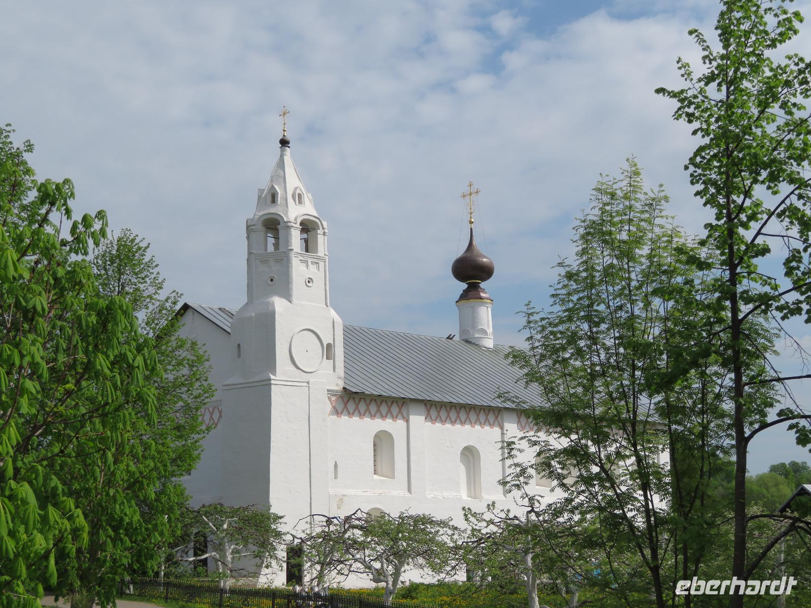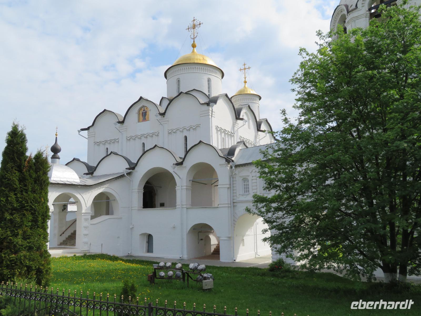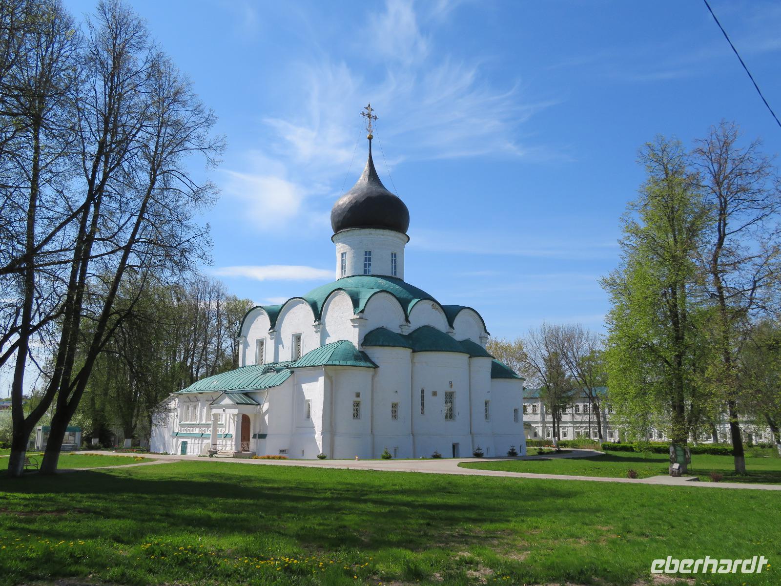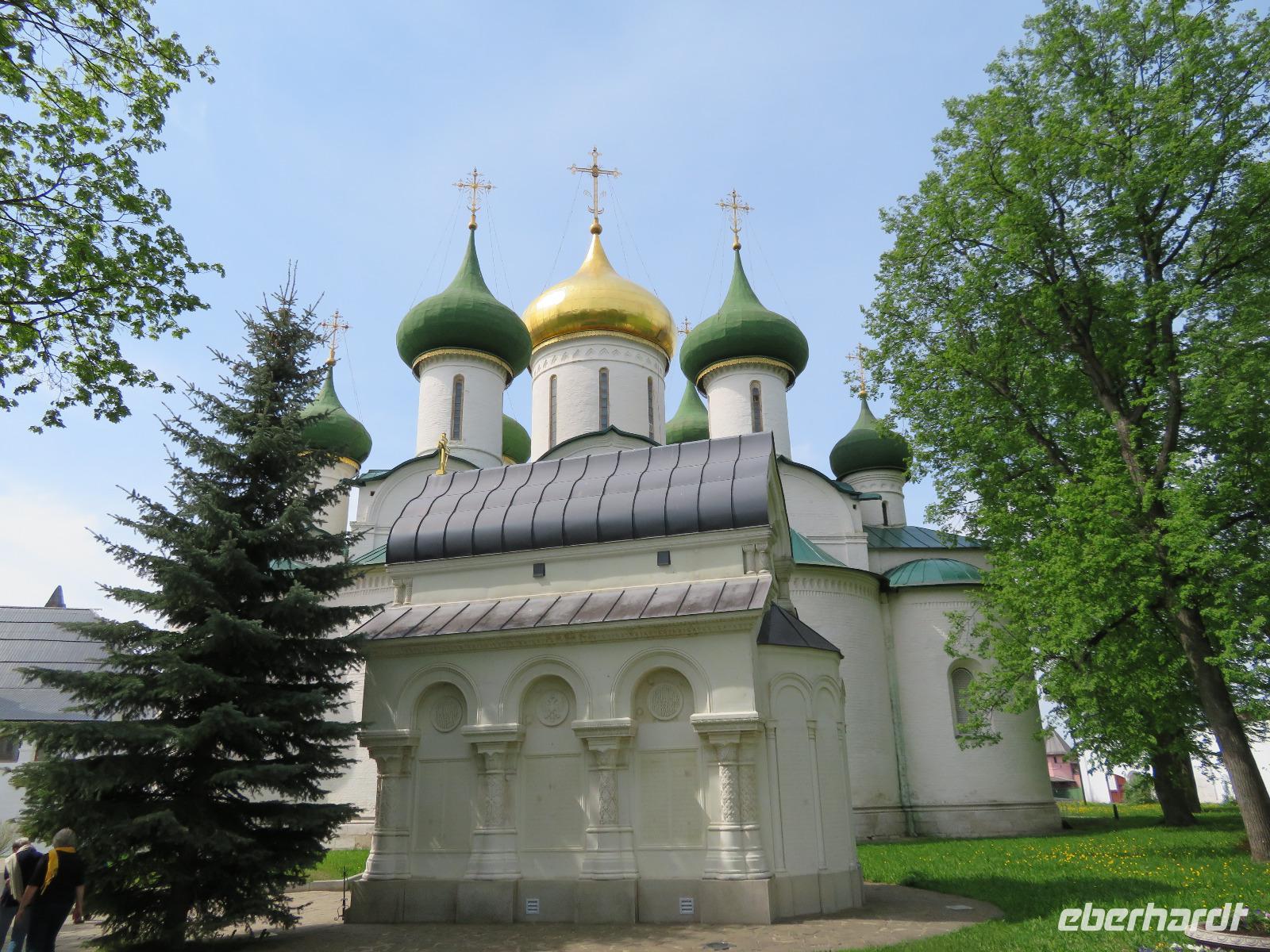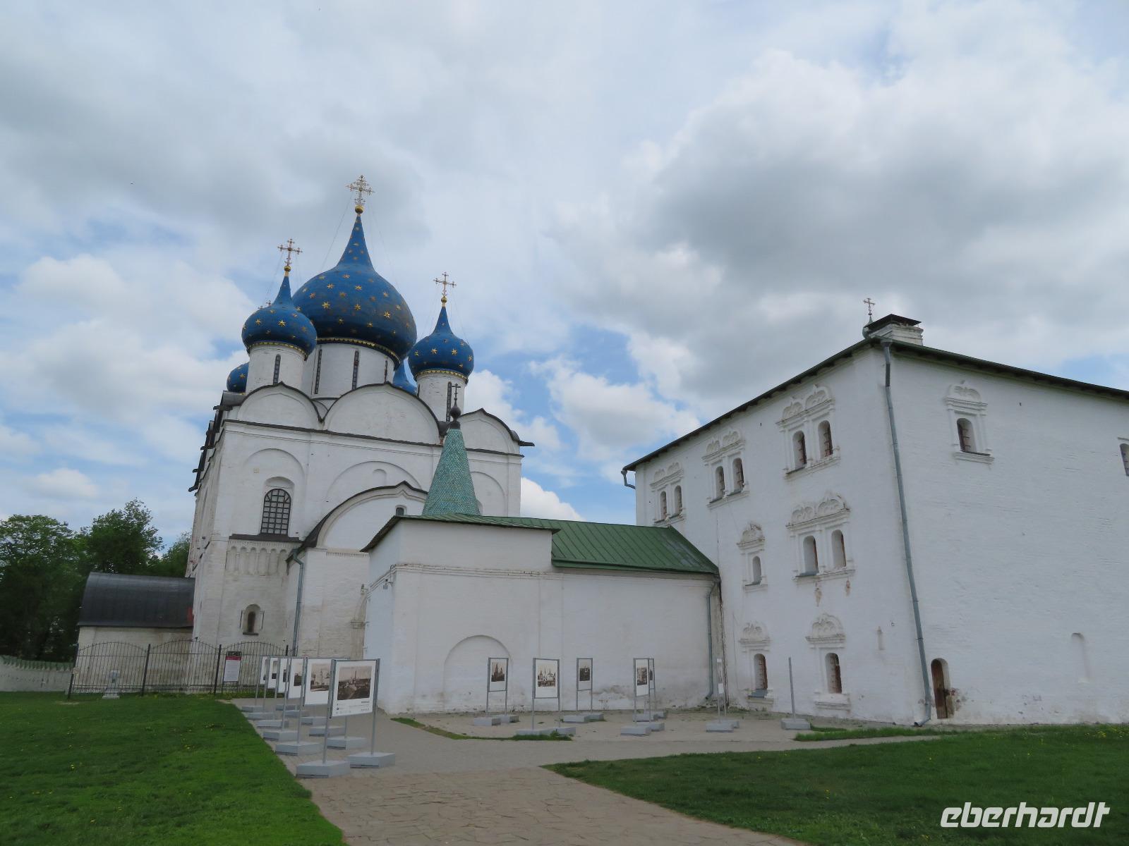 Nach einem reichlichen Frühstück starteten wir mit dem Bus zum Pokrov-Kloster, einem aktiven Frauenkloster, an den Windungen des Flüsschens Kamenka. Einst war dies auch Nonnensitz für abgewählte Frauen russischer Fürsten. Einige hundert Meter entfernt auf dem Hügel befindet sich das einstige Euthymos-Kloster. Das Museum birgt die Grabstätte des Fürsten Posharski, Anführer des russischen Volksheeres gegen polnische Okkupanten im zweiten Jahrzehnt des 17. Jahrhunderts. Vom Glockenturm hörten wir ein vortreffliches Glockenspiel. Über die jüngere Geschichte des Klosters erfuhren wir mehr in jenem Teil, der als Gefängnishof seit zaristischen Zeiten dienste. Ob allerdings die Legende vom Mönch aus der ersten Hälfte des 19. Jahrhunderts stimmt, der russische Geschichte bis zur Zarenermordung 1918 voraussagte, ist wohl eher russisches Reiseleiterlatein. Richtig ist jedoch, dass dies Kloster 1943 auch als Kriegsgefangenenlager für Stabsoffiziere der Wehrmacht diente und auch Generalfeldmarschall Paulus hier einige Wochen in Mönchszellen verbrachte. Vom Plateau an der Klostermauer ist immer ein schöner Blick auf das Pokrov-Kloster und die grüne Landschaft möglich. Dritter Besichtigungshöhepunkt war der hiesige Kreml mit den großen blauen Zwiebeltürmen der Mutter-Gottes-Geburts-Kathedrale.