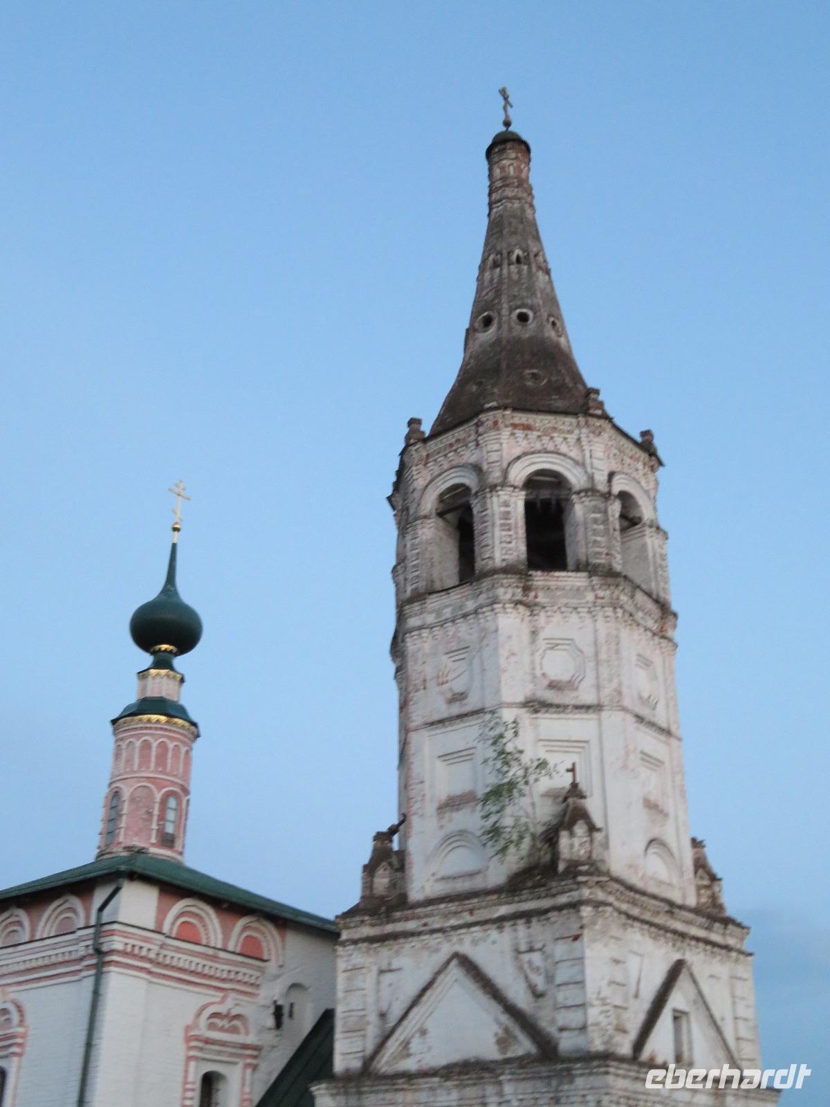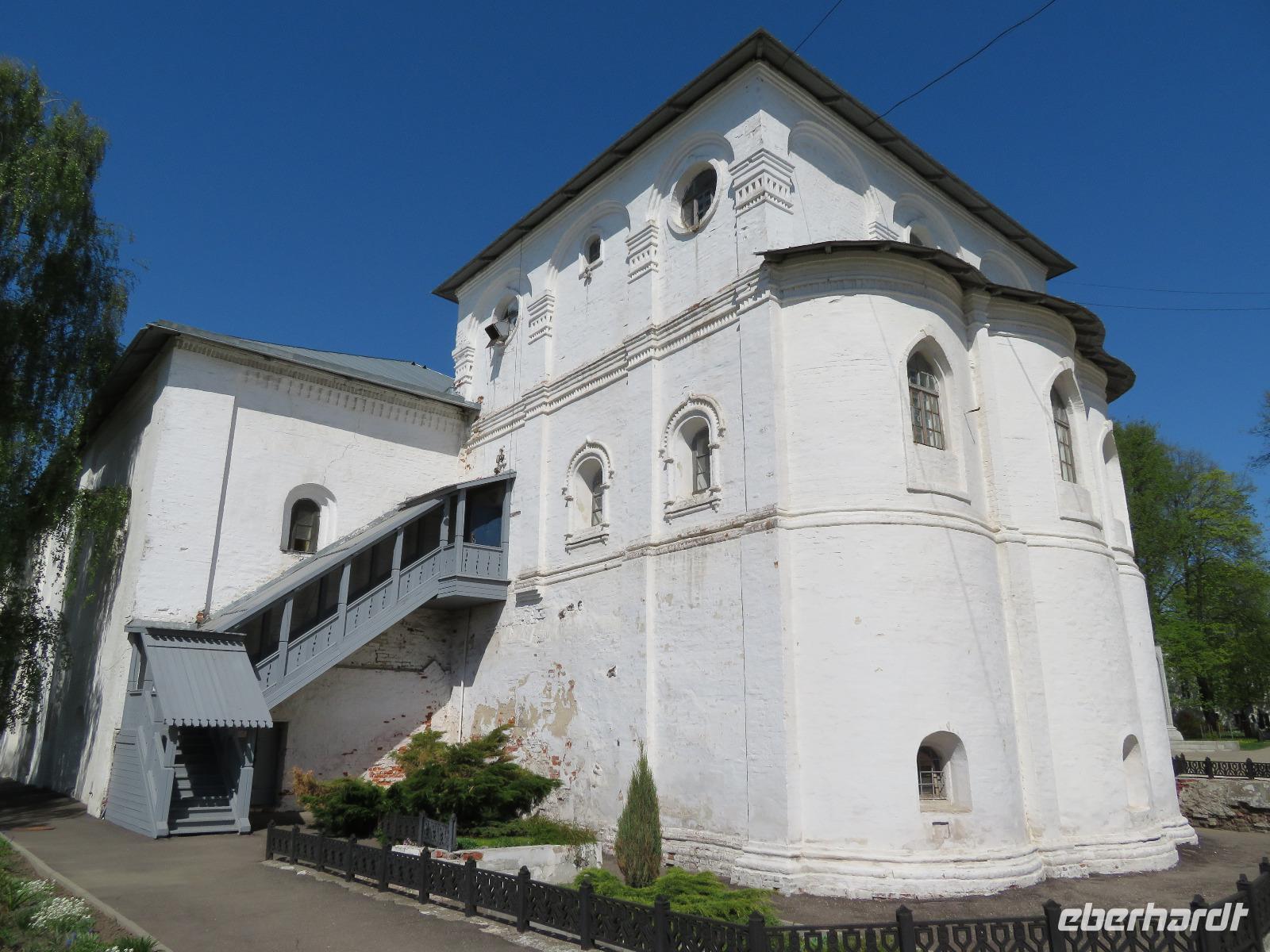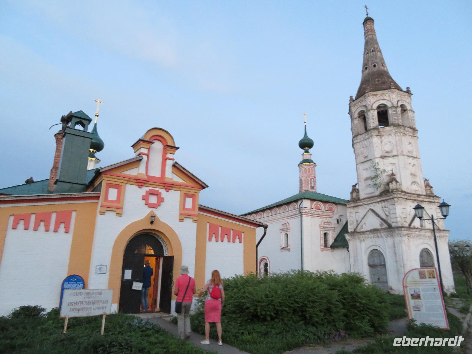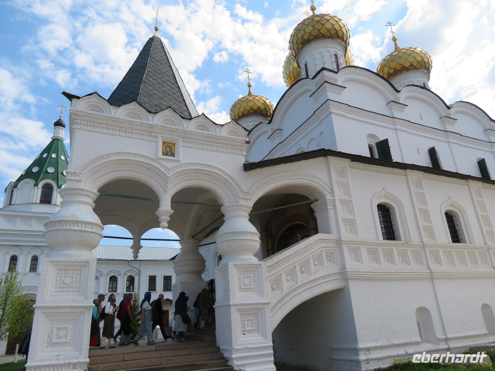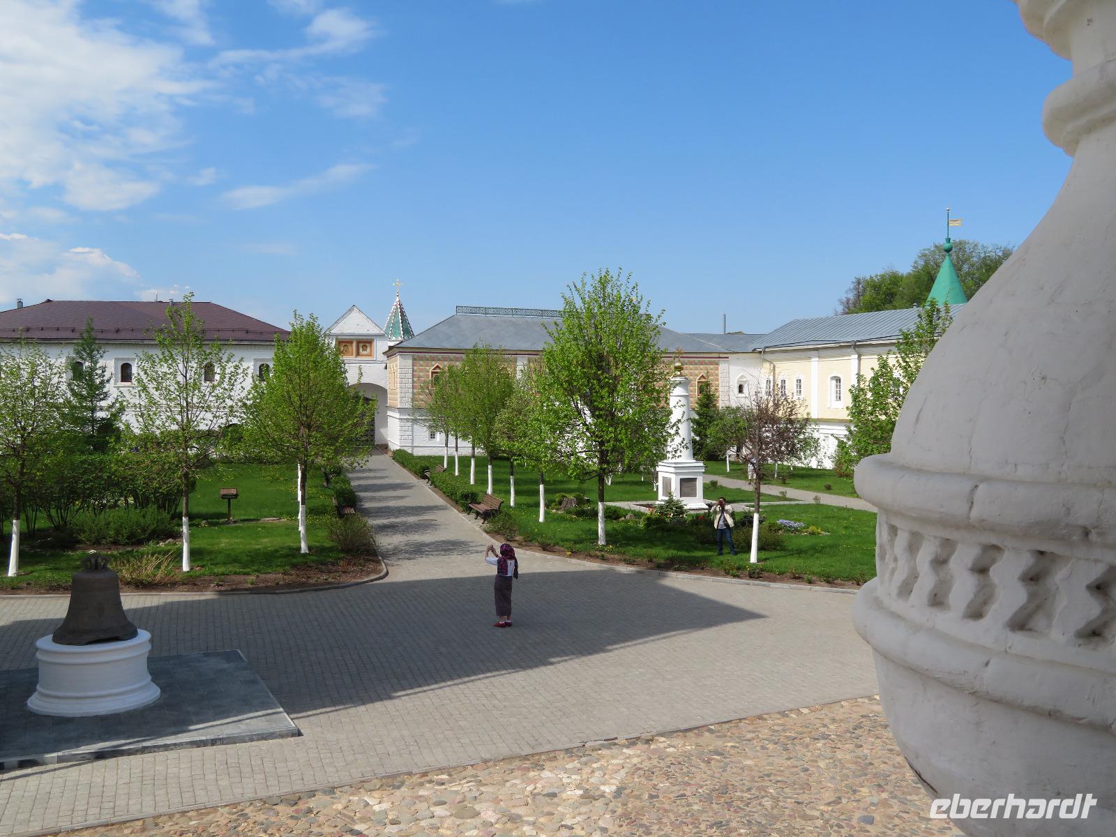 Nach einem reichlichen Frühstück starteten wir mit dem Bus zum Pokrov-Kloster, einem aktiven Frauenkloster, an den Windungen des Flüsschens Kamenka. Einst war dies auch Nonnensitz für abgewählte Frauen russischer Fürsten. Einige hundert Meter entfernt auf dem Hügel befindet sich das einstige Euthymos-Kloster. Das Museum birgt die Grabstätte des Fürsten Posharski, Anführer des russischen Volksheeres gegen polnische Okkupanten im zweiten Jahrzehnt des 17. Jahrhunderts. Vom Glockenturm hörten wir ein vortreffliches Glockenspiel. Über die jüngere Geschichte des Klosters erfuhren wir mehr in jenem Teil, der als Gefängnishof seit zaristischen Zeiten dienste. Ob allerdings die Legende vom Mönch aus der ersten Hälfte des 19. Jahrhunderts stimmt, der russische Geschichte bis zur Zarenermordung 1918 voraussagte, ist wohl eher russisches Reiseleiterlatein. Richtig ist jedoch, dass dies Kloster 1943 auch als Kriegsgefangenenlager für Stabsoffiziere der Wehrmacht diente und auch Generalfeldmarschall Paulus hier einige Wochen in Mönchszellen verbrachte. Vom Plateau an der Klostermauer ist immer ein schöner Blick auf das Pokrov-Kloster und die grüne Landschaft möglich. Dritter Besichtigungshöhepunkt war der hiesige Kreml mit den großen blauen Zwiebeltürmen der Mutter-Gottes-Geburts-Kathedrale.