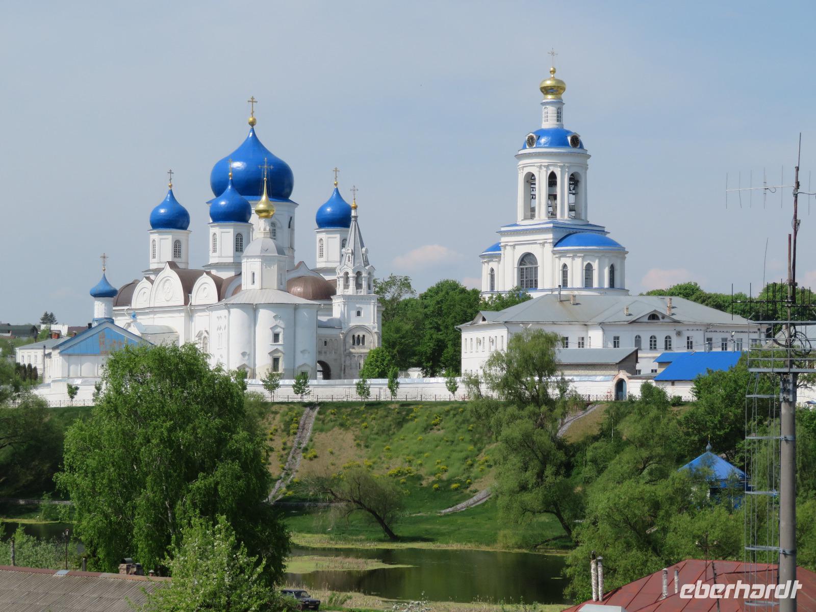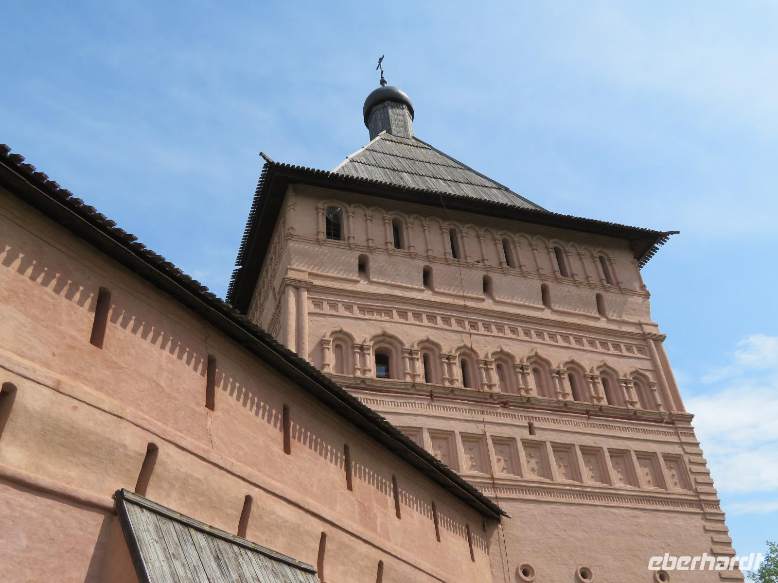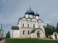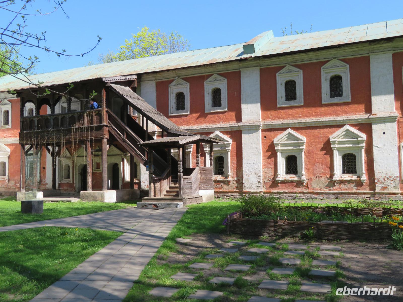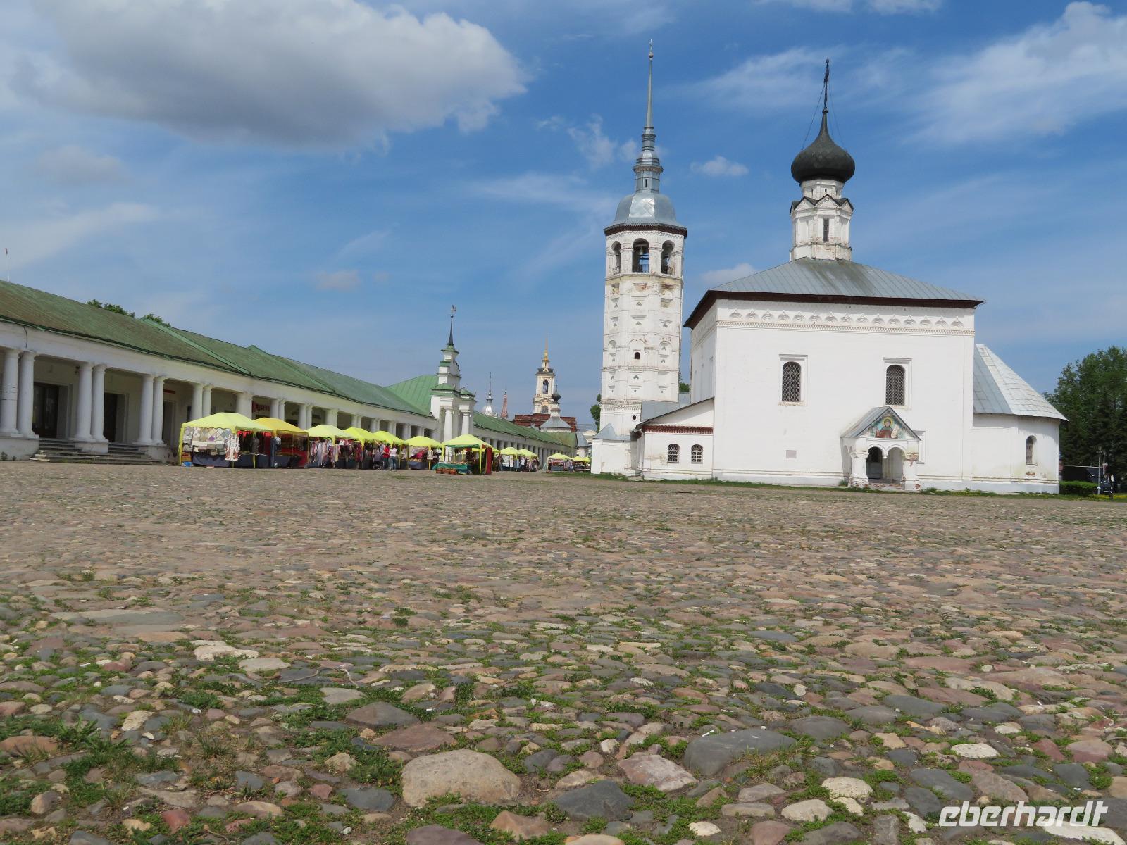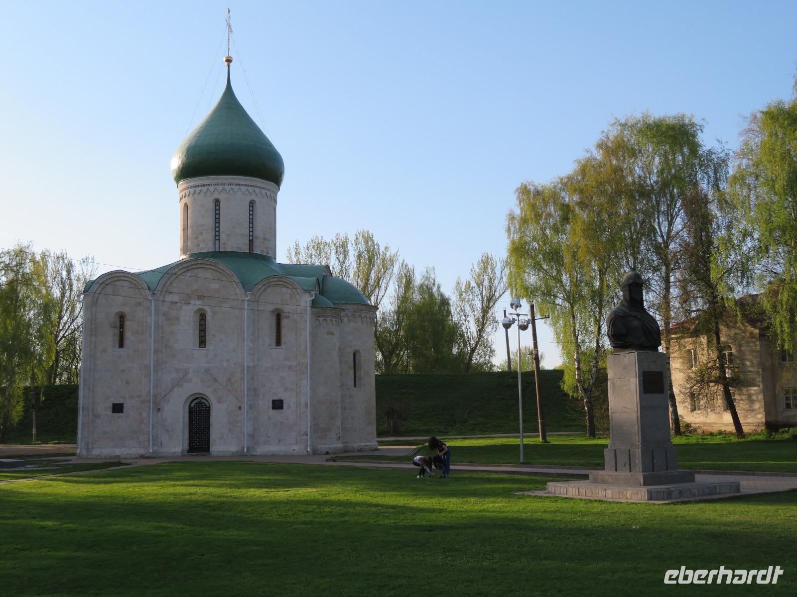 Nach einem reichlichen Frühstück starteten wir mit dem Bus zum Pokrov-Kloster, einem aktiven Frauenkloster, an den Windungen des Flüsschens Kamenka. Einst war dies auch Nonnensitz für abgewählte Frauen russischer Fürsten. Einige hundert Meter entfernt auf dem Hügel befindet sich das einstige Euthymos-Kloster. Das Museum birgt die Grabstätte des Fürsten Posharski, Anführer des russischen Volksheeres gegen polnische Okkupanten im zweiten Jahrzehnt des 17. Jahrhunderts. Vom Glockenturm hörten wir ein vortreffliches Glockenspiel. Über die jüngere Geschichte des Klosters erfuhren wir mehr in jenem Teil, der als Gefängnishof seit zaristischen Zeiten dienste. Ob allerdings die Legende vom Mönch aus der ersten Hälfte des 19. Jahrhunderts stimmt, der russische Geschichte bis zur Zarenermordung 1918 voraussagte, ist wohl eher russisches Reiseleiterlatein. Richtig ist jedoch, dass dies Kloster 1943 auch als Kriegsgefangenenlager für Stabsoffiziere der Wehrmacht diente und auch Generalfeldmarschall Paulus hier einige Wochen in Mönchszellen verbrachte. Vom Plateau an der Klostermauer ist immer ein schöner Blick auf das Pokrov-Kloster und die grüne Landschaft möglich. Dritter Besichtigungshöhepunkt war der hiesige Kreml mit den großen blauen Zwiebeltürmen der Mutter-Gottes-Geburts-Kathedrale.