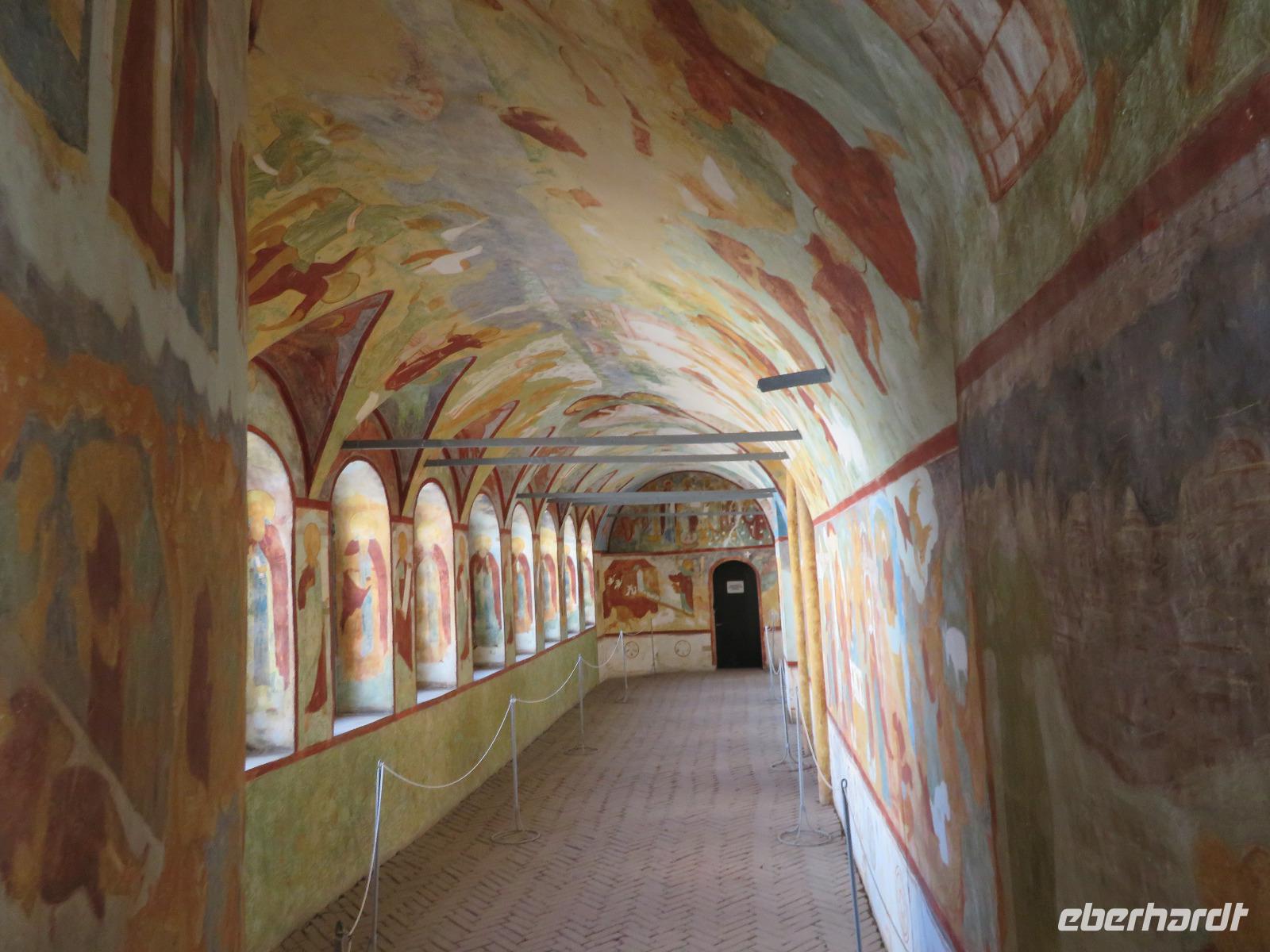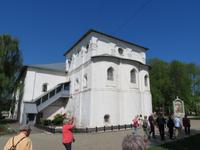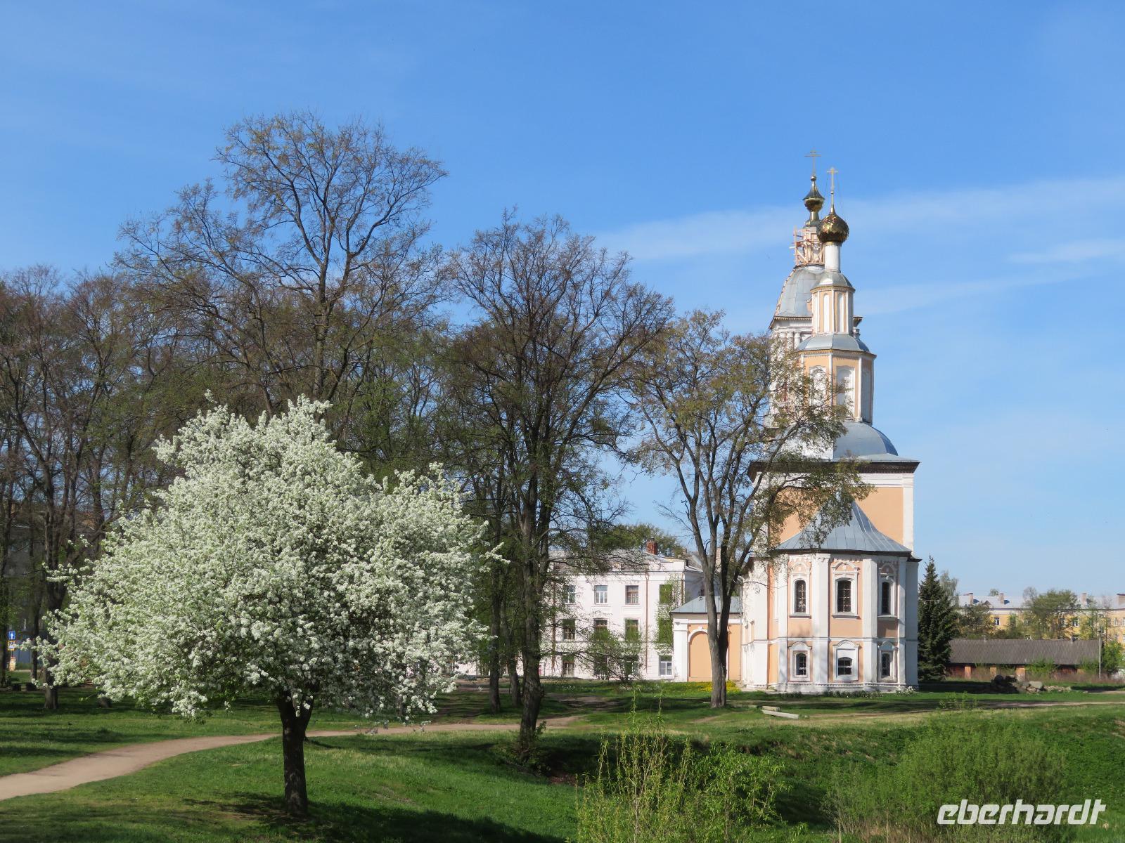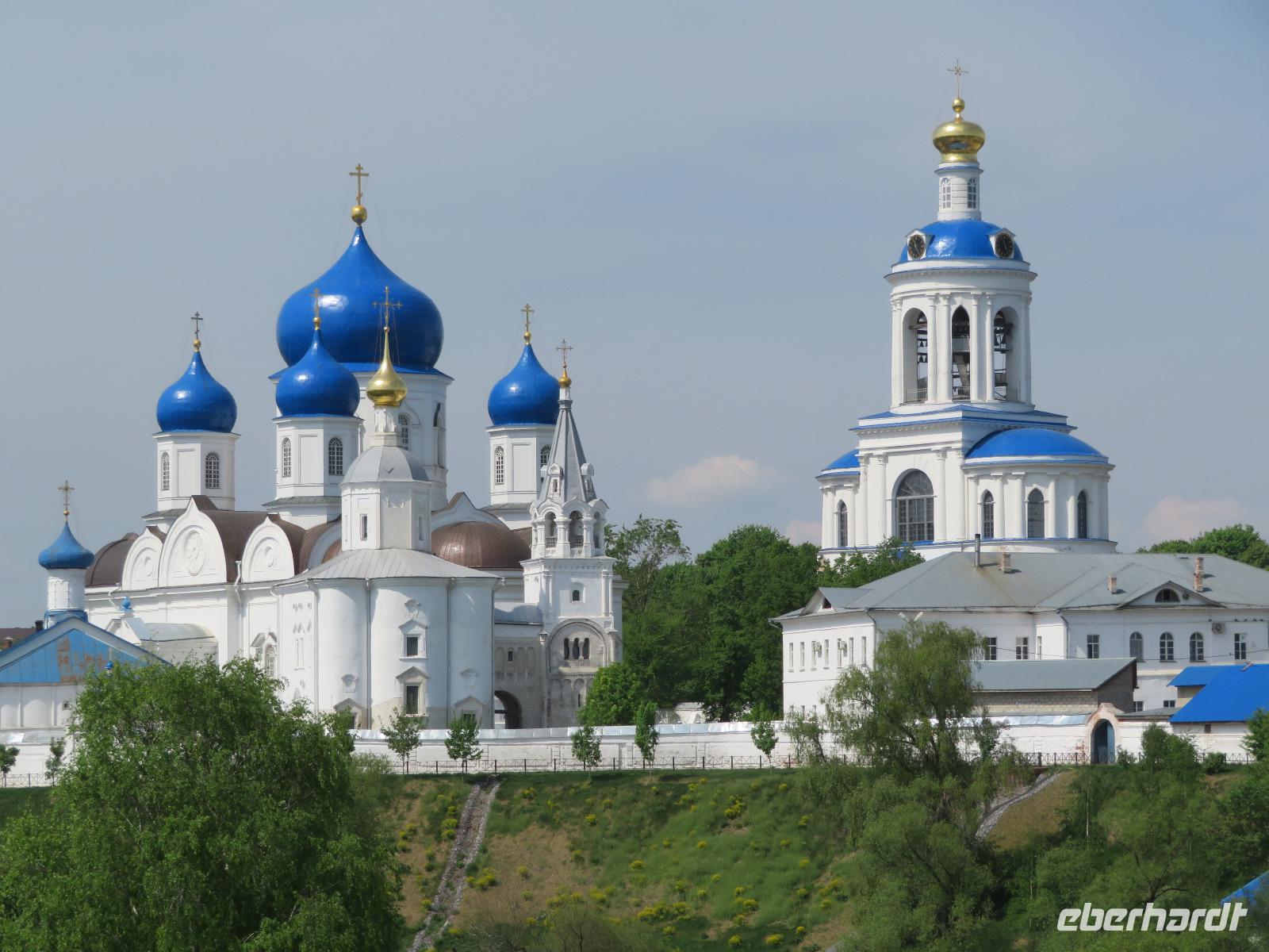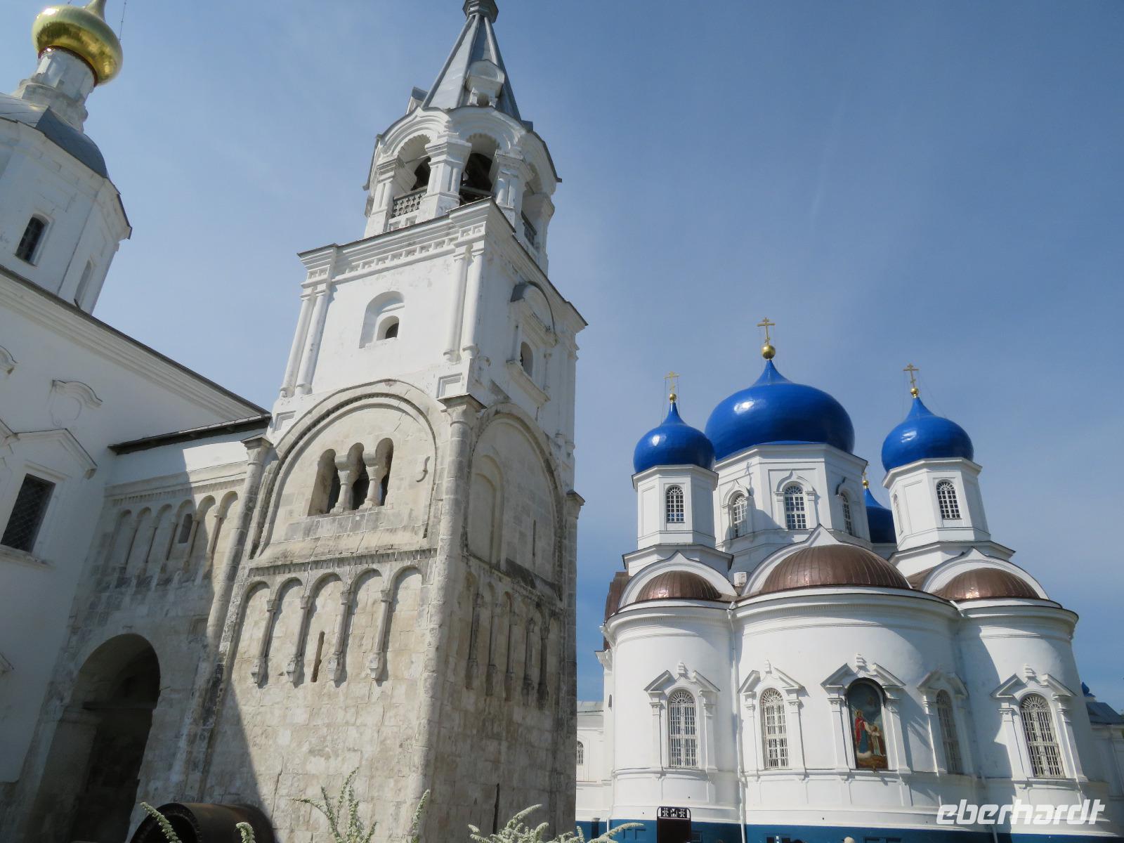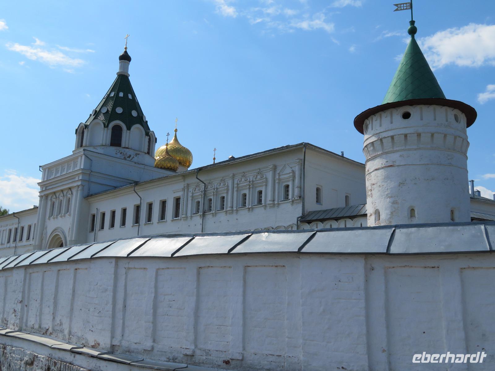 Nach einem reichlichen Frühstück starteten wir mit dem Bus zum Pokrov-Kloster, einem aktiven Frauenkloster, an den Windungen des Flüsschens Kamenka. Einst war dies auch Nonnensitz für abgewählte Frauen russischer Fürsten. Einige hundert Meter entfernt auf dem Hügel befindet sich das einstige Euthymos-Kloster. Das Museum birgt die Grabstätte des Fürsten Posharski, Anführer des russischen Volksheeres gegen polnische Okkupanten im zweiten Jahrzehnt des 17. Jahrhunderts. Vom Glockenturm hörten wir ein vortreffliches Glockenspiel. Über die jüngere Geschichte des Klosters erfuhren wir mehr in jenem Teil, der als Gefängnishof seit zaristischen Zeiten dienste. Ob allerdings die Legende vom Mönch aus der ersten Hälfte des 19. Jahrhunderts stimmt, der russische Geschichte bis zur Zarenermordung 1918 voraussagte, ist wohl eher russisches Reiseleiterlatein. Richtig ist jedoch, dass dies Kloster 1943 auch als Kriegsgefangenenlager für Stabsoffiziere der Wehrmacht diente und auch Generalfeldmarschall Paulus hier einige Wochen in Mönchszellen verbrachte. Vom Plateau an der Klostermauer ist immer ein schöner Blick auf das Pokrov-Kloster und die grüne Landschaft möglich. Dritter Besichtigungshöhepunkt war der hiesige Kreml mit den großen blauen Zwiebeltürmen der Mutter-Gottes-Geburts-Kathedrale.