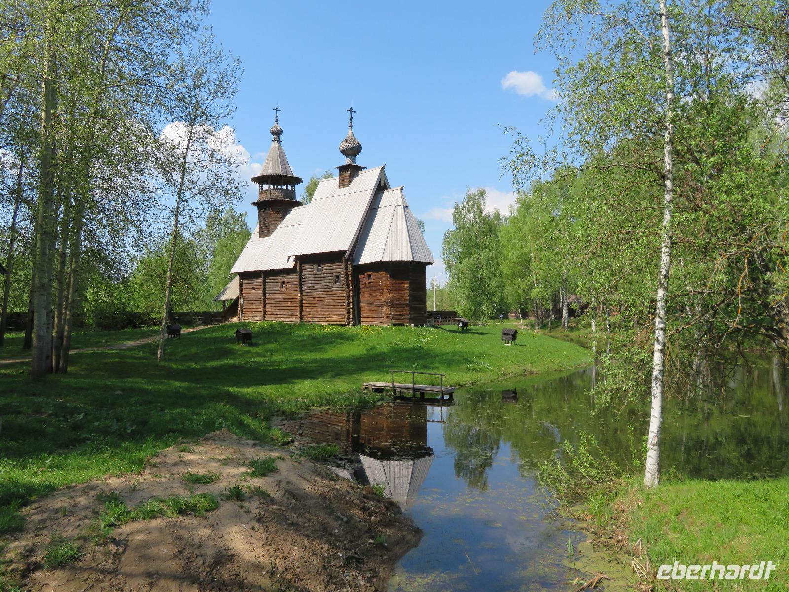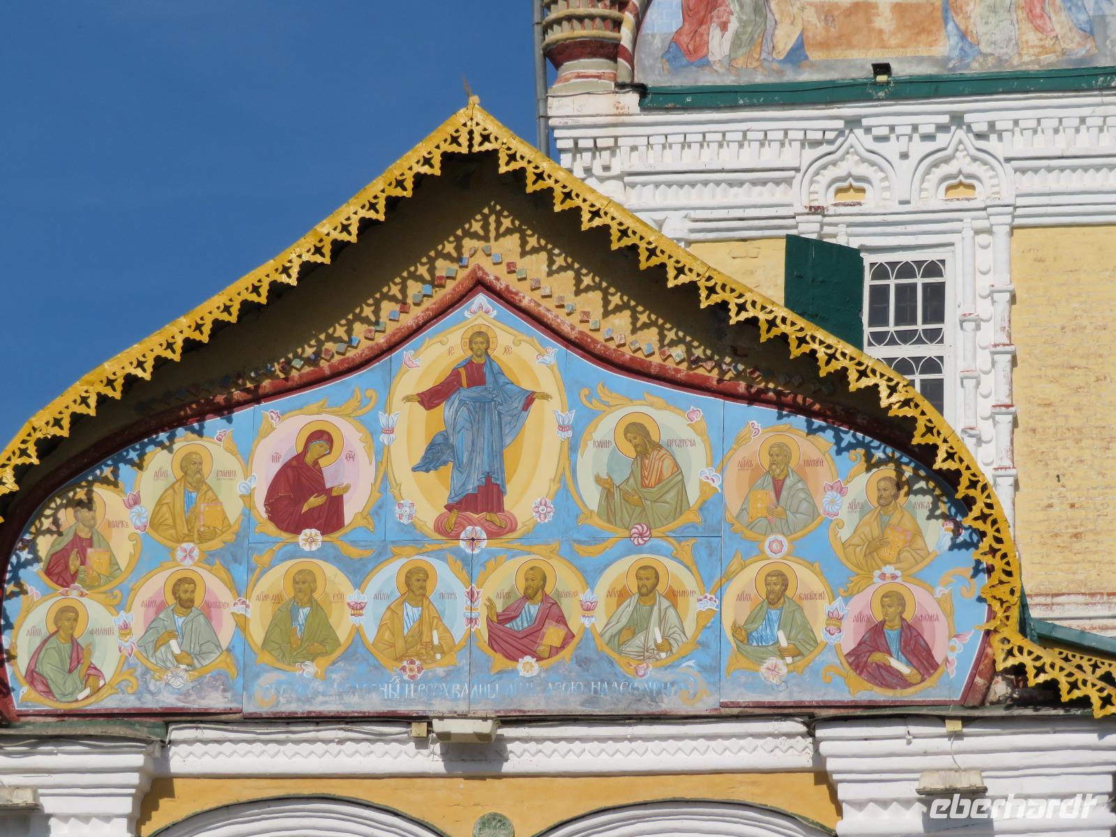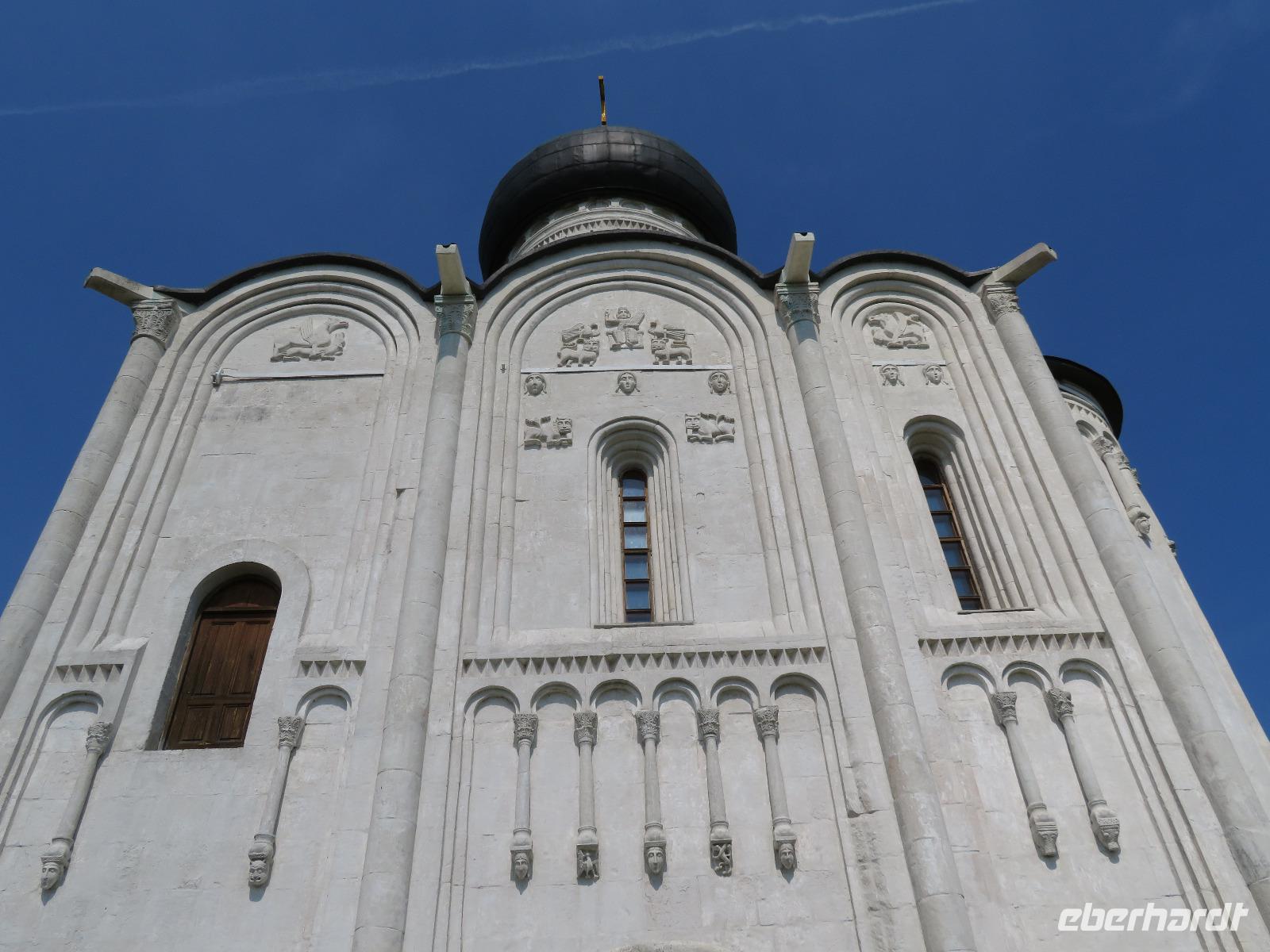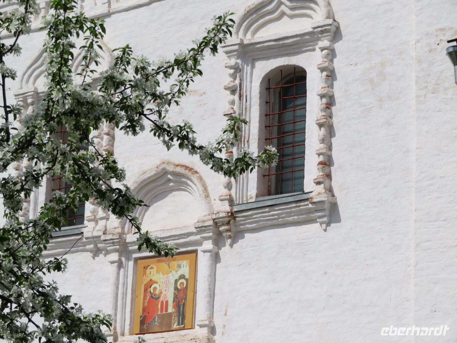Markant das tiefe Renovierungs-Blau der Bemalungen und die Eingangstür der Kathedrale. Im Kreml befindet sich auch eine Ausstellung bedeutender russischer Ikonen - wir erfuhren mehr über den im 15. Jahrhundert liegenden Höhepunkt russischer Ikonenmalerei. Nach drei intensiven Besichtigungen war noch Zeit für einem kurzen Ausflug in das vier Kilometer von Susdal entfernt liegende Kidekscha mit seiner weißen Kirche Boris und Gleb aus dem Jahre 1152 - der ältesten Kirche im zentralen Teil Russlands.
