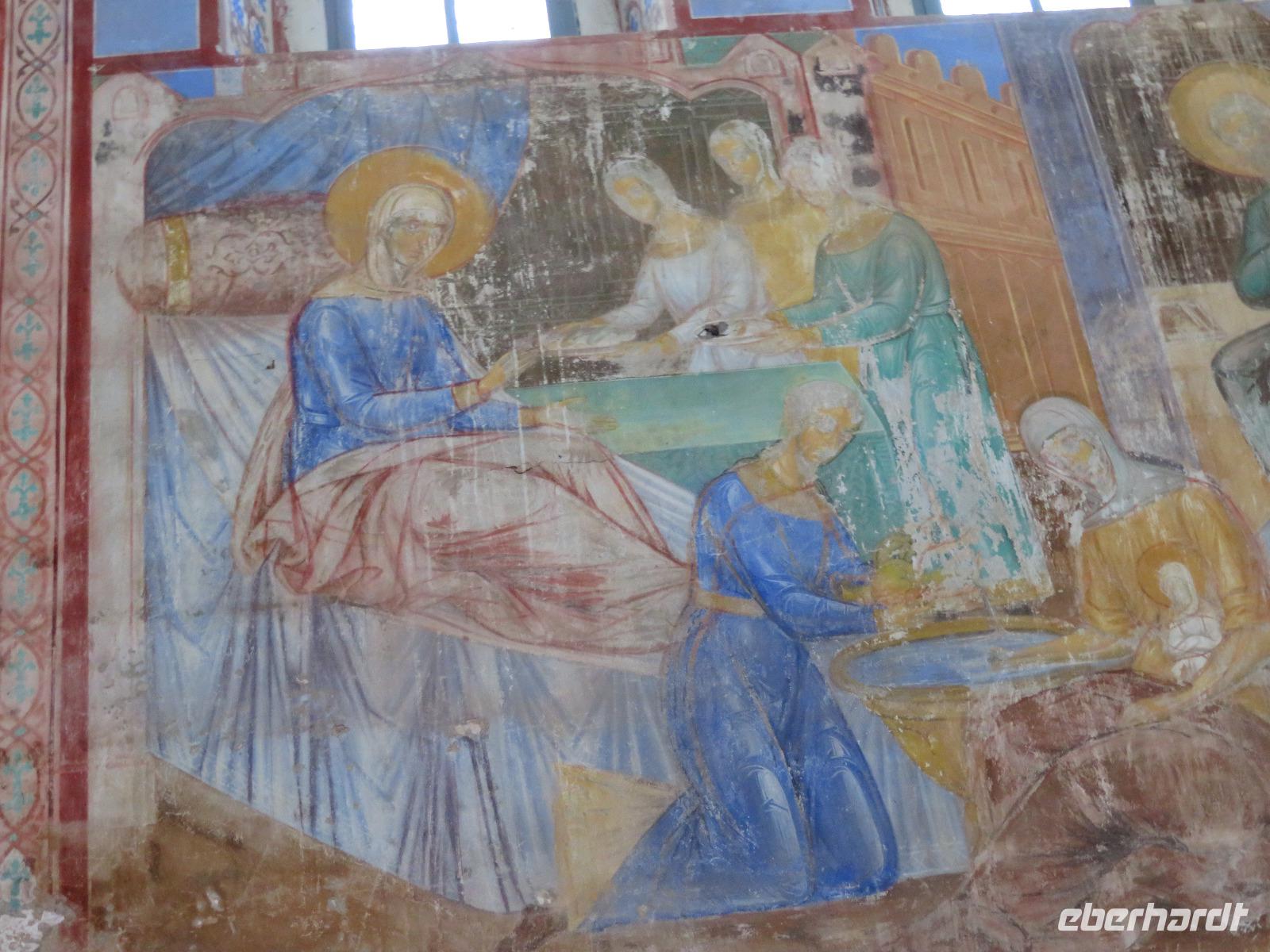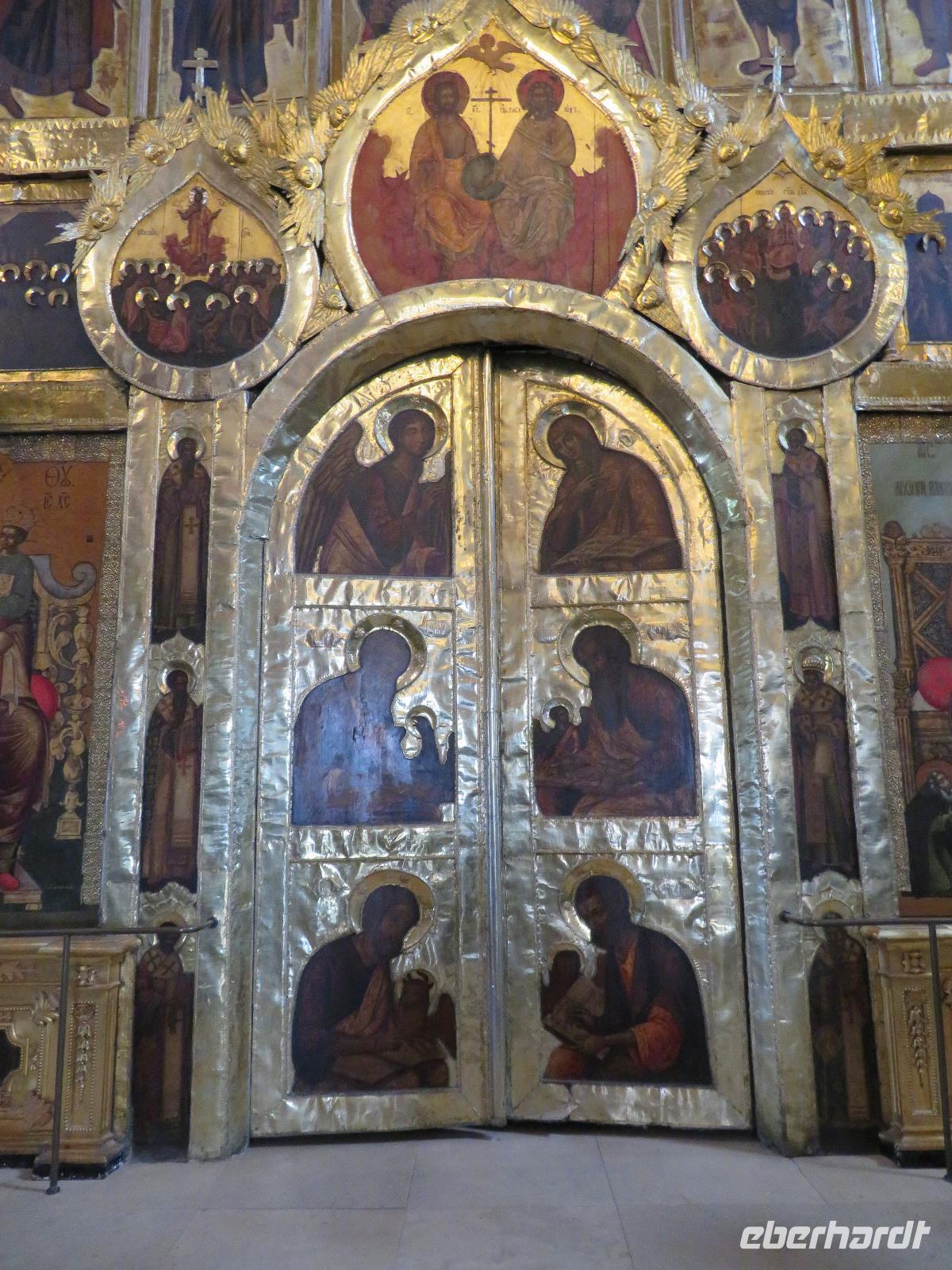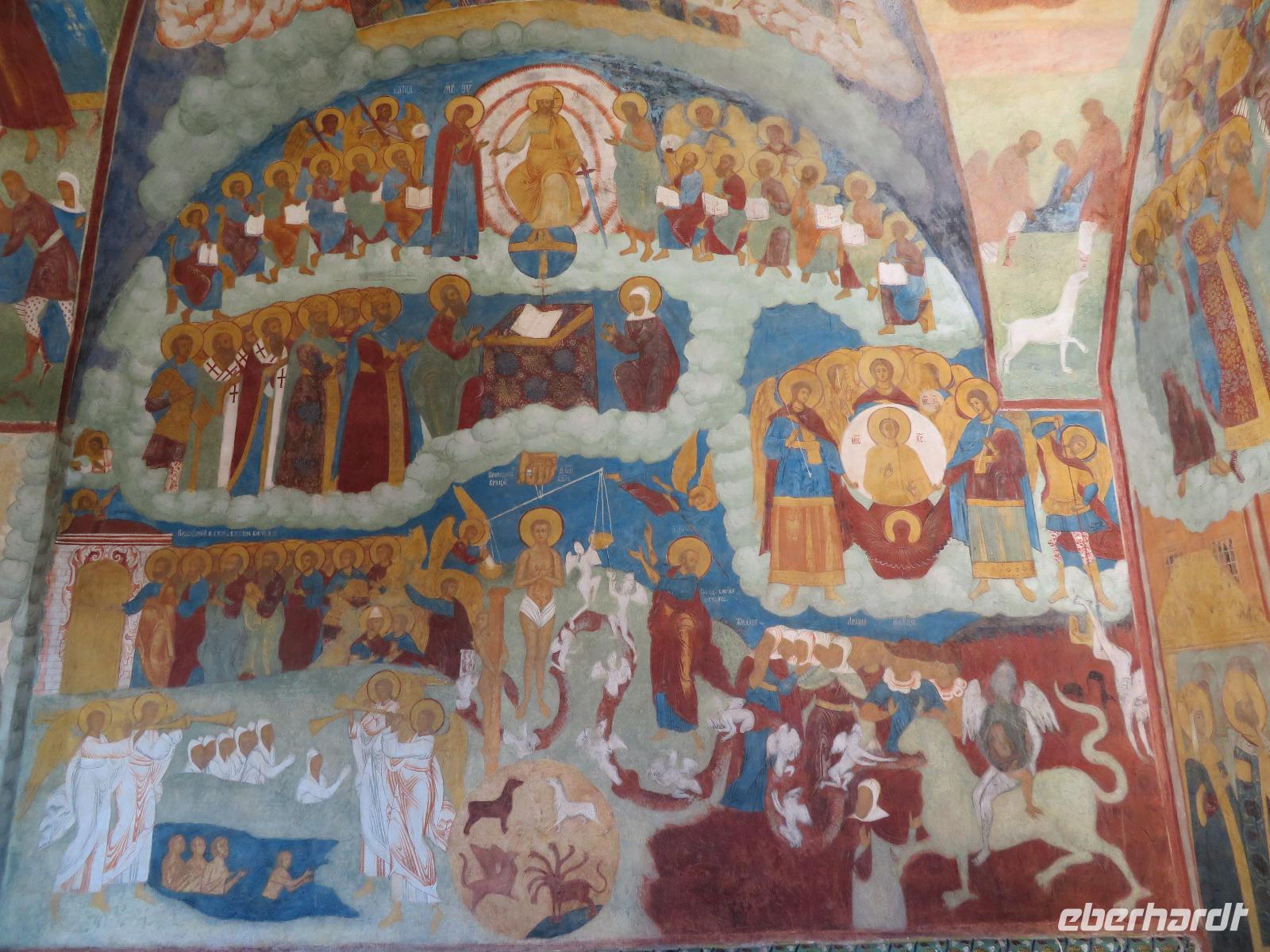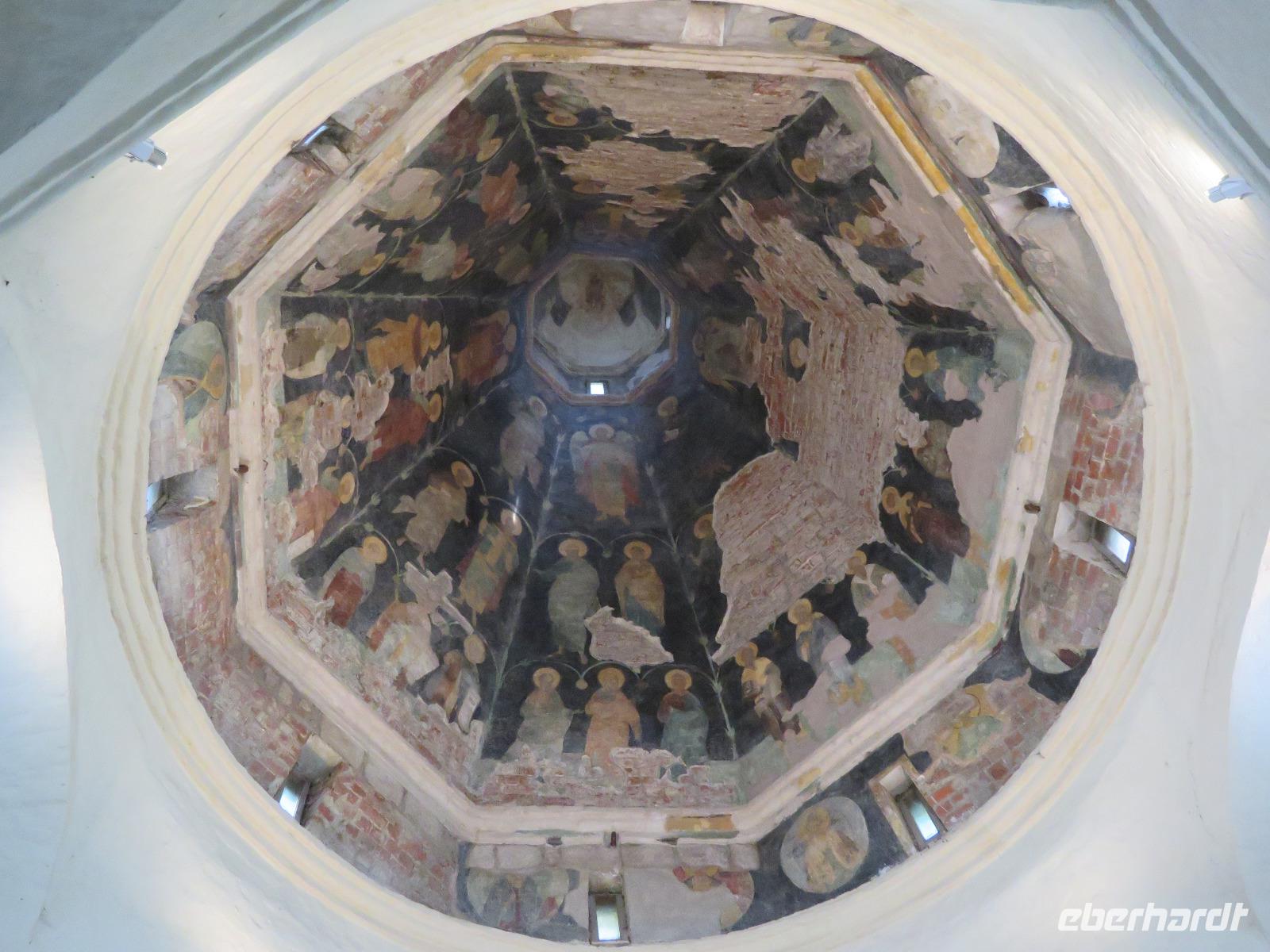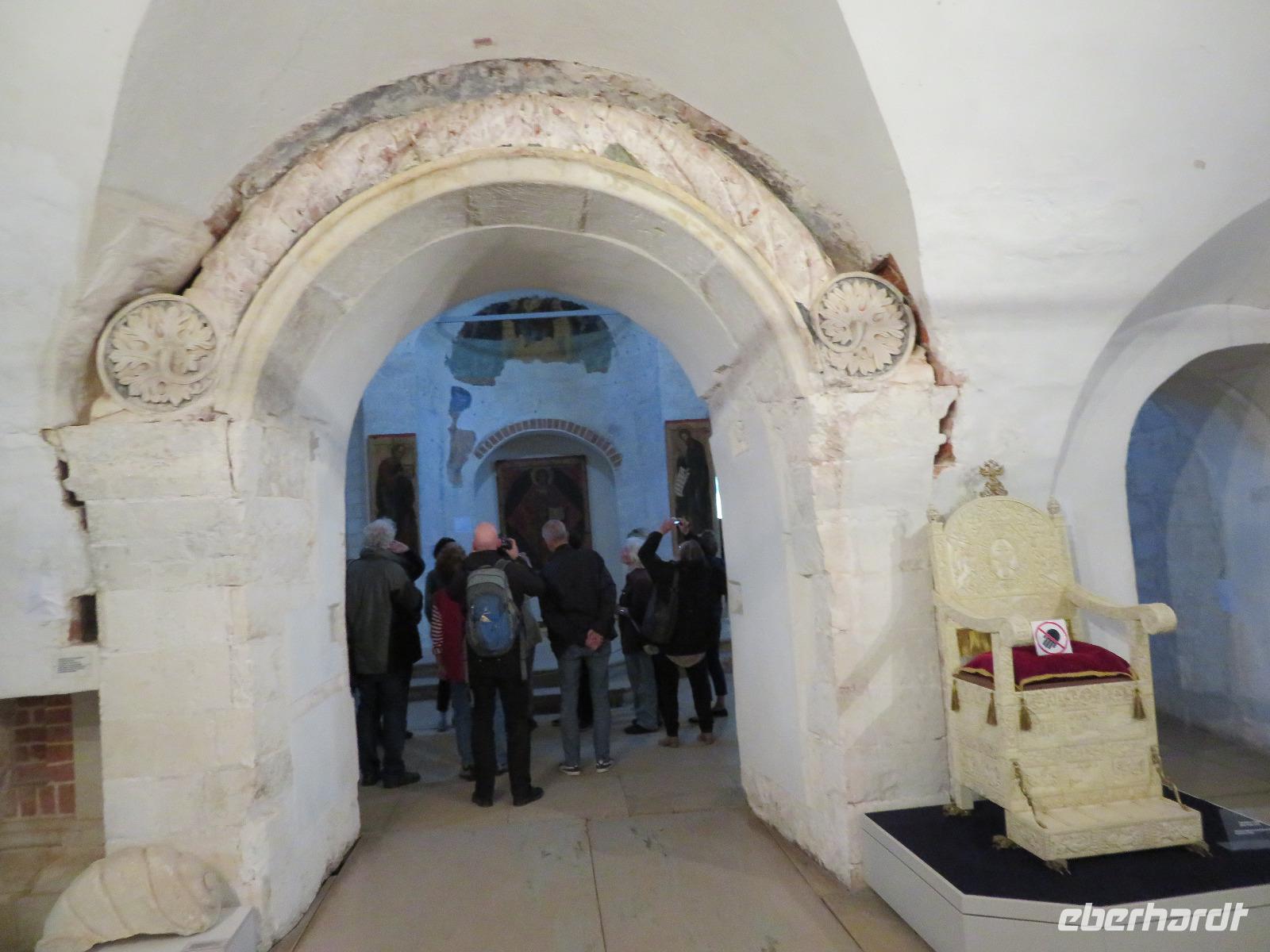 Markant das tiefe Renovierungs-Blau der Bemalungen und die Eingangstür der Kathedrale. Im Kreml befindet sich auch eine Ausstellung bedeutender russischer Ikonen - wir erfuhren mehr über den im 15. Jahrhundert liegenden Höhepunkt russischer Ikonenmalerei. Nach drei intensiven Besichtigungen war noch Zeit für einem kurzen Ausflug in das vier Kilometer von Susdal entfernt liegende Kidekscha mit seiner weißen Kirche Boris und Gleb aus dem Jahre 1152 - der ältesten Kirche im zentralen Teil Russlands.
