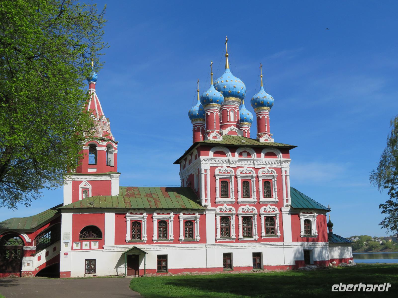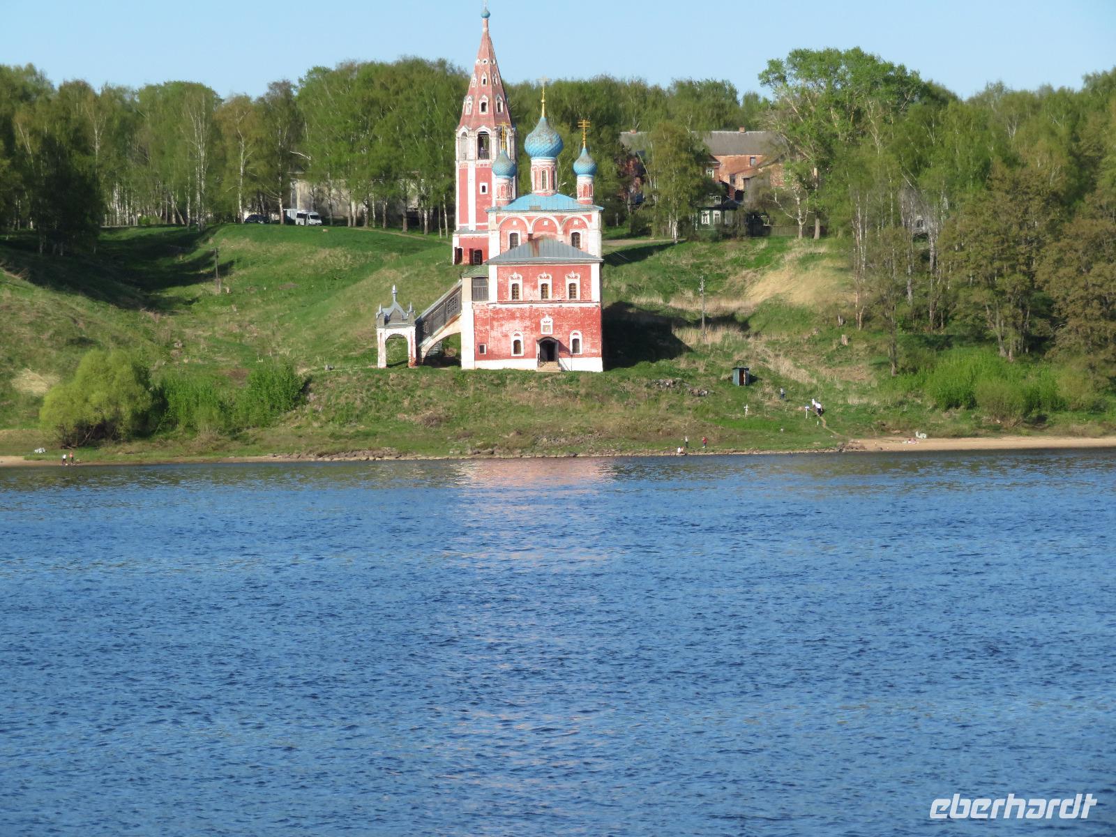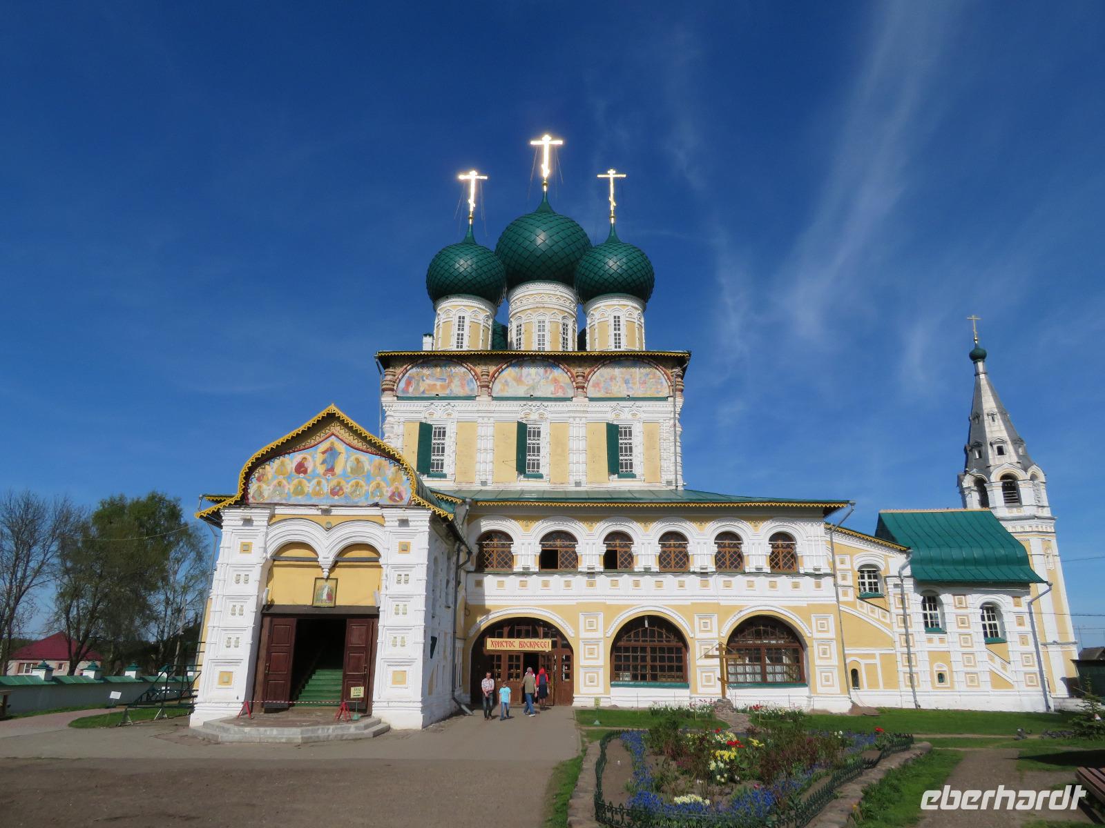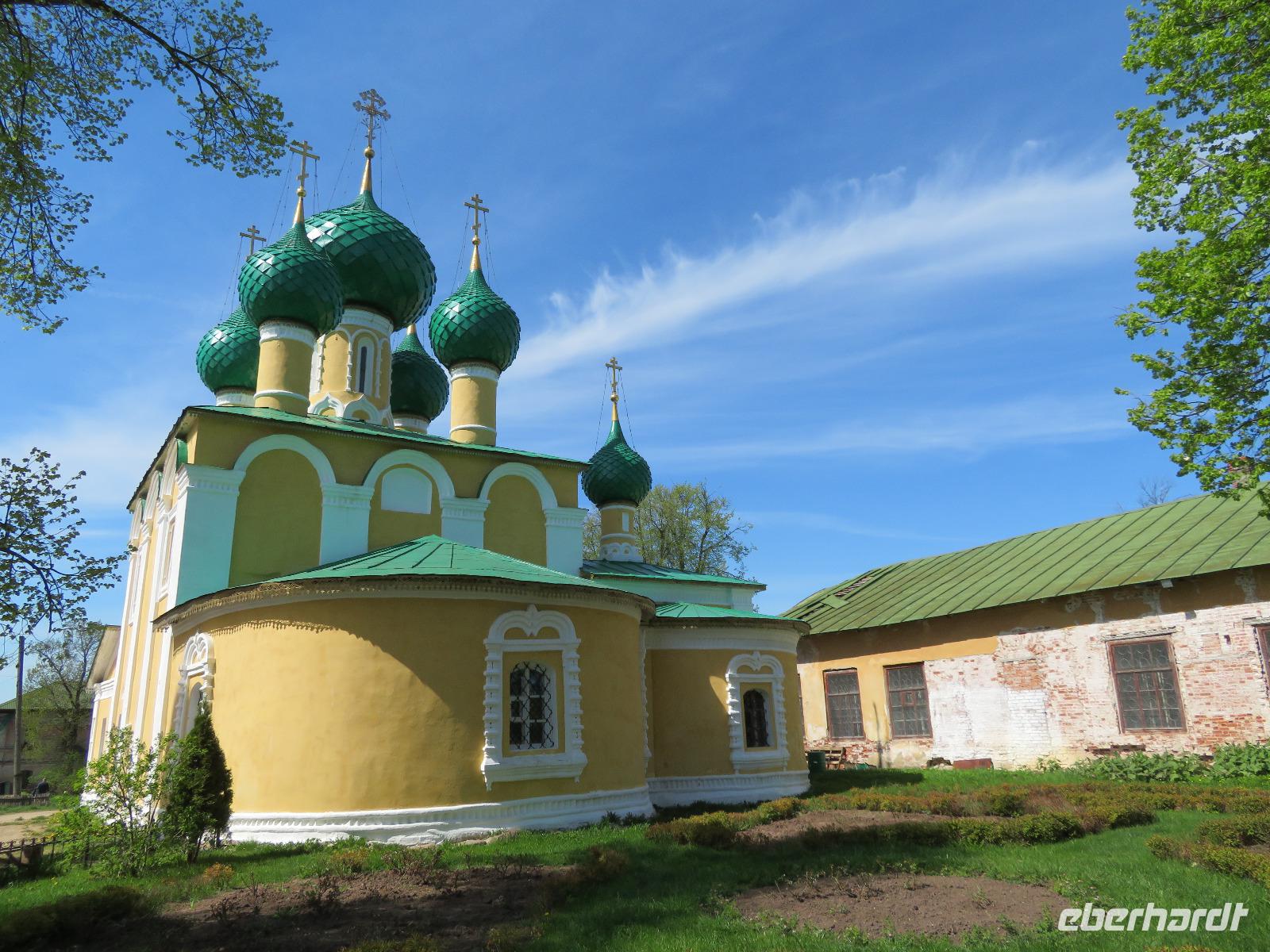 Vom Hotel Moskwa direkt an der Wolga genossen wir zunächst einen morgendlichen Blick über den Strom. Dann nutzten wir doch den Bus, um an den Gründungsort der einstigen Festungsanlage zu gelangen. Die einstige Kremlmauer wurde bereits vor Langem beseitigt und so wirken die Reste eines Fürstenpalastes und die Demetriuskathedrale recht einsam im Park am Wolgaufer. Bedeutung erlangte der Ort, weil einst hier der Zarewitsch Dimitri zu Tode kam: Mord - Unfall - natürlicher Tod eines Achtjährigen? War Zar Boris Gudunow darin verwickelt? Mit dem Bus besichtigten wir dann zwei wieder aktivierte Klöster der Stadt Uglitsch und wurden noch einmal daran erinnert, wie die bauliche Hülle vieler Klöster in Sowjetzeiten verwendet wurde und die Substanz verfiel.