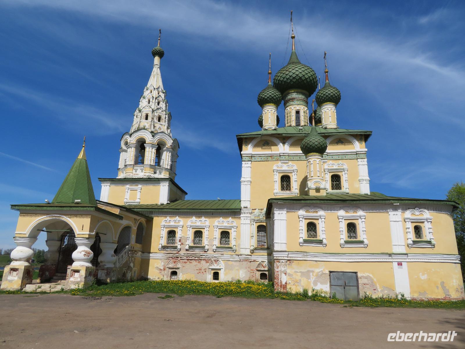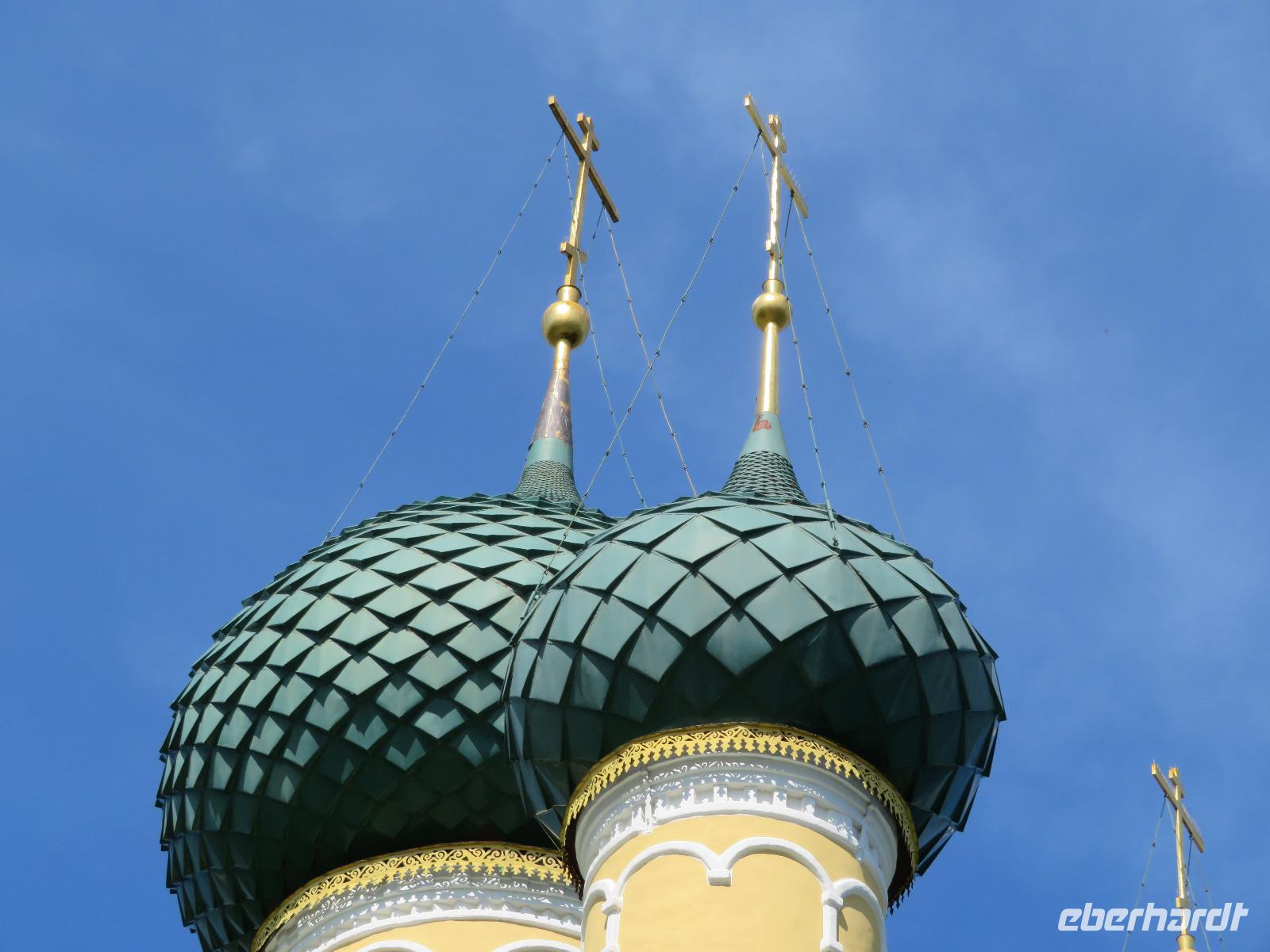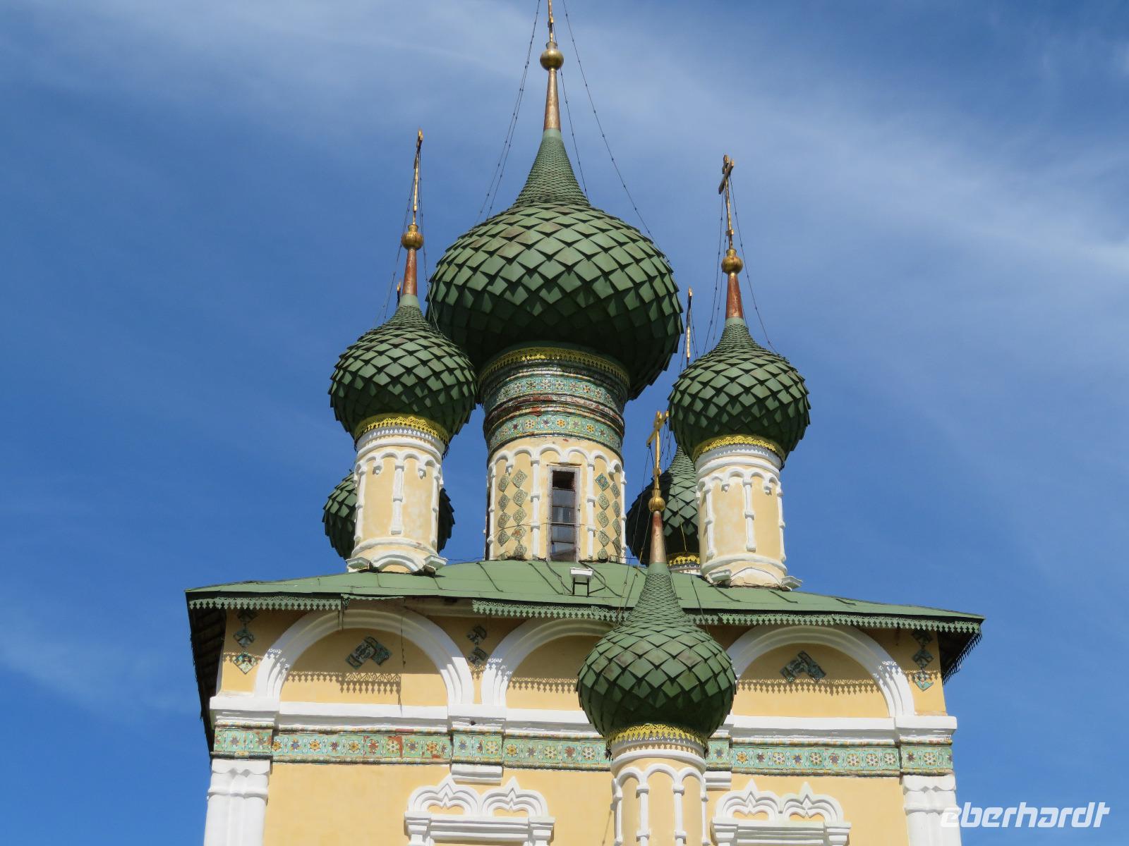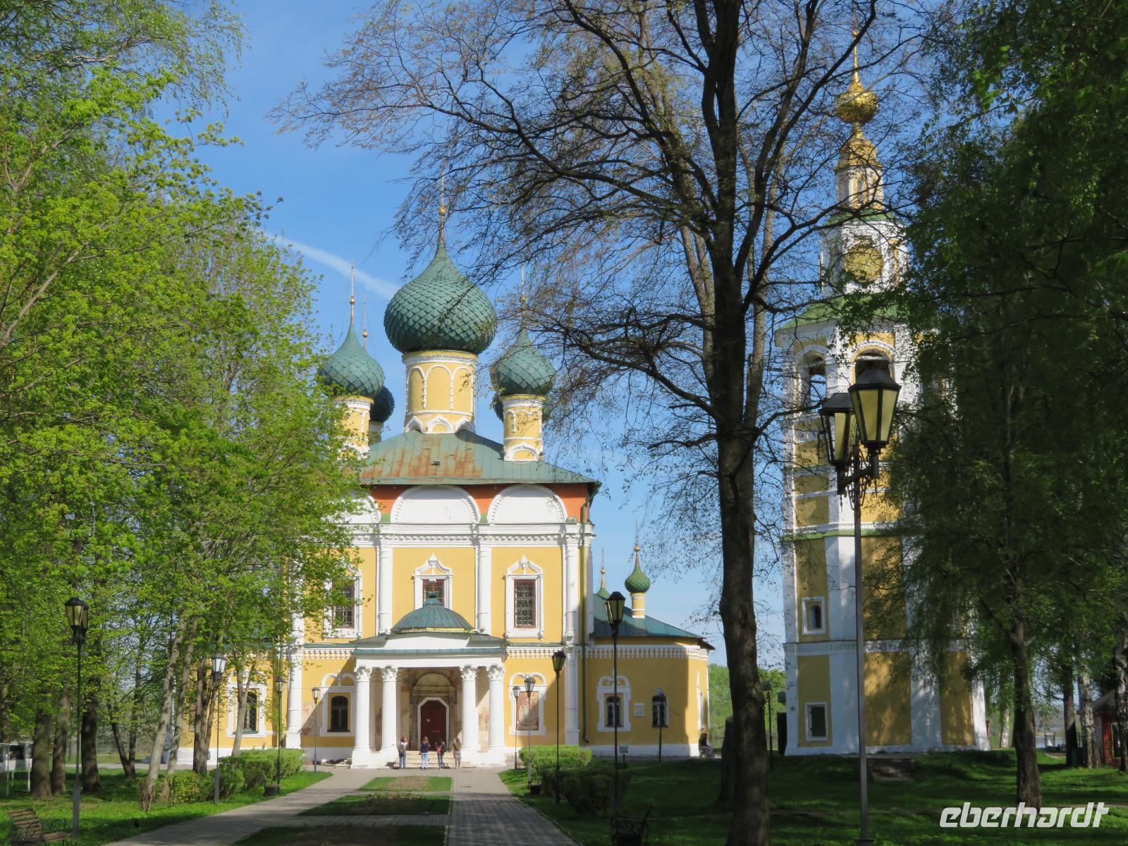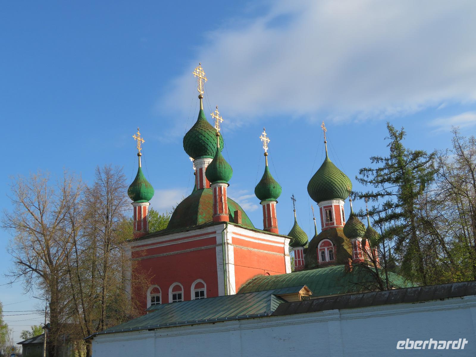 Vom Hotel Moskwa direkt an der Wolga genossen wir zunächst einen morgendlichen Blick über den Strom. Dann nutzten wir doch den Bus, um an den Gründungsort der einstigen Festungsanlage zu gelangen. Die einstige Kremlmauer wurde bereits vor Langem beseitigt und so wirken die Reste eines Fürstenpalastes und die Demetriuskathedrale recht einsam im Park am Wolgaufer. Bedeutung erlangte der Ort, weil einst hier der Zarewitsch Dimitri zu Tode kam: Mord - Unfall - natürlicher Tod eines Achtjährigen? War Zar Boris Gudunow darin verwickelt? Mit dem Bus besichtigten wir dann zwei wieder aktivierte Klöster der Stadt Uglitsch und wurden noch einmal daran erinnert, wie die bauliche Hülle vieler Klöster in Sowjetzeiten verwendet wurde und die Substanz verfiel.