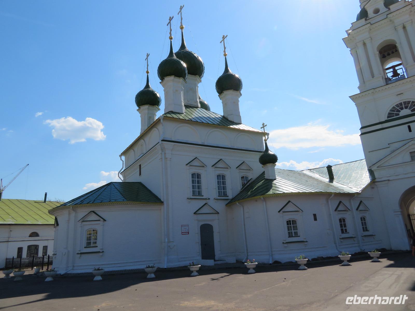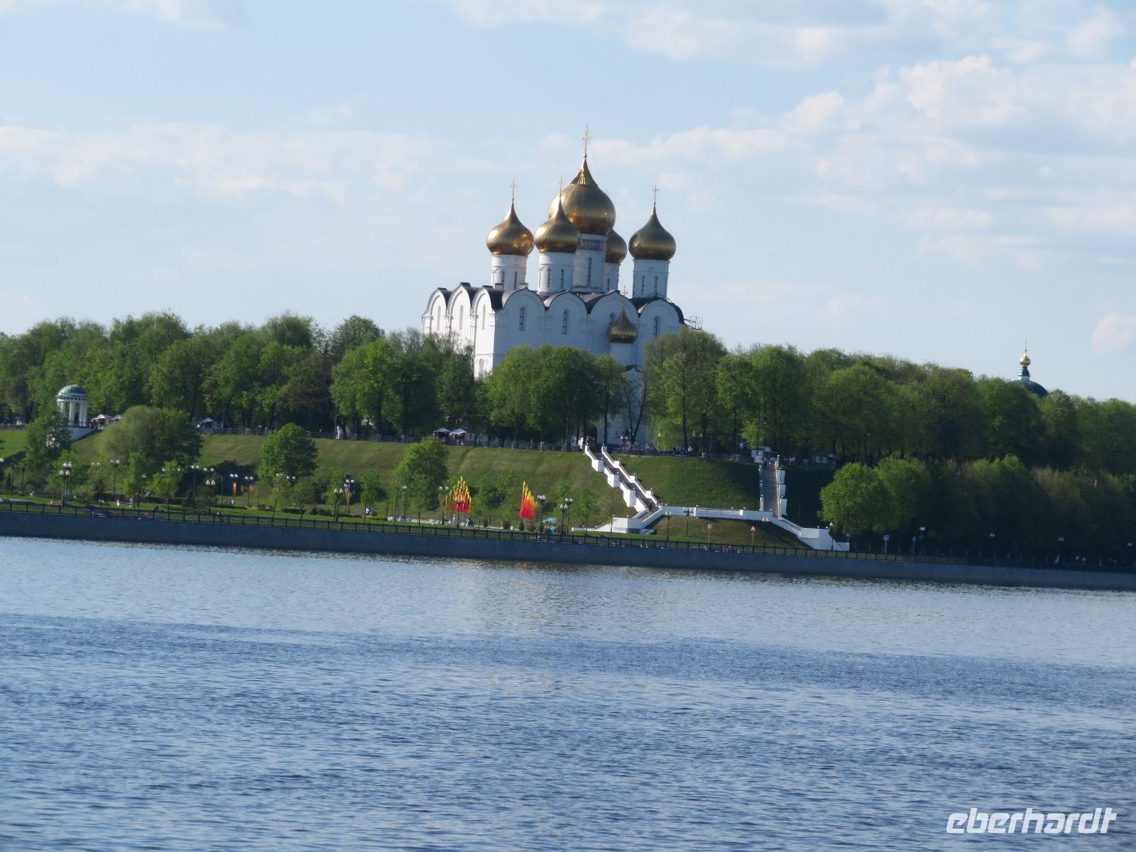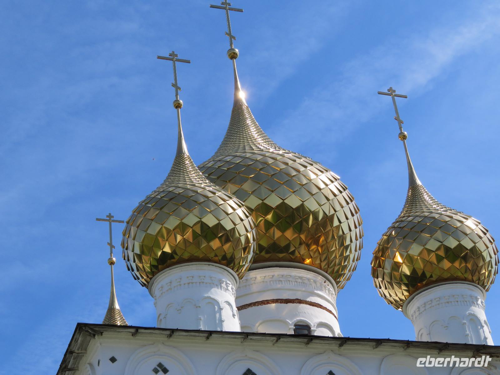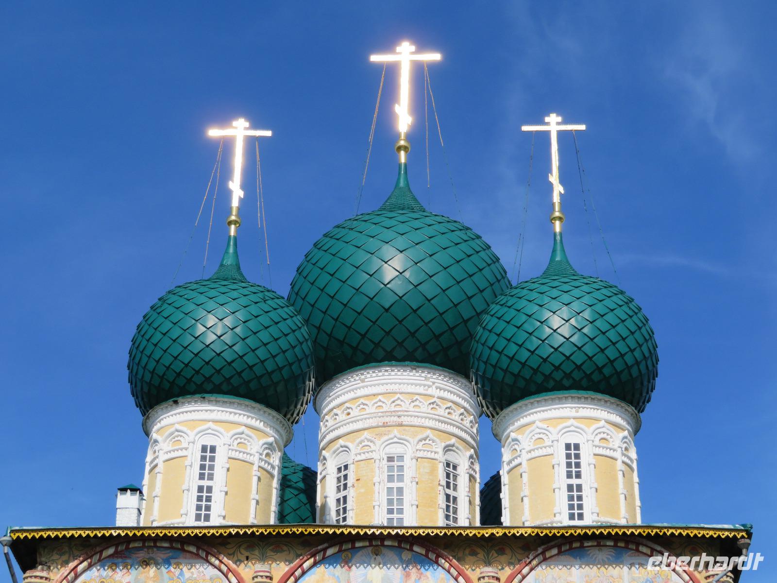 Vom Hotel Moskwa direkt an der Wolga genossen wir zunächst einen morgendlichen Blick über den Strom. Dann nutzten wir doch den Bus, um an den Gründungsort der einstigen Festungsanlage zu gelangen. Die einstige Kremlmauer wurde bereits vor Langem beseitigt und so wirken die Reste eines Fürstenpalastes und die Demetriuskathedrale recht einsam im Park am Wolgaufer. Bedeutung erlangte der Ort, weil einst hier der Zarewitsch Dimitri zu Tode kam: Mord - Unfall - natürlicher Tod eines Achtjährigen? War Zar Boris Gudunow darin verwickelt? Mit dem Bus besichtigten wir dann zwei wieder aktivierte Klöster der Stadt Uglitsch und wurden noch einmal daran erinnert, wie die bauliche Hülle vieler Klöster in Sowjetzeiten verwendet wurde und die Substanz verfiel.
