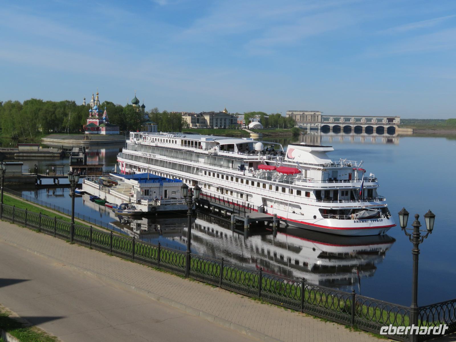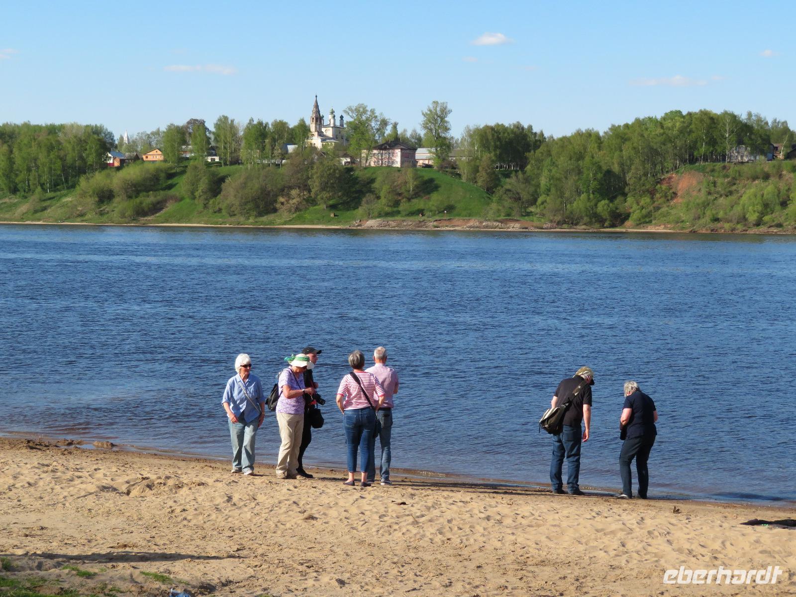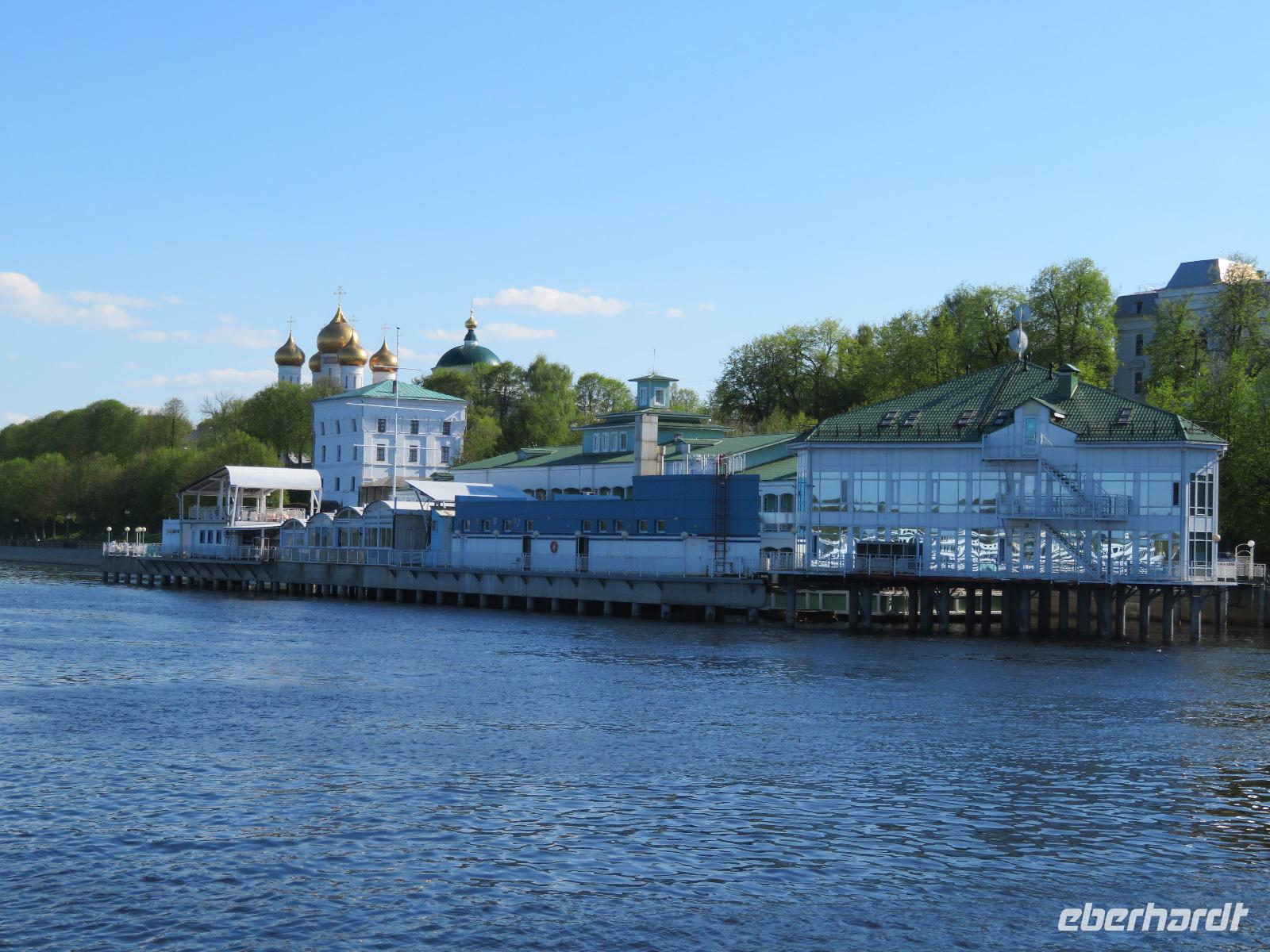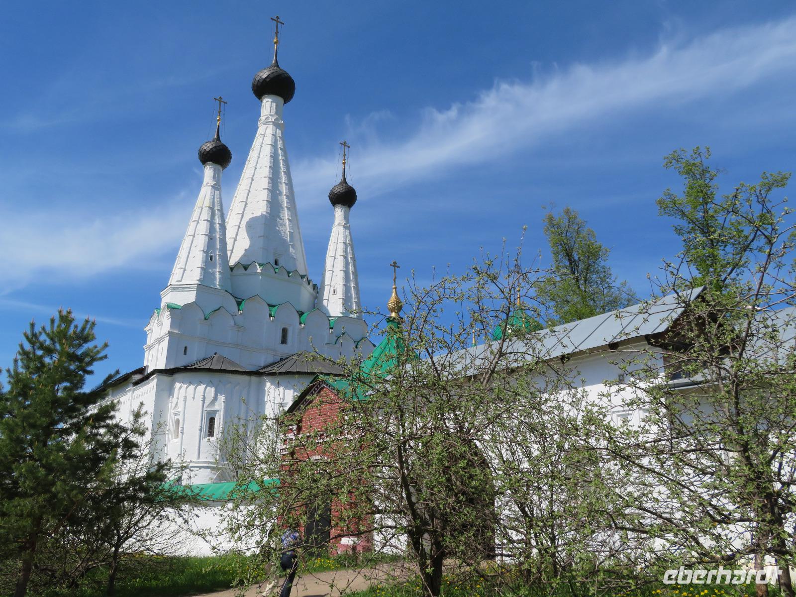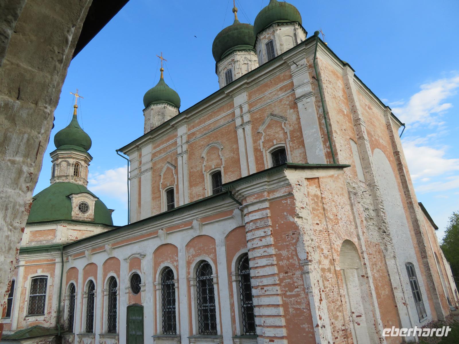 Vom Hotel Moskwa direkt an der Wolga genossen wir zunächst einen morgendlichen Blick über den Strom. Dann nutzten wir doch den Bus, um an den Gründungsort der einstigen Festungsanlage zu gelangen. Die einstige Kremlmauer wurde bereits vor Langem beseitigt und so wirken die Reste eines Fürstenpalastes und die Demetriuskathedrale recht einsam im Park am Wolgaufer. Bedeutung erlangte der Ort, weil einst hier der Zarewitsch Dimitri zu Tode kam: Mord - Unfall - natürlicher Tod eines Achtjährigen? War Zar Boris Gudunow darin verwickelt? Mit dem Bus besichtigten wir dann zwei wieder aktivierte Klöster der Stadt Uglitsch und wurden noch einmal daran erinnert, wie die bauliche Hülle vieler Klöster in Sowjetzeiten verwendet wurde und die Substanz verfiel.