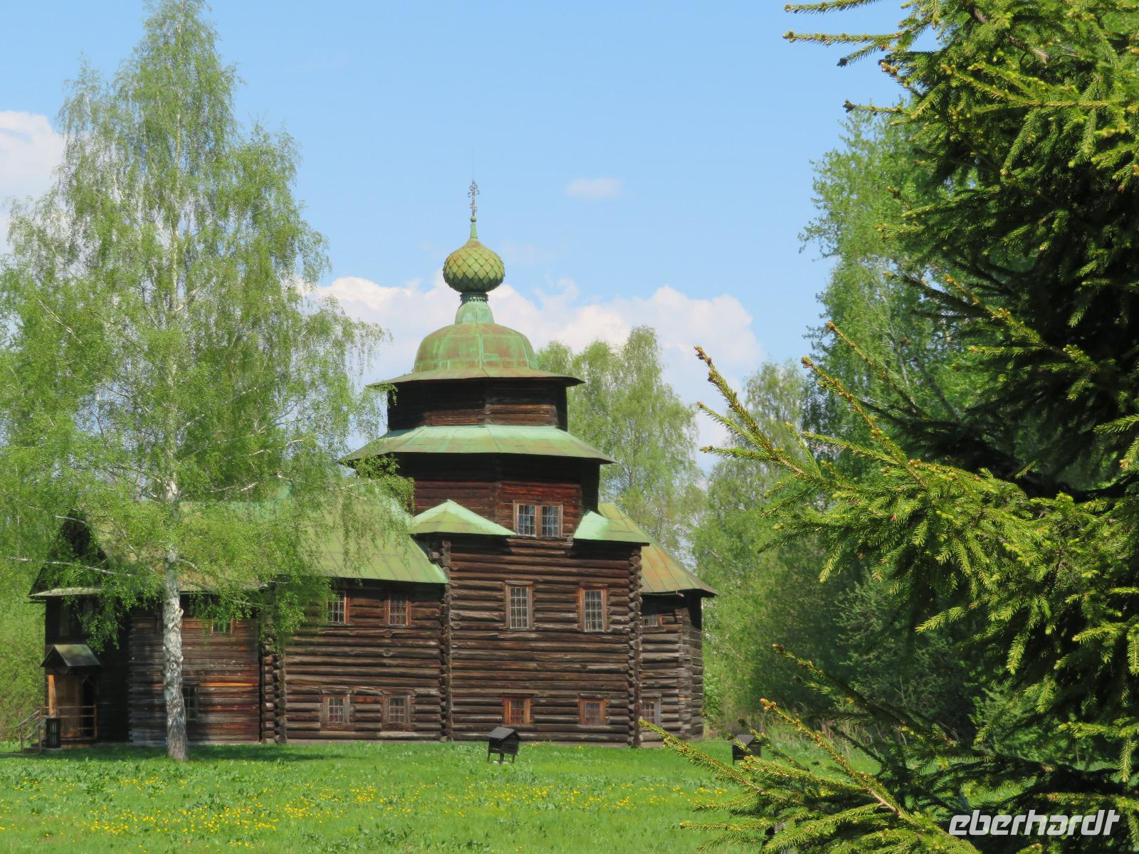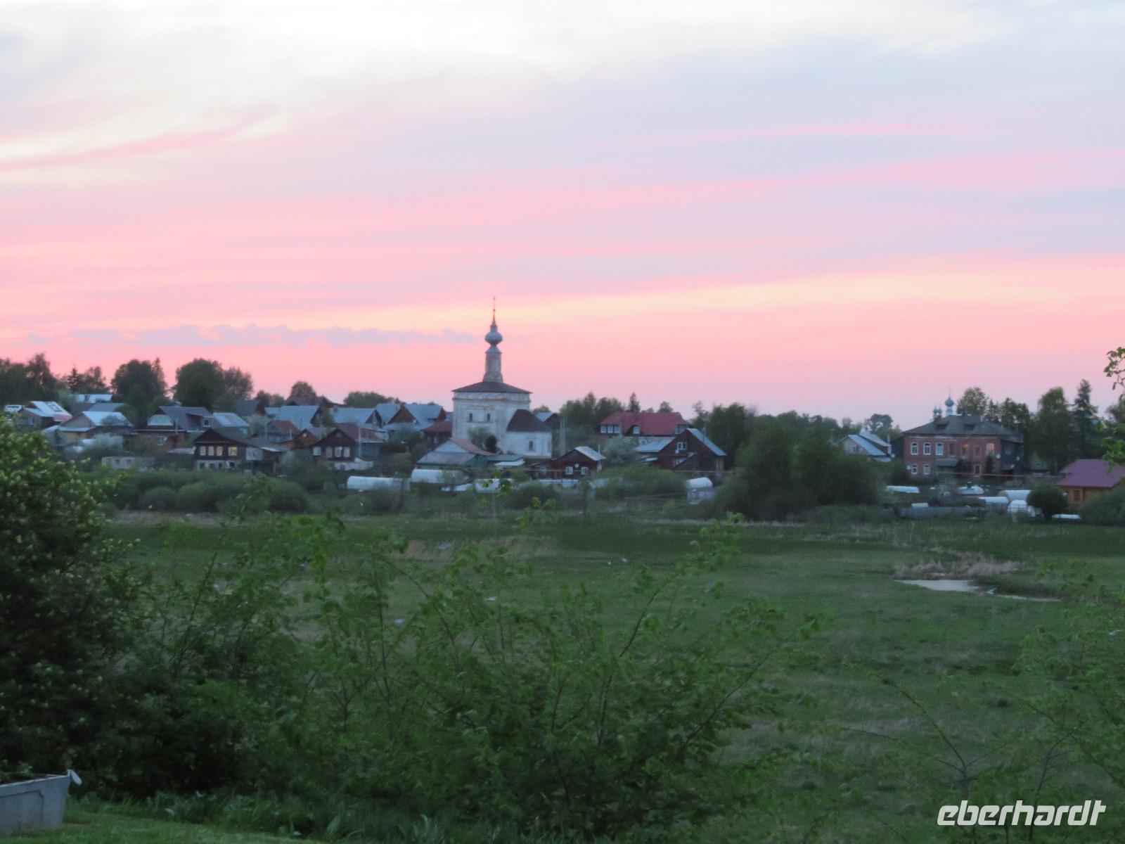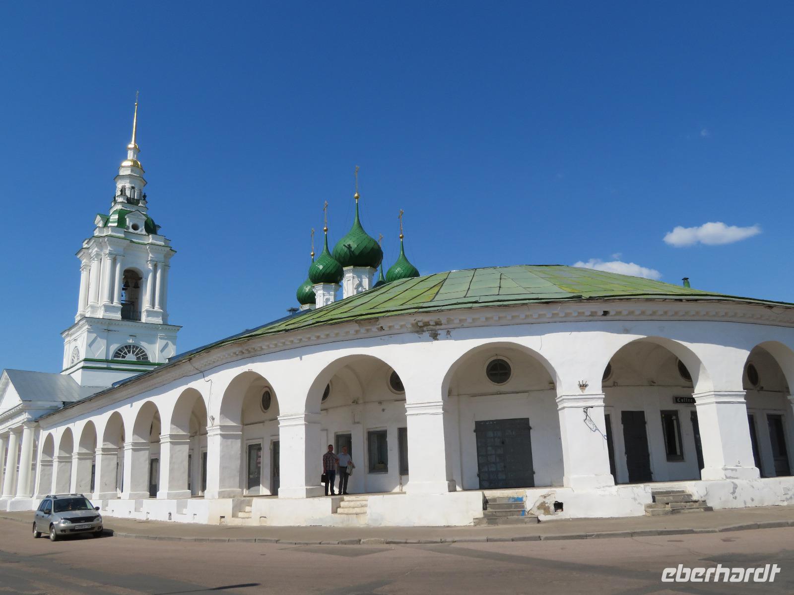 Wir starteten zu gutbürgerlicher Touristenzeit - und das erwieß sich als zu spät - in Jaroslawl und erreichten am späten Vormittag Kostrjoma. Unser erster Bummel führte uns in das Ipatios-Kloster auf einer Landzunge neben der Wolga. Dieses Kloster steht in engster Beziehung zur Dynastie der Romanows: der erste Zar aus dem Hause der Romanows verbrachte hier im Kloster Jugendjahre. An der Westseite des Klosters befindet sich das Museum der Holzarchitektur, einer Ansammlung verschiedener Bauernhäuser, kleiner Kirche, Mühle - vergleichbar mit zahlreichen ähnlichen in Russland und anderen osteuropäischen Staaten („Skansen"). Die Einbindung der hier platzierten Häuser in eine schattige Landschaft mit Wasserläufen und Teichen unterscheidet das Museum in Kostrjoma jedoch sehr angenehm von anderen. Im Zentrum der alten Kaufmannsstadt Kostrjoma befinden sich die wohl größten erhaltenen, klassizistischen Handelsreihen einer russischen Stadt. Leider entfaltet sich in diesem Ensemble kein Leben. Unweit davon ein Lenindenkmal, das auf dem Sockel eines nicht fertig gestellten Zarendenkmals errichtet wurde. Mit zügiger Fahrt erreichten wir das kleine Örtchen Pljos in den Hügeln an der Wolga. Tolle Teestunde mit hervorragendem Gebäck und Blick auf die Hügellandschaft an der Wolga vom Restaurant und Cafe'"Chastny Visit". Ruhe, Birkenwäldchen, einige Kirchlein und manch farbiges Holzhaus leuchteten in der Sonne. Dies beeindruckte auch den Maler Lewitan, der hier drei Jahre im Sommer weilte und zahlreiche Gemälde schuf. Wieder in rascher Fahrt, aber doch zwei Stunden dauernd, über die Stadt Iwanovo erreichten wir Susdal zur schon fortgeschrittenen Abendessenszeit. Die Blicke gingen hinüber zum beleuchteten Kreml mit seinen blauen Kuppeln. Unser Hotel Sokol am zentralen Platz und der Lenin-Straße empfing uns auch noch nach 22 Uhr. Das Hotel befindet sich nur vierhundert Meter vom Kreml entfernt - das lud ein zu einem Morgenspaziergang am kommenden Tag.