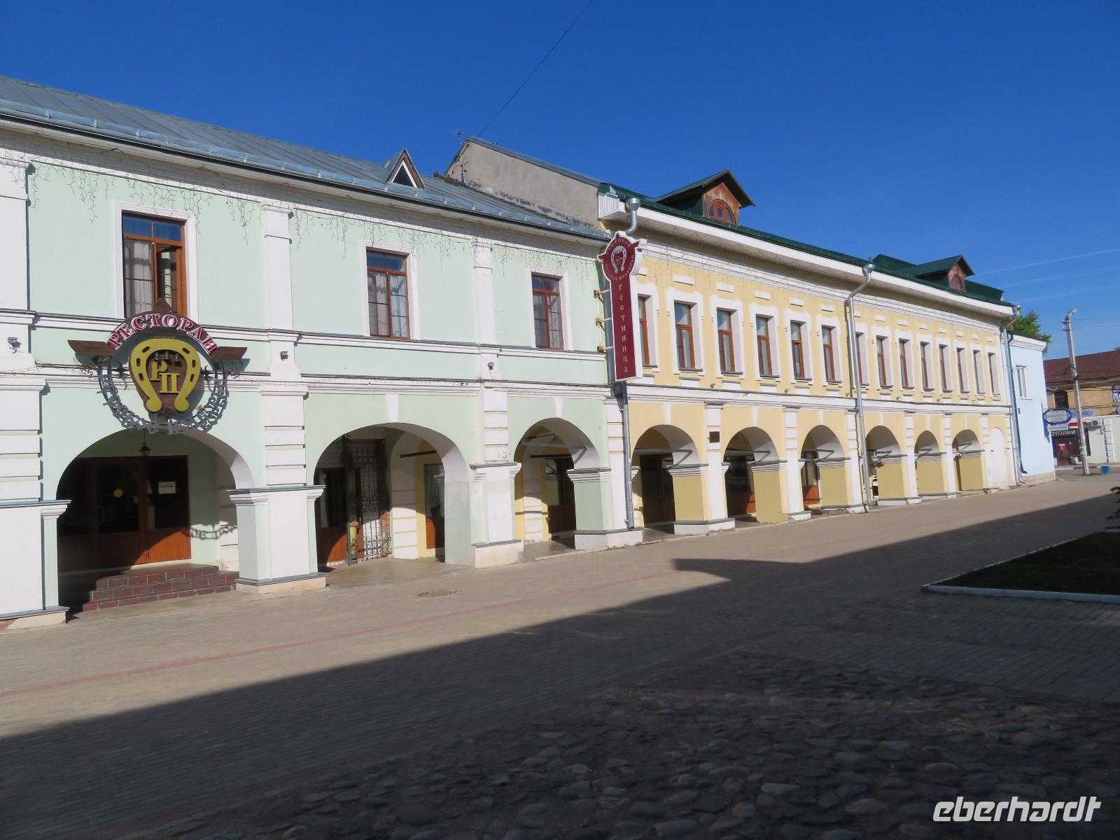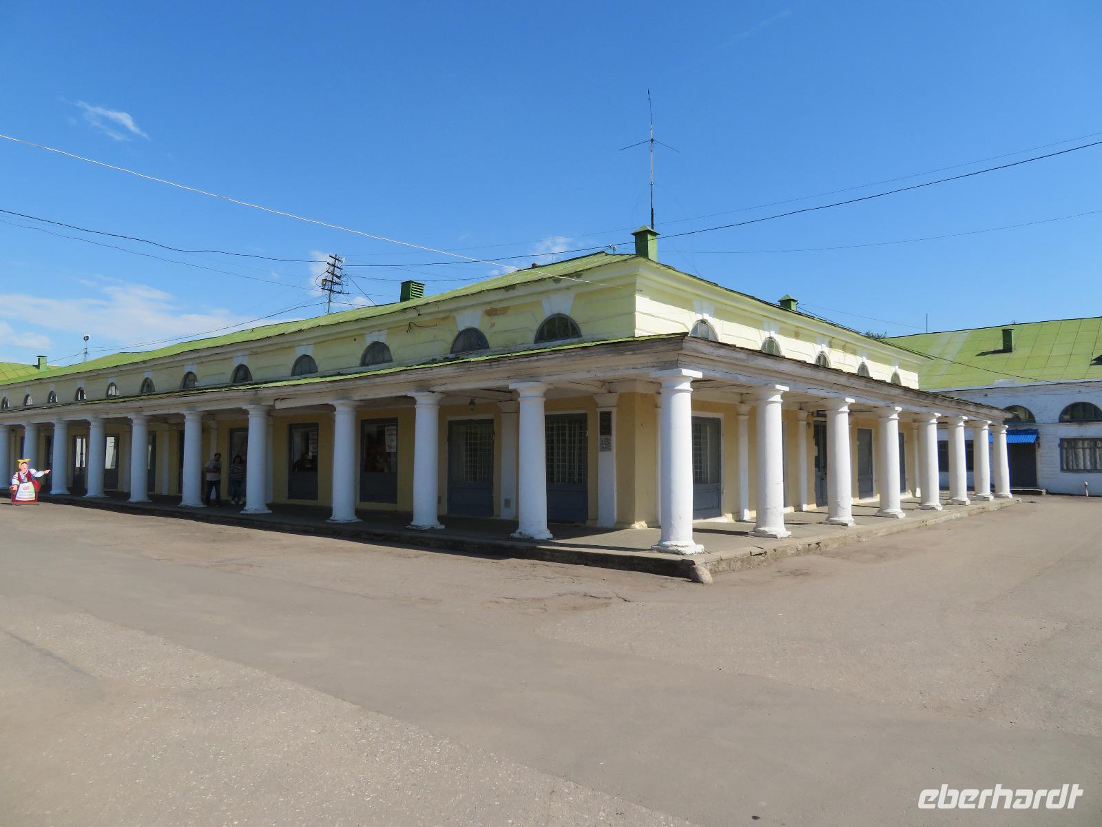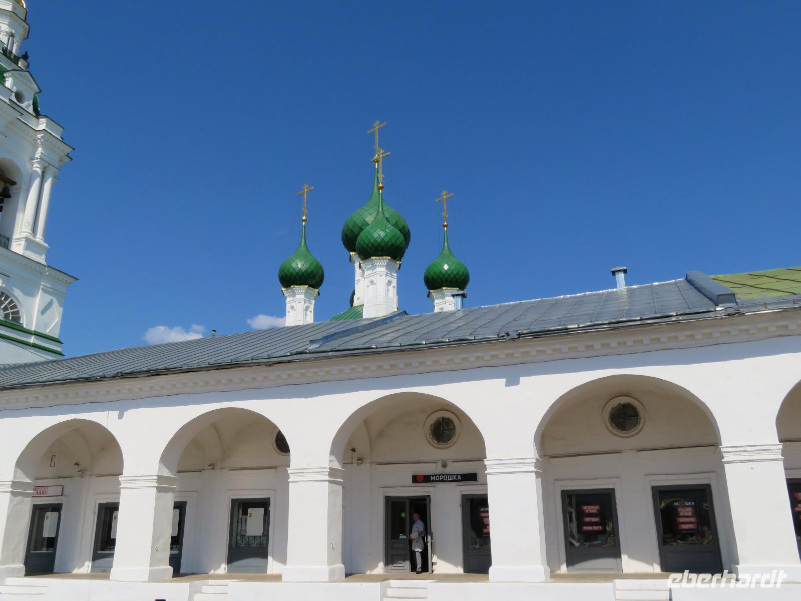 Wir starteten zu gutbürgerlicher Touristenzeit - und das erwieß sich als zu spät - in Jaroslawl und erreichten am späten Vormittag Kostrjoma. Unser erster Bummel führte uns in das Ipatios-Kloster auf einer Landzunge neben der Wolga. Dieses Kloster steht in engster Beziehung zur Dynastie der Romanows: der erste Zar aus dem Hause der Romanows verbrachte hier im Kloster Jugendjahre. An der Westseite des Klosters befindet sich das Museum der Holzarchitektur, einer Ansammlung verschiedener Bauernhäuser, kleiner Kirche, Mühle - vergleichbar mit zahlreichen ähnlichen in Russland und anderen osteuropäischen Staaten („Skansen"). Die Einbindung der hier platzierten Häuser in eine schattige Landschaft mit Wasserläufen und Teichen unterscheidet das Museum in Kostrjoma jedoch sehr angenehm von anderen. Im Zentrum der alten Kaufmannsstadt Kostrjoma befinden sich die wohl größten erhaltenen, klassizistischen Handelsreihen einer russischen Stadt. Leider entfaltet sich in diesem Ensemble kein Leben. Unweit davon ein Lenindenkmal, das auf dem Sockel eines nicht fertig gestellten Zarendenkmals errichtet wurde. Mit zügiger Fahrt erreichten wir das kleine Örtchen Pljos in den Hügeln an der Wolga. Tolle Teestunde mit hervorragendem Gebäck und Blick auf die Hügellandschaft an der Wolga vom Restaurant und Cafe'"Chastny Visit". Ruhe, Birkenwäldchen, einige Kirchlein und manch farbiges Holzhaus leuchteten in der Sonne. Dies beeindruckte auch den Maler Lewitan, der hier drei Jahre im Sommer weilte und zahlreiche Gemälde schuf. Wieder in rascher Fahrt, aber doch zwei Stunden dauernd, über die Stadt Iwanovo erreichten wir Susdal zur schon fortgeschrittenen Abendessenszeit. Die Blicke gingen hinüber zum beleuchteten Kreml mit seinen blauen Kuppeln. Unser Hotel Sokol am zentralen Platz und der Lenin-Straße empfing uns auch noch nach 22 Uhr. Das Hotel befindet sich nur vierhundert Meter vom Kreml entfernt - das lud ein zu einem Morgenspaziergang am kommenden Tag.
