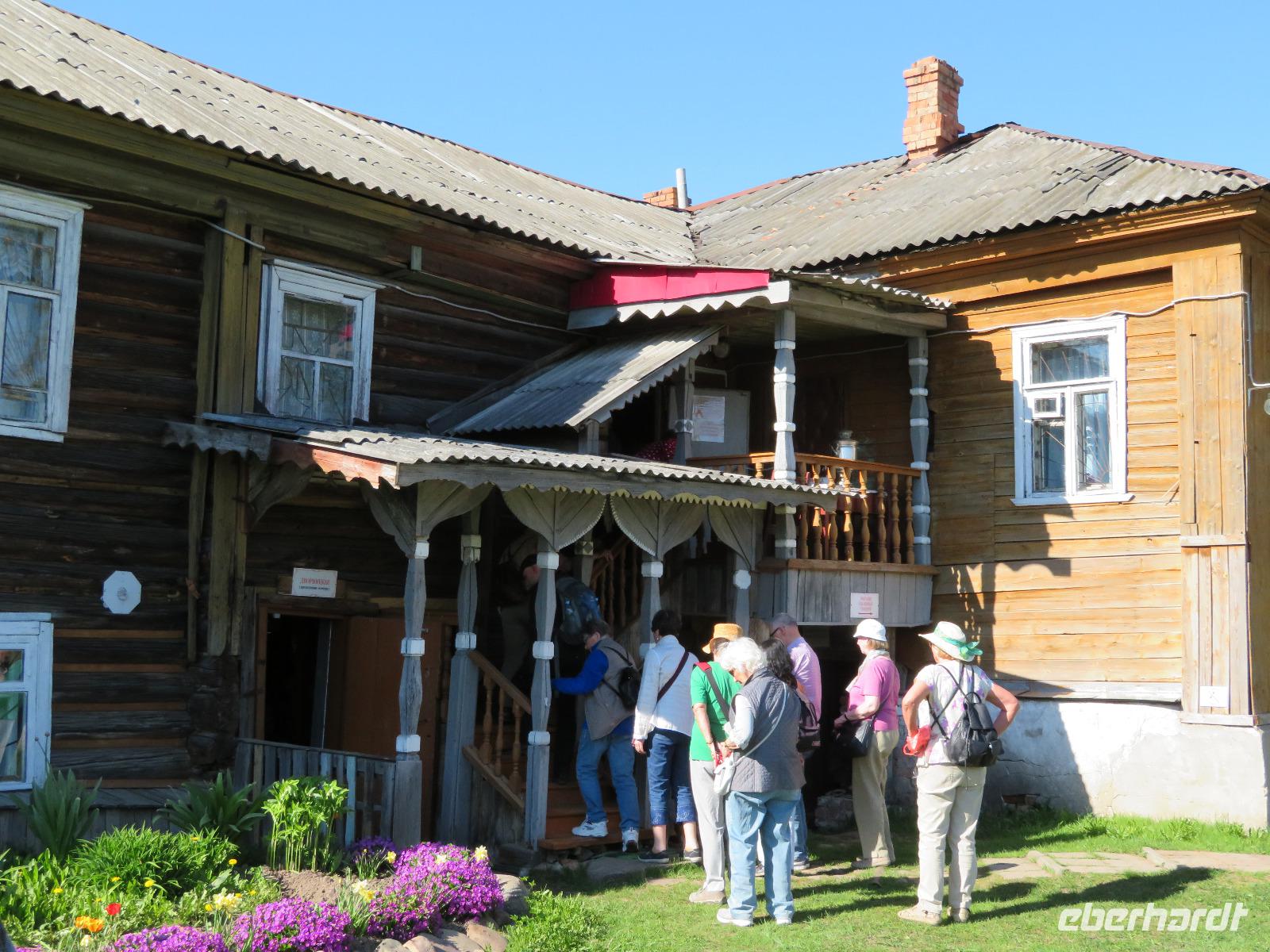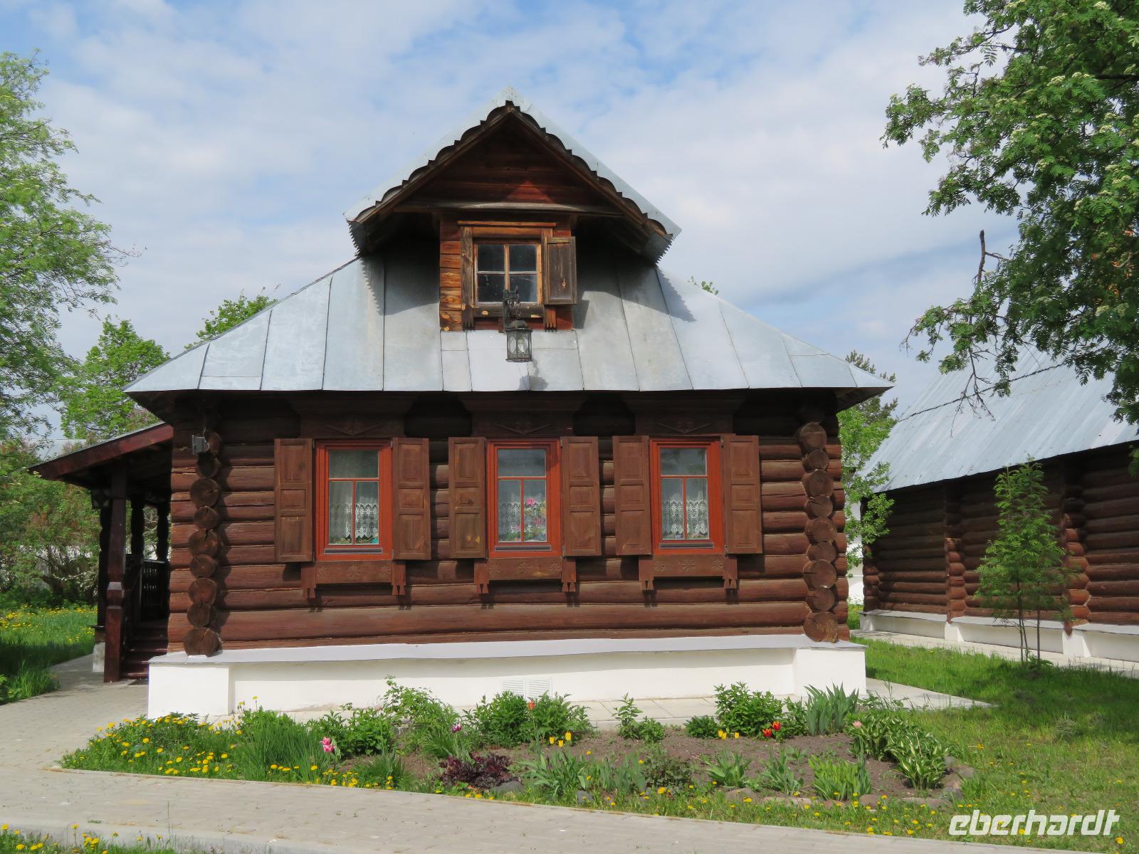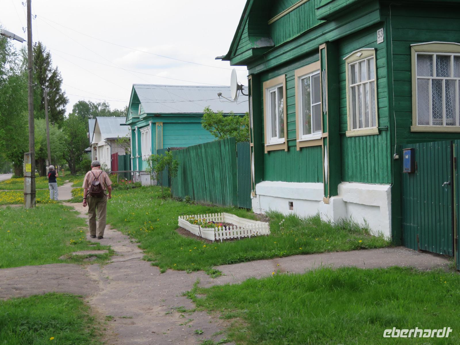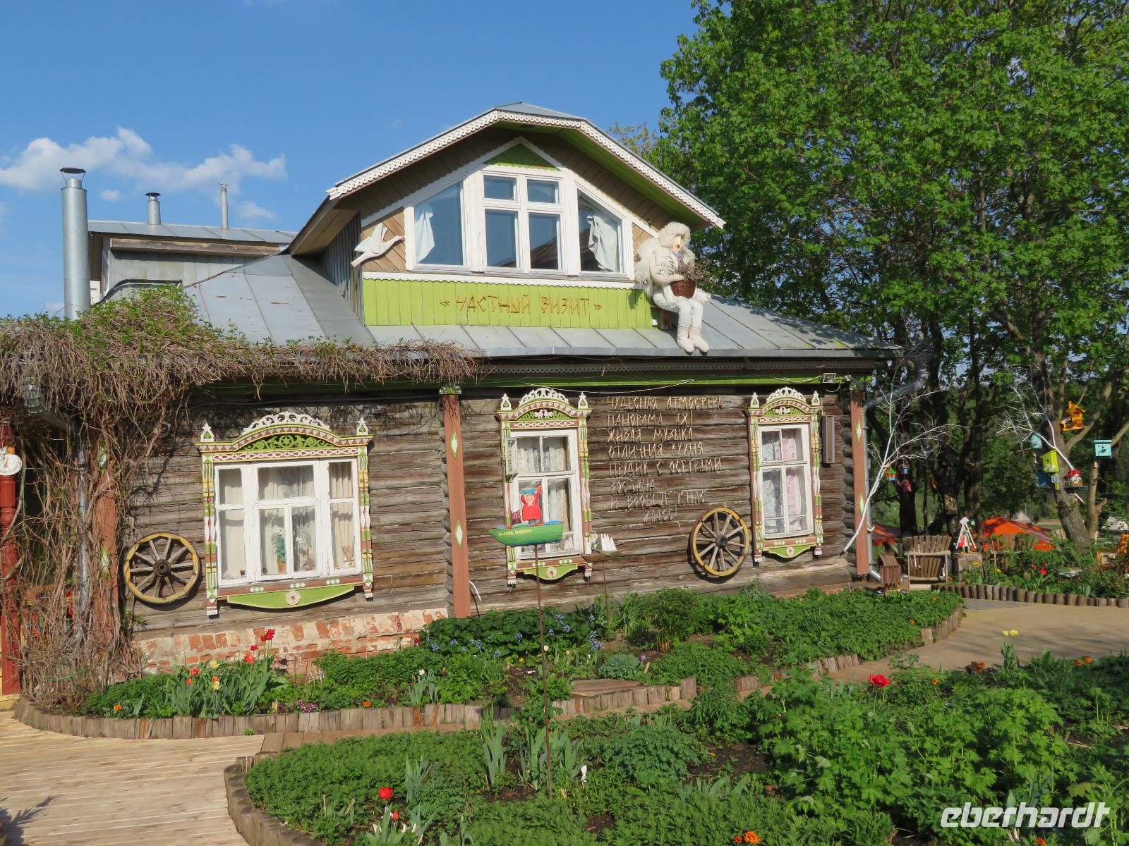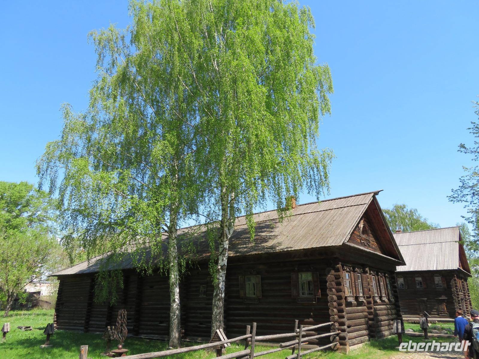 Nach einer Mittagspause wieder im Rostover Kreml erreichten wir nach reichlich zweistündiger Busfahrt durch recht verlassene Gegend und unbewirtschaftete einstige Felder Myschkin an der Wolga. Myschkin, der Mäuseort, ist ein kleines verschlafenes Örtchen an der Wolga, wo wohl eher nur Flussfahrtschiffe für russische Touristen halten. Mehrere kleine Museen, meist erst nach 1990 entstanden, werben um die Gunst der Gäste. Wir besuchten das Museum der Filzstiefel (Maleniki) - eine russische Tradition - und Machaew Dvor - ein Kaufmannshaus aus dem 19. Jahrhundert. Am späten Nachmittag fuhren wir noch über eine Holperpiste nach Martynowo, um uns einen Eindruck vom bäuerlichen Leben um 1900 im ethnografischen Museum - einst der Dorfsowjet - zu machen.