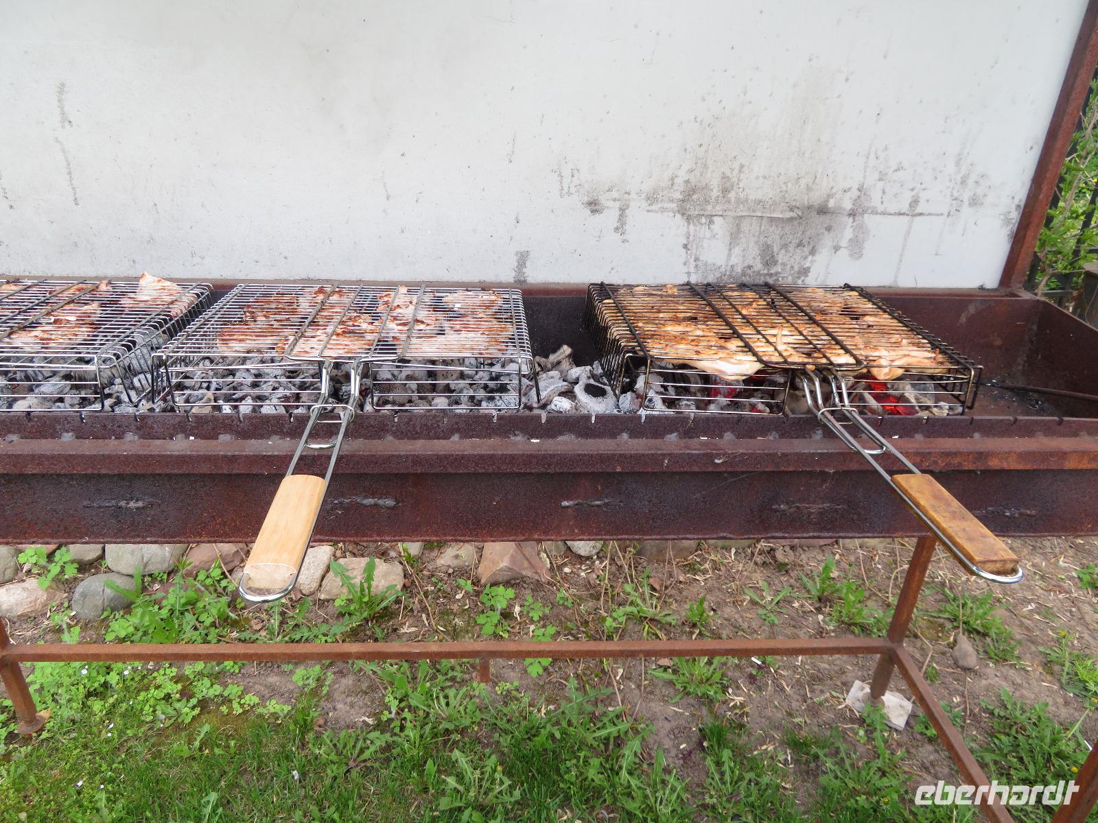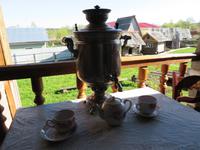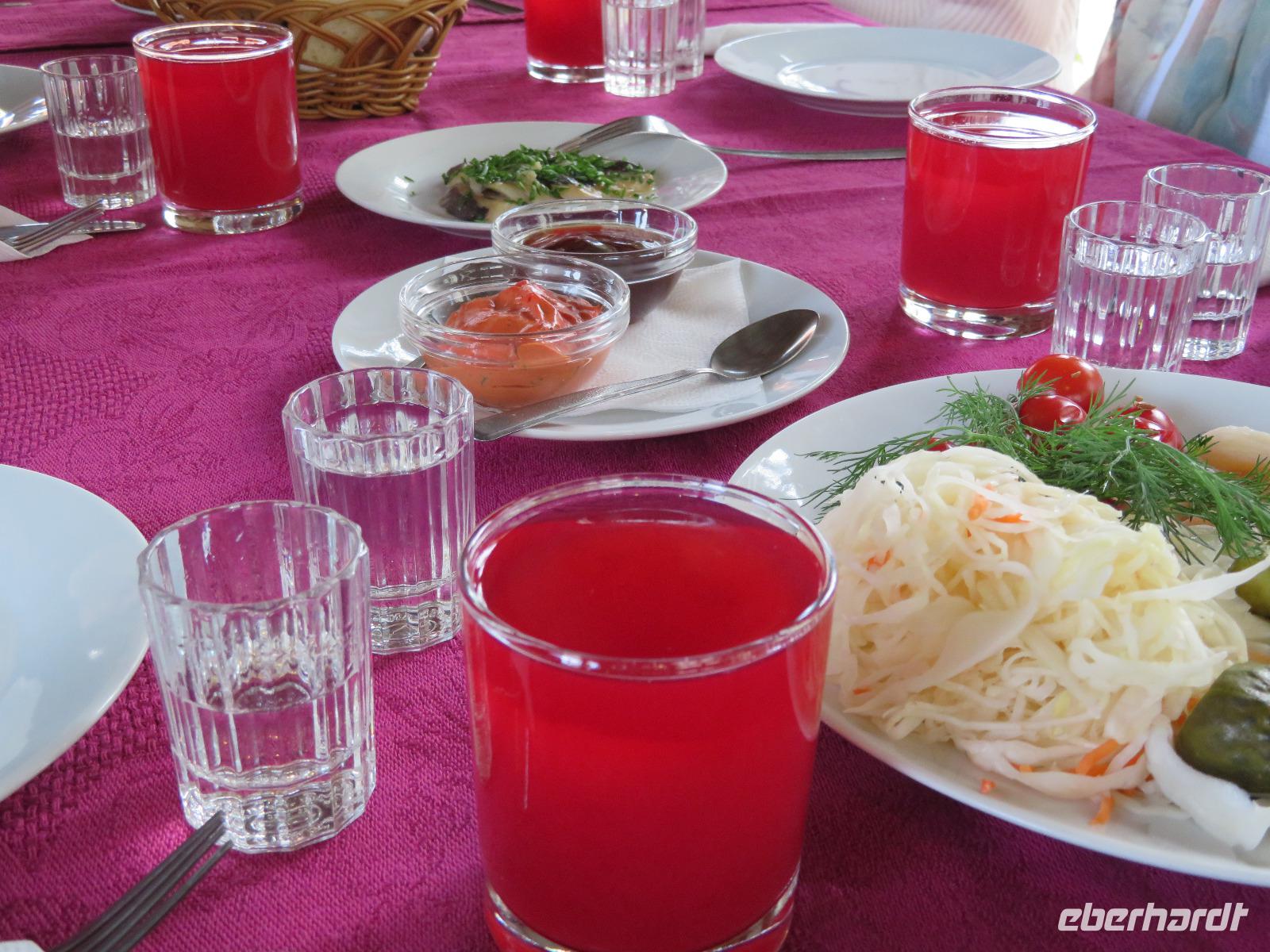 Abendessen in diesem Jahr weder bei Julia noch im Jägerhaus, sondern im Hof des Hotels Sokol mit sauren Gemüsevorspeisen und Seldj (Matjes), gefüllten Piroggen, Schaschlik, Speck, Blinys mit Marmelade und natürlich Mors und Wodka; dazu ein nettes Folkloreprogramm.