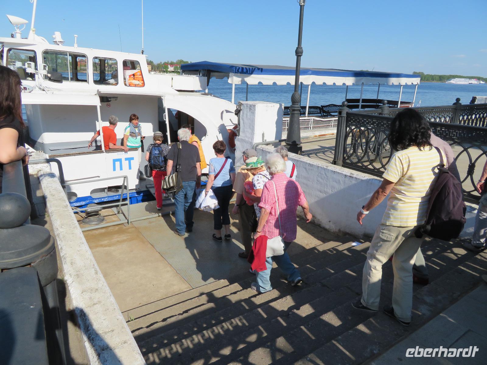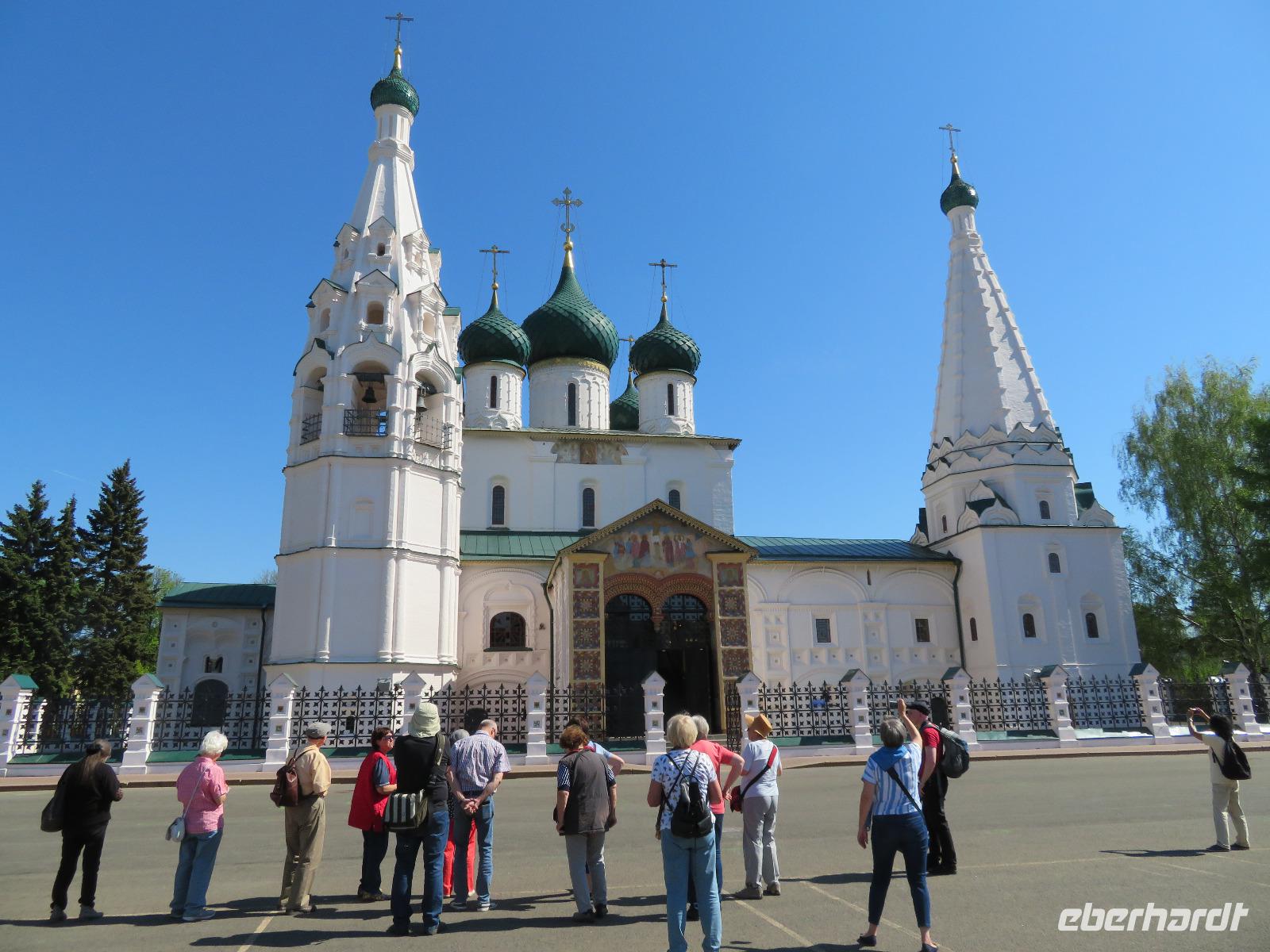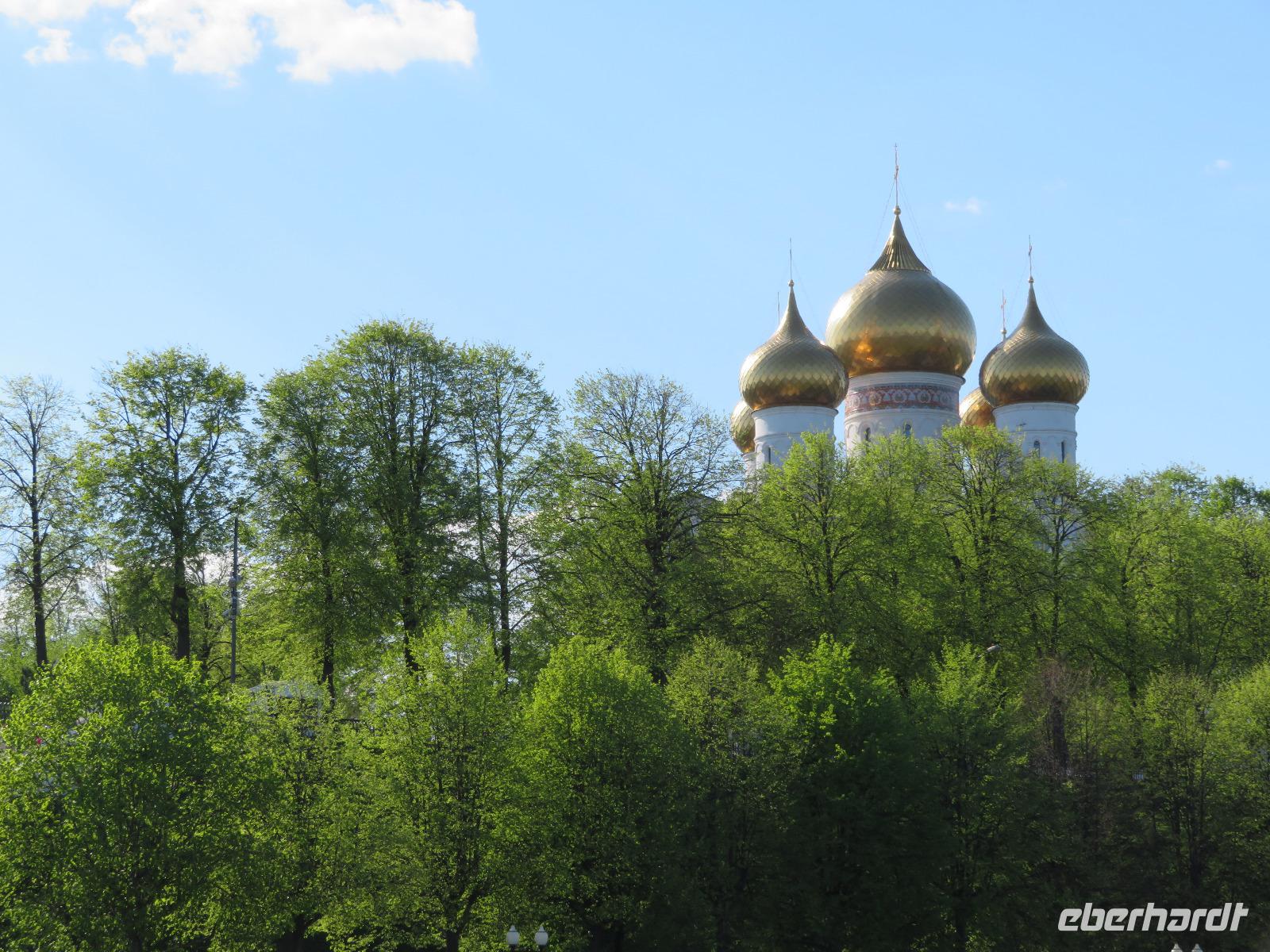 Nach einer kurzen Fahrt durch die Stadt starteten wir die Besichtigungen am Christi Verklärungskloster. Weiter ging es zur Kirche des Propheten Elija am zentralen Platz von Jaroslawl, die wir bereits verließen als all die anderen Gruppen vom Kreuzfahrtschiff kamen. Ein kleiner Spaziergang brachte uns am Denkmal für die Gefallenen des Großen Vaterländischen Krieges - mit Ehrenwache durch die Besten (Schüler und Studenten mit Kalaschnikow) - zur Strelka, einer kleinen Landzunge an der Wolga. Gegen Mittag fuhren wir auf die andere Flussseite zu einem Emaille-Künstler. Nach nur wenig Theorie durften wir selbst an die Kupferbleche (Säubern!), dick Betupfen nach eigener Vorstellung mit Farben, Brennen. Obwohl der eine oder andere anfangs skeptisch war, fanden wohl alle großen Gefallen am Workshop und hielten am Ende ein selbstgestaltetes kleines Kunstwerk in der Hand. Wir lagen gut in der Zeit und machten gemeinschaftlich eine Mittagspause am Wolgaufer. Dann bestiegen wir einen für uns exklusiv gemietetes kleines Ausflugsschiff und fuhren ein Stündchen auf Mütterchen Wolga: Kirchkuppeln blitzten in der Sonne, frisches Grün an den Bäumen, sandige Flussbadestellen, bis zu den Industrieanlagen der Stadt fuhren wir nicht. Bevor wir zum hochqualitativen Abendessen im Restaurant „Bulvard" (also: Boulevard) fuhren, hatten Interessierte noch Zeit, durch das gegenüberliegende Einkaufscentrum zu bummeln: „Wie im Westen!", aber fast ausschließlich junges Publikum.