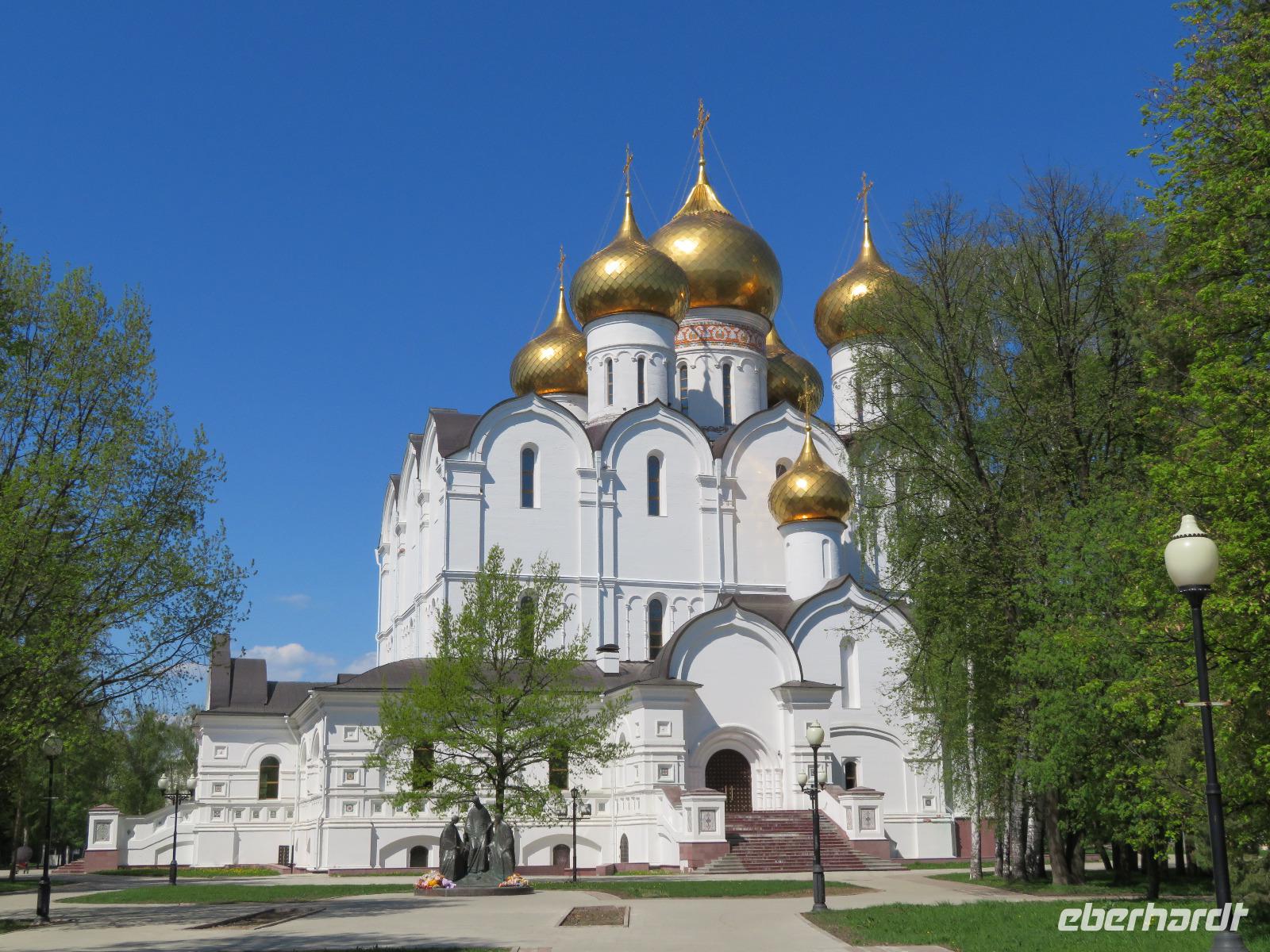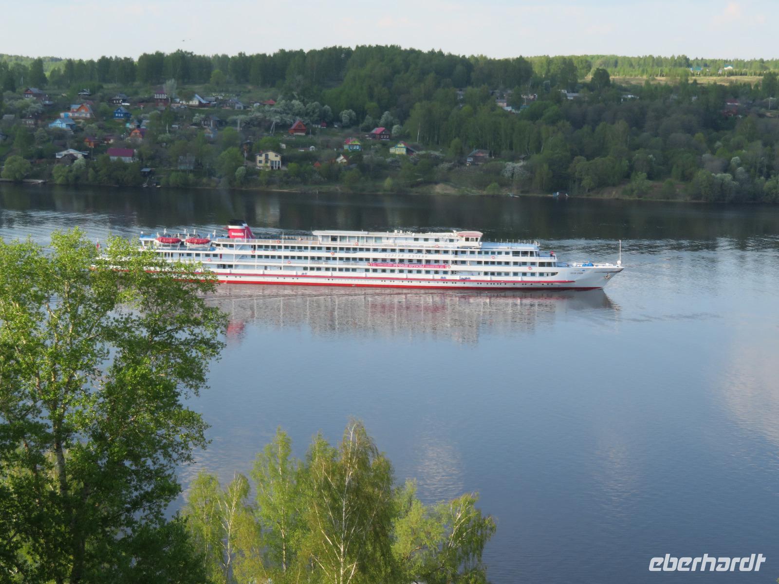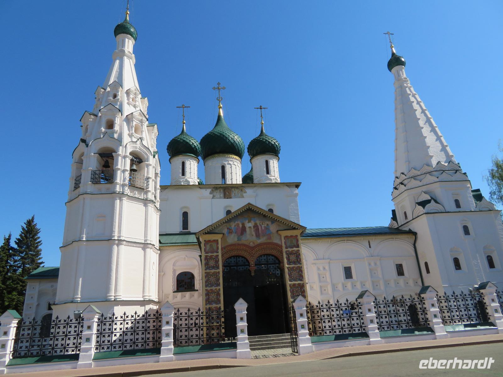 Nach einer kurzen Fahrt durch die Stadt starteten wir die Besichtigungen am Christi Verklärungskloster. Weiter ging es zur Kirche des Propheten Elija am zentralen Platz von Jaroslawl, die wir bereits verließen als all die anderen Gruppen vom Kreuzfahrtschiff kamen. Ein kleiner Spaziergang brachte uns am Denkmal für die Gefallenen des Großen Vaterländischen Krieges - mit Ehrenwache durch die Besten (Schüler und Studenten mit Kalaschnikow) - zur Strelka, einer kleinen Landzunge an der Wolga. Gegen Mittag fuhren wir auf die andere Flussseite zu einem Emaille-Künstler. Nach nur wenig Theorie durften wir selbst an die Kupferbleche (Säubern!), dick Betupfen nach eigener Vorstellung mit Farben, Brennen. Obwohl der eine oder andere anfangs skeptisch war, fanden wohl alle großen Gefallen am Workshop und hielten am Ende ein selbstgestaltetes kleines Kunstwerk in der Hand. Wir lagen gut in der Zeit und machten gemeinschaftlich eine Mittagspause am Wolgaufer. Dann bestiegen wir einen für uns exklusiv gemietetes kleines Ausflugsschiff und fuhren ein Stündchen auf Mütterchen Wolga: Kirchkuppeln blitzten in der Sonne, frisches Grün an den Bäumen, sandige Flussbadestellen, bis zu den Industrieanlagen der Stadt fuhren wir nicht. Bevor wir zum hochqualitativen Abendessen im Restaurant „Bulvard" (also: Boulevard) fuhren, hatten Interessierte noch Zeit, durch das gegenüberliegende Einkaufscentrum zu bummeln: „Wie im Westen!", aber fast ausschließlich junges Publikum.